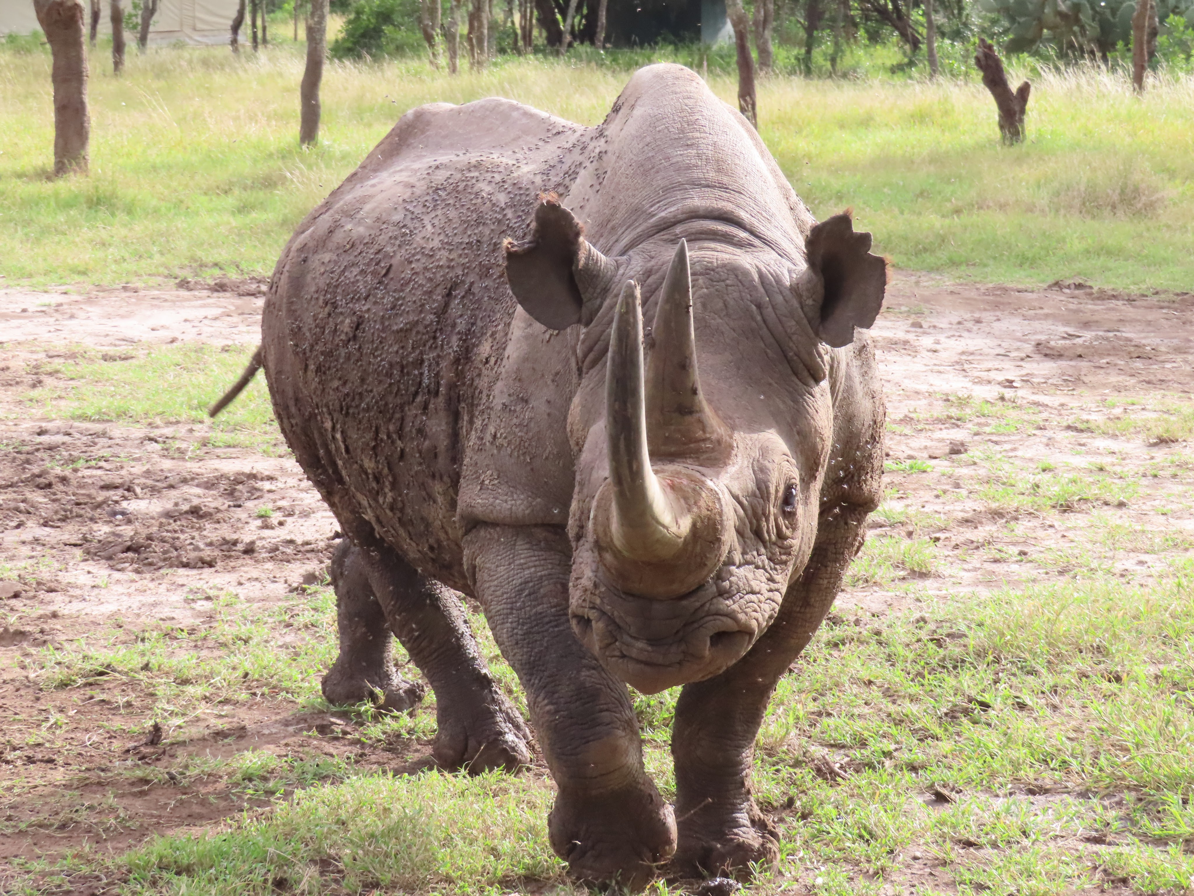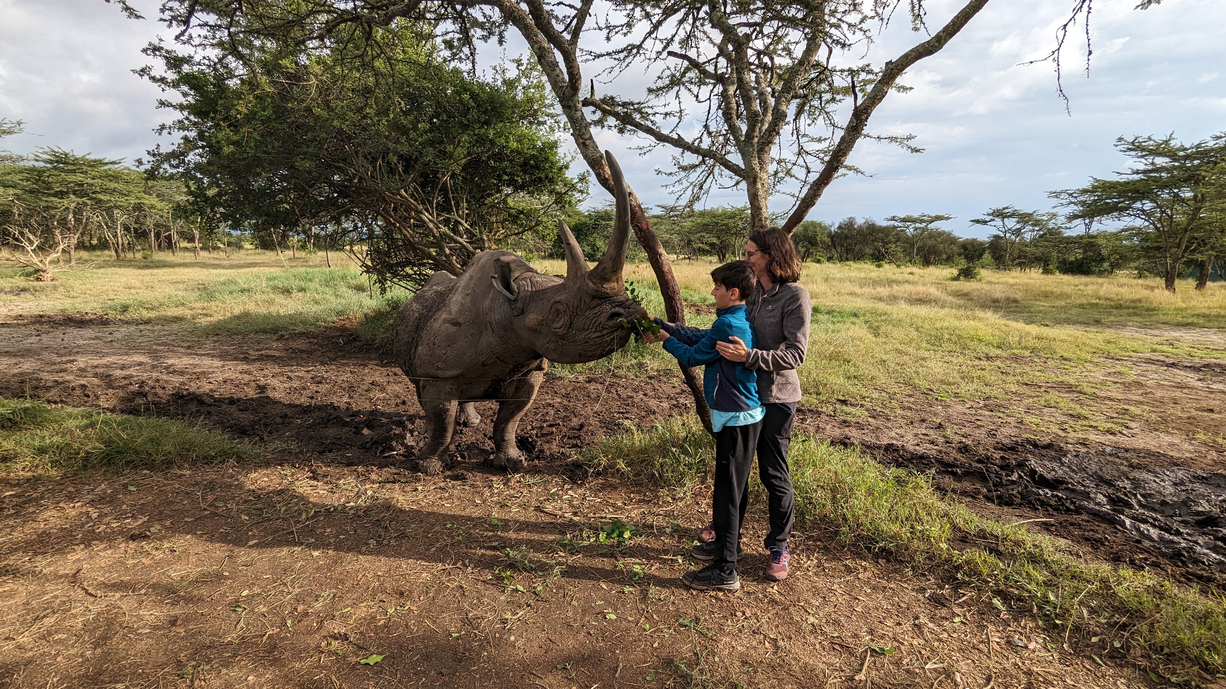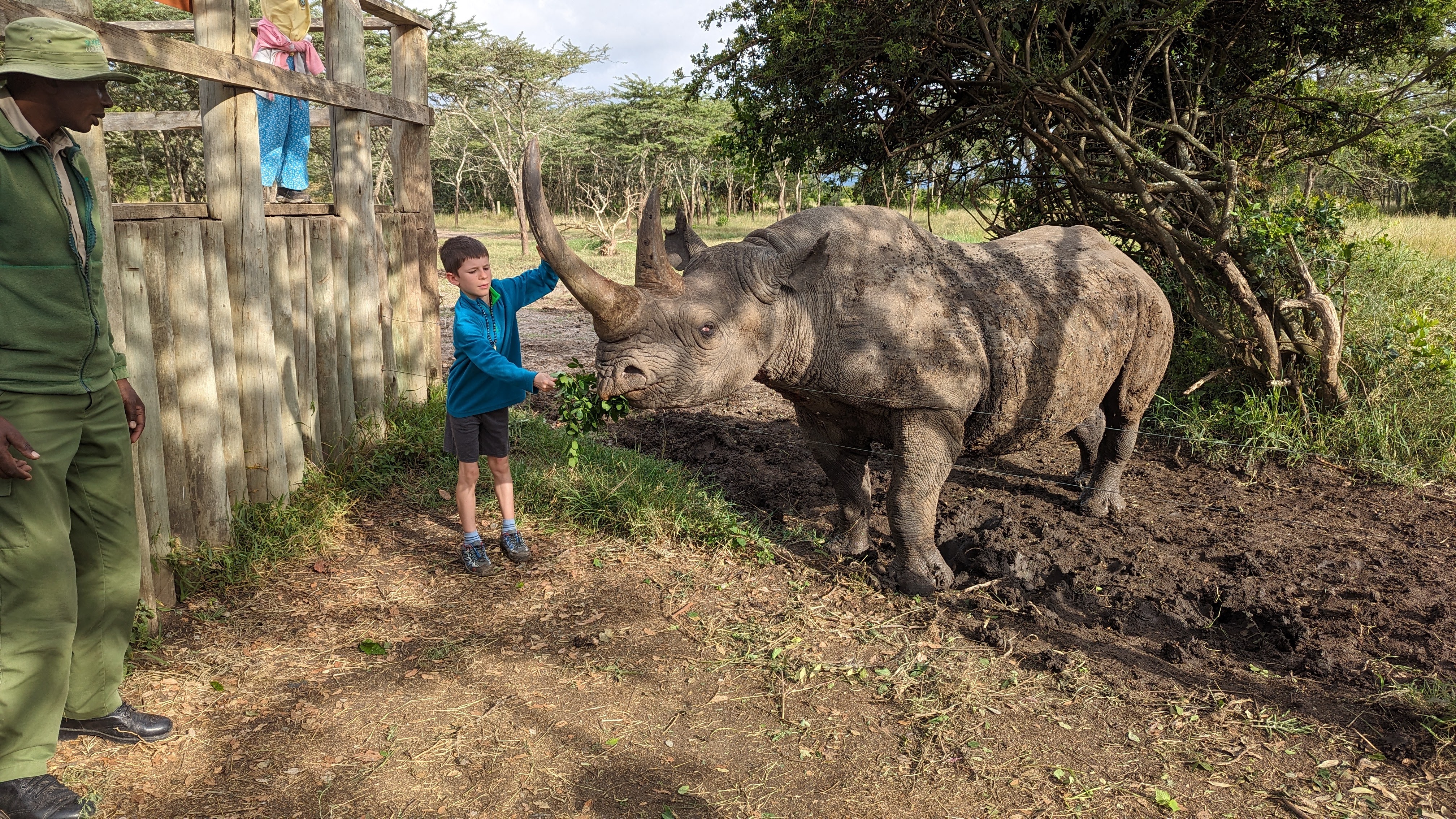 Ol’Pejeta est connu pour abriter la plus grosse population de rhinos noirs (qui ne le sont pas, noirs, mais c’est une autre histoire) de toute l’Afrique de l’est. Oui le plus rare des rhinos, celui qui ne sort que la nuit. Et bien ici on peut même en approcher un. en plein jour. Alors oui, c’est un peu cheaté car celui-ci, nommé Baraka, est aveugle. Enfin, il a perdu un œil dans un combat et souffre de la cataracte sur l’autre. Bref, il vit dans un enclos et accepte avec plaisir les feuilles que les touristes lui tendent. Dont nos deux garçons ravis, qui peuvent même poser furtivement la main sur lui. Quant aux parents, malgré leur longue expérience du safari, c’est bien la première fois qu’ils voient un rhino noir d’aussi près et c’est franchement impressionnant