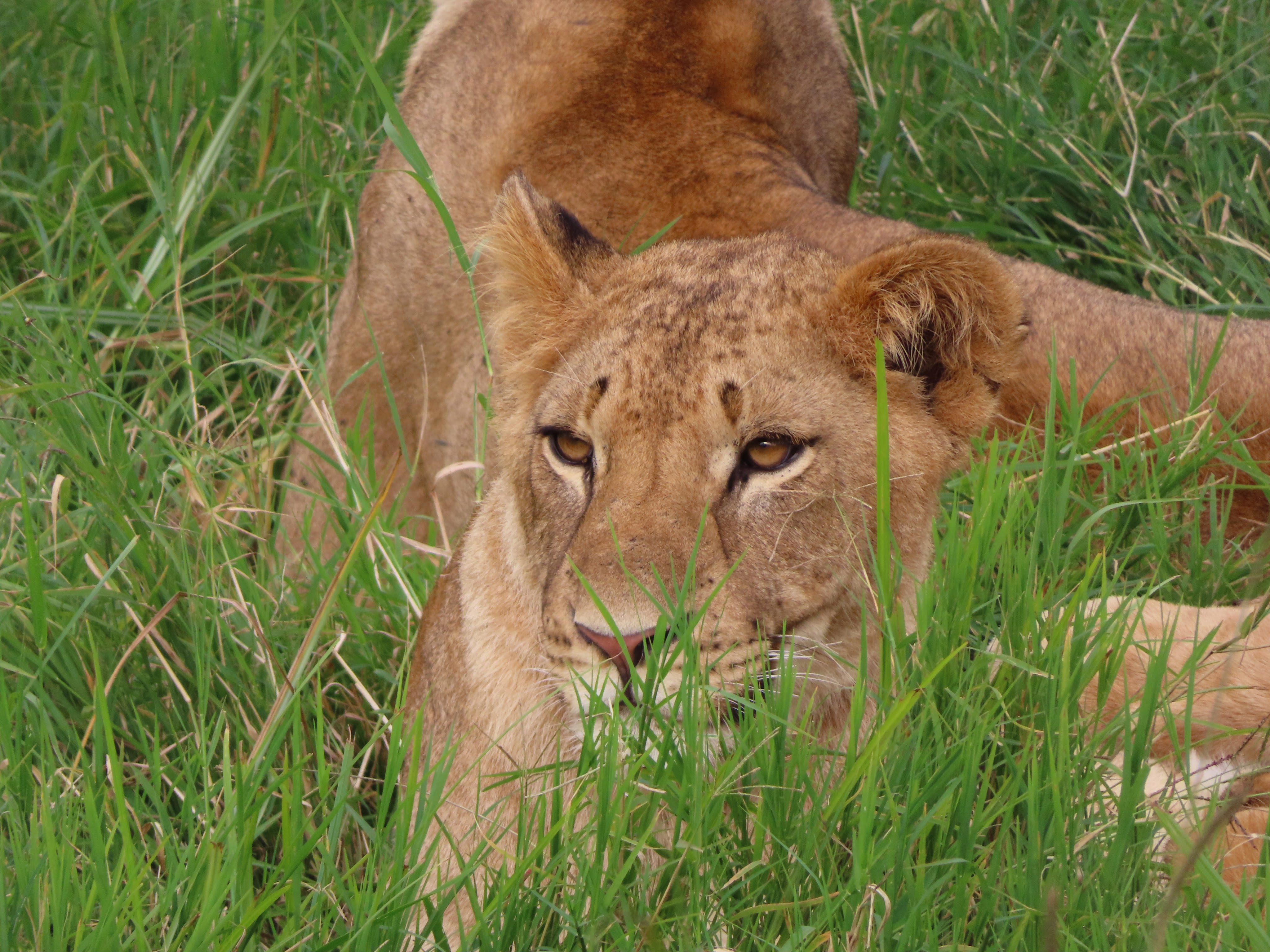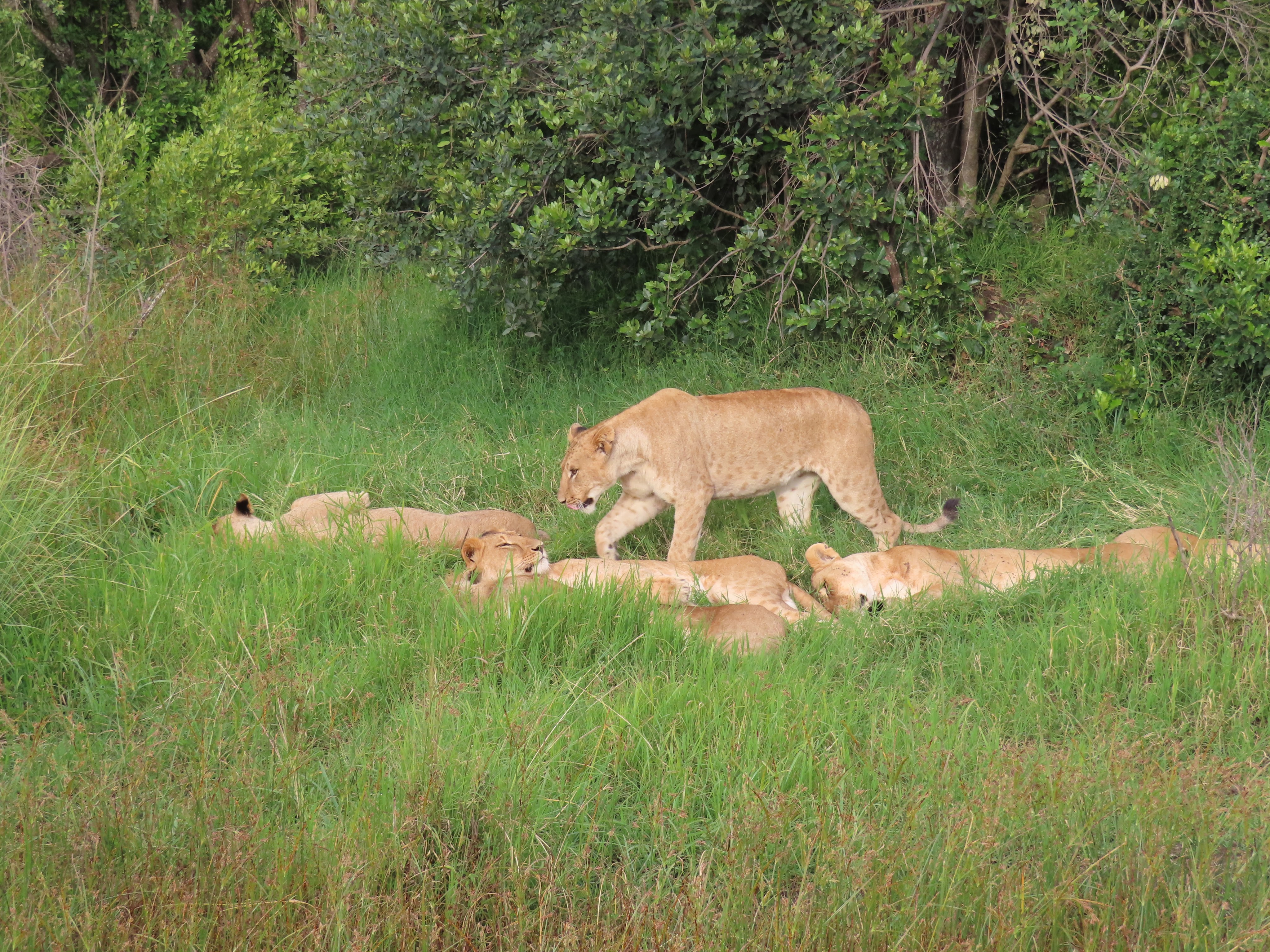 Tout ce qu’on avait déjà vu suffisait grandement à notre bonheur mais restait le plus chouette pour la fin. Dans un fourré qu’Audrey avait pourtant repéré une heure plus tôt (j’ai vu un truc bouger là-dedans, un lion sûrement ! T’es sûre ? T’as encore rêvé ! Y a que des souches là !) on va recroiser des lions. Et ce coup-ci, pas un vieux tas de terre en bord de route, non madame, c’est un groupe de 4 lionnes, allongées certes, mais bien visibles juste au bord du chemin, que nous allons pouvoir longuement observer. D’autant que le meilleur reste à venir. Contrairement au lion de Tsavo, celles-ci bougent et sont quelque peu actives. Et sont ensuite rejointes par un jeune mâle. Puis une nouvelle femelle. Et encore une ! A chaque fois les têtes se lèvent et nous poussons des cris admiratifs.