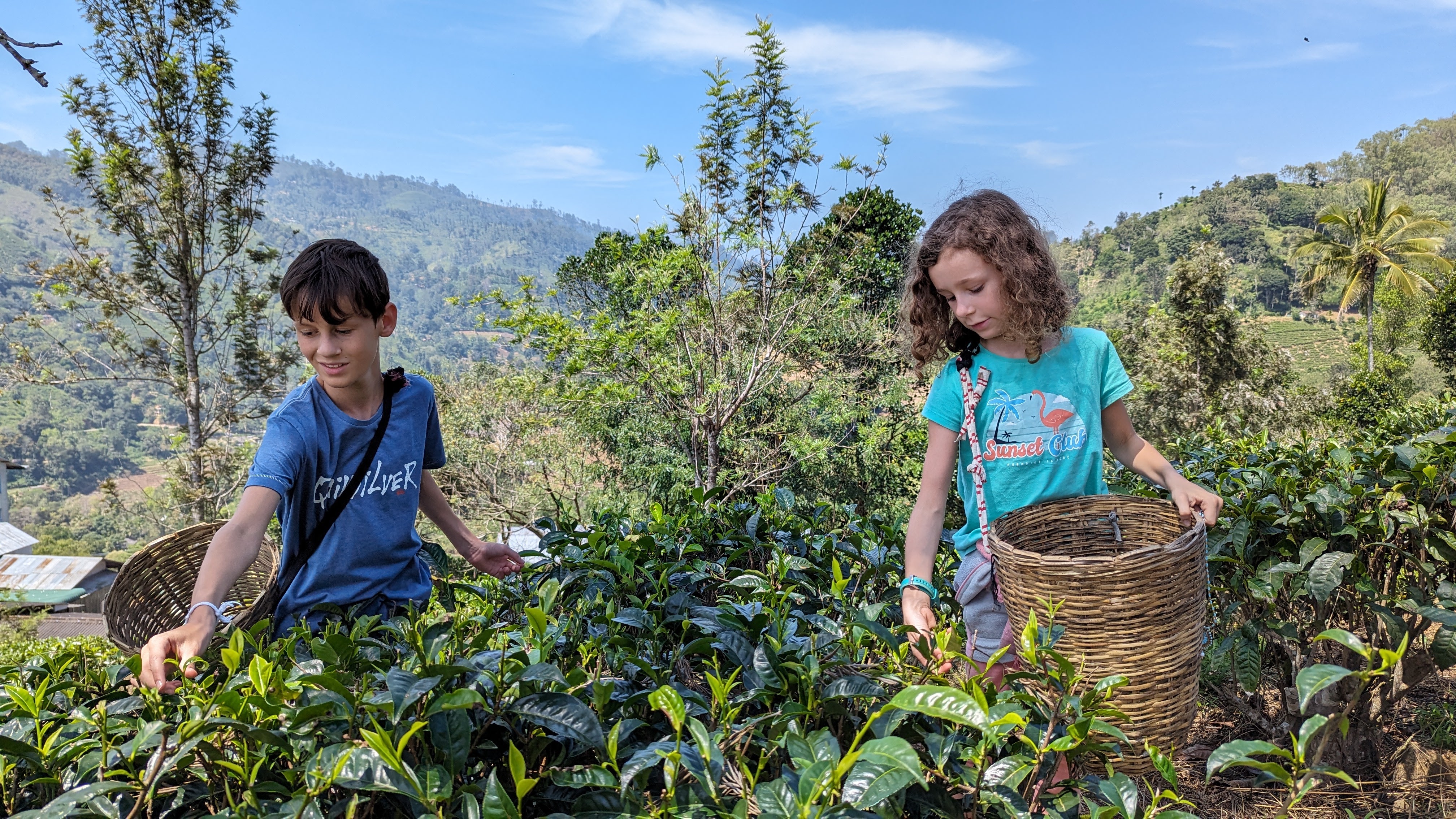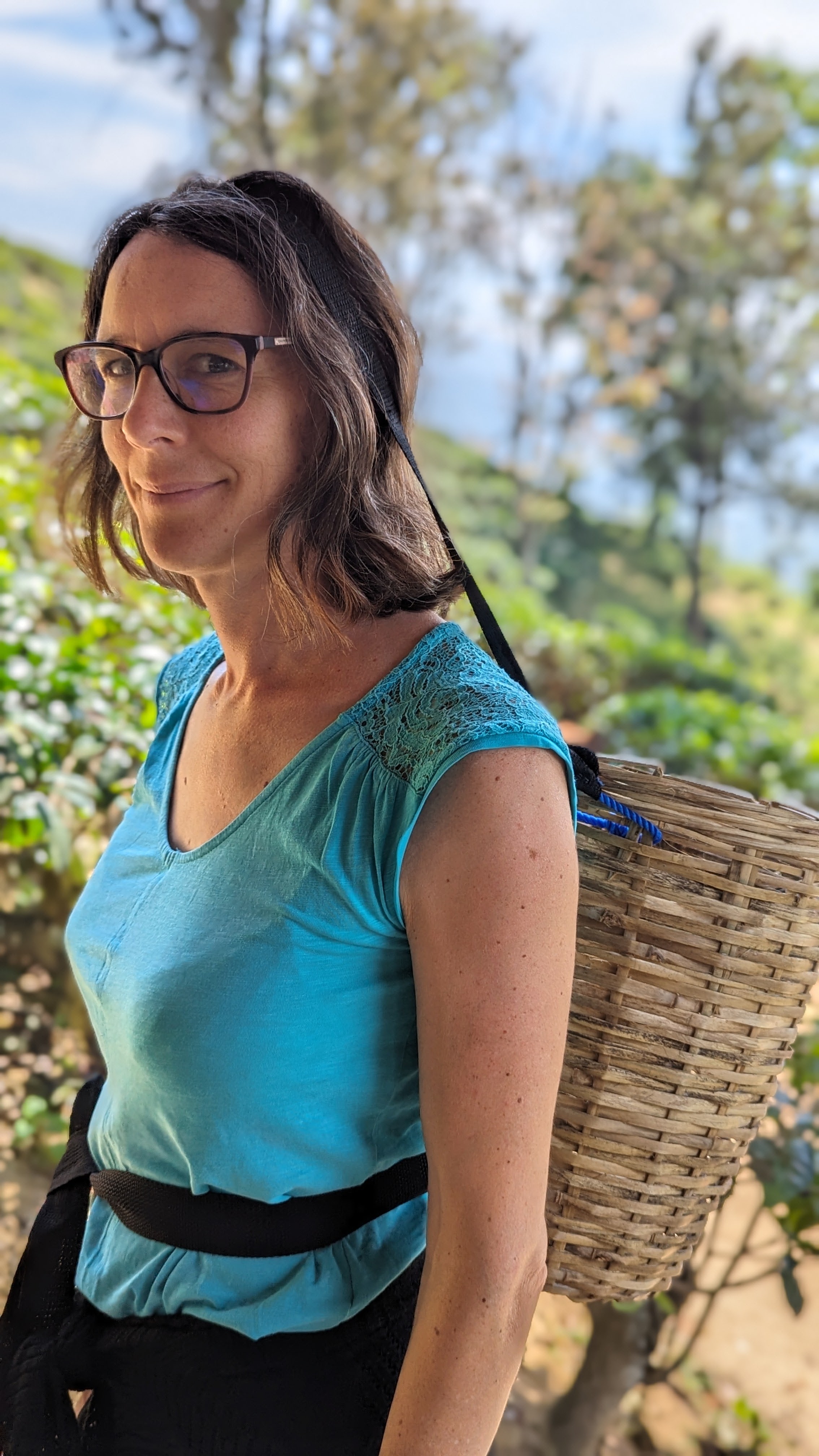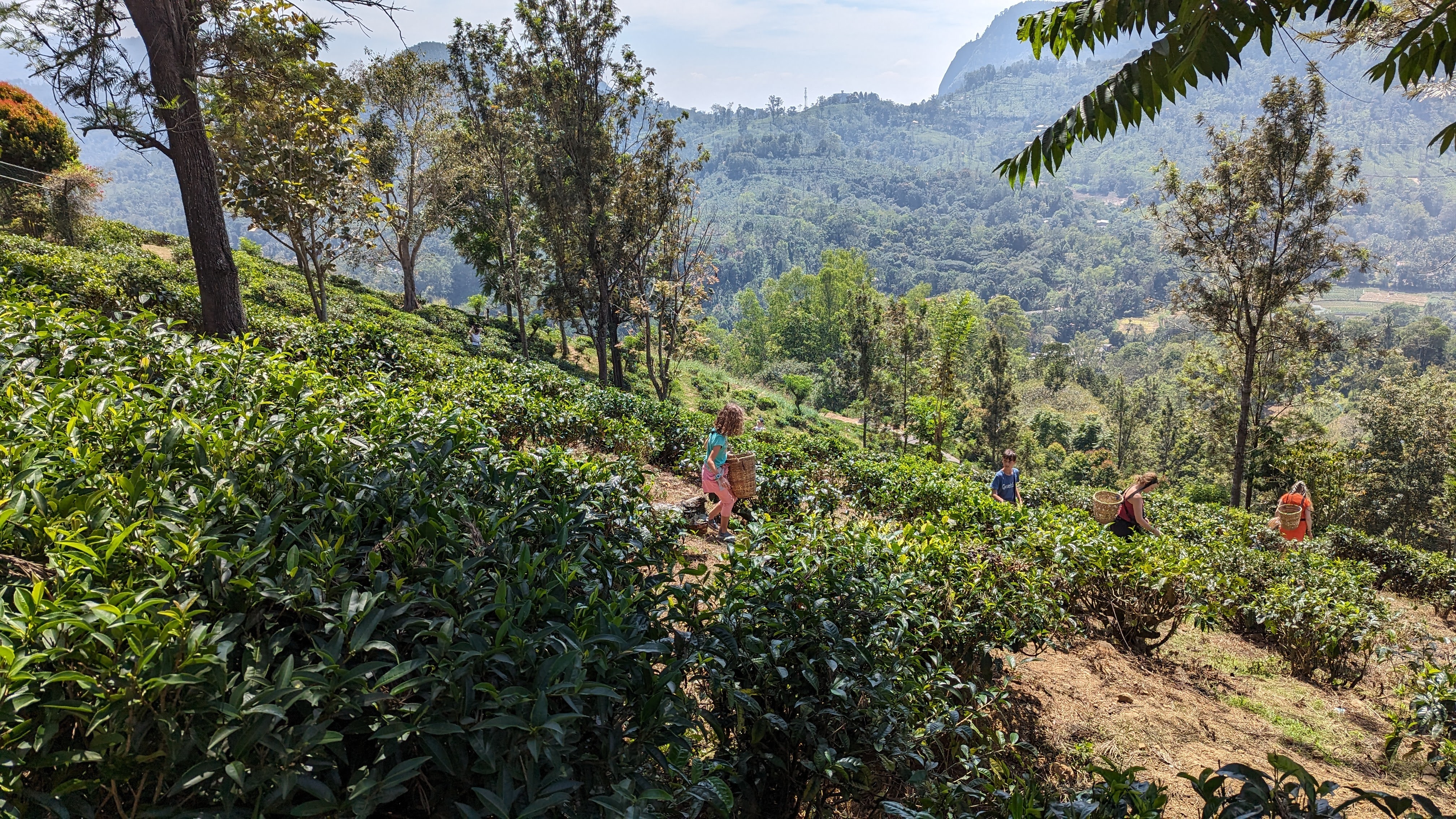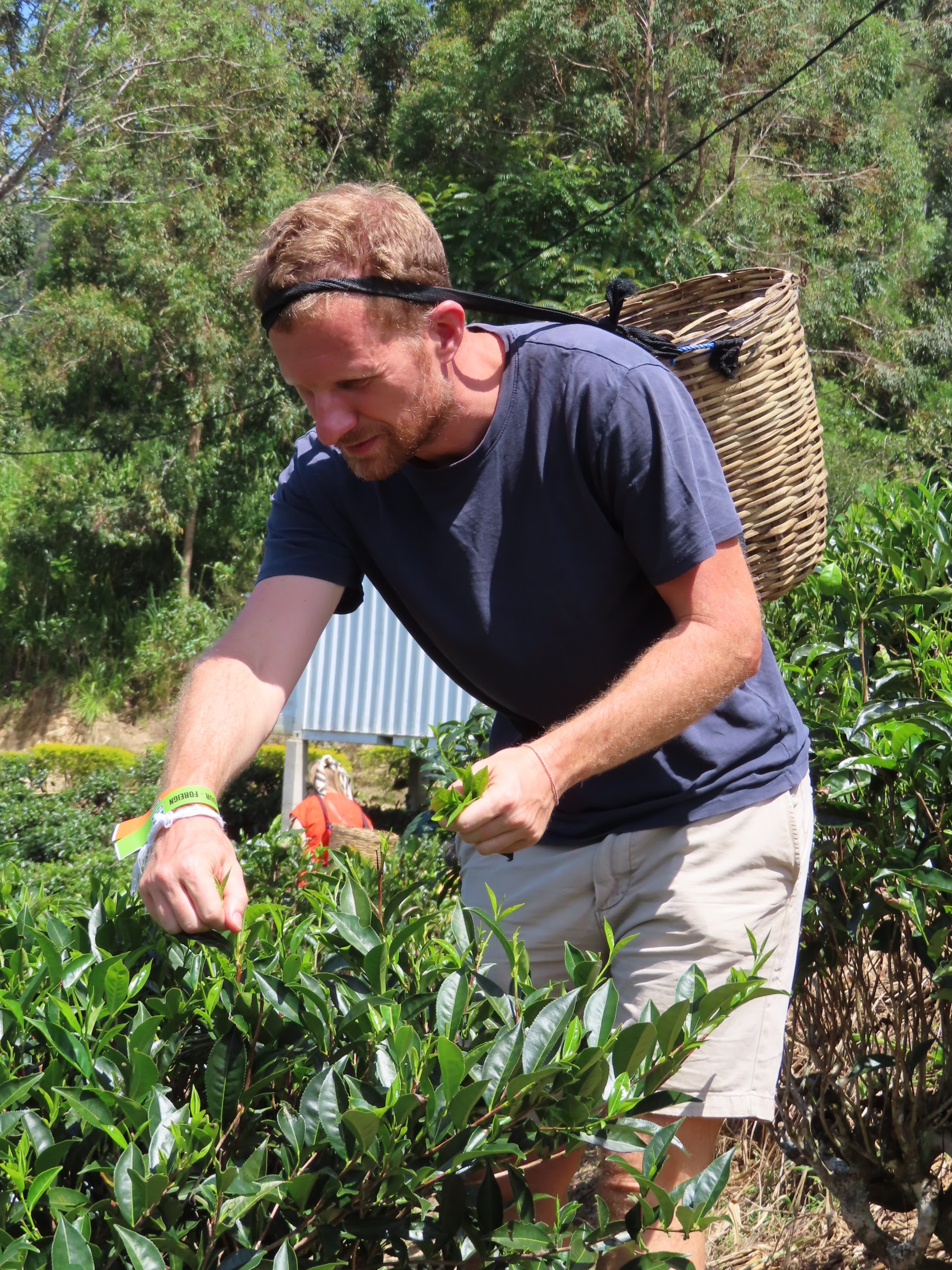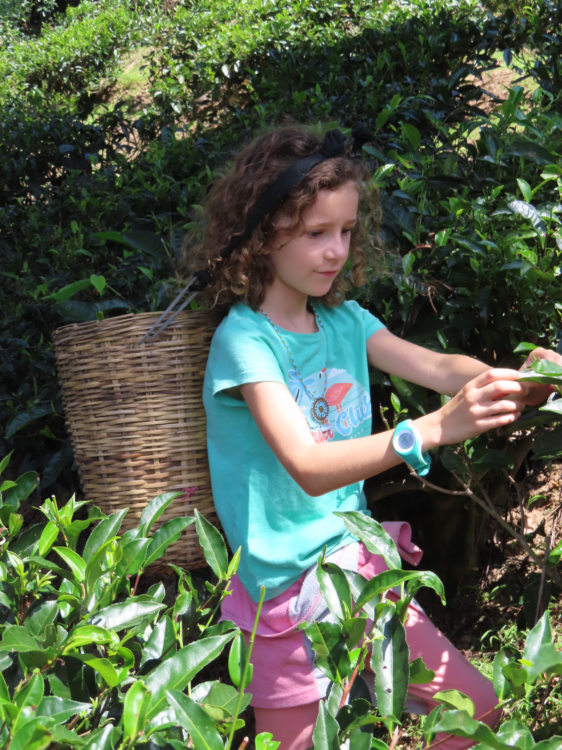 Et après la visite, place aux chose sérieuses : la cueillette. Activité exclusivement pratiquée par des femmes qui doivent récupérer à la main uniquement les jeunes pousses tendres et vert clair au sommet de chaque arbuste. Obligation de rapporter 20kg par jour (et une feuille, ça ne pèse pas lourd). Au bout d’une semaine, les feuilles ont repoussé et on peut ratiboiser de nouveau le même théier. Alors histoire qu’on se rende compte, on nous a mis un panier sur le dos (enfin sur la tête plutôt) et lâché dans la plantation, charge à nous d’en rapporter le plus possible en 30 minutes. Remarque des enfants: « mais en fait, on a payé pour se faire exploiter ? ». Ça ne les a pas empêcher de s’y atteler avec tout le sérieux du monde.