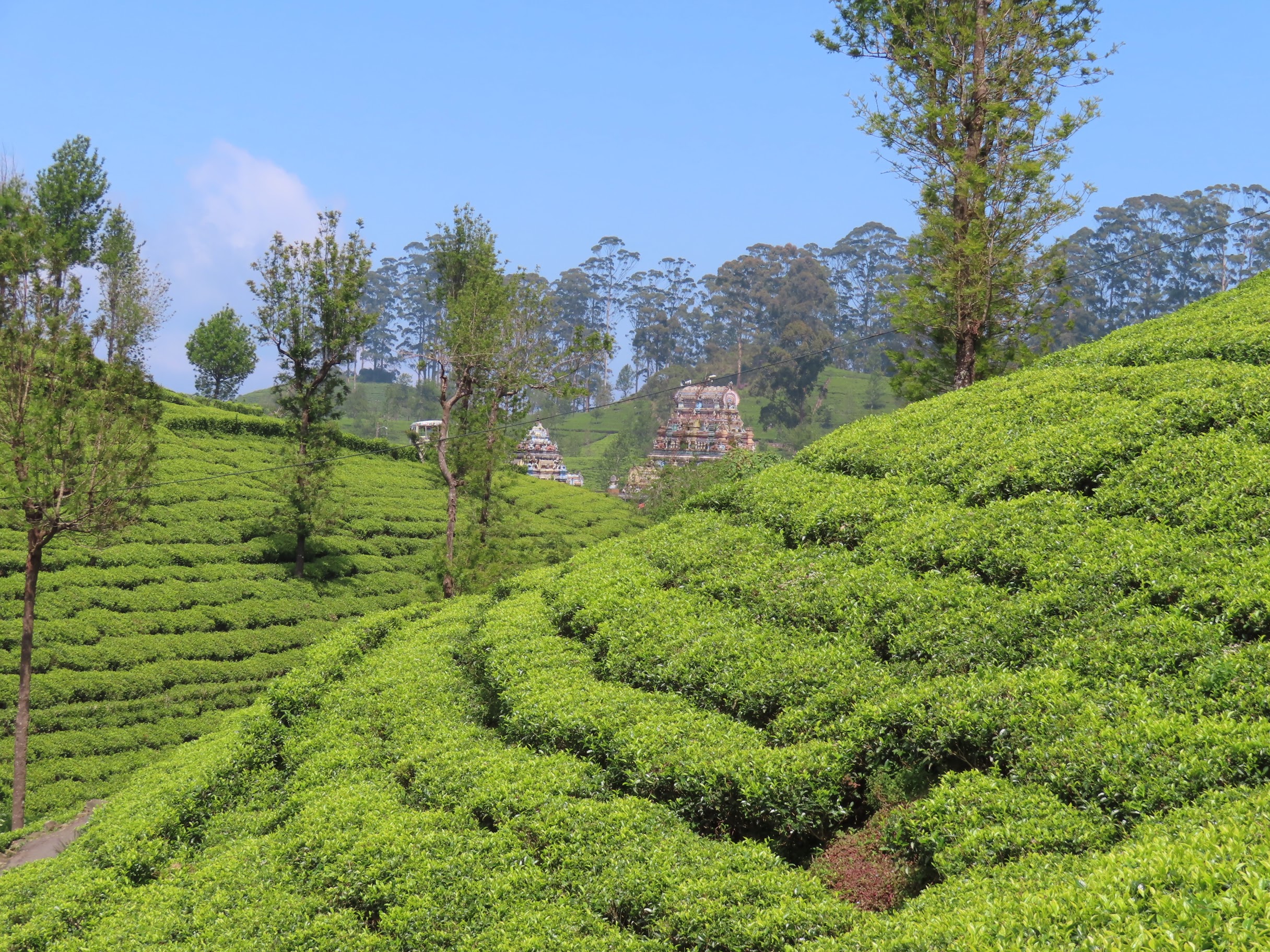 Le dernier article se concluait sur le fait que nous partions chercher la fraîcheur dans les montagnes sri-lankaises. On ne croyait pas si bien dire: à Nuwara Eliya d’où nous écrivons cet article, plus haute ville du pays perchée à 1900m, on supporte largement sa petite laine le soir et ses deux couvertures la nuit (il n’y a pas si longtemps, on n’imaginait pas dormir sans un ventilateur tournant en continu). C’est grâce à ce climat frais (mais pas trop, il ne gèle quasi jamais) que les anglais ont choisi cette région pour en faire une zone de production du thé (après avoir essayé le café, mais non ça n’a pas pris, ça ne tient vraiment à rien de créer toute une culture…). Les montagnes ont été patiemment aménagées, des dizaines de milliers de théiers ont été plantés et au moins dix fois plus de tamouls ont été ramenés d’Inde du Sud exprès pour cultiver tout ça. Encore aujourd’hui, ce sont ces mêmes tamouls hindouistes (contrairement au reste de la population qui est bouddhiste) qui cultivent le thé, tâche on ne peut plus difficile et assez mal rémunérée.