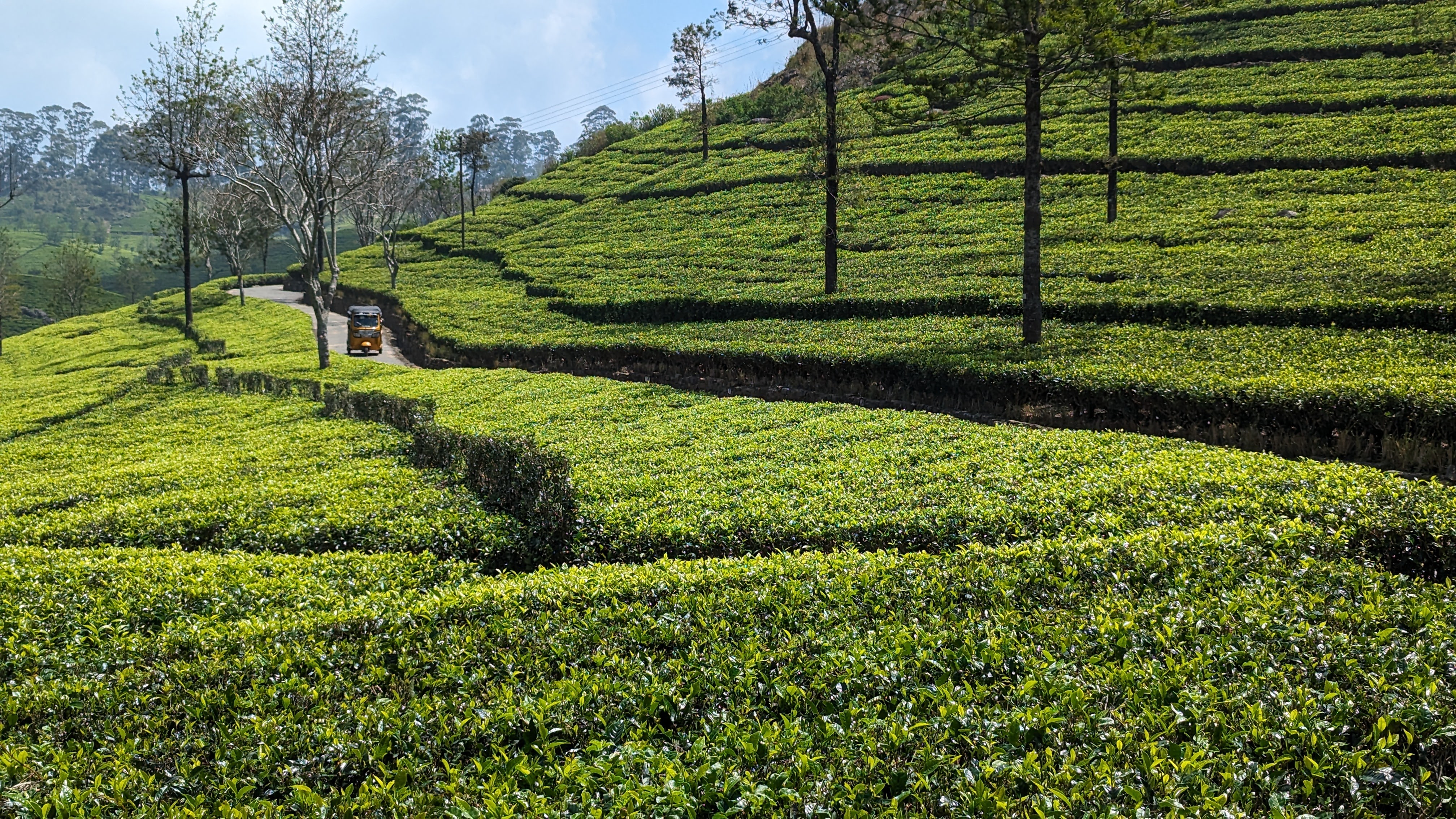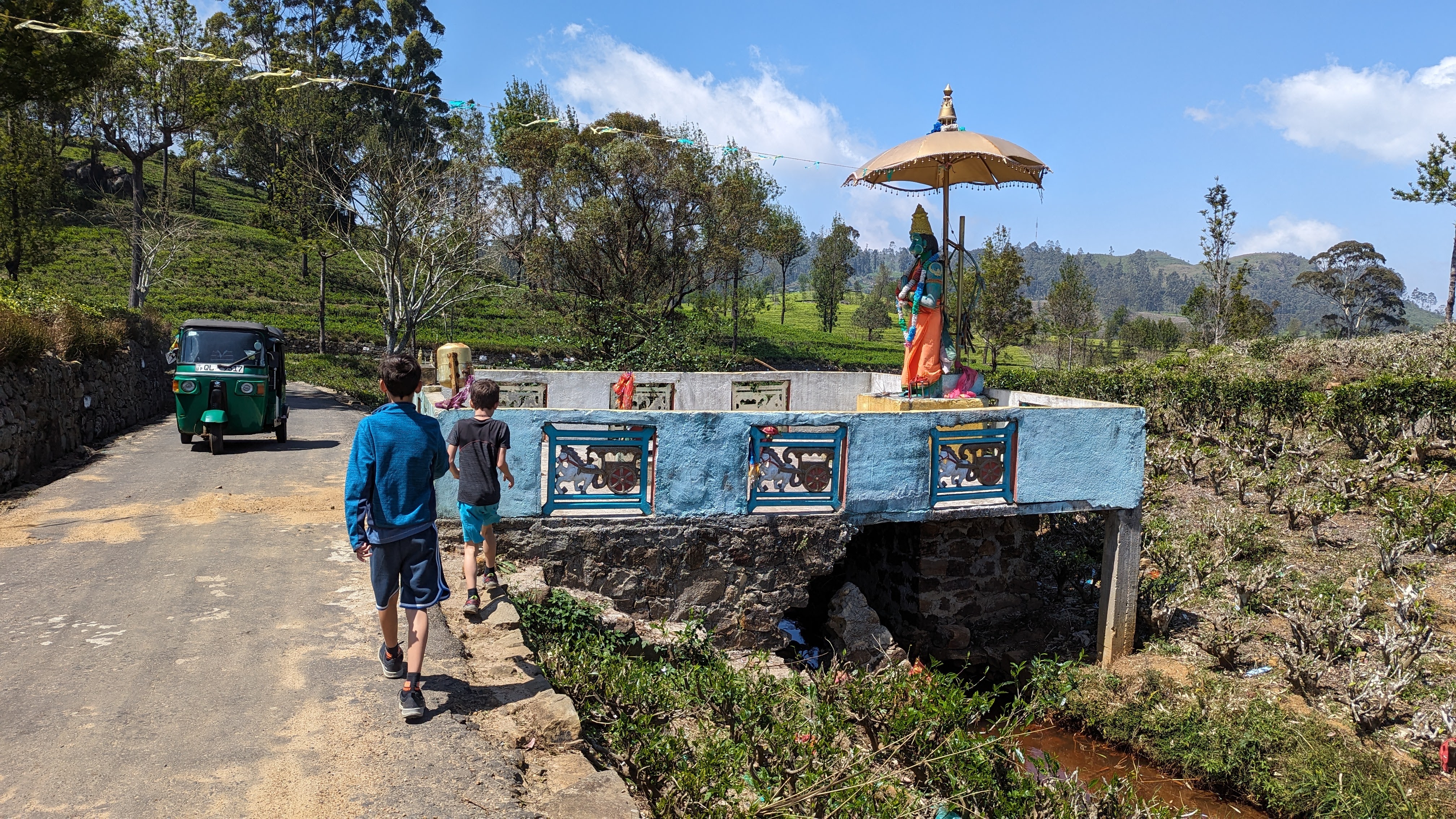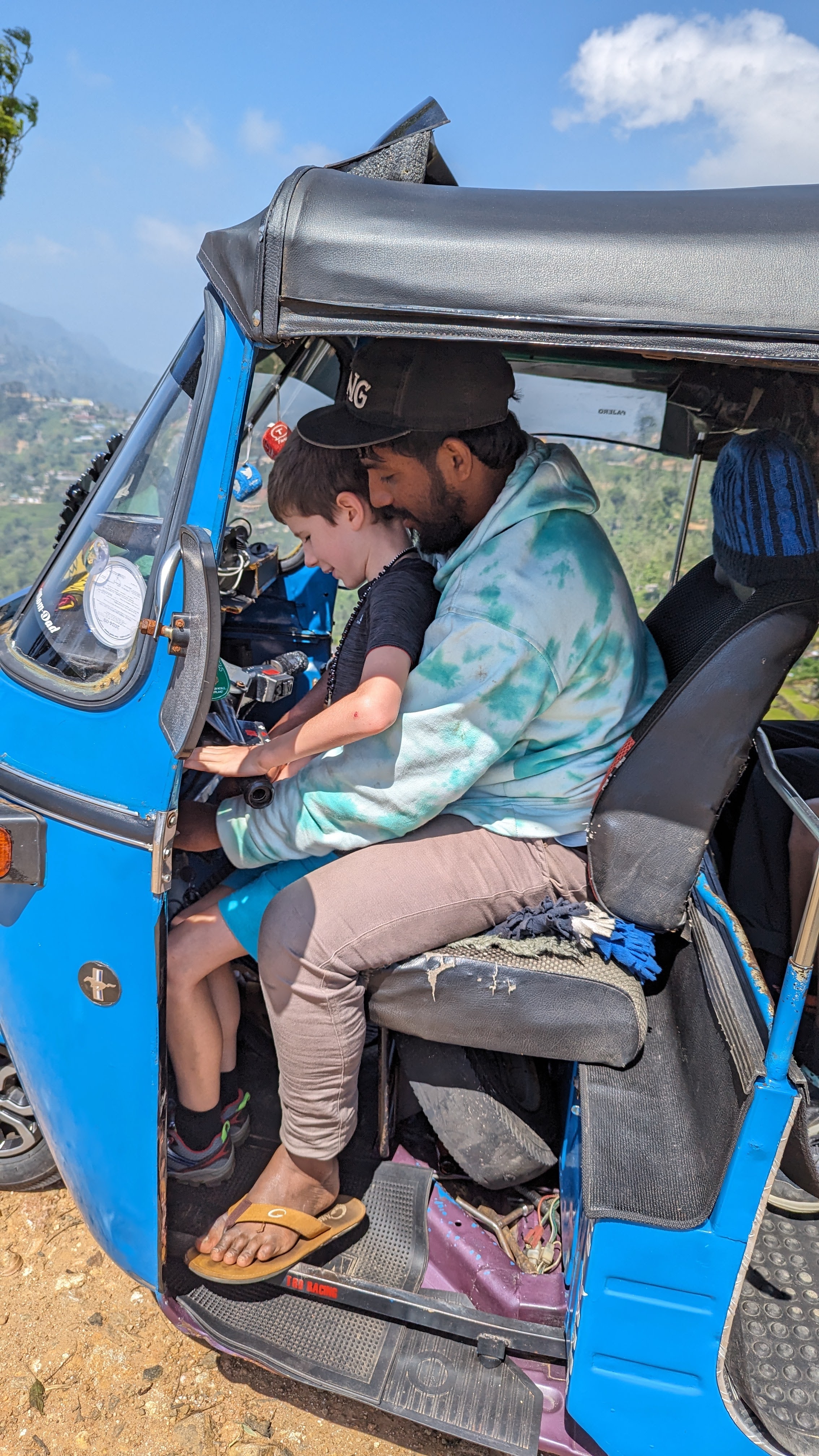 Et c’est ici en particulier que sir Lipton – oui, celui des sachets – acheta sa première plantation et créa son empire. Au sommet d’une des collines dominant les environs, il aimait dit-on méditer en regardant les ondulations vertes des arbustes qui faisaient sa fortune. C’est pour cette raison que le lieu s’appelle aujourd’hui Lipton’s Seat, et c’est précisément là que nous nous sommes rendus (en tuk-tuk à l’aller, à pied au retour). Avec un plaisir particulier pour Florent qui a eu le droit de prendre les commandes de notre bolide décoré aux couleurs de la France.