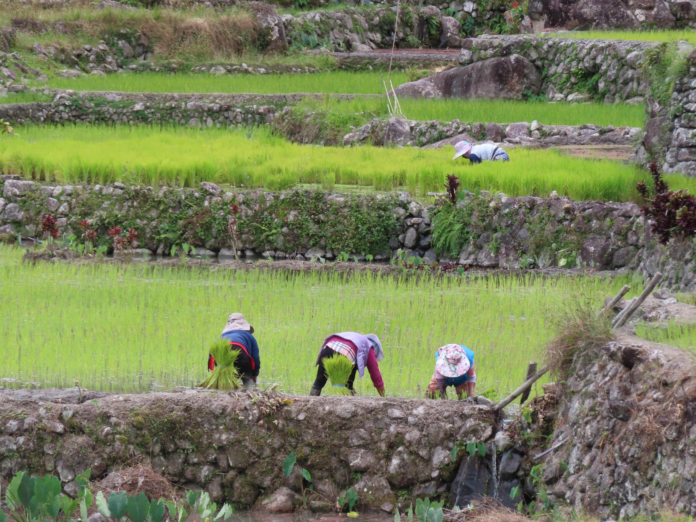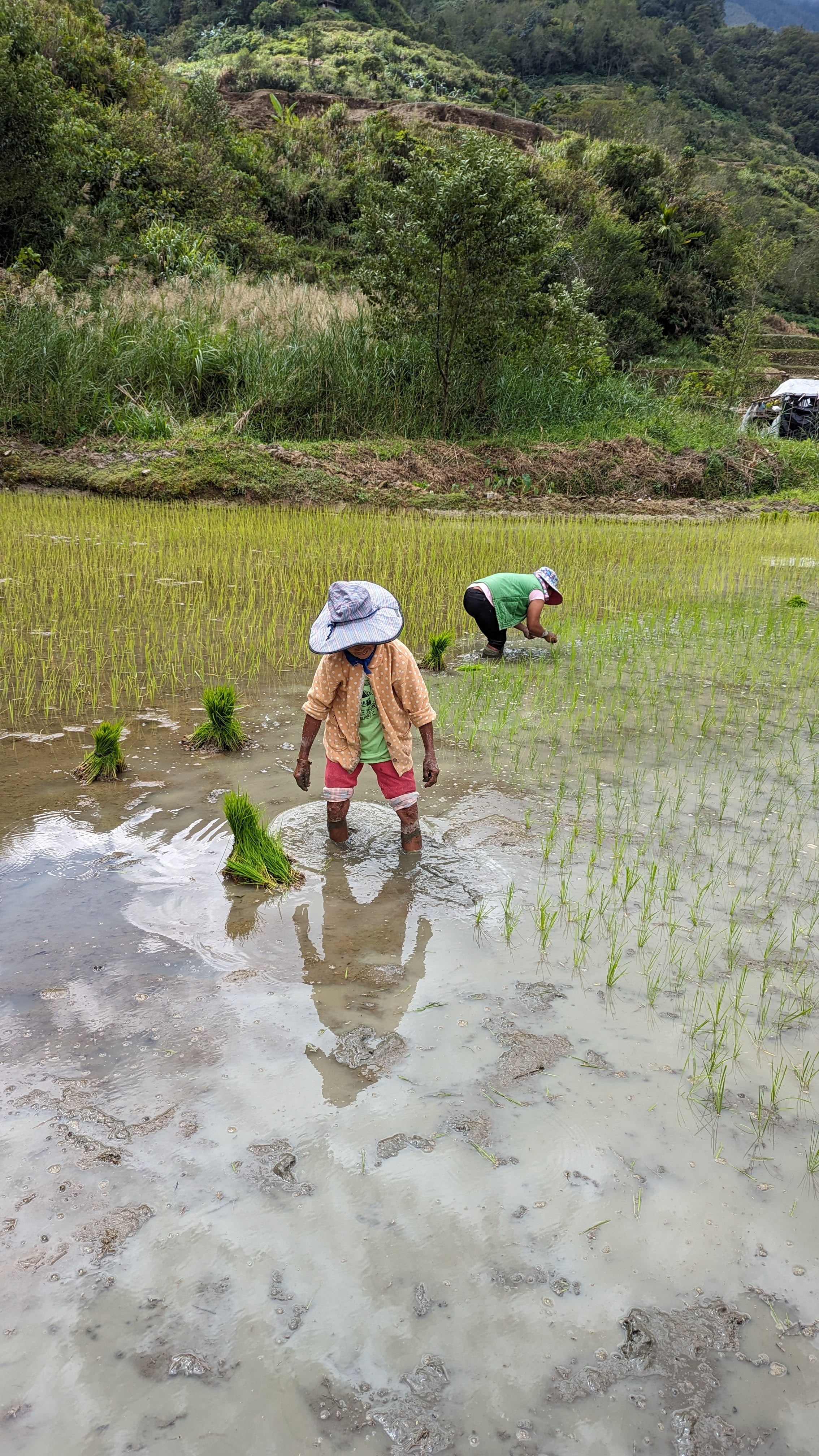 On croise quelques personnes (exclusivement des femmes) à l’œuvre pour repiquer du riz en lignes bien ordonnées, enfonçant un à un les jeunes plants dans la boue en respectant scrupuleusement l’espace entre chacun. On se demande ce qui est le pire entre ça et ramasser du thé dans les collines du Sri Lanka. Avoir le dos cassé en deux et les pieds dans la boue toute la journée nous semble placer la riziculture traditionnelle assez haut dans l’échelle des métiers usants.