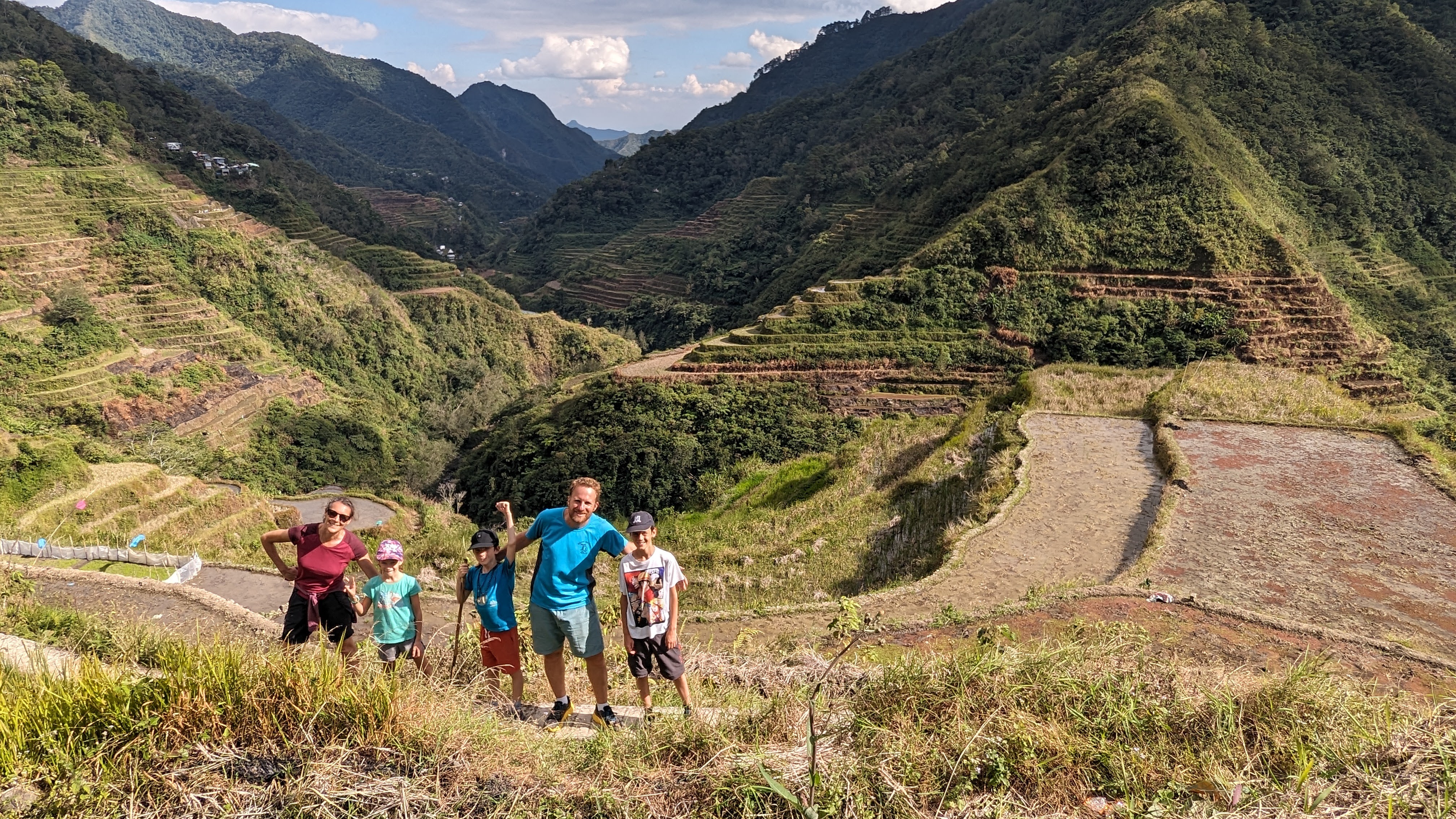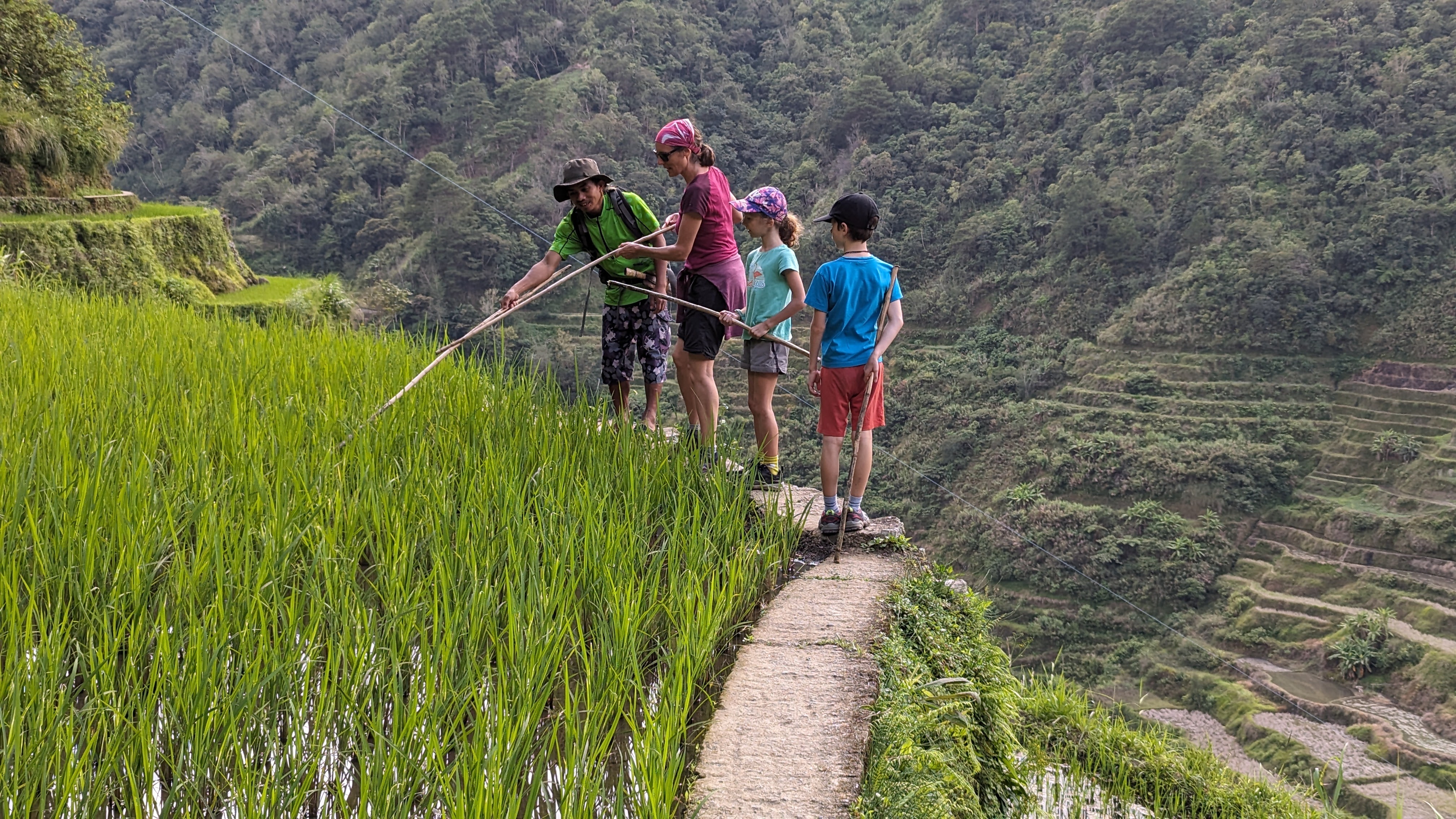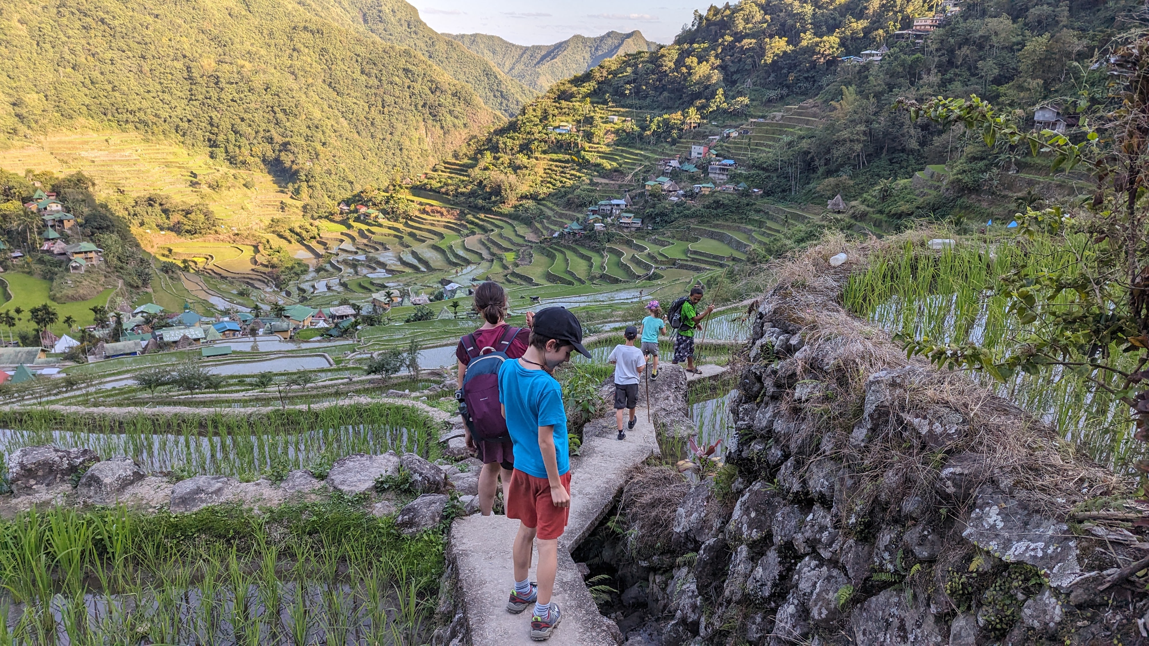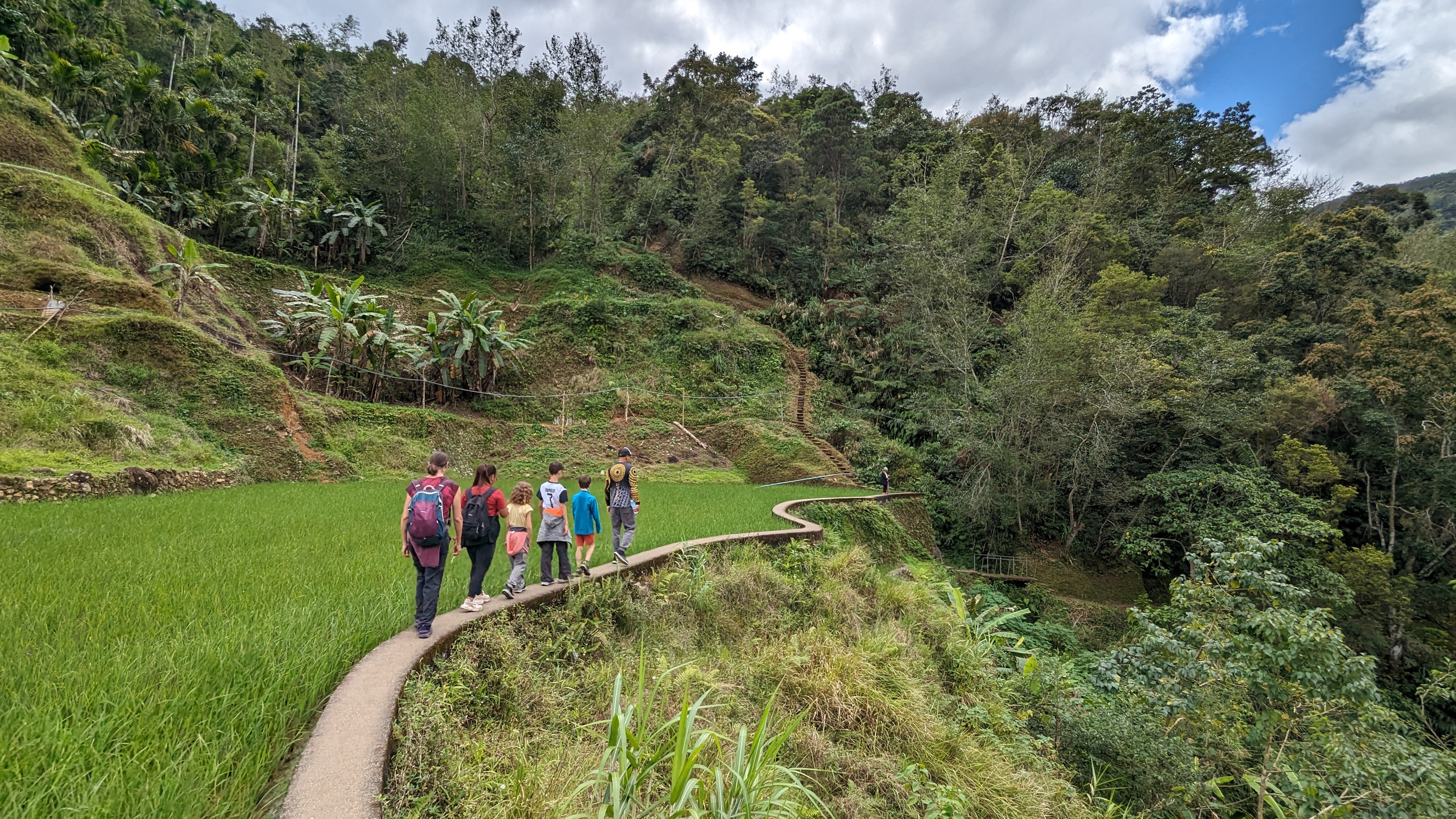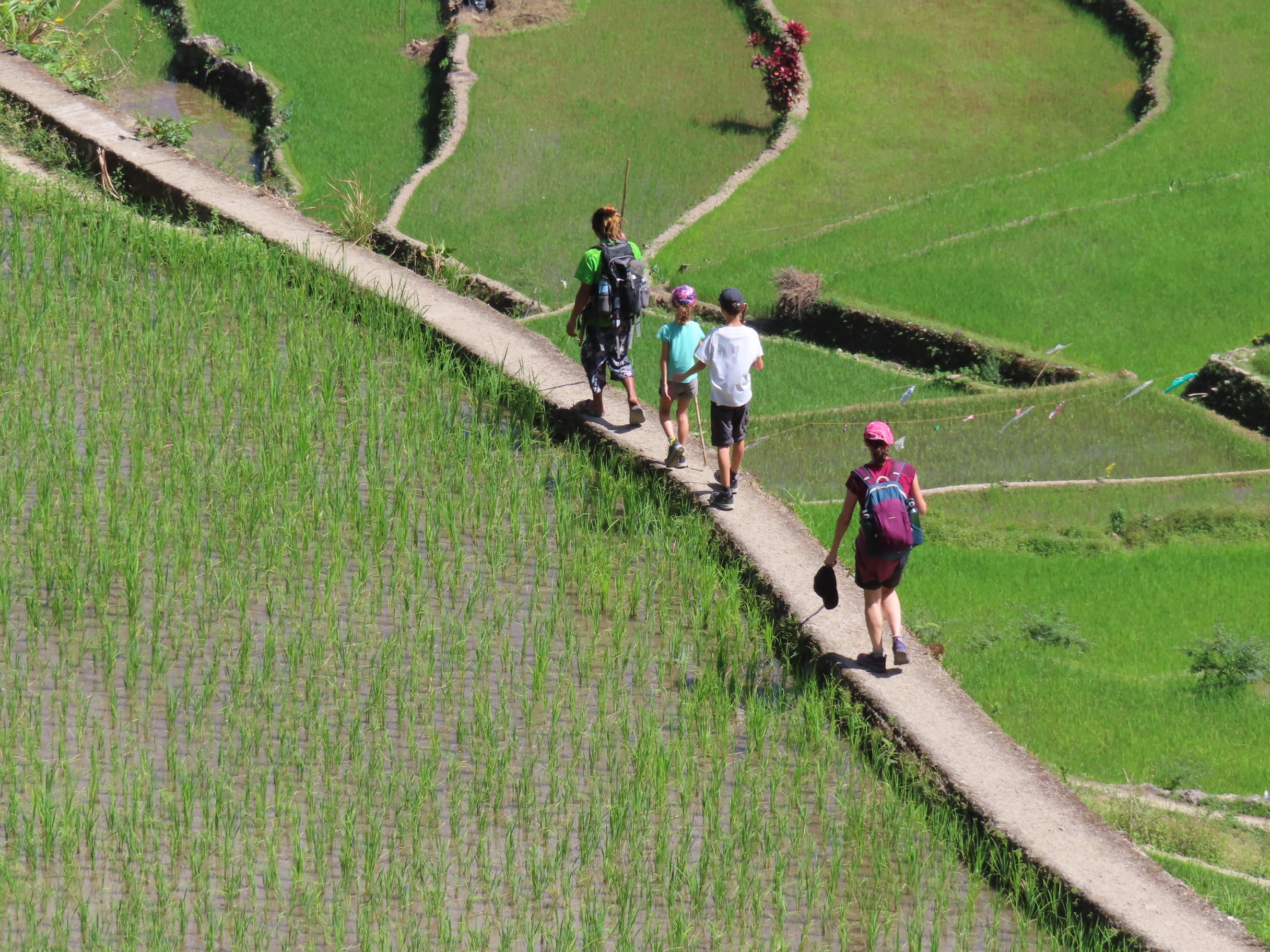 Il a fallu malheureusement en finir avec les rizières de la Cordillera par une dernière journée de marche nous permettant de revenir dans le monde moderne pour y retrouver route et voitures (et accessoirement continuer notre voyage). Heureusement, le chemin ne manquait toujours pas d’attrait. Les enfants avaient l’esprit si bien occupés qu’on ne les a pas entendus se plaindre une seule fois de toute la randonnée !