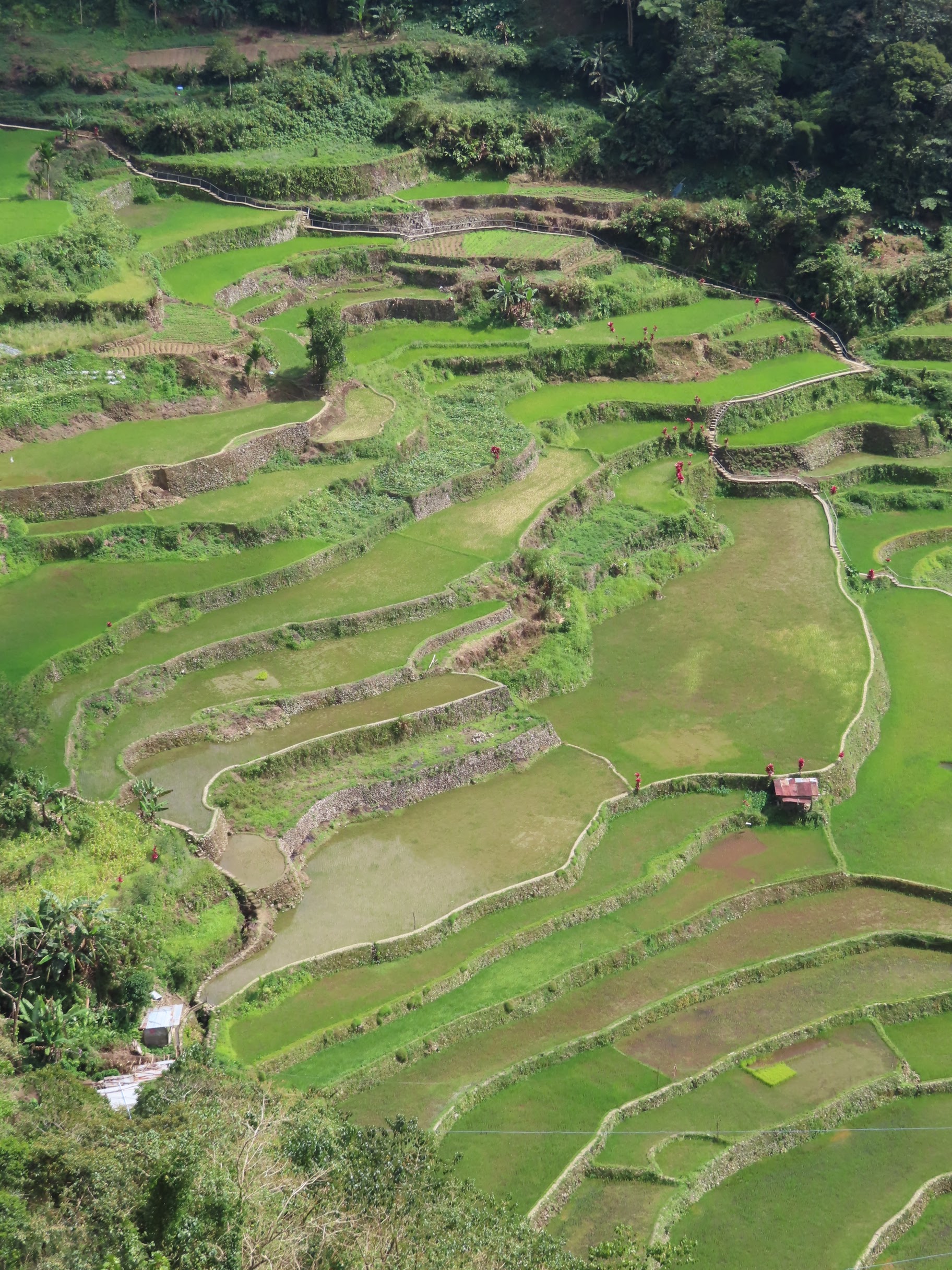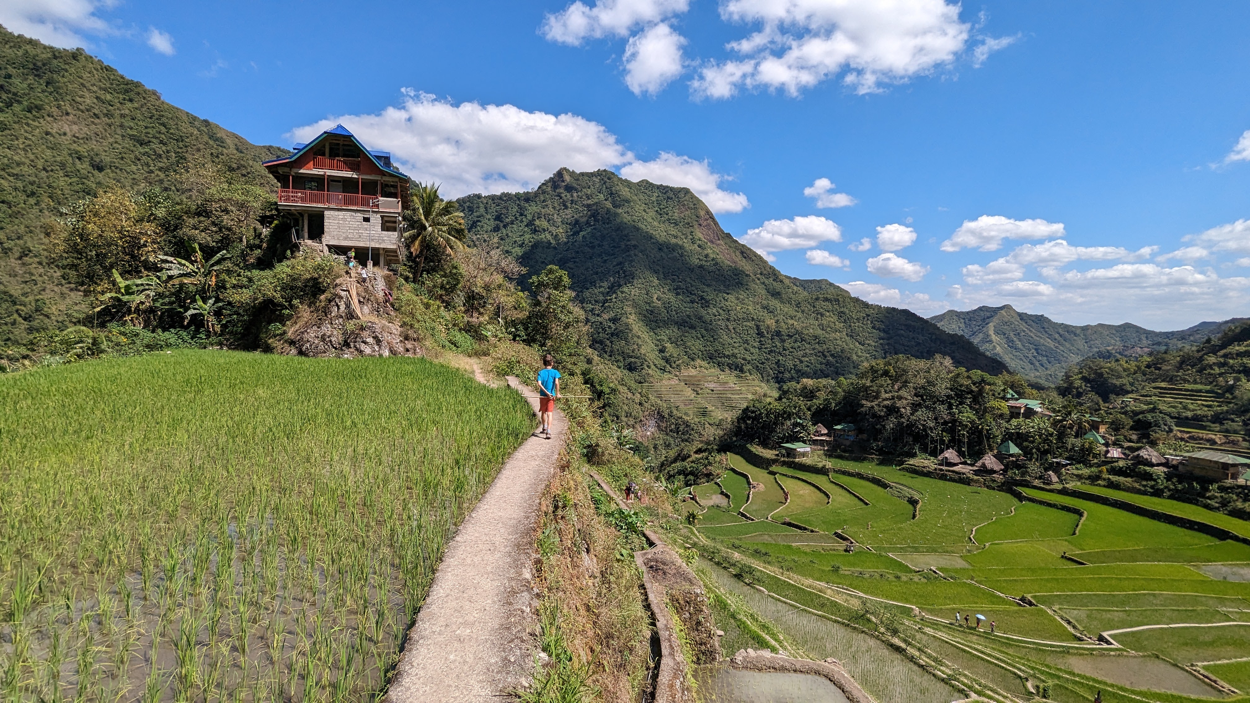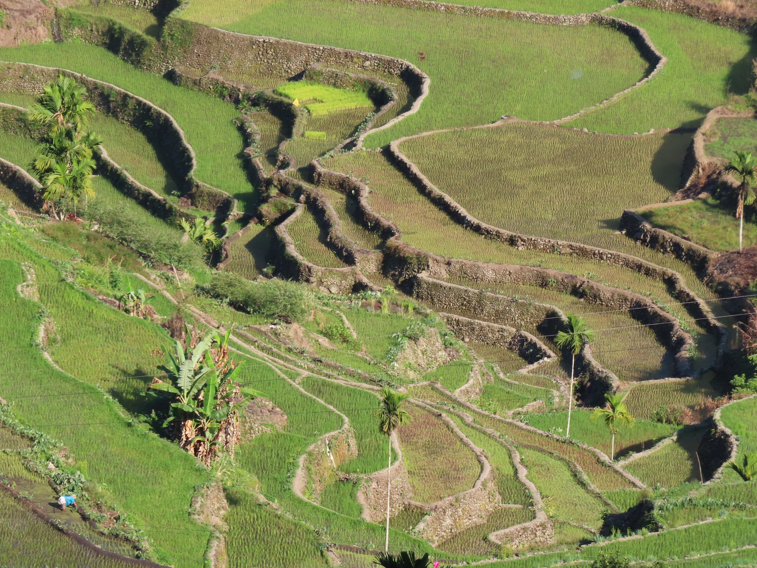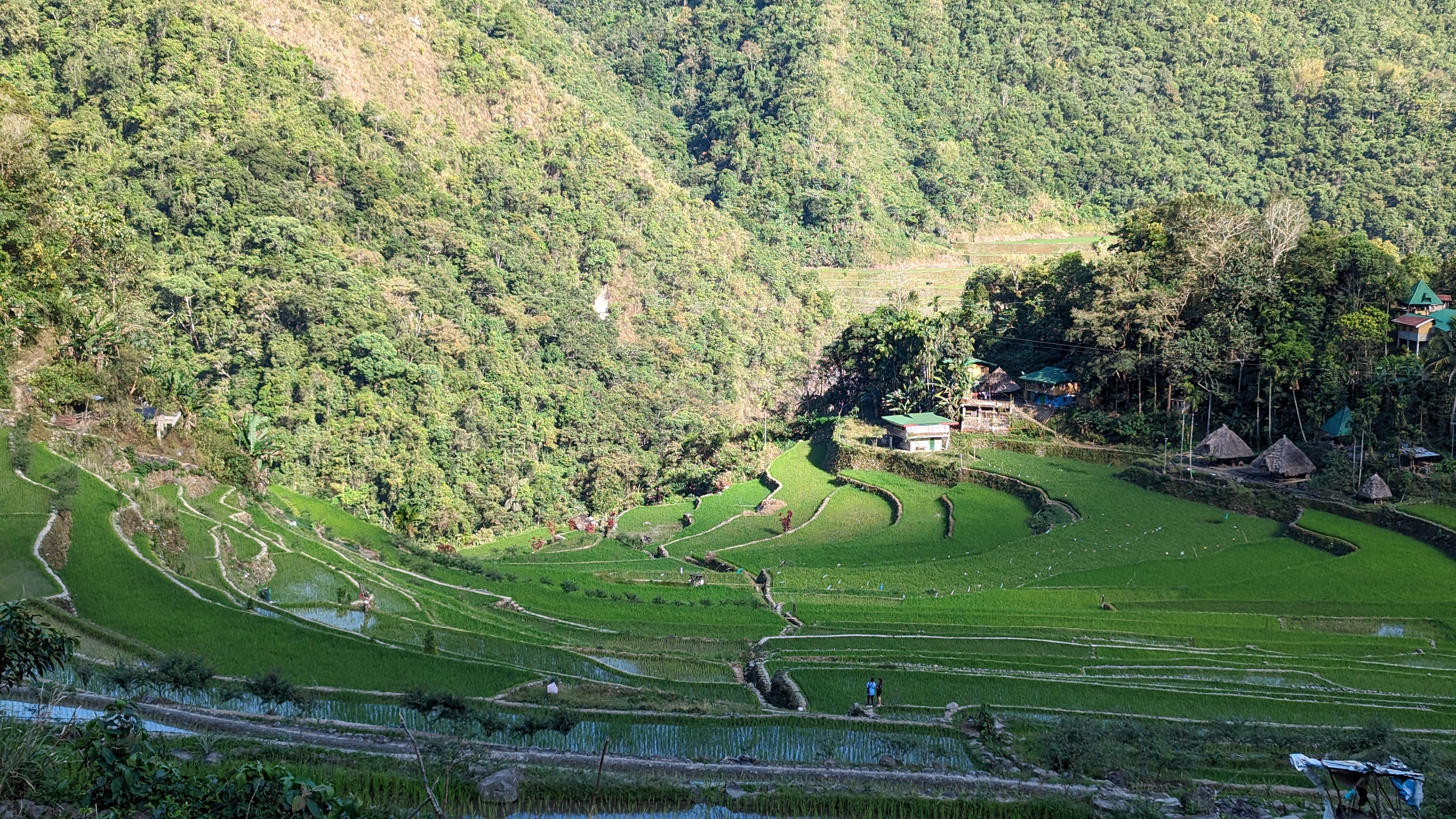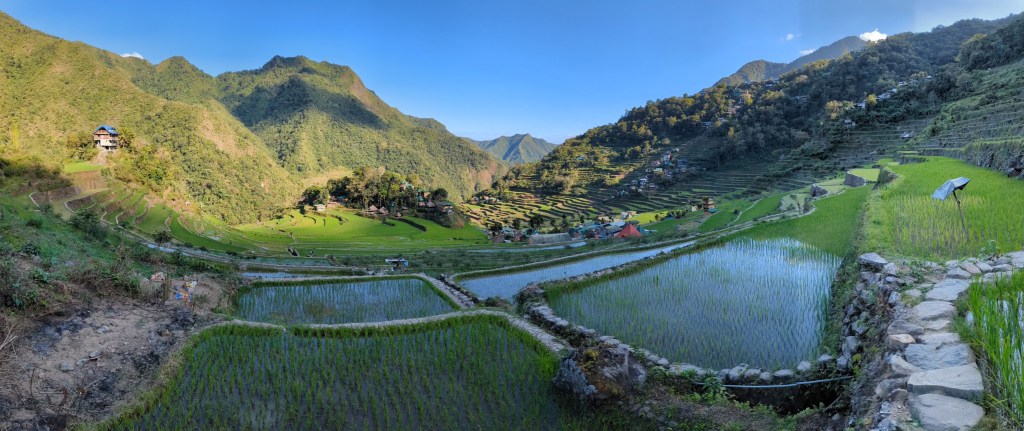 Bon, c’est bien gentil tout ça mais ça fait au moins deux paragraphes qu’on n’a pas prononcé le mot « rizière » ! Donc au deuxième jour de rando, direction le village de Cambulo, inaccessible par la route, où nous avons passé la nuit. Un havre de pays perdu au milieu des montagnes abruptes, couvertes de lianes, fougère arborescentes et autres bananiers, un endroit improbable où les hommes ont décidé il y a 2000 ans que ce serait une bonne idée que d’aplatir les montagnes, construire des murs et monter un système d’irrigation complexe pour y faire pousser des trucs. Les mots manquent pour décrire ces paysages. Ou alors ils ne feraient que banaliser l’exceptionnel. Du coup il vaut mieux laisser parler les images…