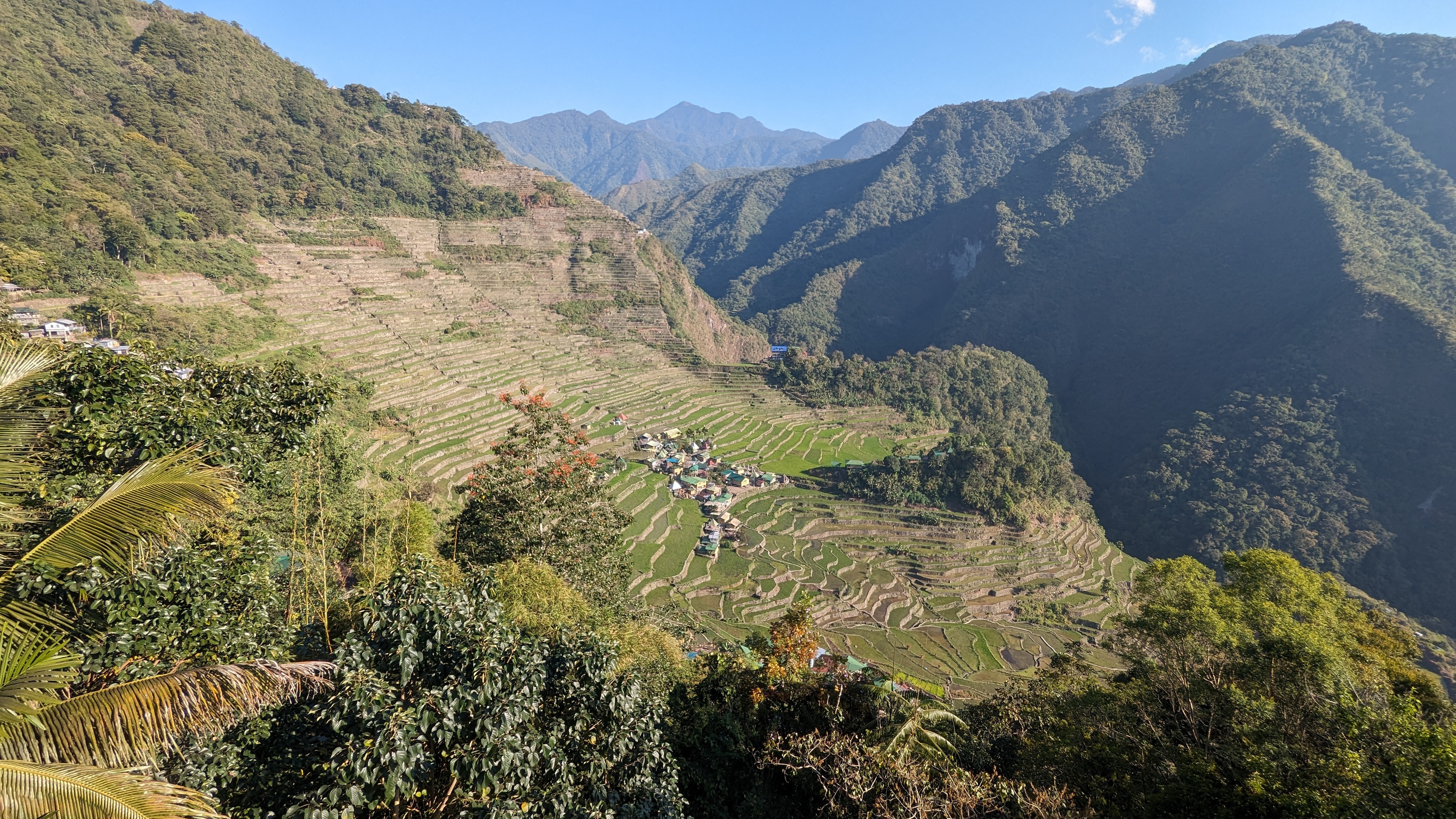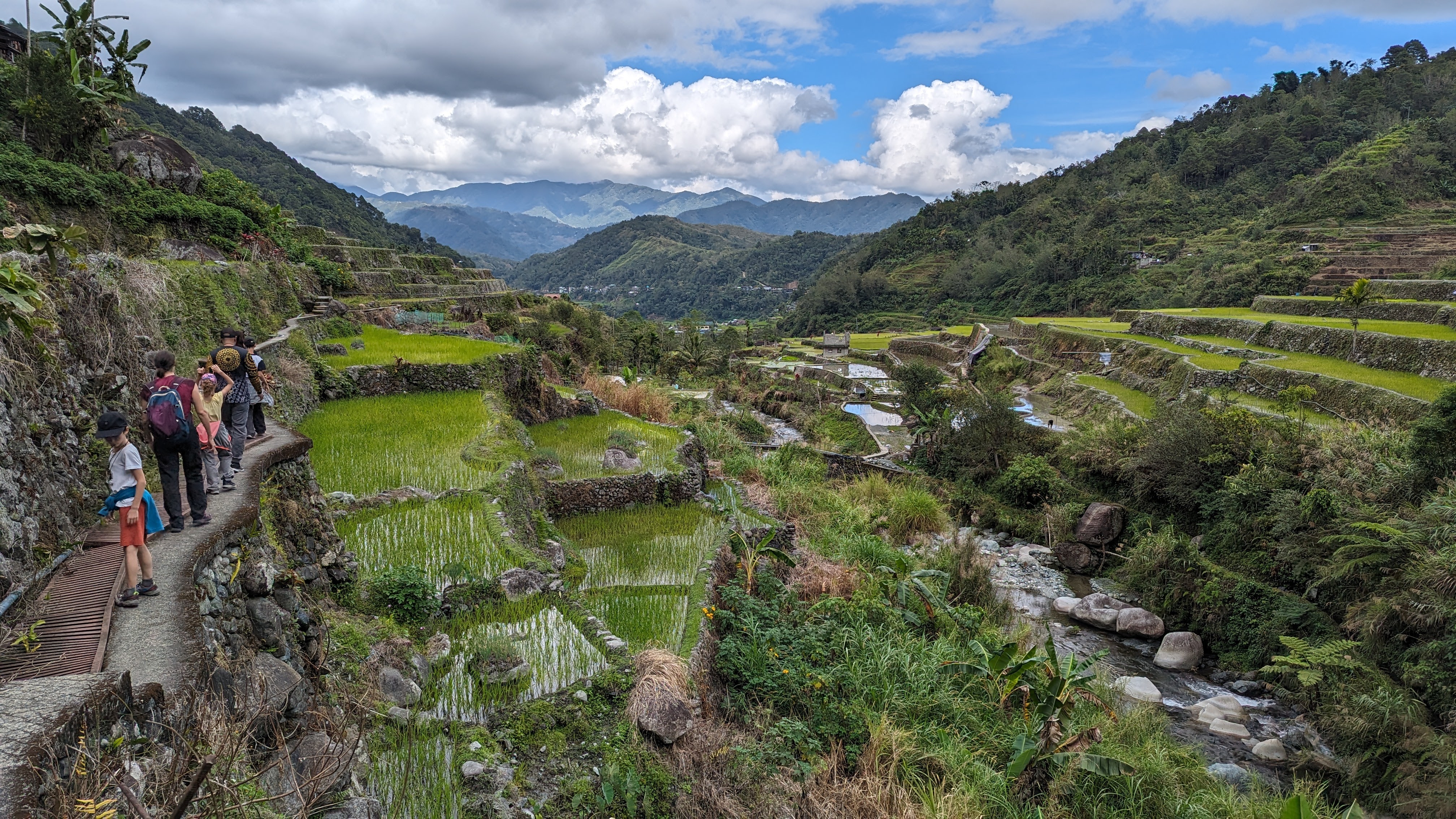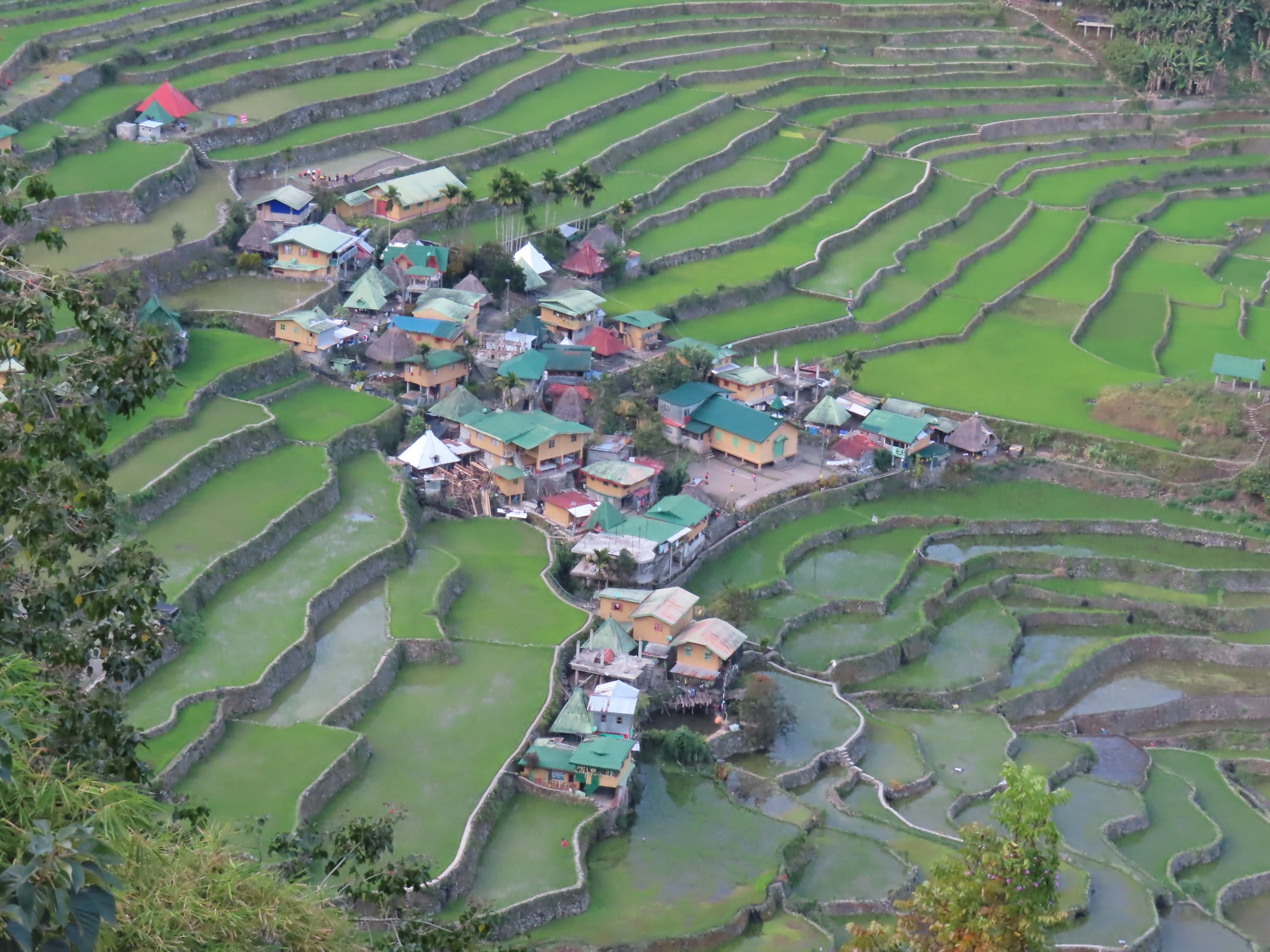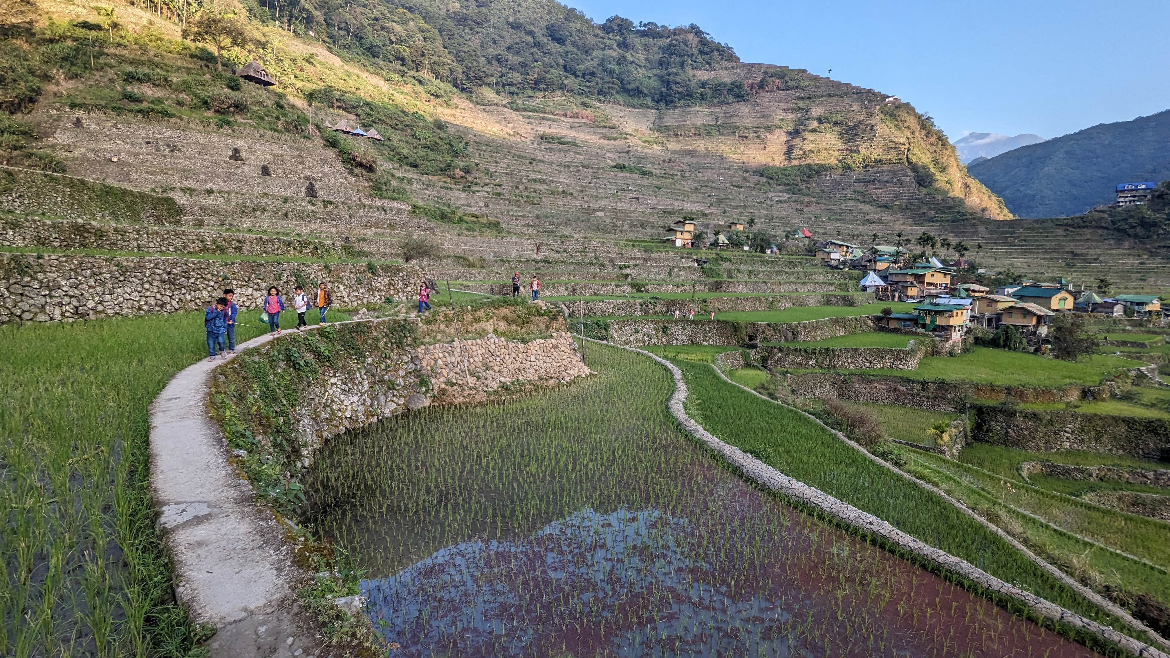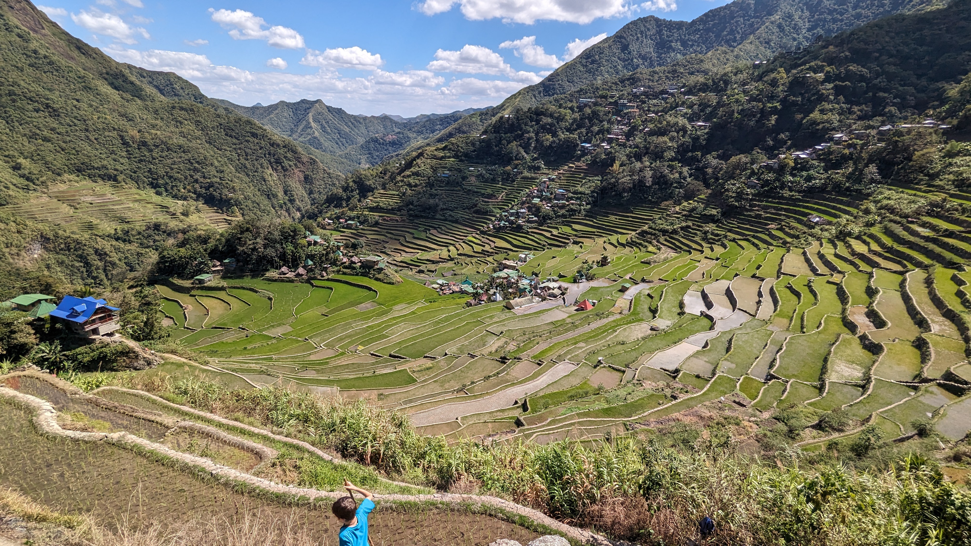 Bon, c’est bien gentil tout ça mais ça fait au moins deux paragraphes qu’on n’a pas prononcé le mot « rizière » ! Donc au deuxième jour de rando, direction le village de Cambulo, inaccessible par la route, où nous avons passé la nuit. Un havre de pays perdu au milieu des montagnes abruptes, couvertes de lianes, fougère arborescentes et autres bananiers, un endroit improbable où les hommes ont décidé il y a 2000 ans que ce serait une bonne idée que d’aplatir les montagnes, construire des murs et monter un système d’irrigation complexe pour y faire pousser des trucs. Les mots manquent pour décrire ces paysages. Ou alors ils ne feraient que banaliser l’exceptionnel. Du coup il vaut mieux laisser parler les images…