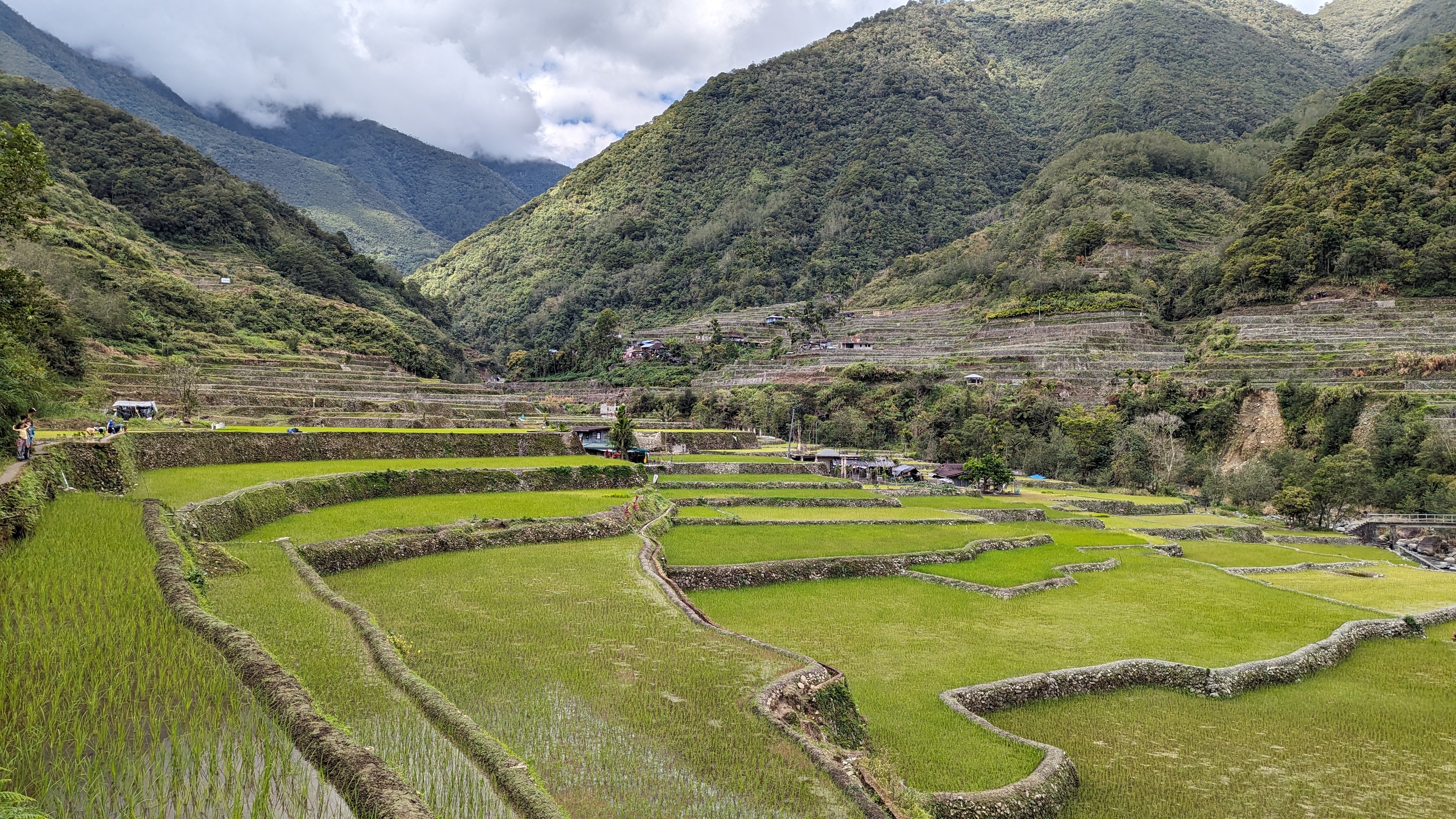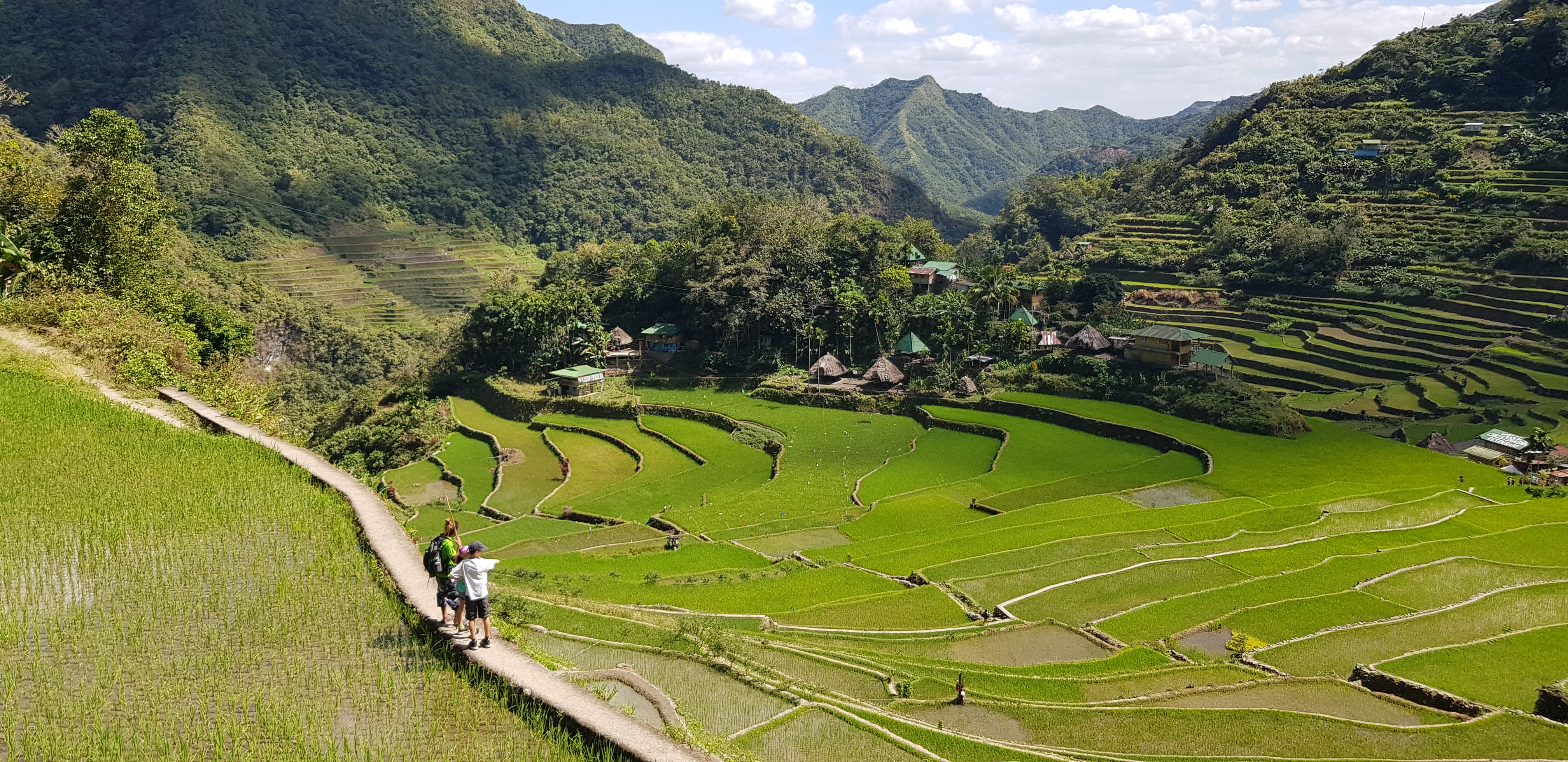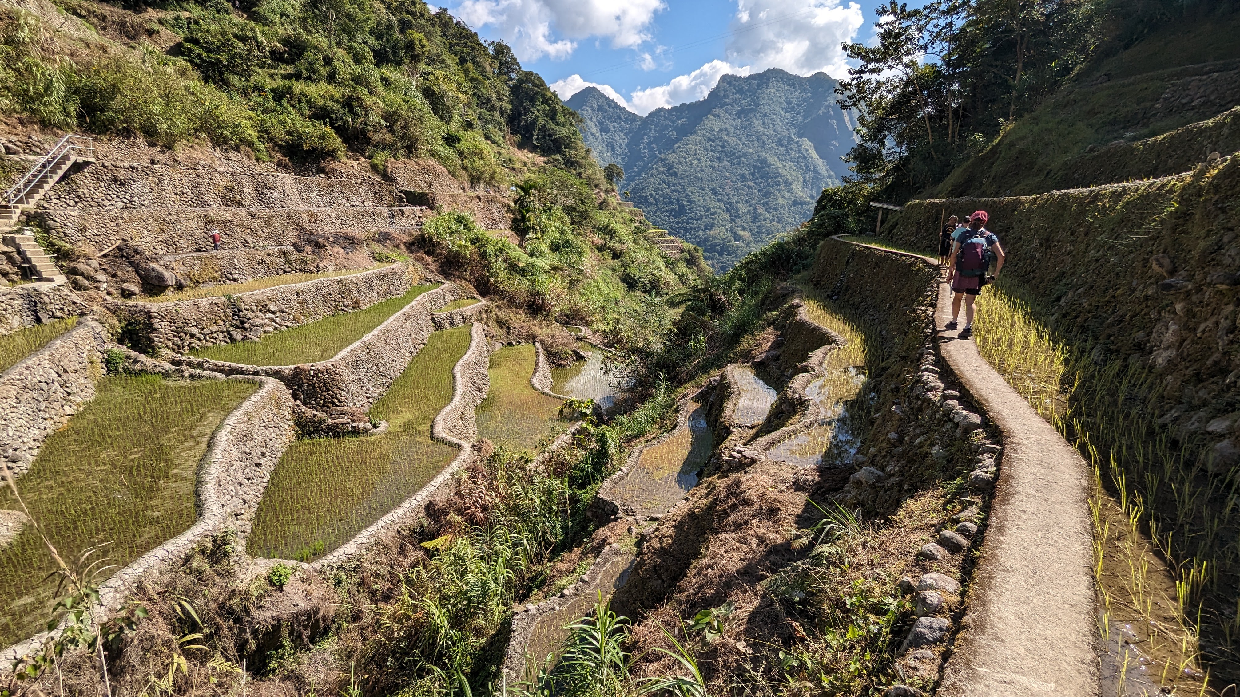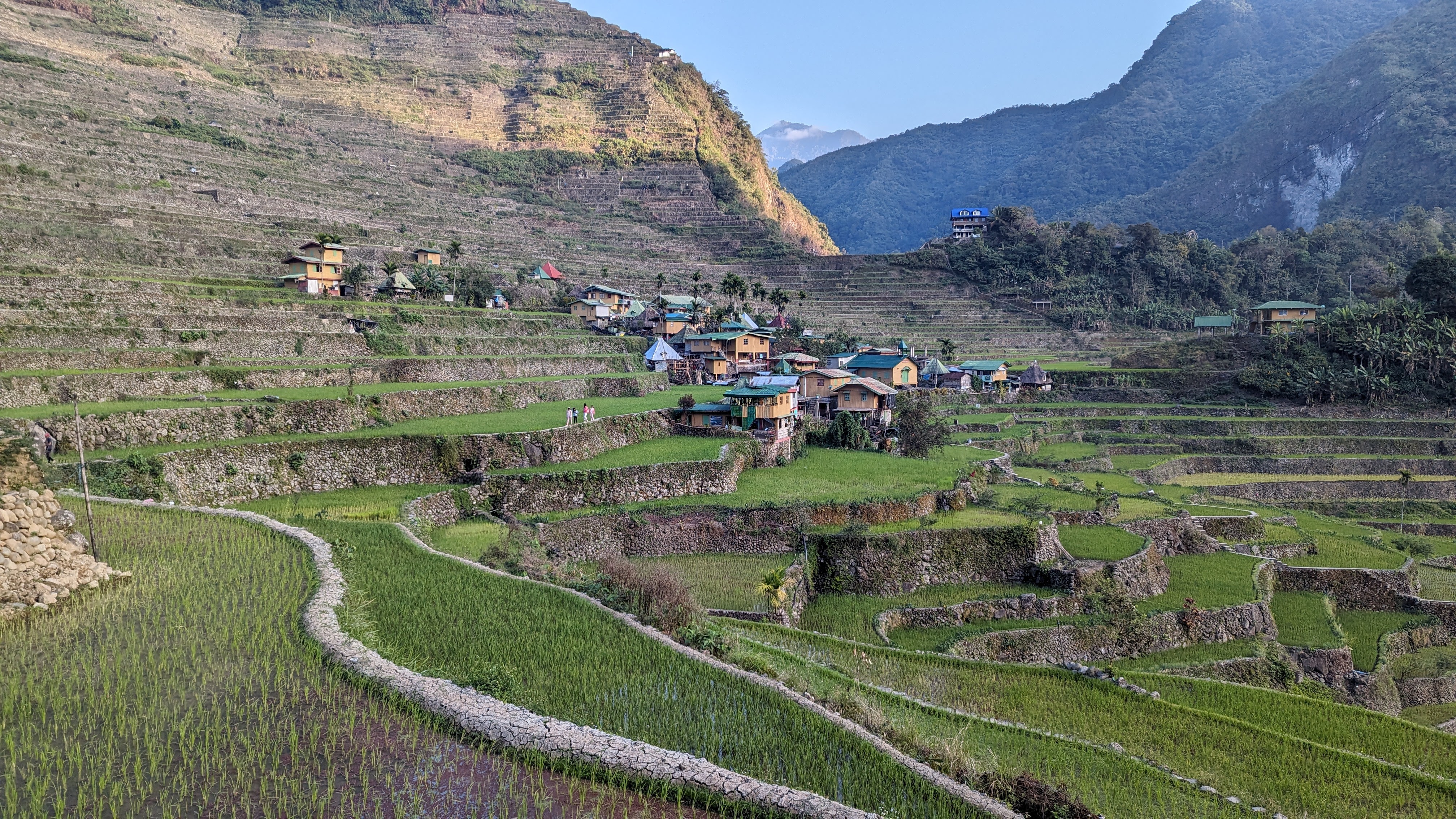 Bon, c’est bien gentil tout ça mais ça fait au moins deux paragraphes qu’on n’a pas prononcé le mot « rizière » ! Donc au deuxième jour de rando, direction le village de Cambulo, inaccessible par la route, où nous avons passé la nuit. Un havre de pays perdu au milieu des montagnes abruptes, couvertes de lianes, fougère arborescentes et autres bananiers, un endroit improbable où les hommes ont décidé il y a 2000 ans que ce serait une bonne idée que d’aplatir les montagnes, construire des murs et monter un système d’irrigation complexe pour y faire pousser des trucs. Les mots manquent pour décrire ces paysages. Ou alors ils ne feraient que banaliser l’exceptionnel. Du coup il vaut mieux laisser parler les images…