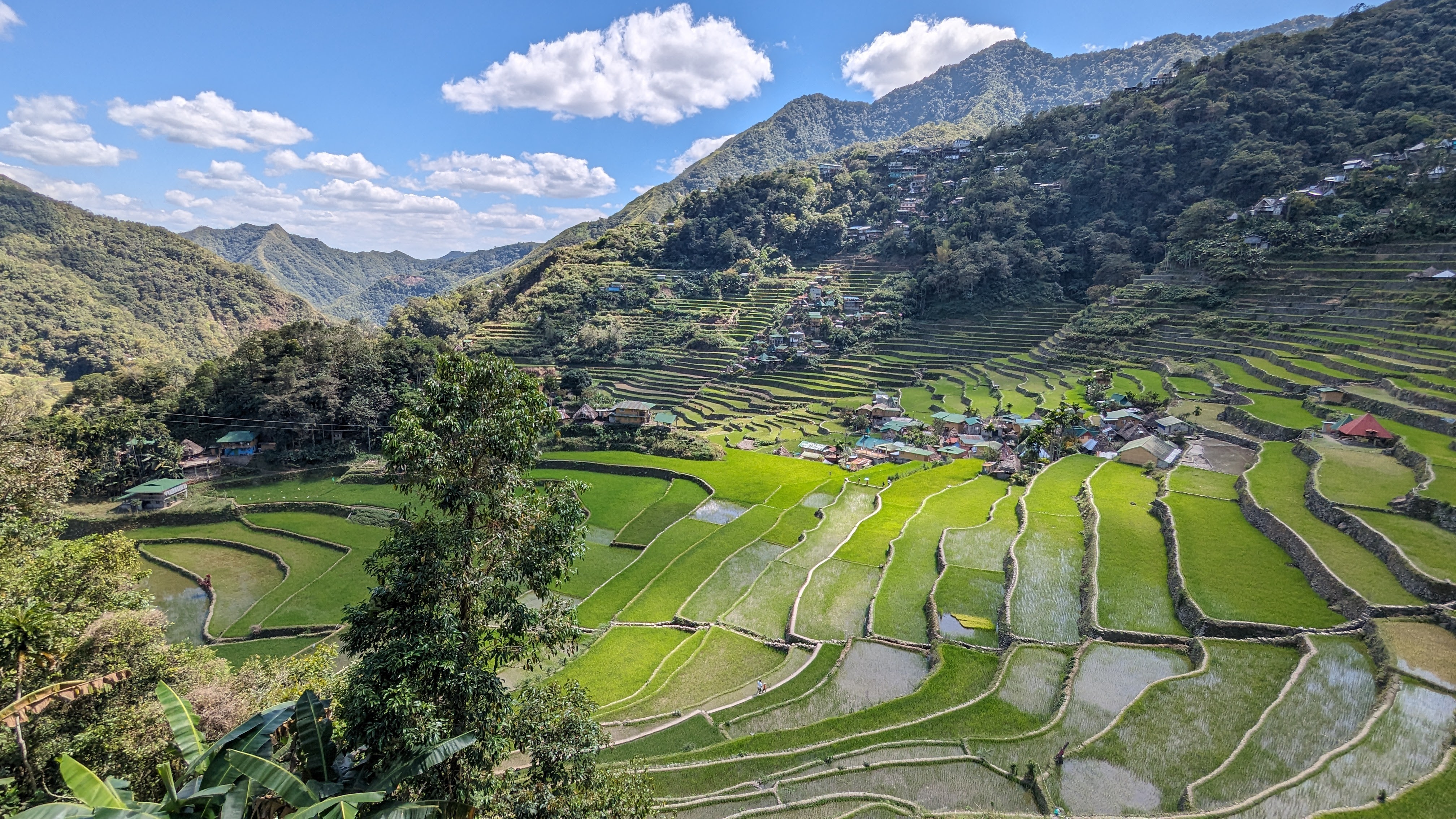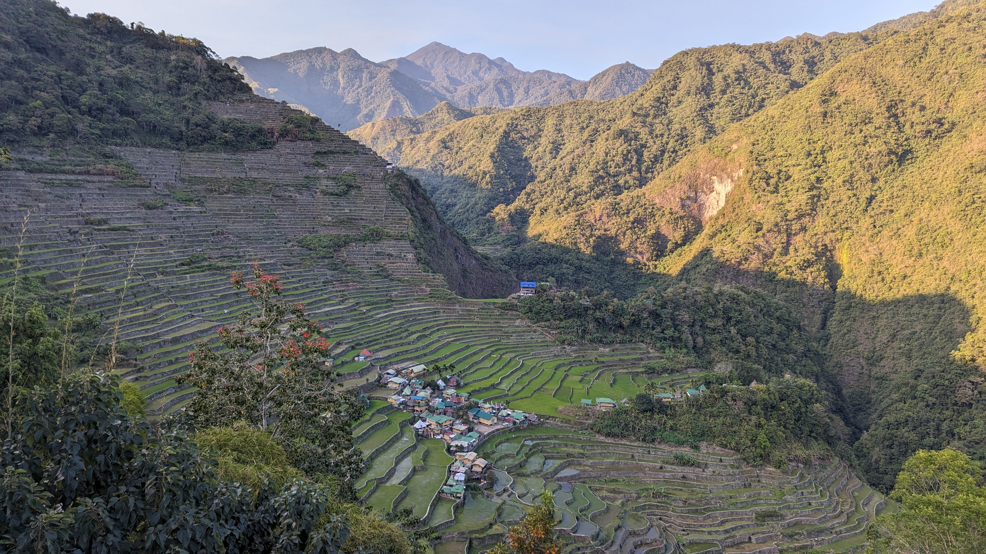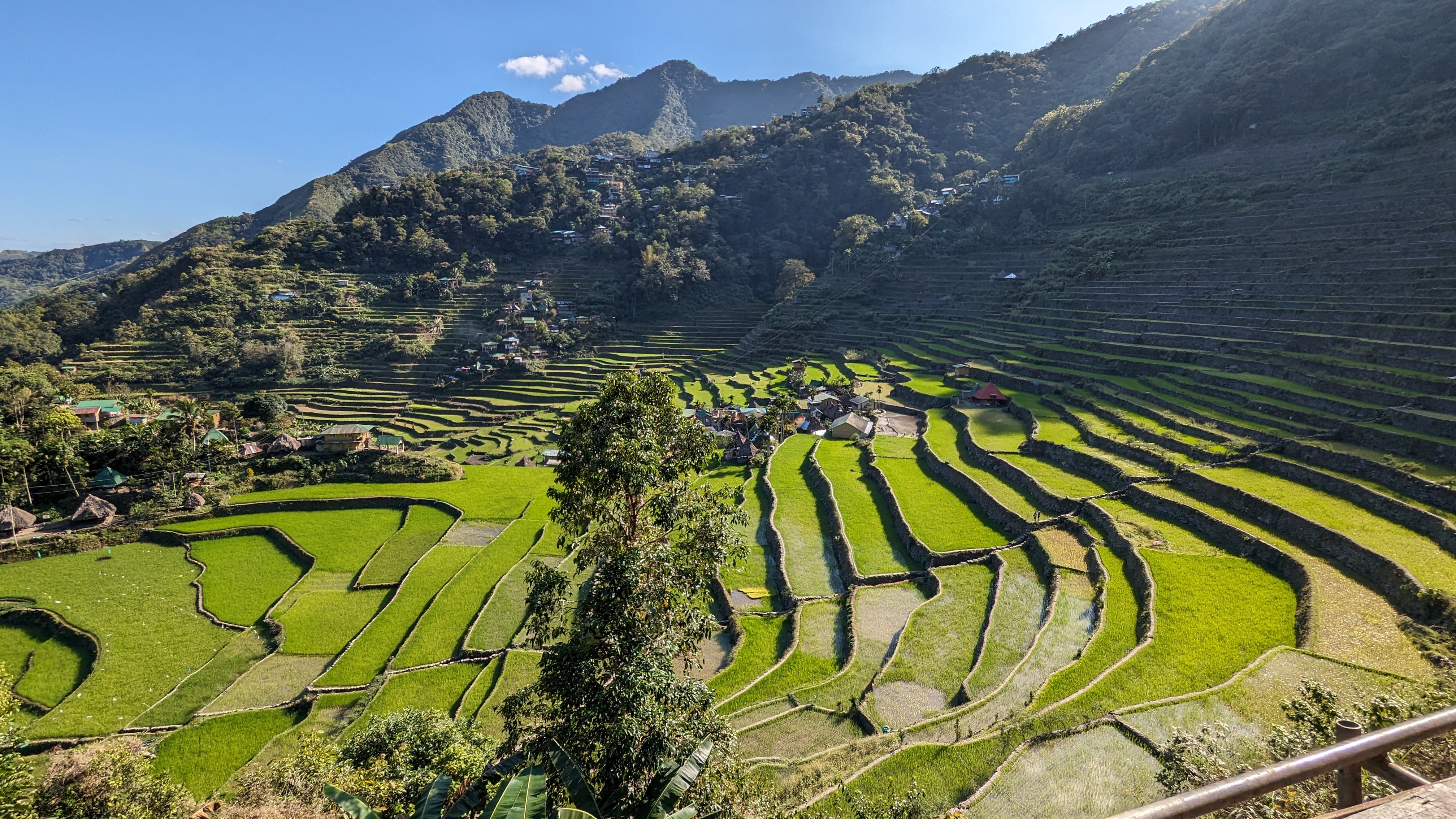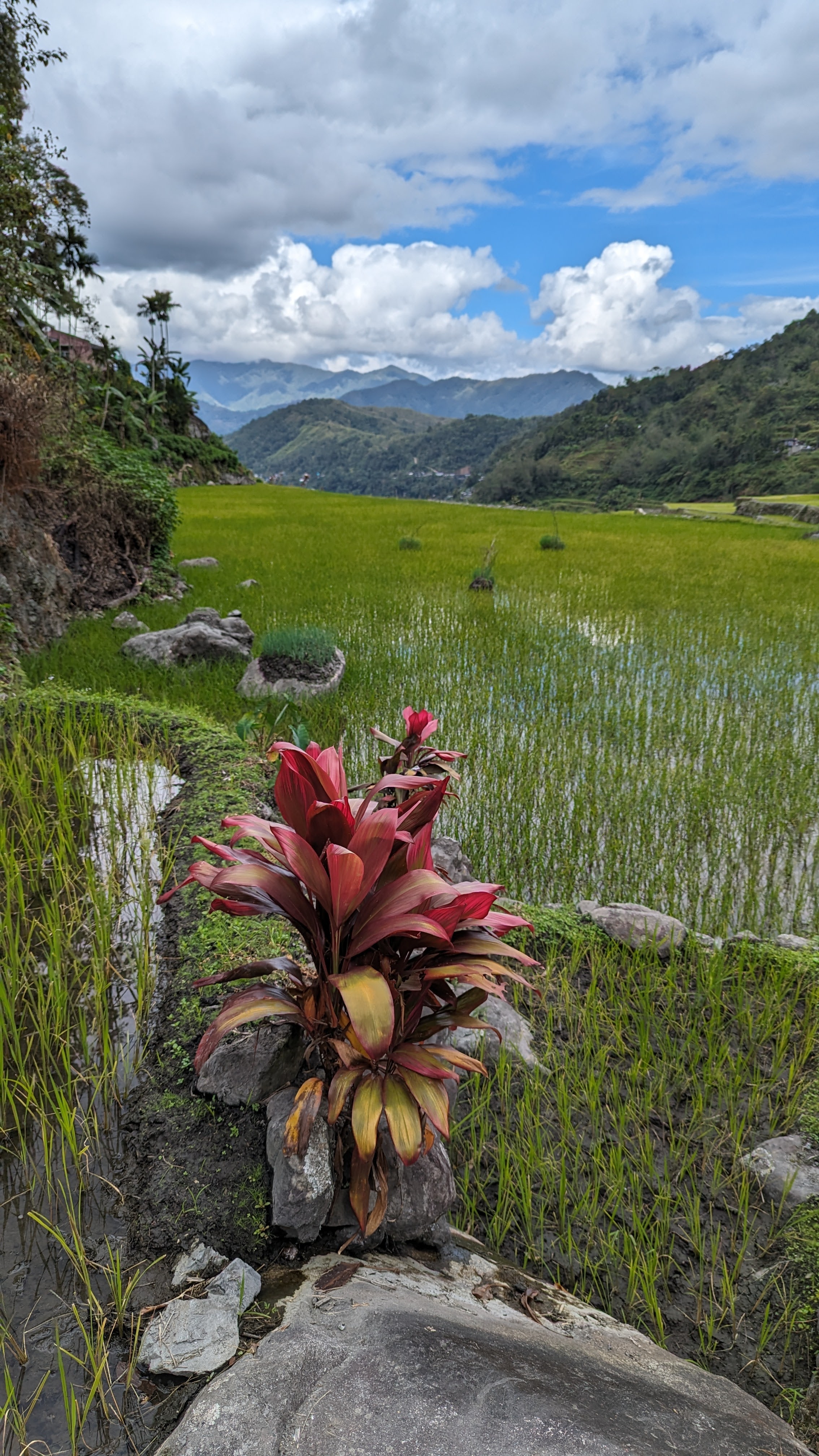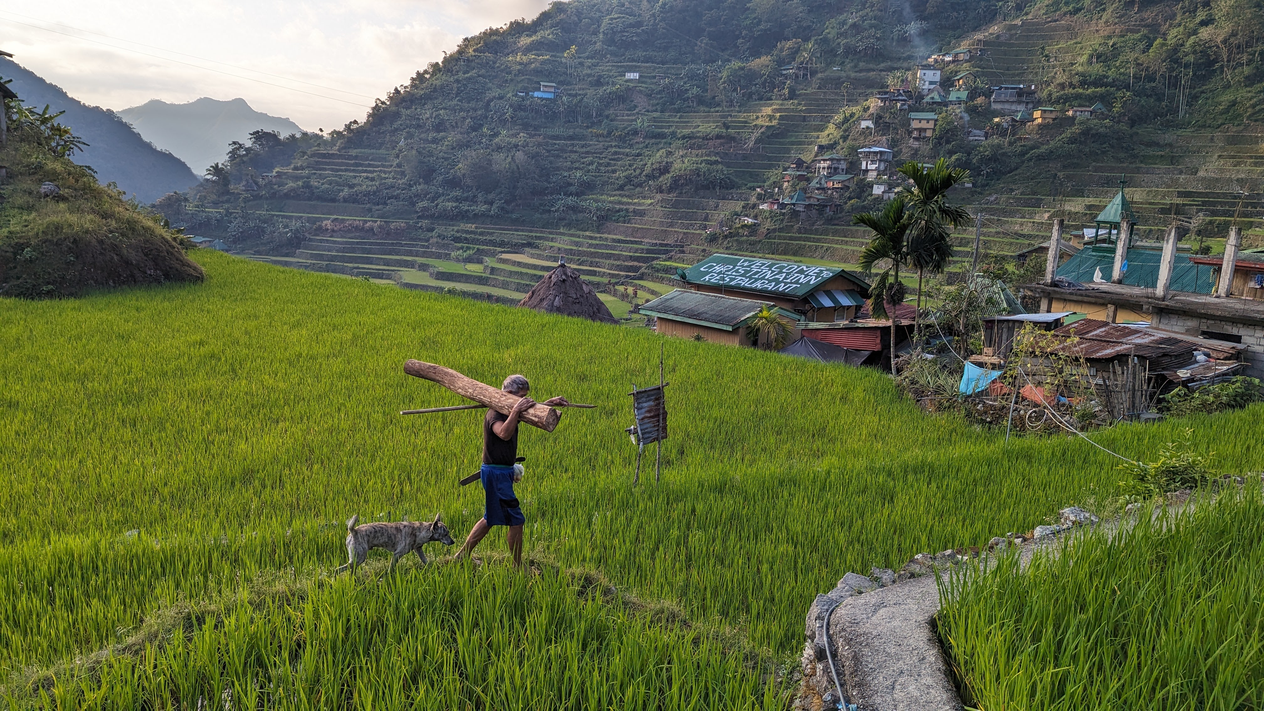 Bon, c’est bien gentil tout ça mais ça fait au moins deux paragraphes qu’on n’a pas prononcé le mot « rizière » ! Donc au deuxième jour de rando, direction le village de Cambulo, inaccessible par la route, où nous avons passé la nuit. Un havre de pays perdu au milieu des montagnes abruptes, couvertes de lianes, fougère arborescentes et autres bananiers, un endroit improbable où les hommes ont décidé il y a 2000 ans que ce serait une bonne idée que d’aplatir les montagnes, construire des murs et monter un système d’irrigation complexe pour y faire pousser des trucs. Les mots manquent pour décrire ces paysages. Ou alors ils ne feraient que banaliser l’exceptionnel. Du coup il vaut mieux laisser parler les images…