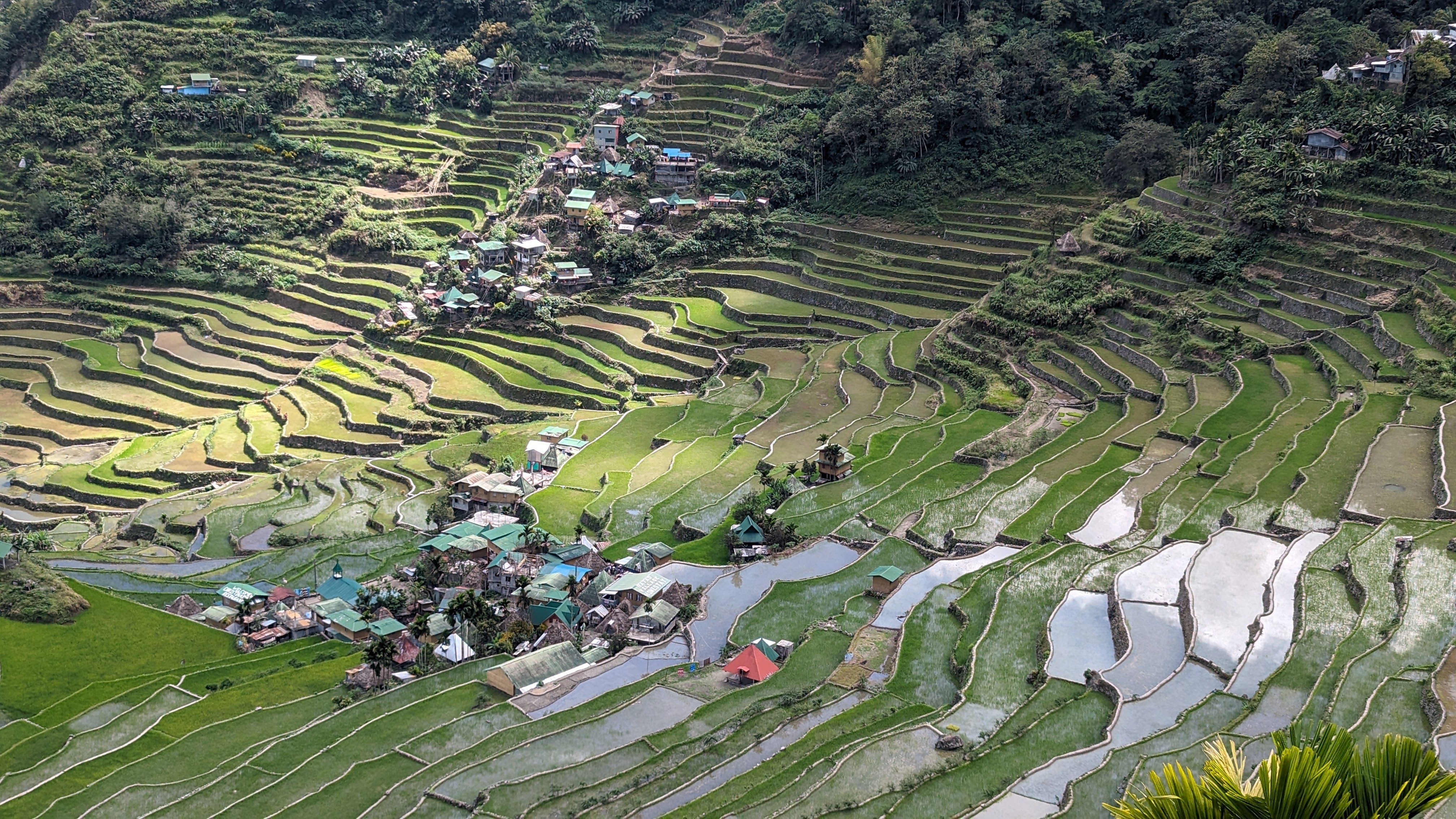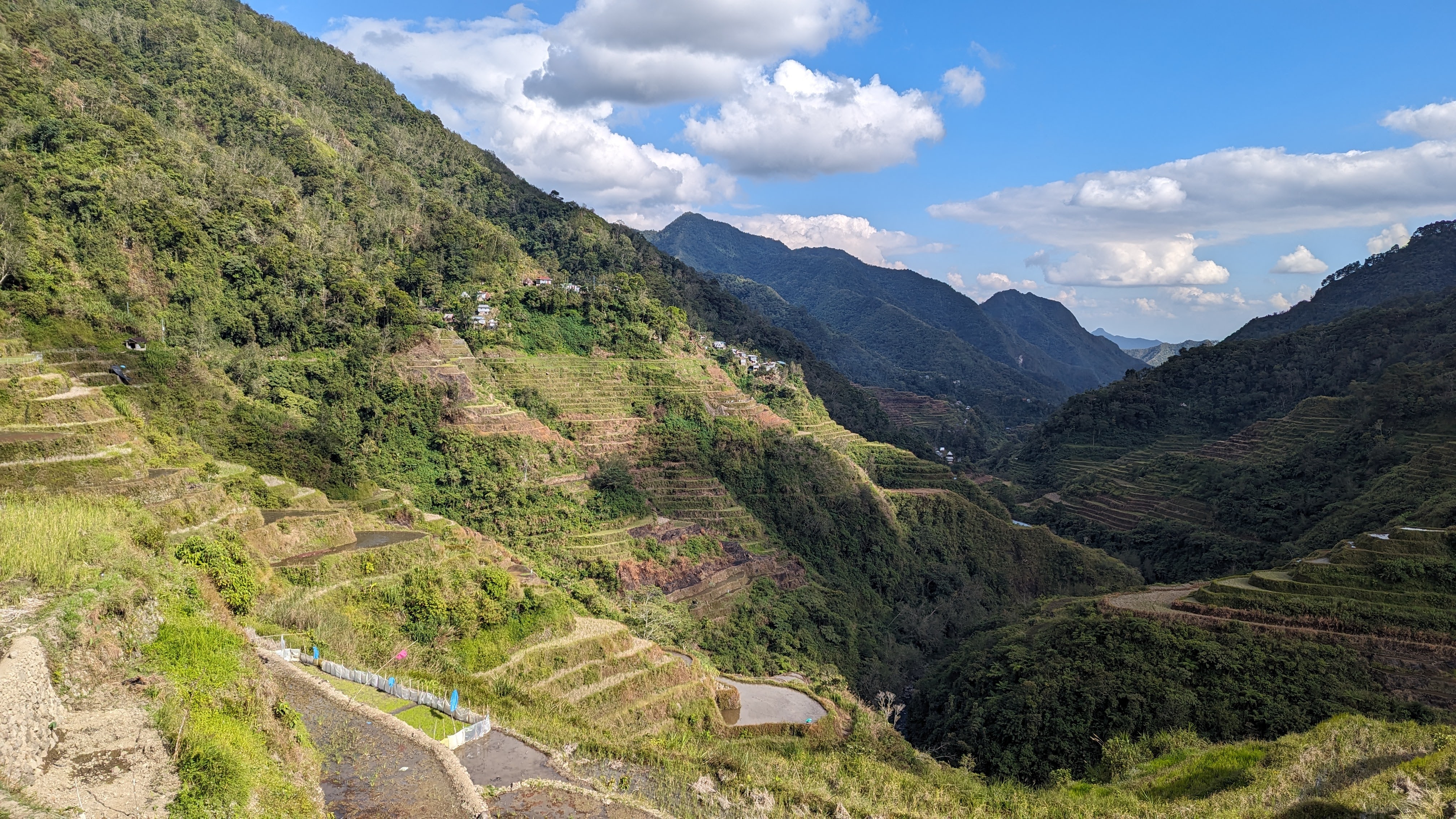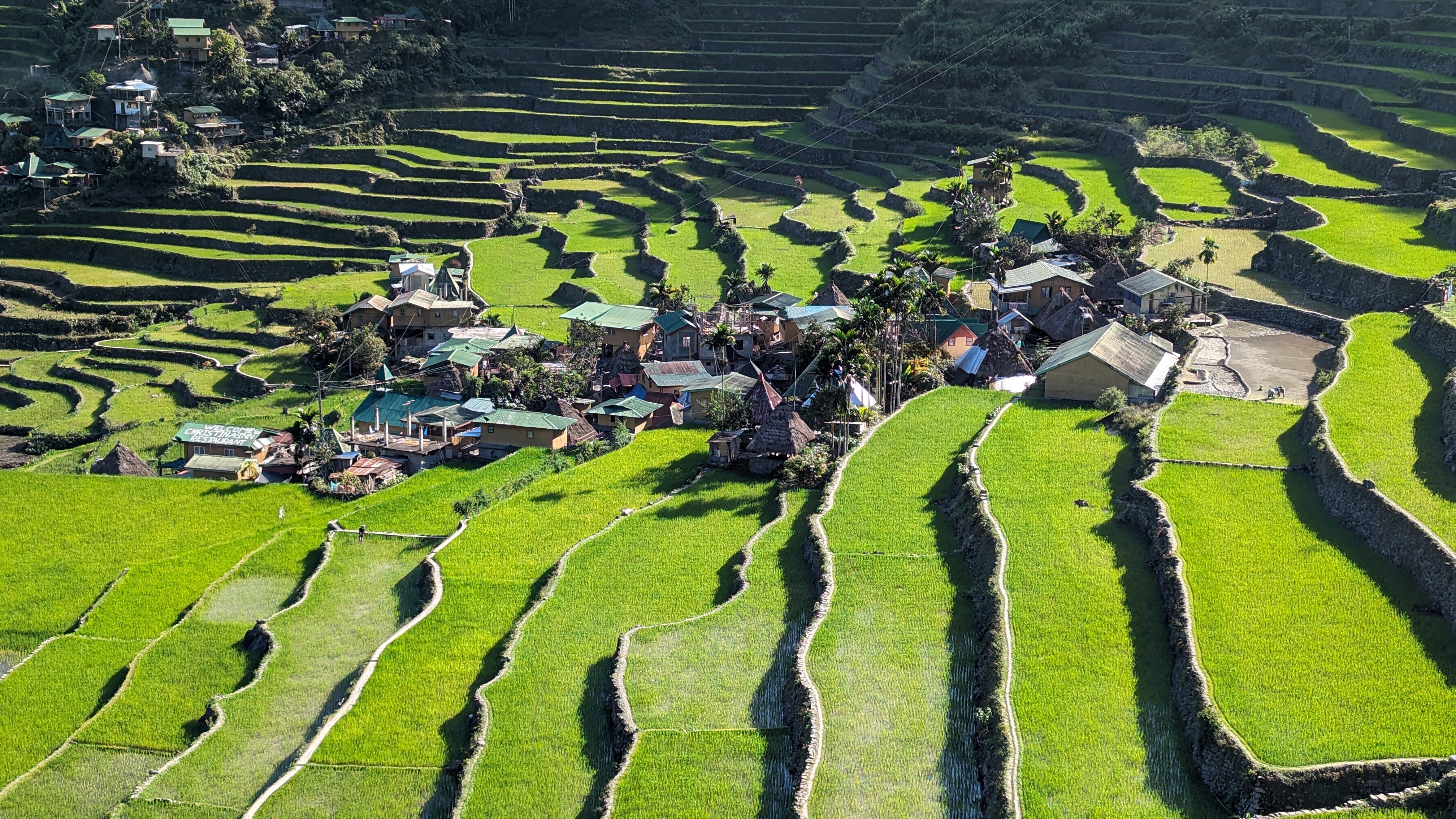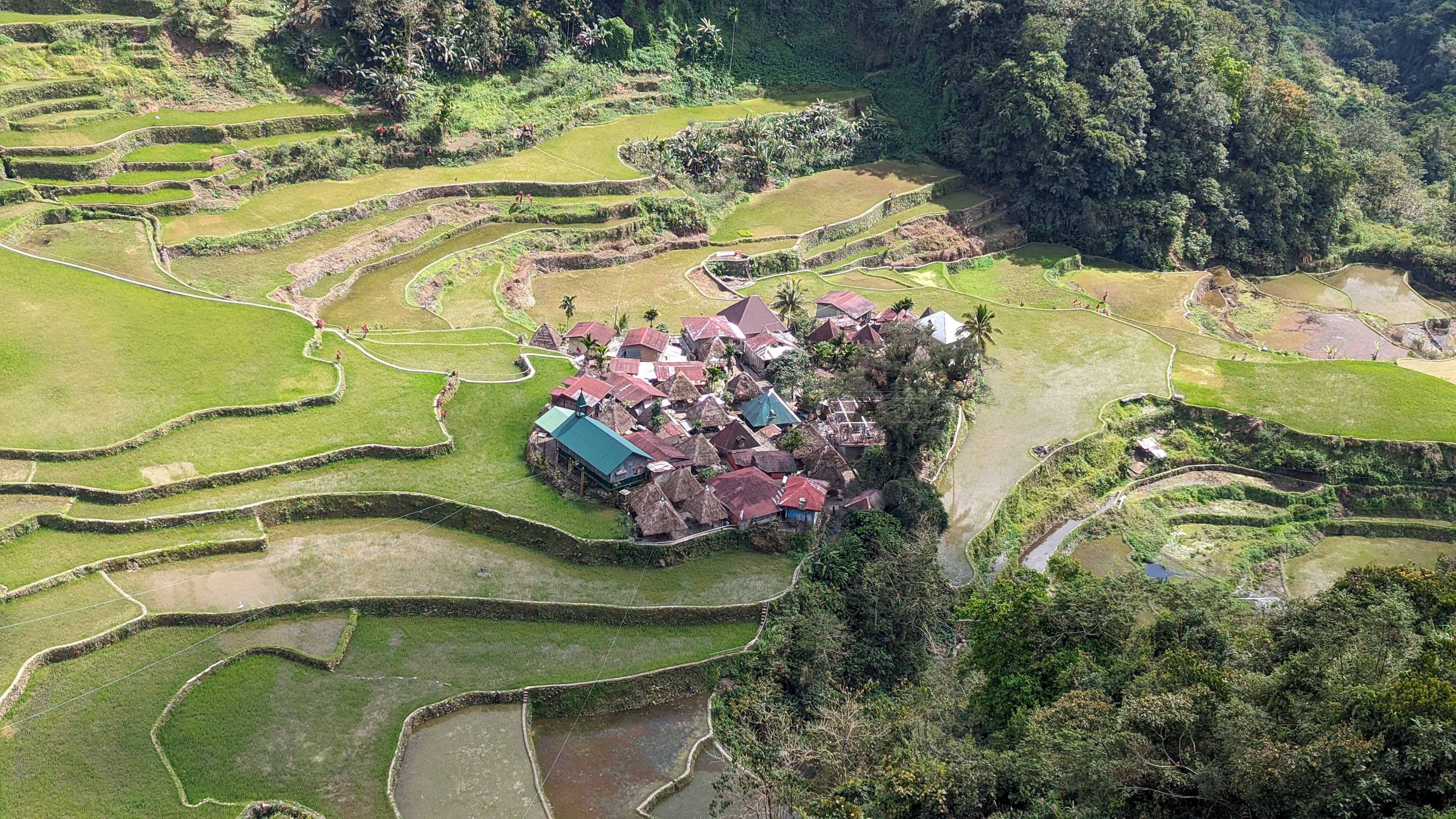 Bon, c’est bien gentil tout ça mais ça fait au moins deux paragraphes qu’on n’a pas prononcé le mot « rizière » ! Donc au deuxième jour de rando, direction le village de Cambulo, inaccessible par la route, où nous avons passé la nuit. Un havre de pays perdu au milieu des montagnes abruptes, couvertes de lianes, fougère arborescentes et autres bananiers, un endroit improbable où les hommes ont décidé il y a 2000 ans que ce serait une bonne idée que d’aplatir les montagnes, construire des murs et monter un système d’irrigation complexe pour y faire pousser des trucs. Les mots manquent pour décrire ces paysages. Ou alors ils ne feraient que banaliser l’exceptionnel. Du coup il vaut mieux laisser parler les images…