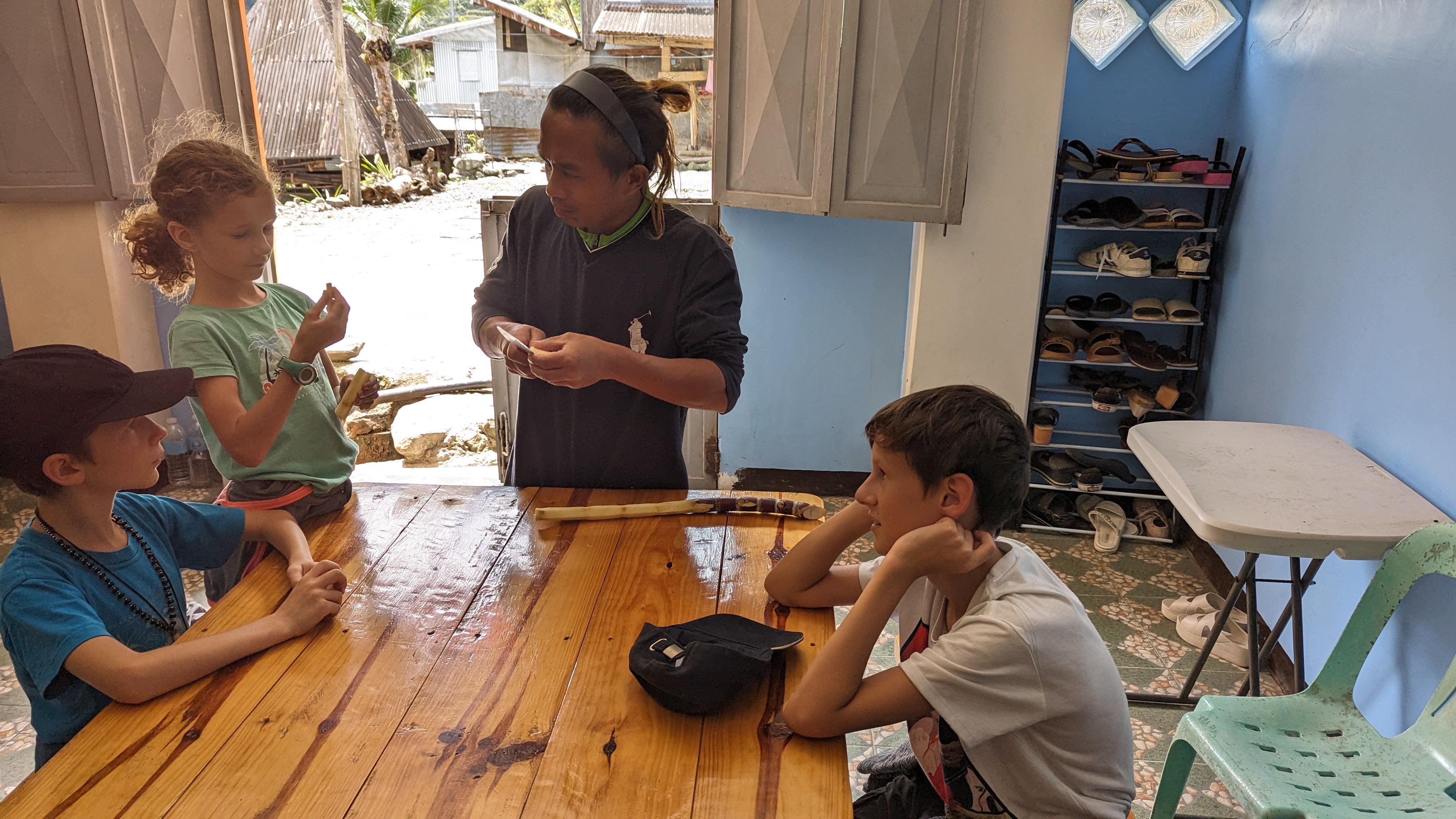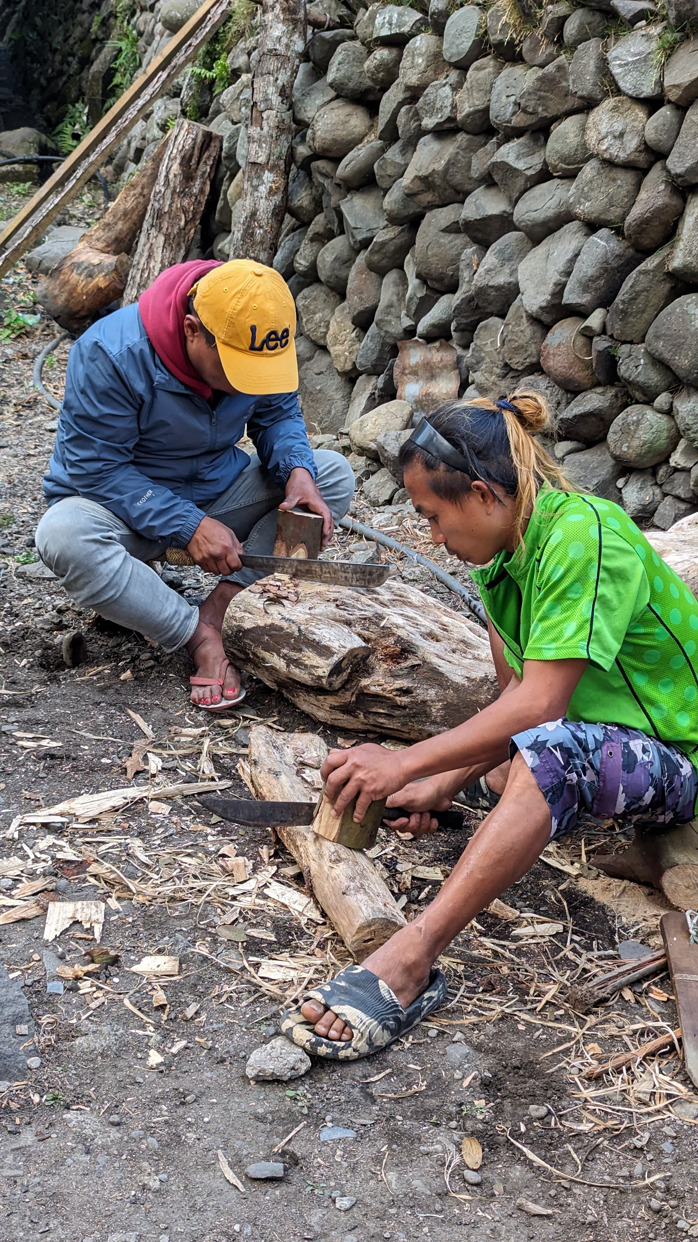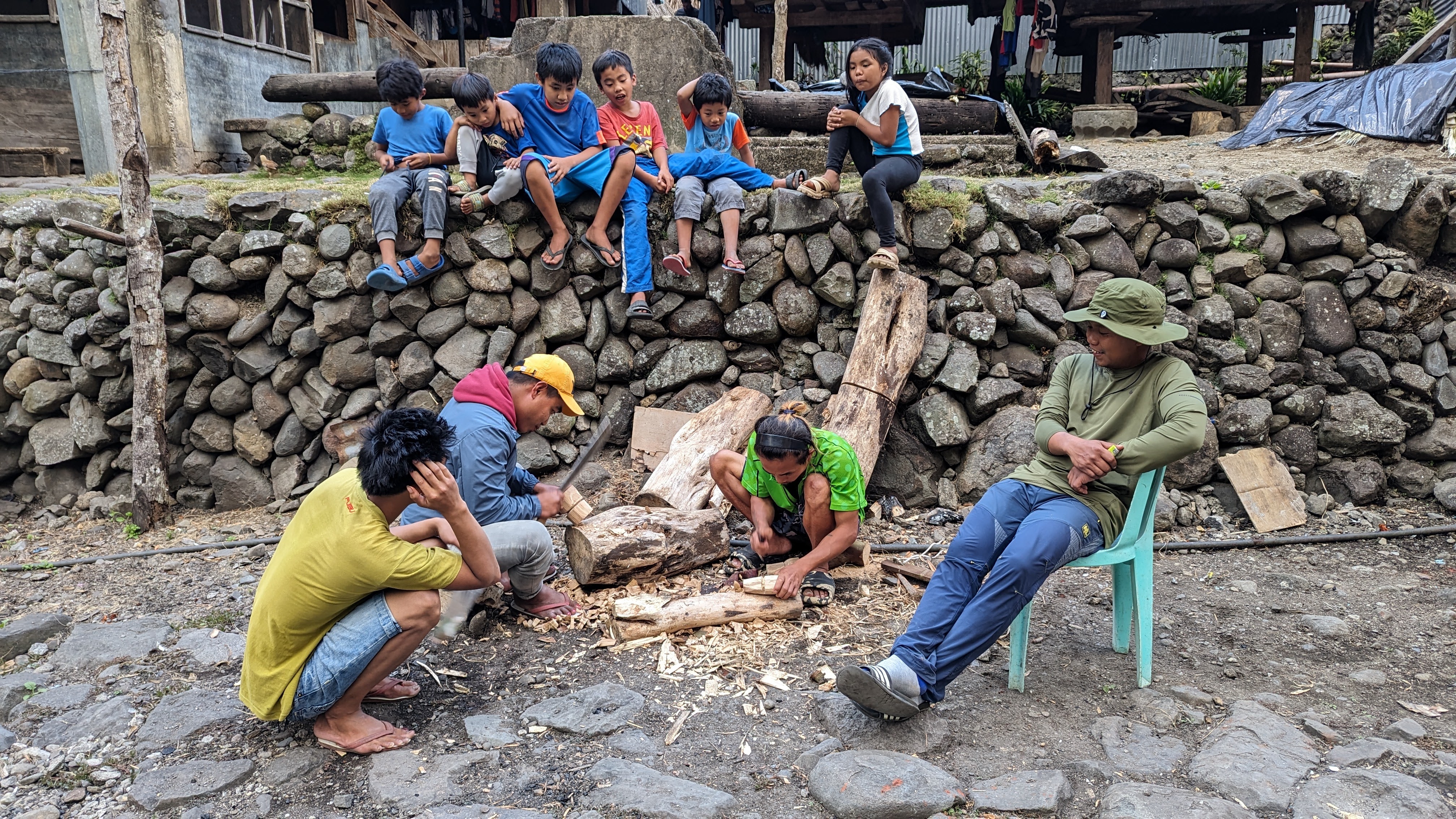 Sur toute la durée de la rando, nous étions accompagnés par un guide, Juhn de son prénom, extrêmement sympa en plus d’être intéressant, fin connaisseur de la culture locale, bien différente du reste des Philippines (il y a un peu plus de 100 ans, on trouvait encore des chasseurs de têtes dans les montagnes). Pour l’anecdote, pourquoi Juhn ? Son prénom complet est Démétrios truc-qui-commence-par-un-G Beltran Junior. Son père avait décidé qu’il serait le dernier de la fratrie d’où le “Junior” final. Aujourd’hui abrégé en Juhn. Bref, Juhn était particulièrement attentif à nos enfants, que ce soit pendant la marche ou pendant les soirées. Et dès le premier soir, il leur fit une petite surprise : un jouet traditionnel pour chacun taillé par ses soins et à la machette dans des bûches de bois.. Des toupies à lancer au moyen d’une ficelle qui ont obtenu un franc succès auprès des gamins. Ils se sont entraînés une bonne partie de la soirée pour comprendre le geste du lancer.