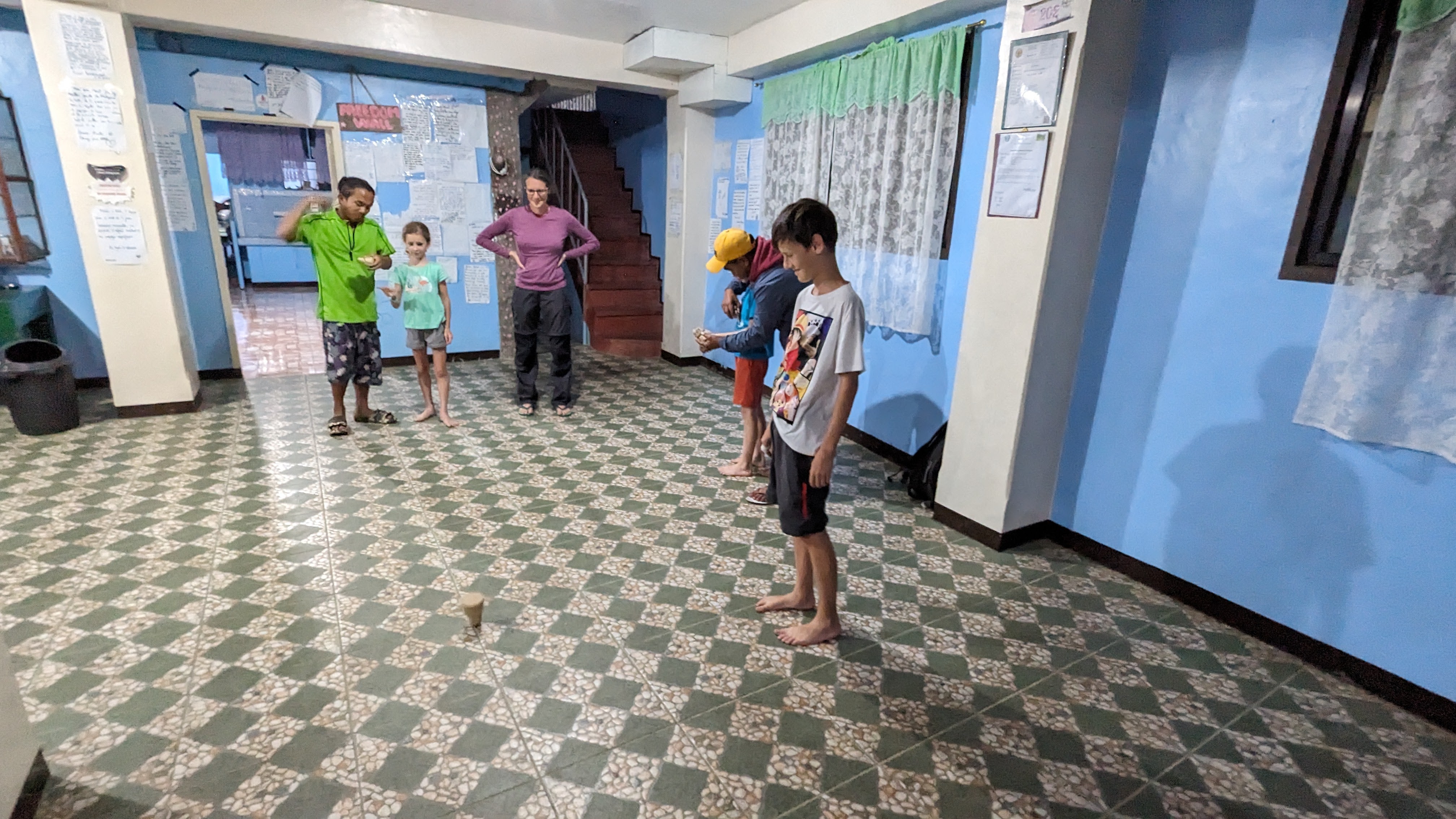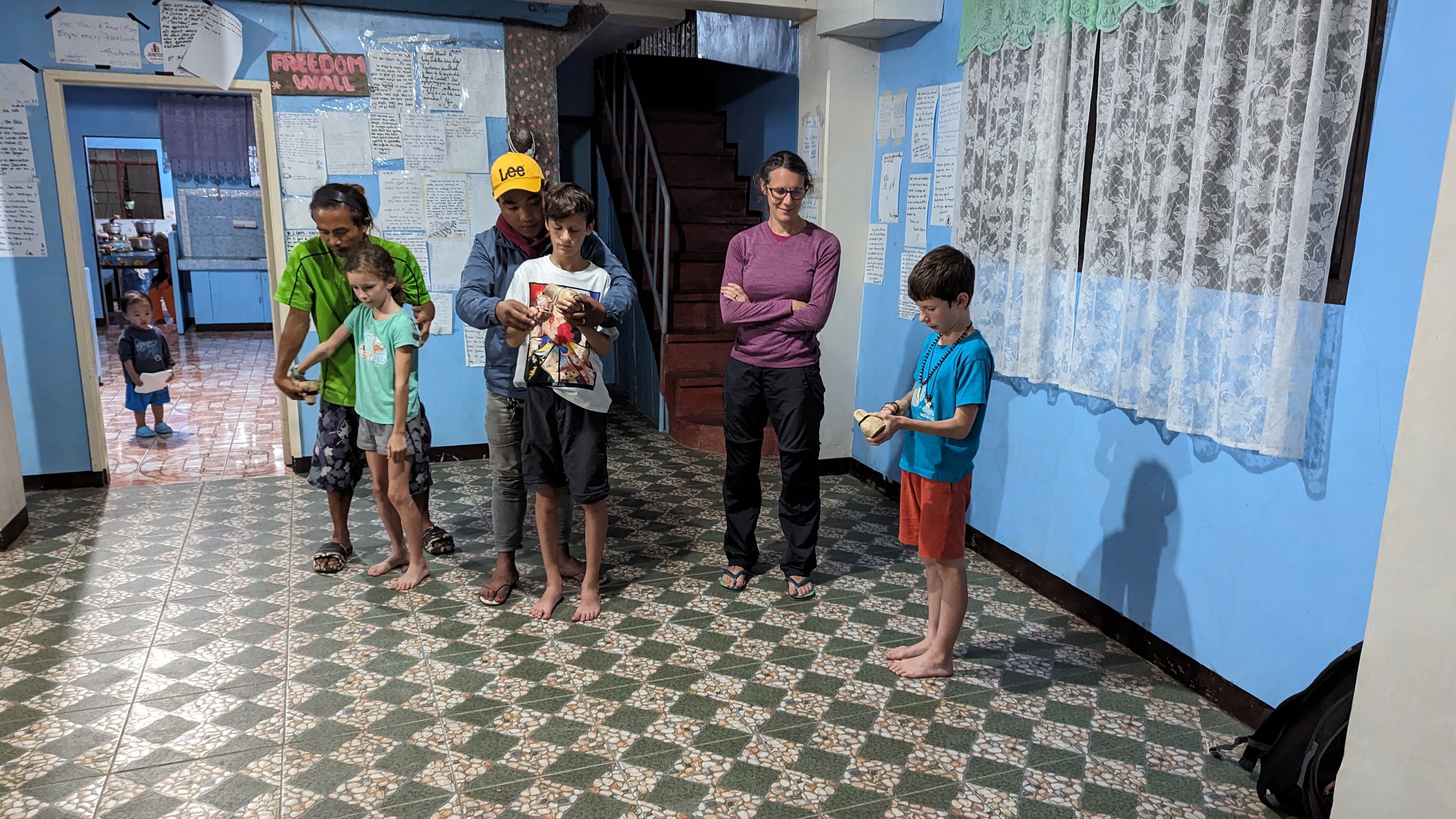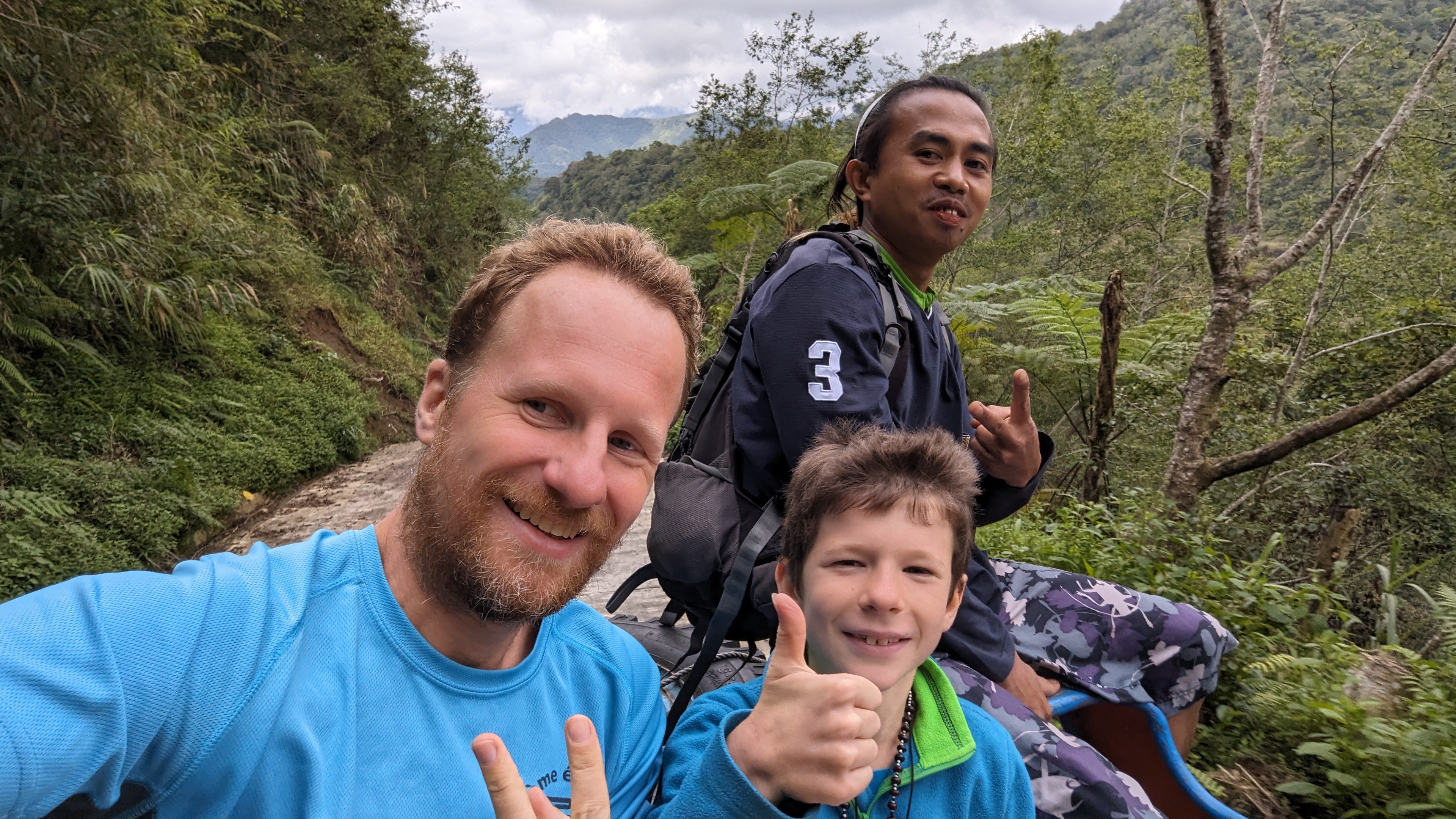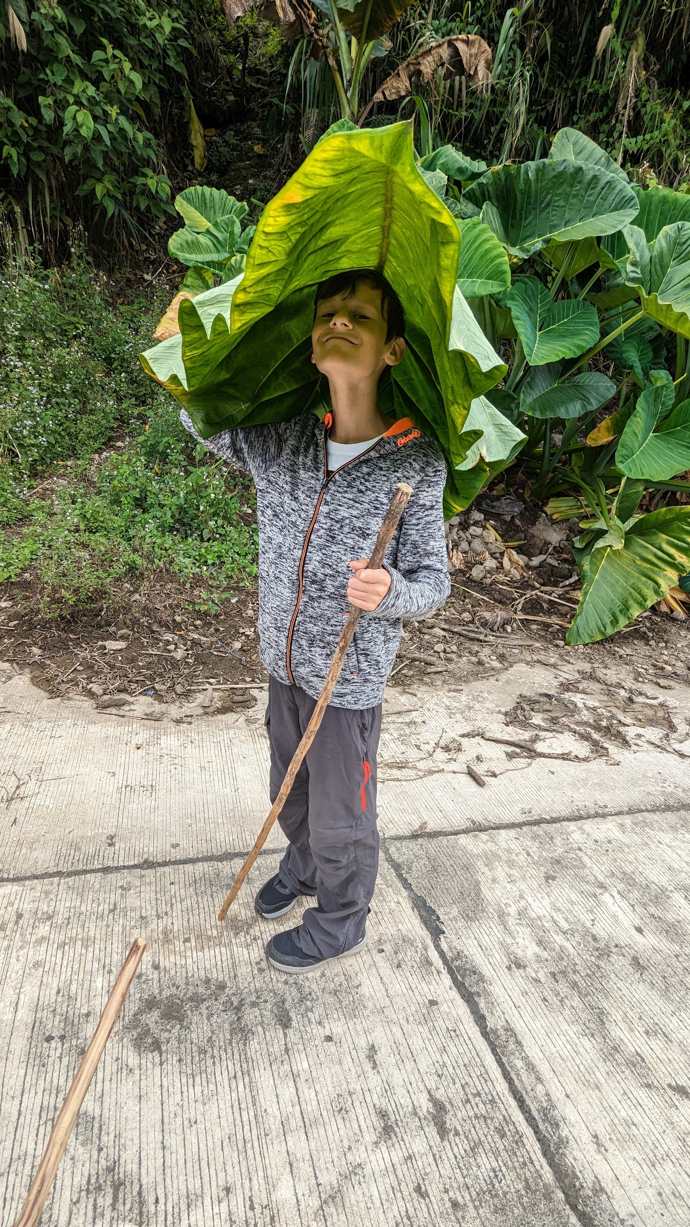 Sur toute la durée de la rando, nous étions accompagnés par un guide, Juhn de son prénom, extrêmement sympa en plus d’être intéressant, fin connaisseur de la culture locale, bien différente du reste des Philippines (il y a un peu plus de 100 ans, on trouvait encore des chasseurs de têtes dans les montagnes). Pour l’anecdote, pourquoi Juhn ? Son prénom complet est Démétrios truc-qui-commence-par-un-G Beltran Junior. Son père avait décidé qu’il serait le dernier de la fratrie d’où le “Junior” final. Aujourd’hui abrégé en Juhn. Bref, Juhn était particulièrement attentif à nos enfants, que ce soit pendant la marche ou pendant les soirées. Et dès le premier soir, il leur fit une petite surprise : un jouet traditionnel pour chacun taillé par ses soins et à la machette dans des bûches de bois.. Des toupies à lancer au moyen d’une ficelle qui ont obtenu un franc succès auprès des gamins. Ils se sont entraînés une bonne partie de la soirée pour comprendre le geste du lancer.