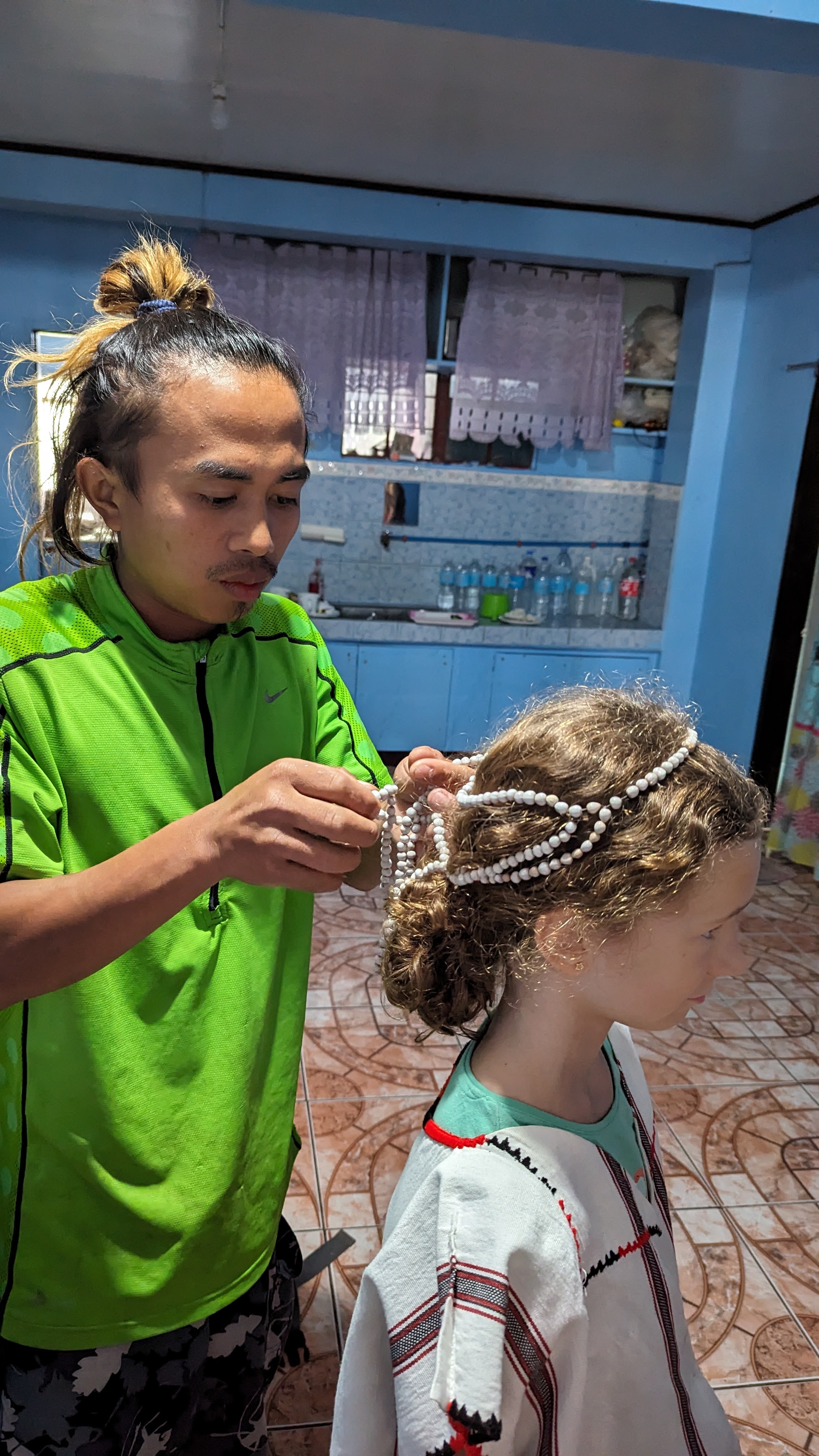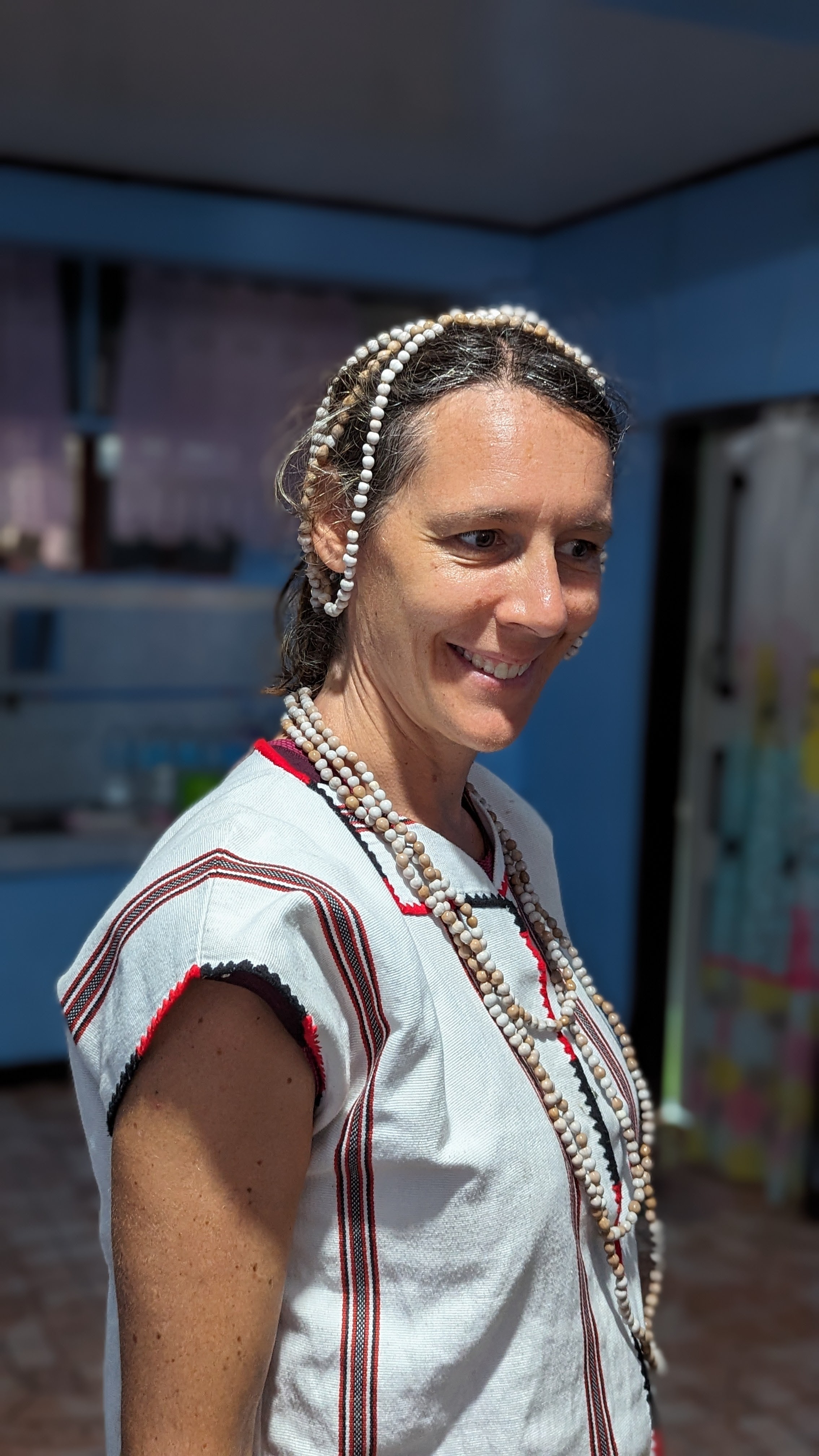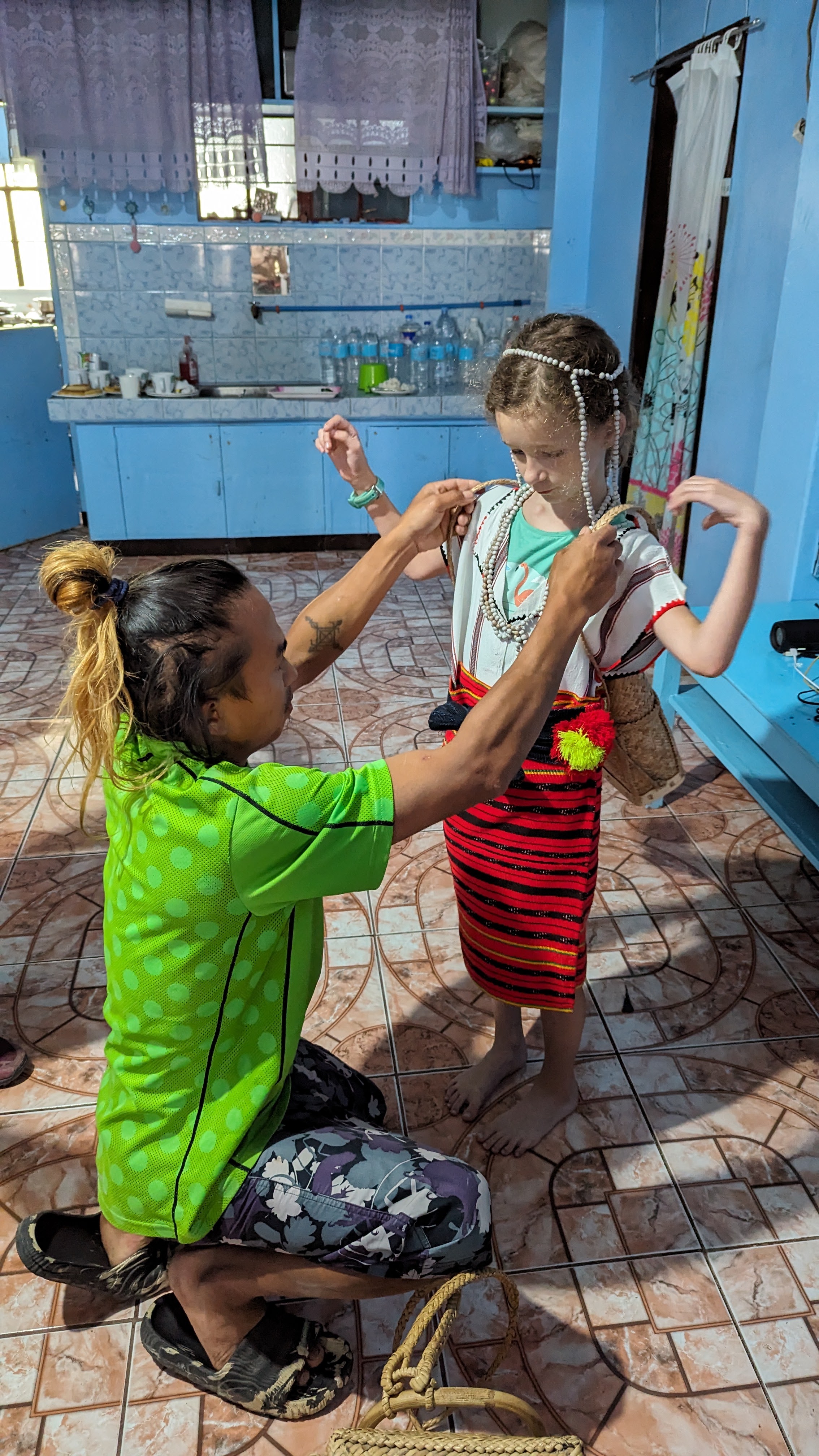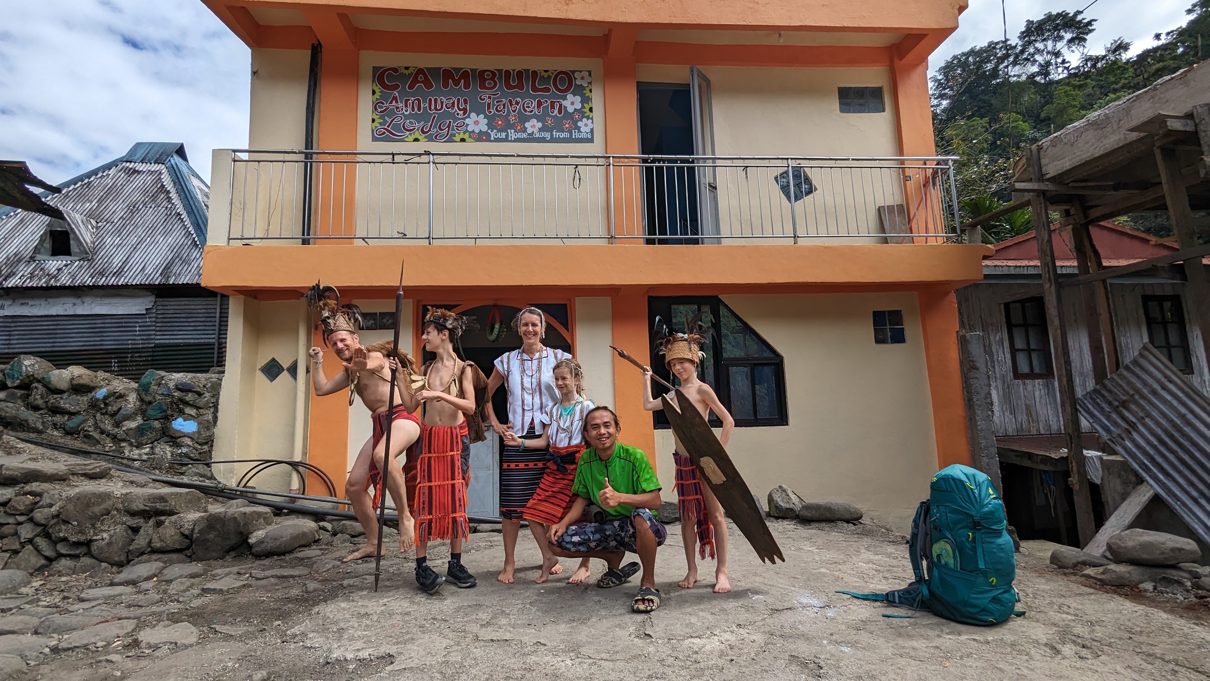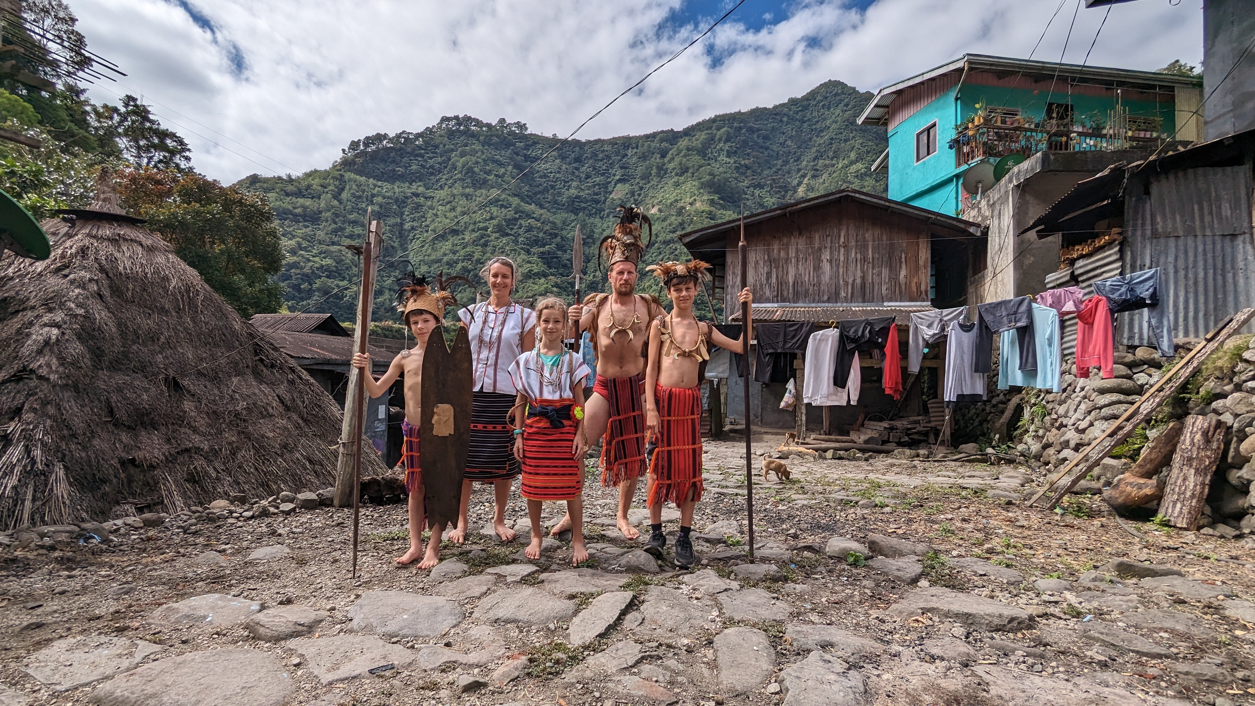 Le jour précédent, au moment de partir, nous avions eu le droit au petit bonus « jeepney ». Mais au départ de Cambulo, c’est cette fois une séance d’habillage en costumes traditionnels qui nous attendait. Là encore, rien de prévu ni de forcé, ça s’est fait tout naturellement quand Juhn nous l’a proposé, une fois tous les autres touristes partis sur les routes et alors que nous traînions encore à la guesthouse. Pour les filles, un haut en coton blanc et une étoffe rouge et noire pour le bas, et des colliers pour magnifier le tout. Pour les garçons un simple pagne, une coiffe ornée de plumes et un sac à dos de chasseur pour y mettre ses proies. Et surtout une vraie lance et un bouclier ! Il n’y a pas que Yoann et Florent qui se sentaient fiers !