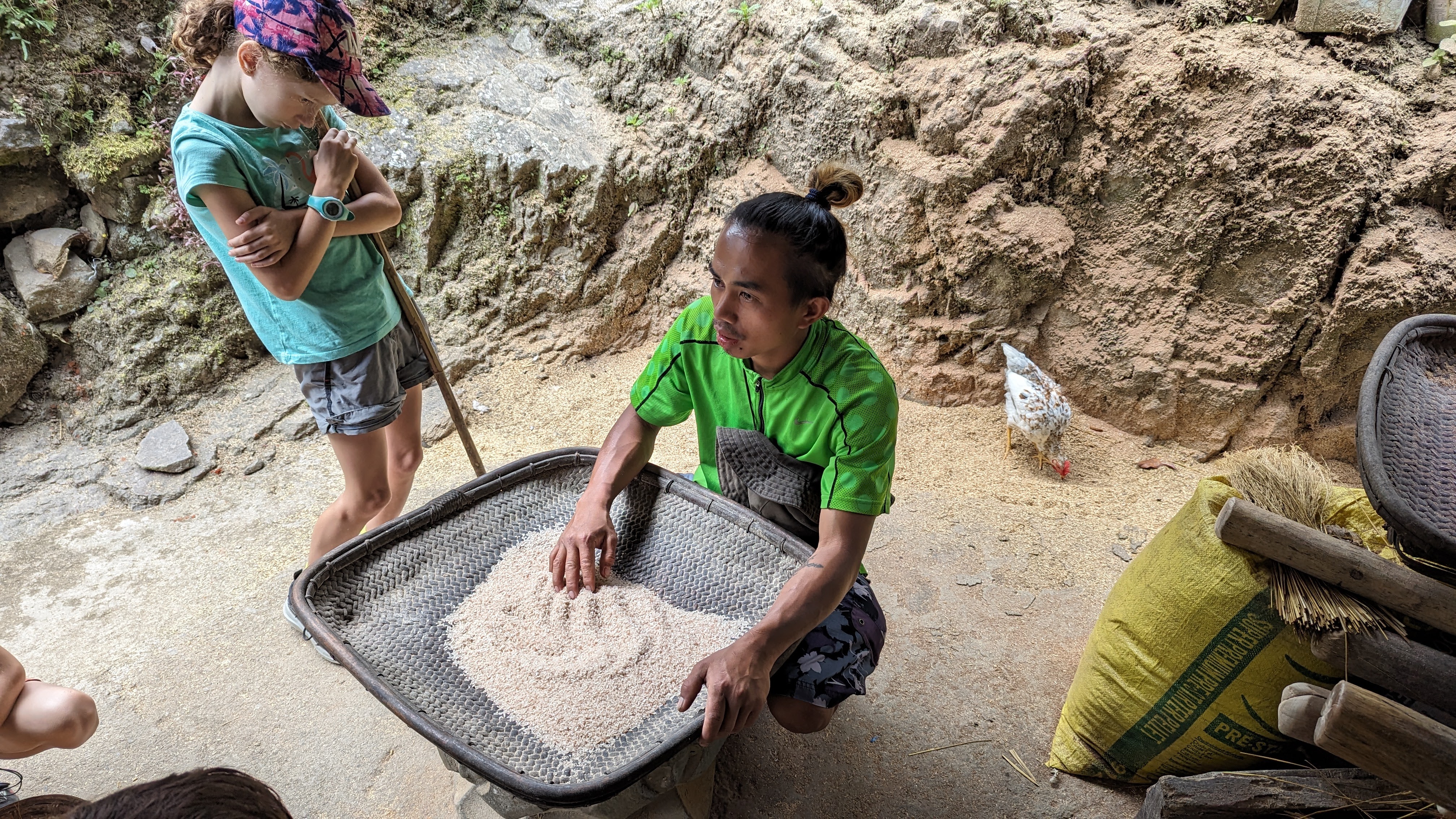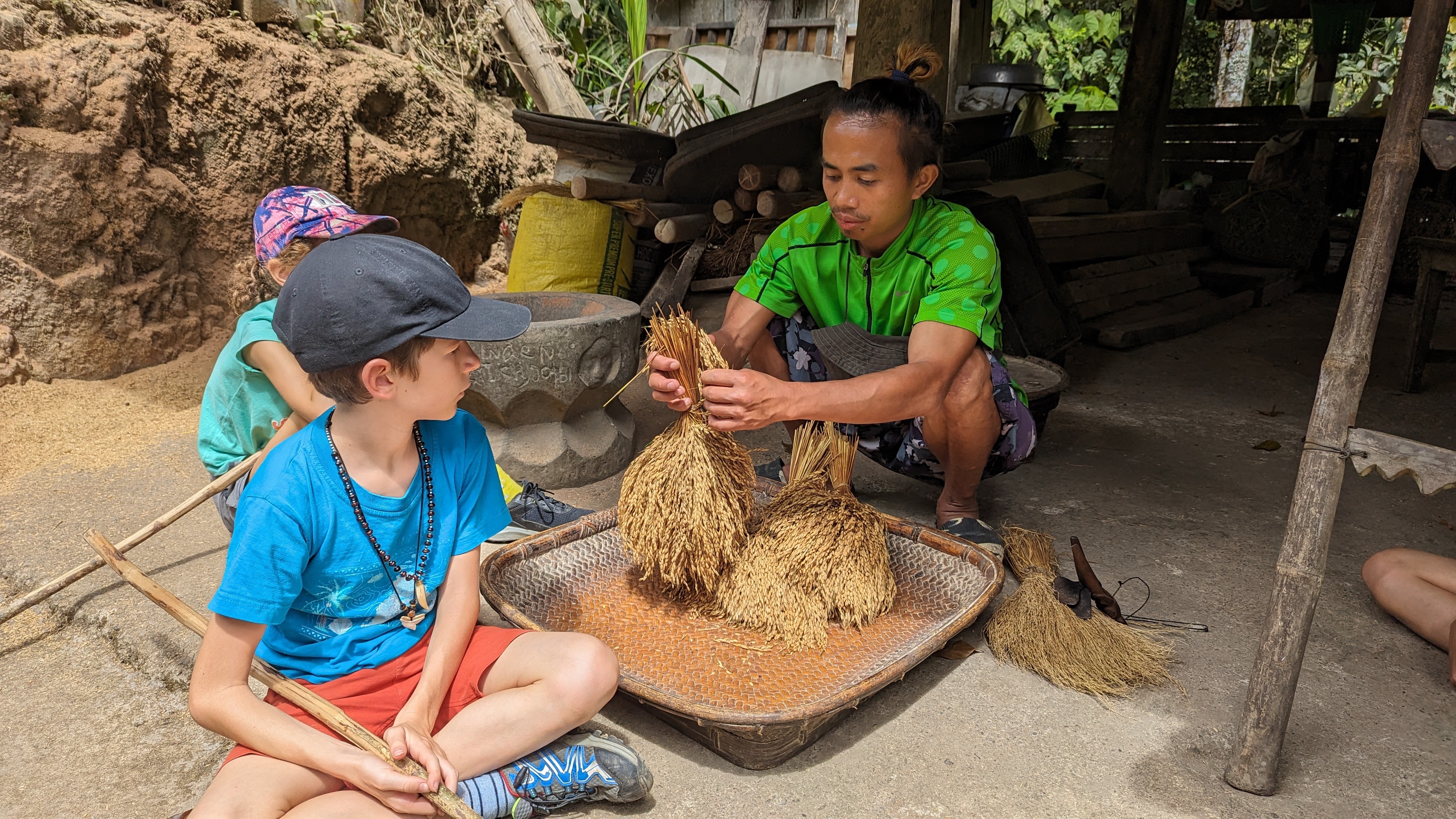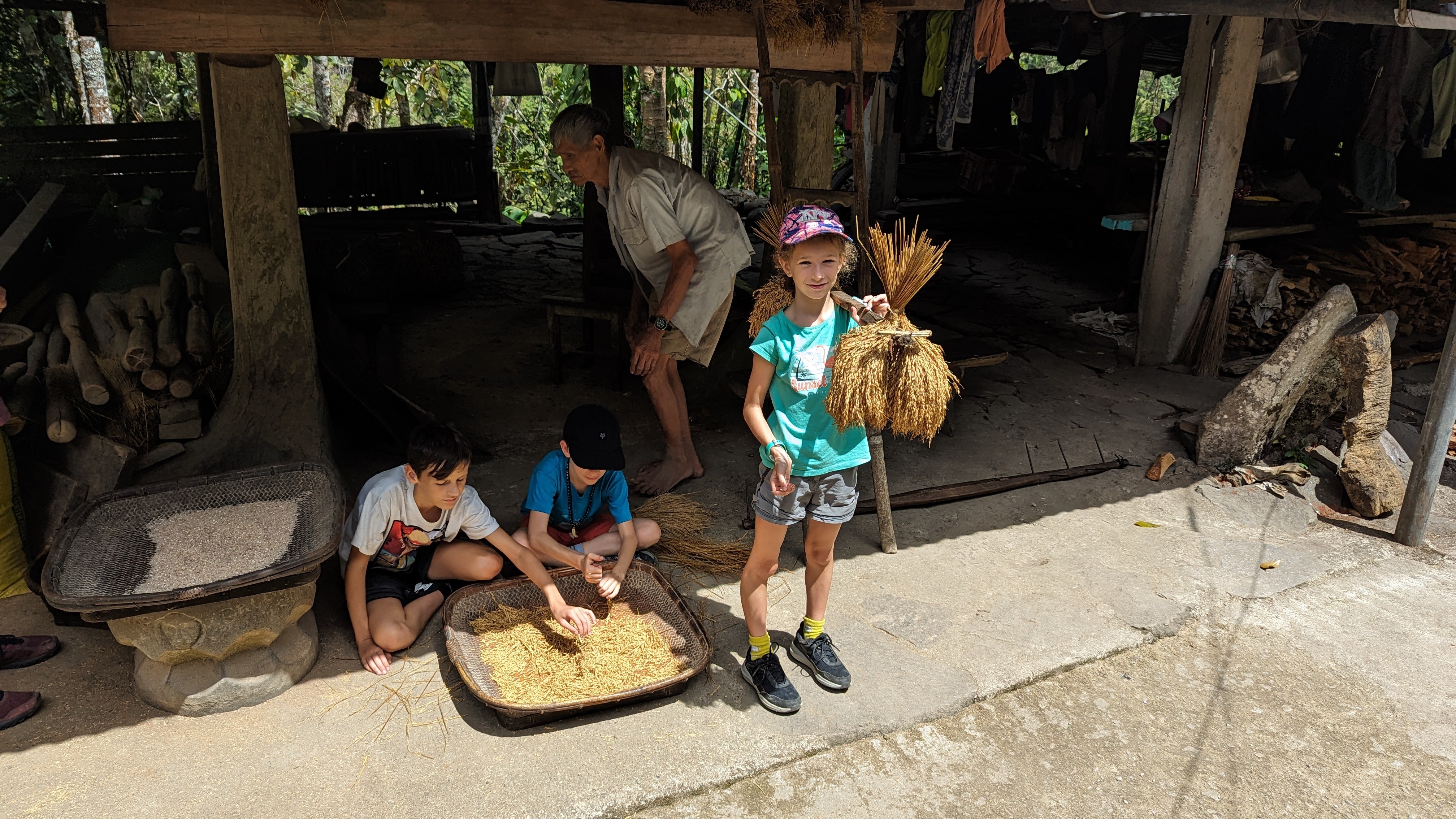D’abord enlever les grains des tiges : il y a une technique à prendre, en les coinçant entre le pouce et l’index. Évidemment toute la famille s’y est essayée et il faut reconnaître que nous ne sommes pas efficaces (en plus de laisser un sacré bazar). Ensuite, il faut passer les grains au mortier pour casser leur enveloppe, puis les vanner (sans blague) pour séparer cette même enveloppe non comestible du produit fini (c’est tellement technique de savoir projeter son riz proprement dans les airs sans en balancer à gauche comme à droite (et gâcher ainsi la récolte) qu’on ne nous laisse pas cette fois y mettre nos sales doigts).