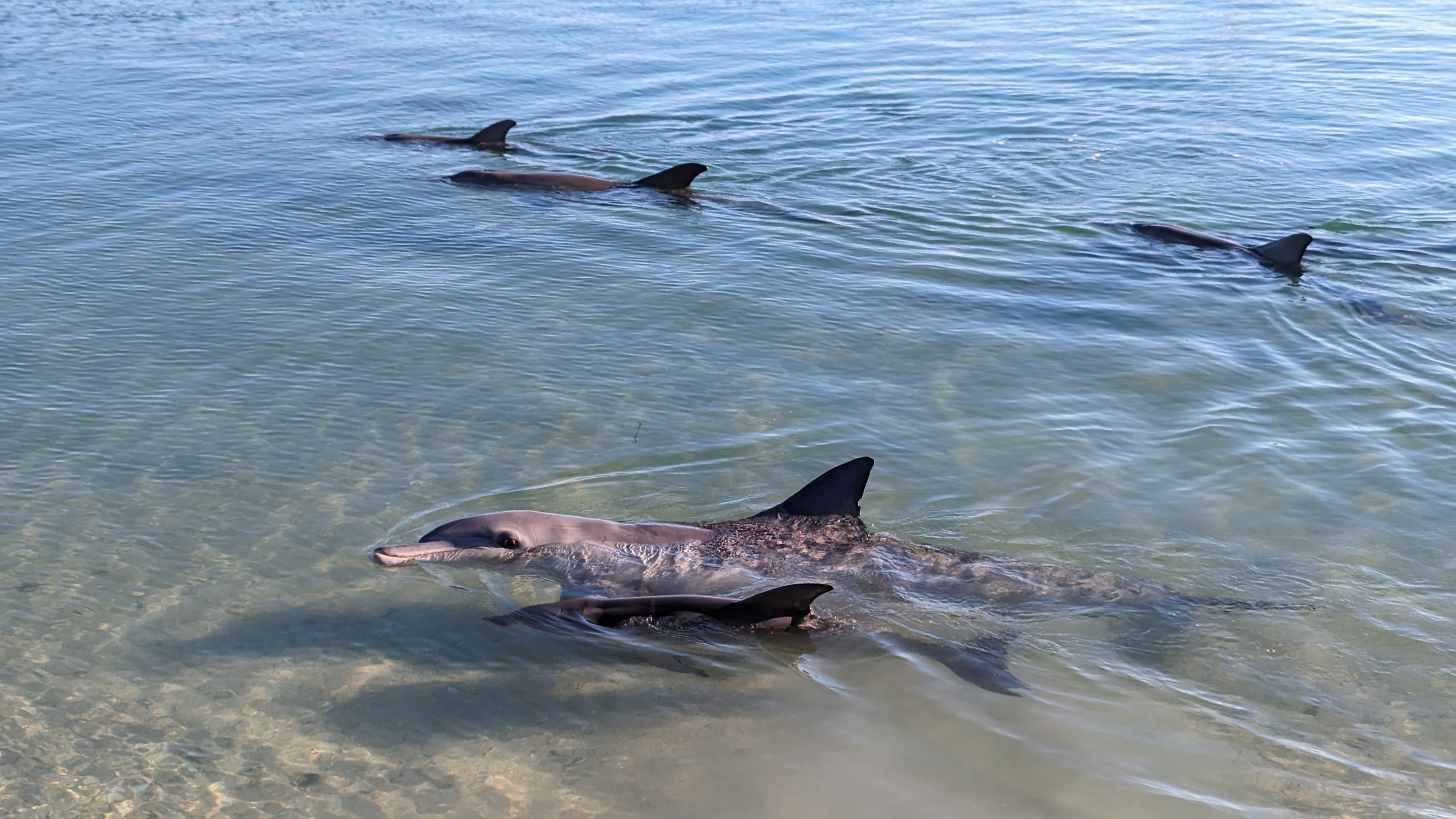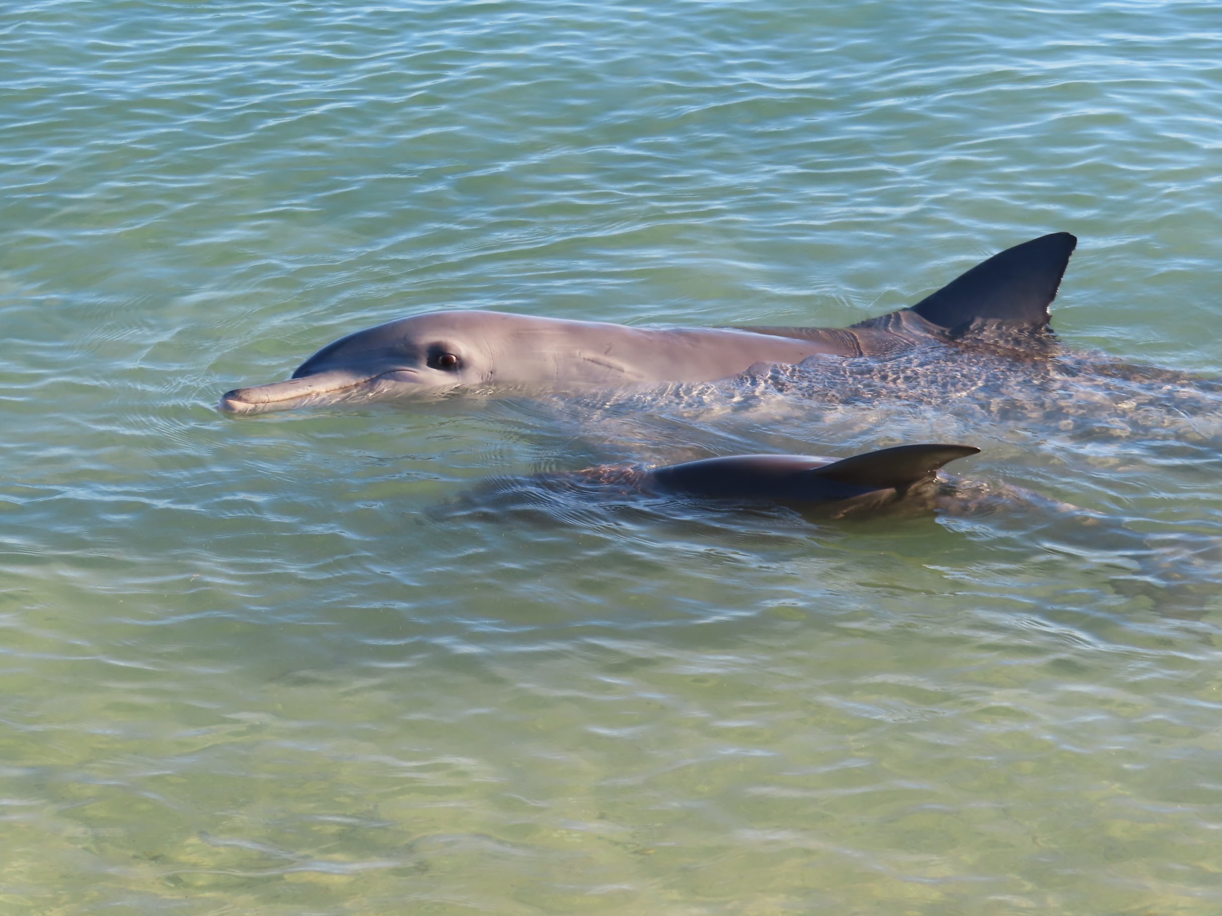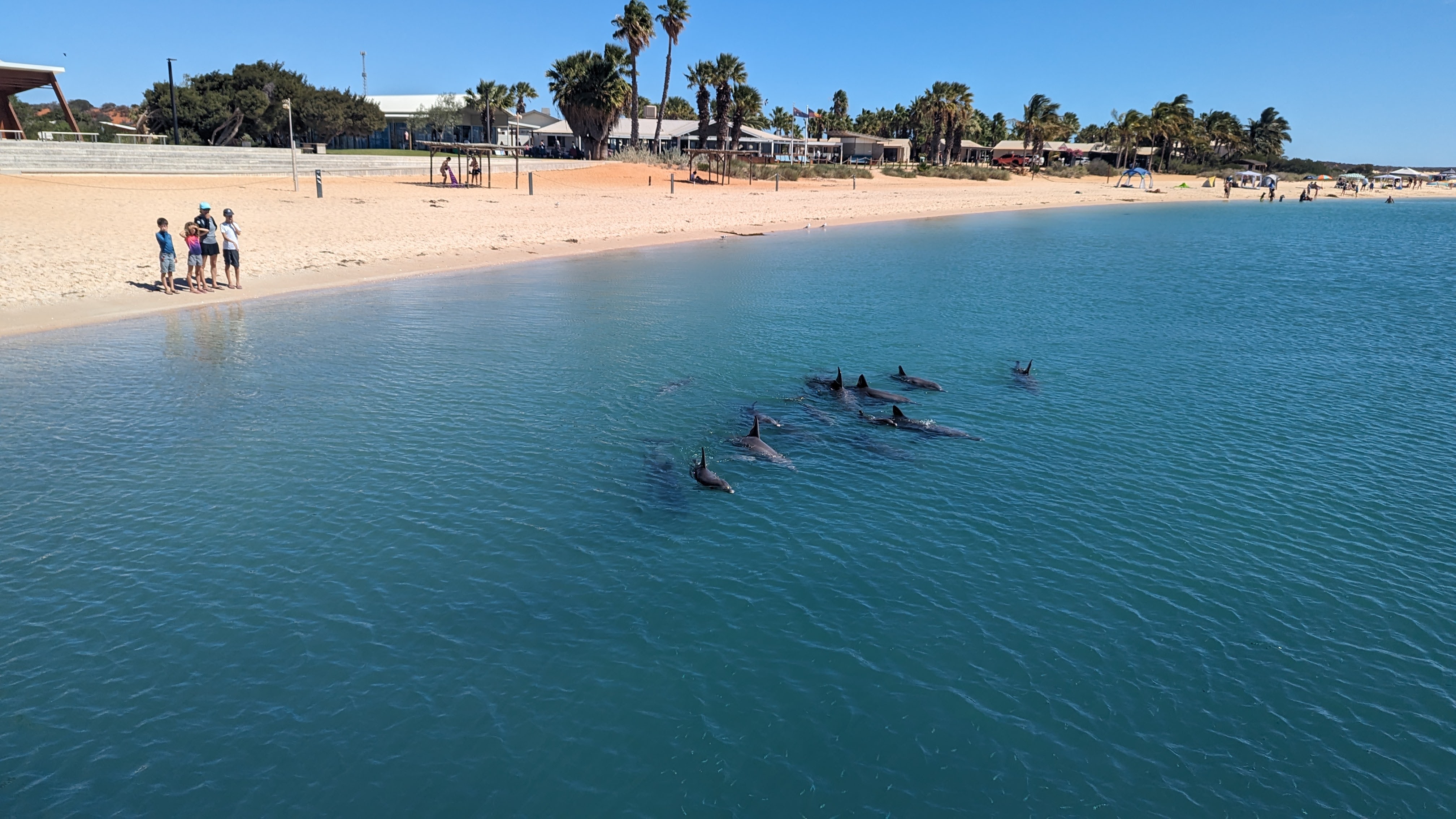 Monkey Mia, c’est avant tout LE lieu pour rencontrer des dauphins. En effet les cétacés ont pris l’habitude de venir se promener en bord de plage, complètement à l’aise avec la présence des humains. Interdiction d’aller dans l’eau pour les approcher, mais on les voit déjà très bien comme ça.