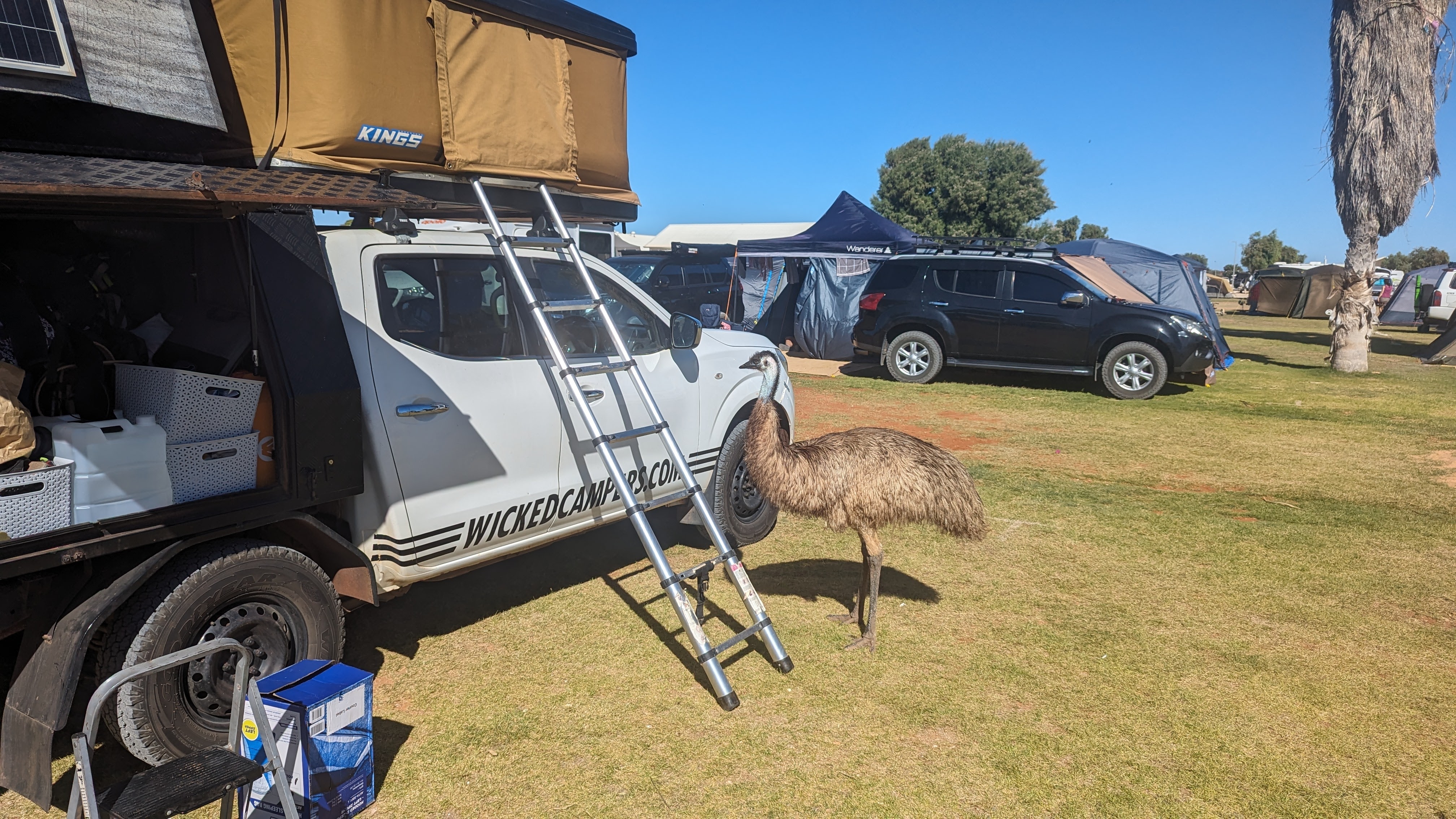 Première nuit dans le petit resort côtier de Monkey Mia (à part un grand camping, il n’y a rien d’autre). Autant à Kalbarri, le camping était envahi de kangourous dès la nuit tombée, autant à Monkey Mia, ce sont les émeus qui font la loi (sans que ça n’émeuve personne).