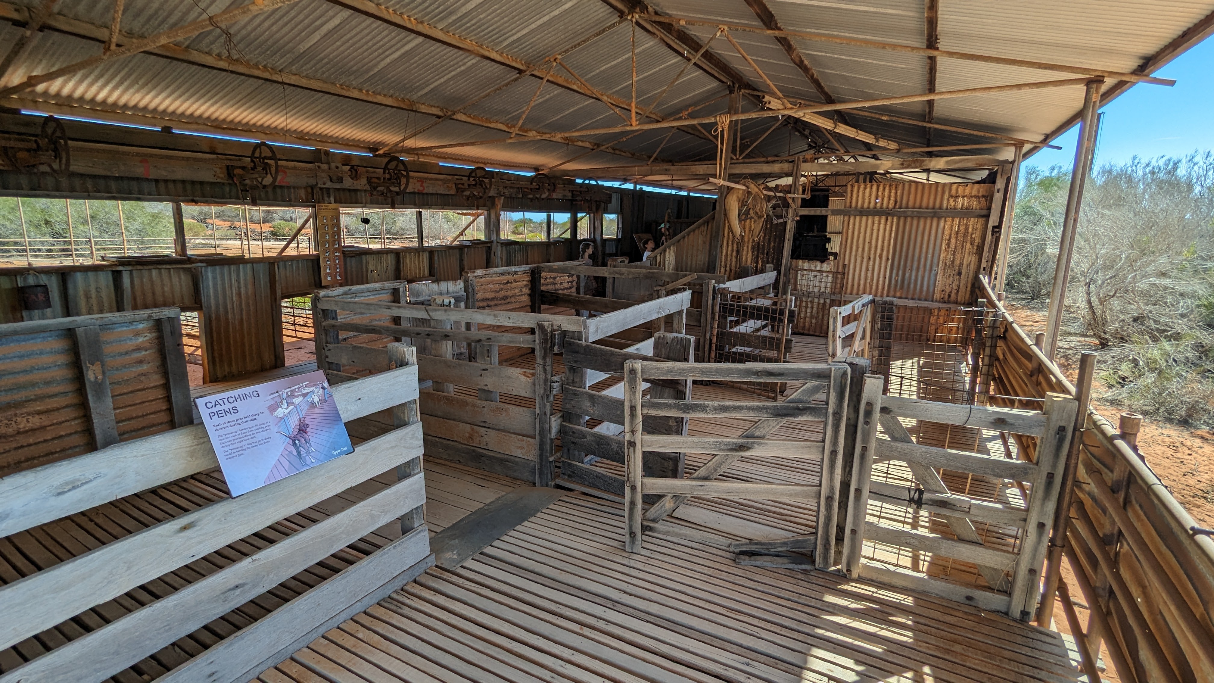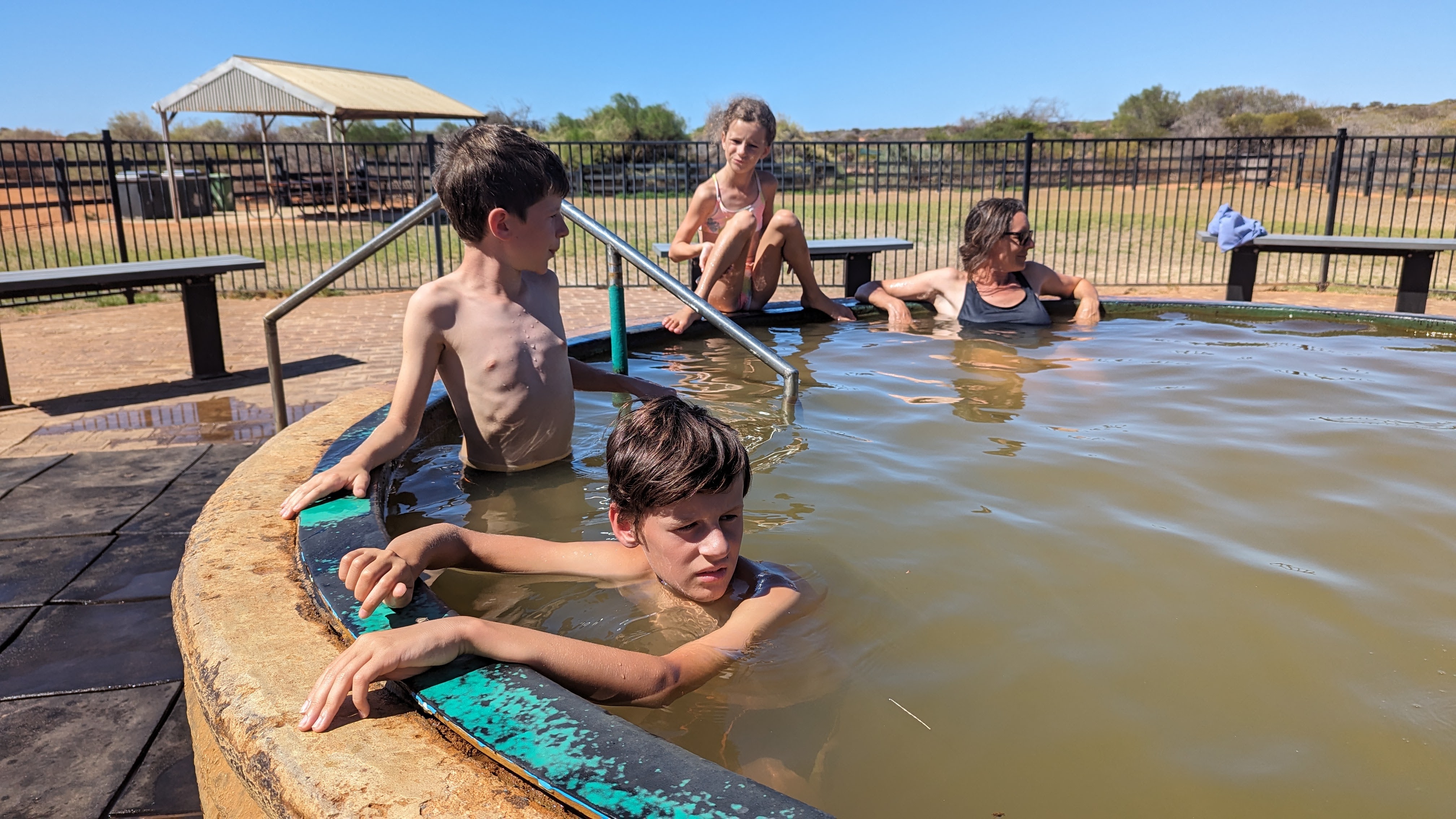 En plein milieu du désert, nous nous sommes arrêtés dans une ancienne ferme de moutons, encore conservée en place. Grâce à un puits artésien d’où sortait une eau à 40°C, on y trouvait un spa plutôt inattendu en ces lieux inhospitaliers. En sortant de l’eau, même l’air du désert semblait frais.