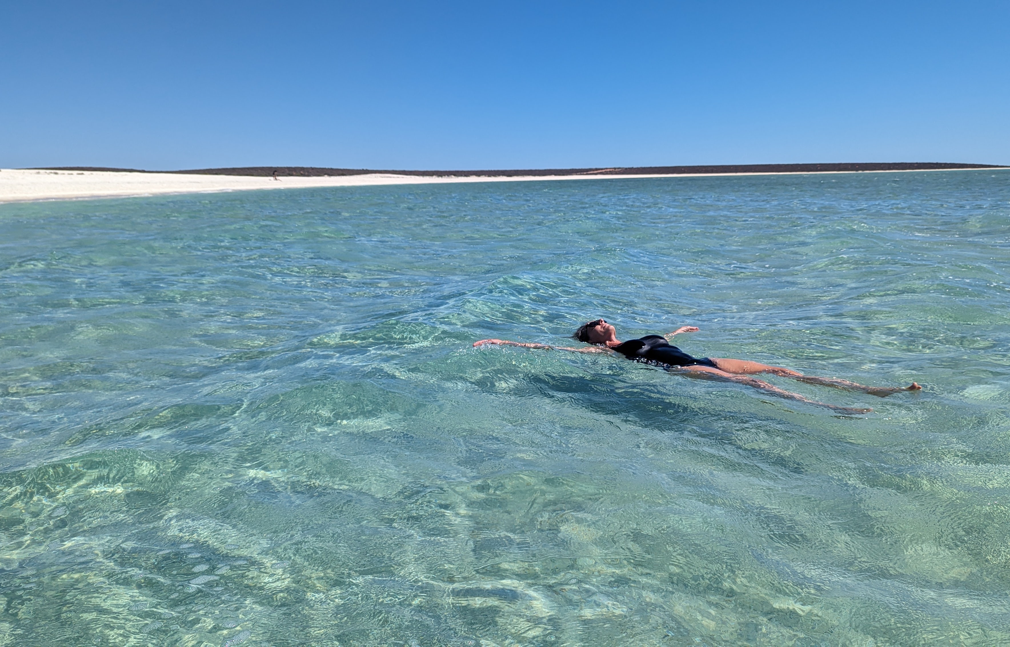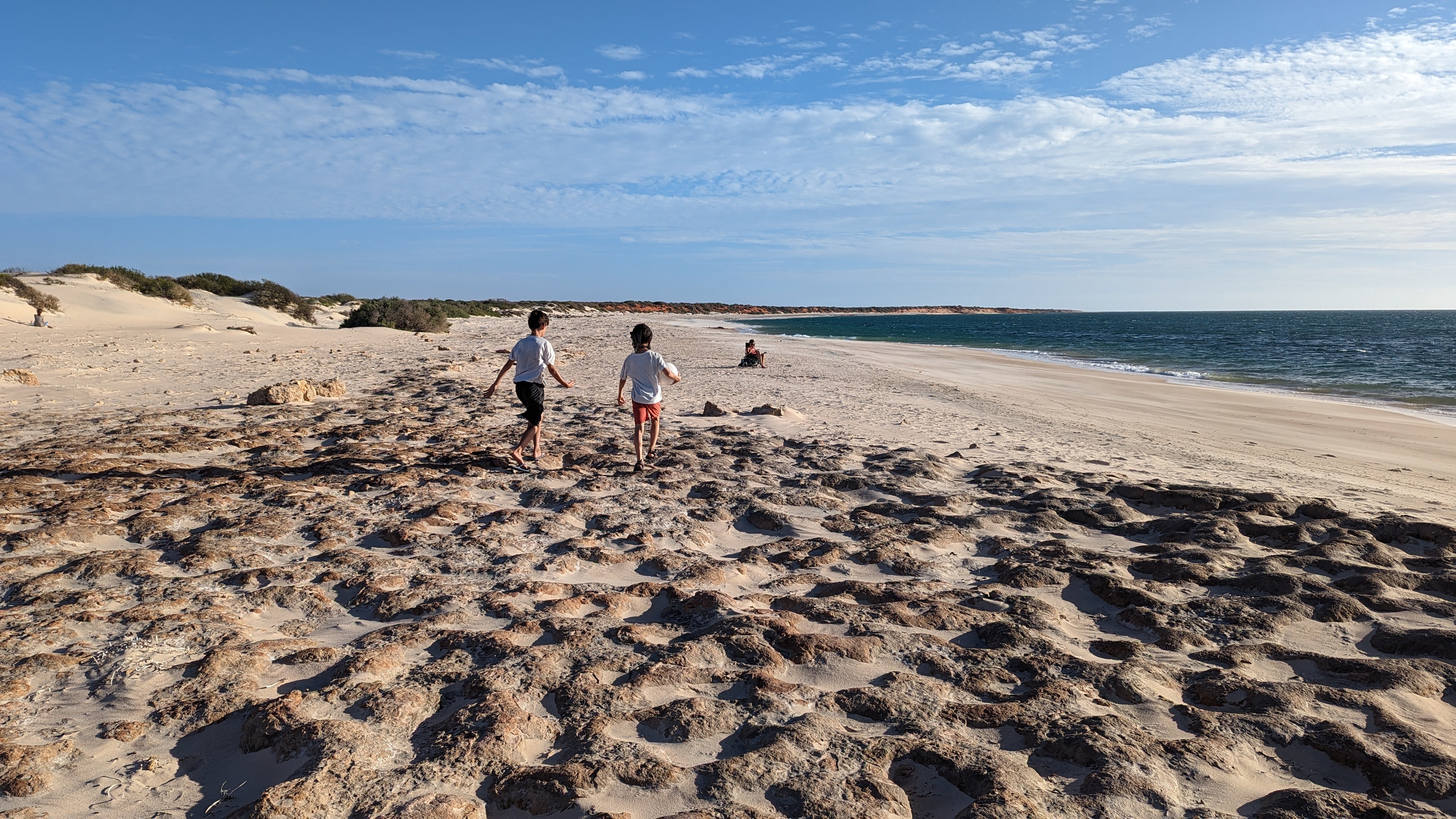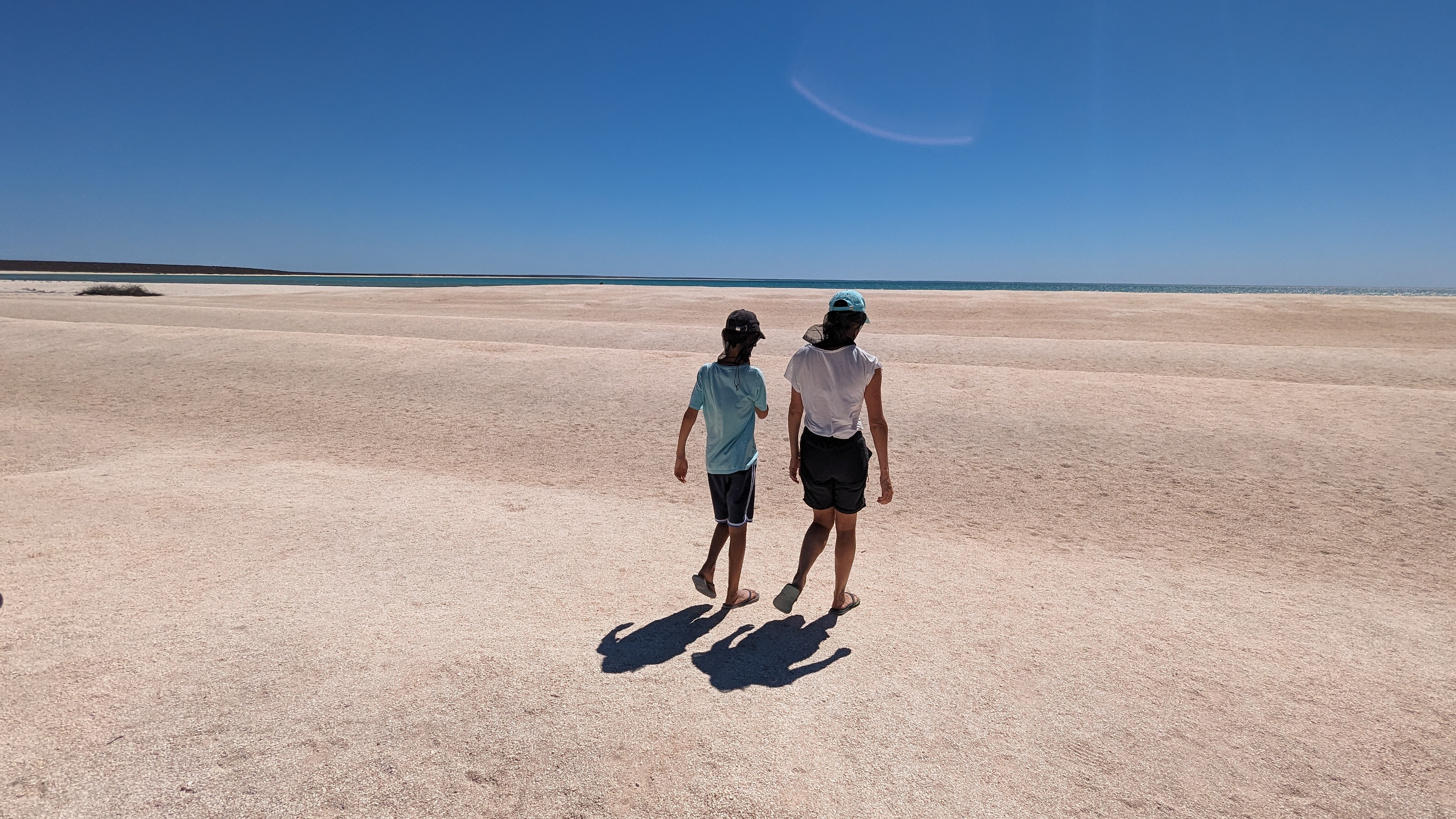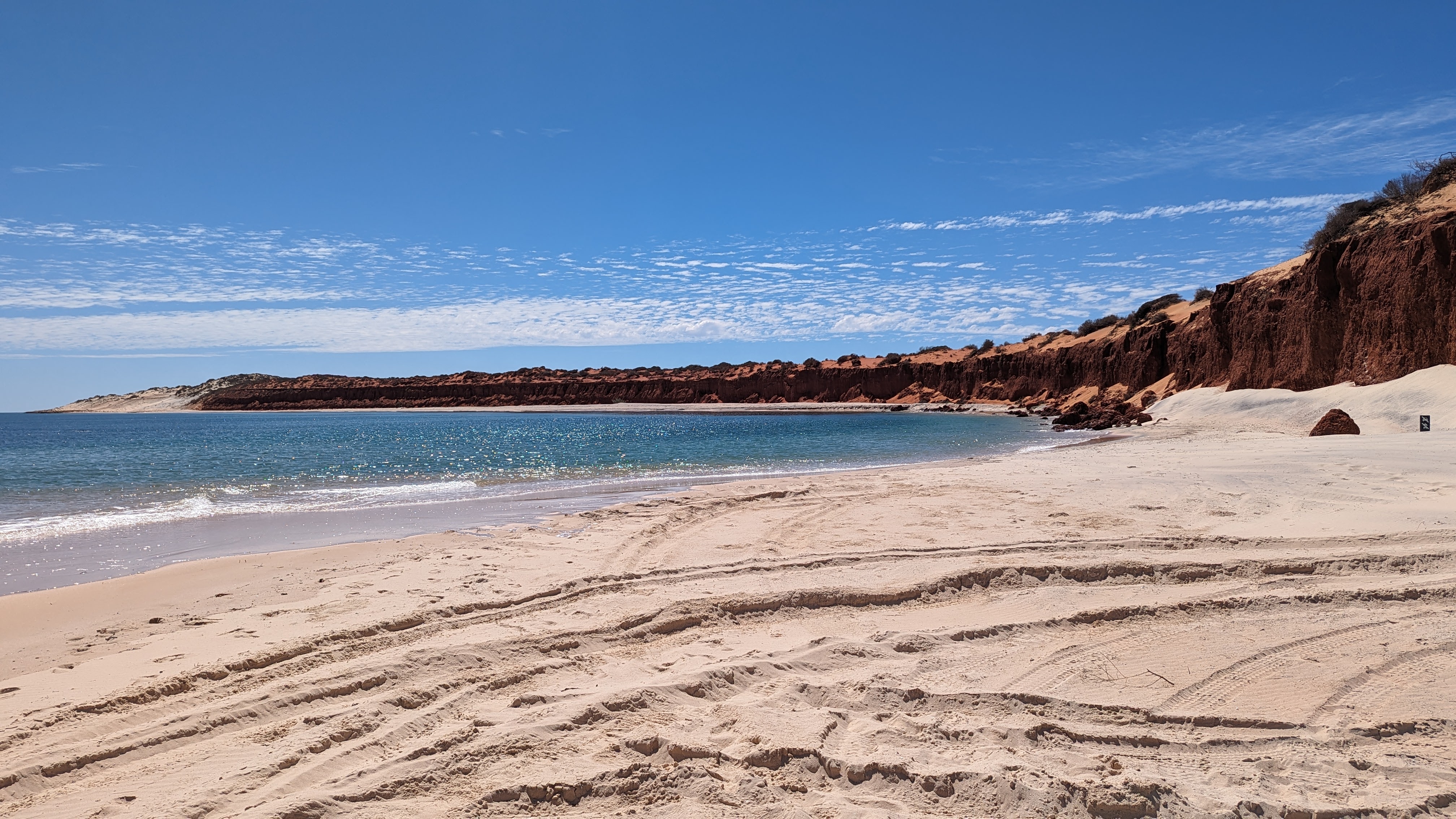 Nous allons donc vous parler de notre passage dans la Baie Shark, dans laquelle nous avons passé 3 jours entiers. Cette baie, de par sa topographie bien particulière (très peu profonde), est une extraordinaire réserve de vie marine. Elle abrite le plus grand herbier marin au monde, et par conséquent une des plus grosses populations de dugongs (qui broutent le dit herbier). Mais ce n’est pas tout: suivant les saisons on peut y croiser des dauphins, des raies manta, des tortues et plein d’autres animaux. Et pour ne rien gâcher, les paysages sont assez extraordinaires. Enfin, on vous laissera en juger.