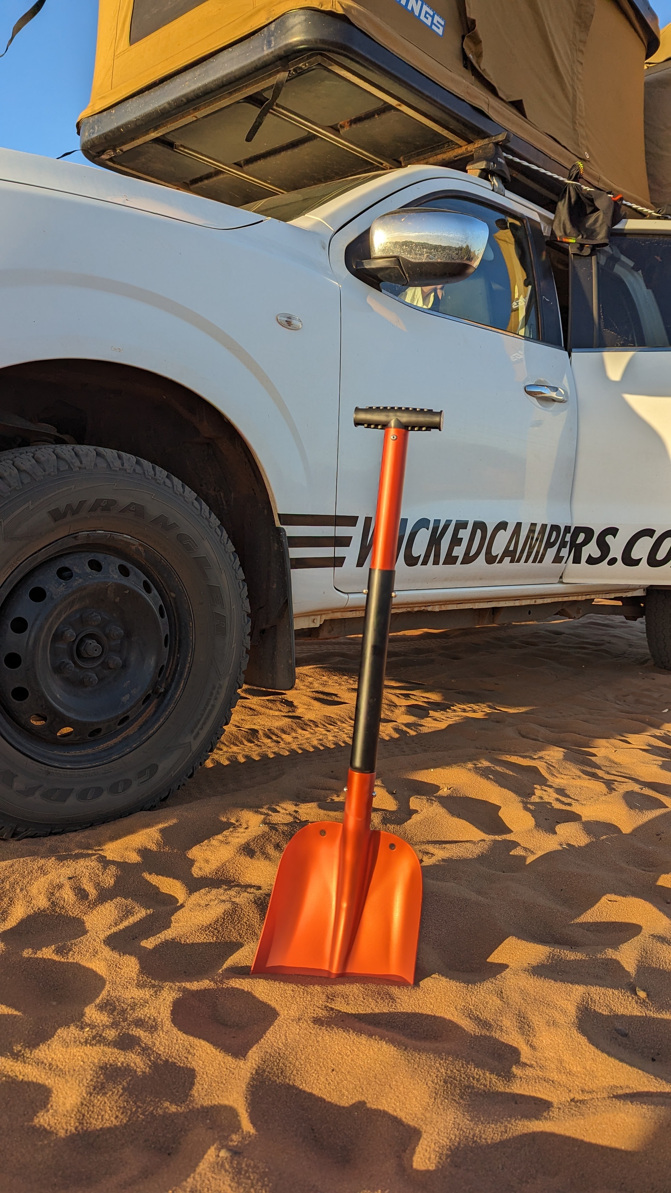 Alors on a pris toutes les précautions d’usage, on a conduit a priori comme il fallait, on a essayé d’éviter les gros tas de sable les plus mous mais ça n’a pas loupé : on s’est ensablé. Sur le coup, nous n’avons pas pensé à prendre de photos parce que bon, la priorité était plutôt de s’en sortir. Mais après coup, on se dit que c’était une chouette expérience. Et surtout quelle bonne idée d’avoir acheté une pelle le matin même ! Sans elle, on y serait peut-être encore (il ne faut pas trop compter sur les secours. On te dit à l’entrée que si ça va mal, tu restes dans ta voiture et tu attends, charge à toi d’avoir assez d’eau potable pour ne pas mourir de soif).