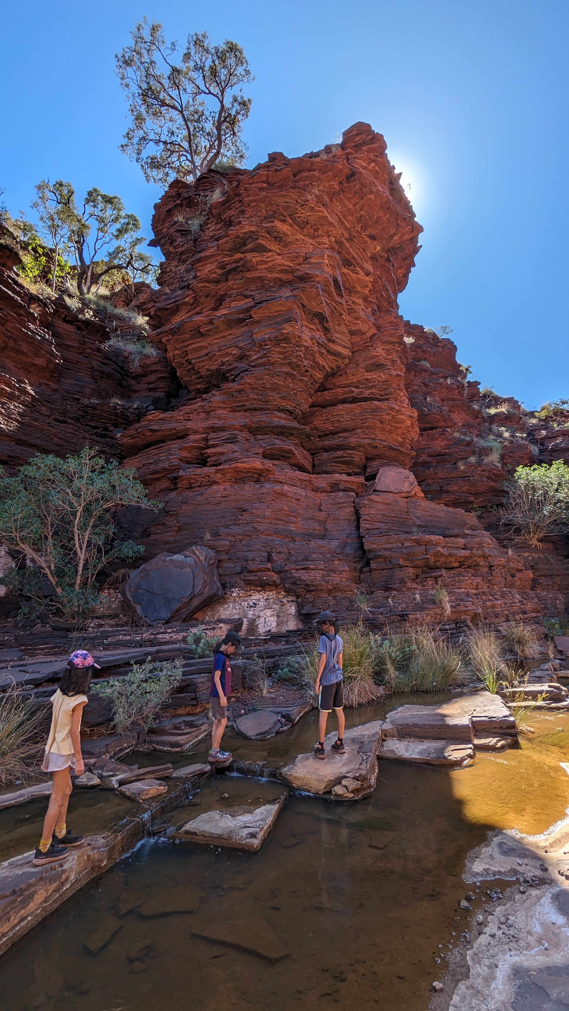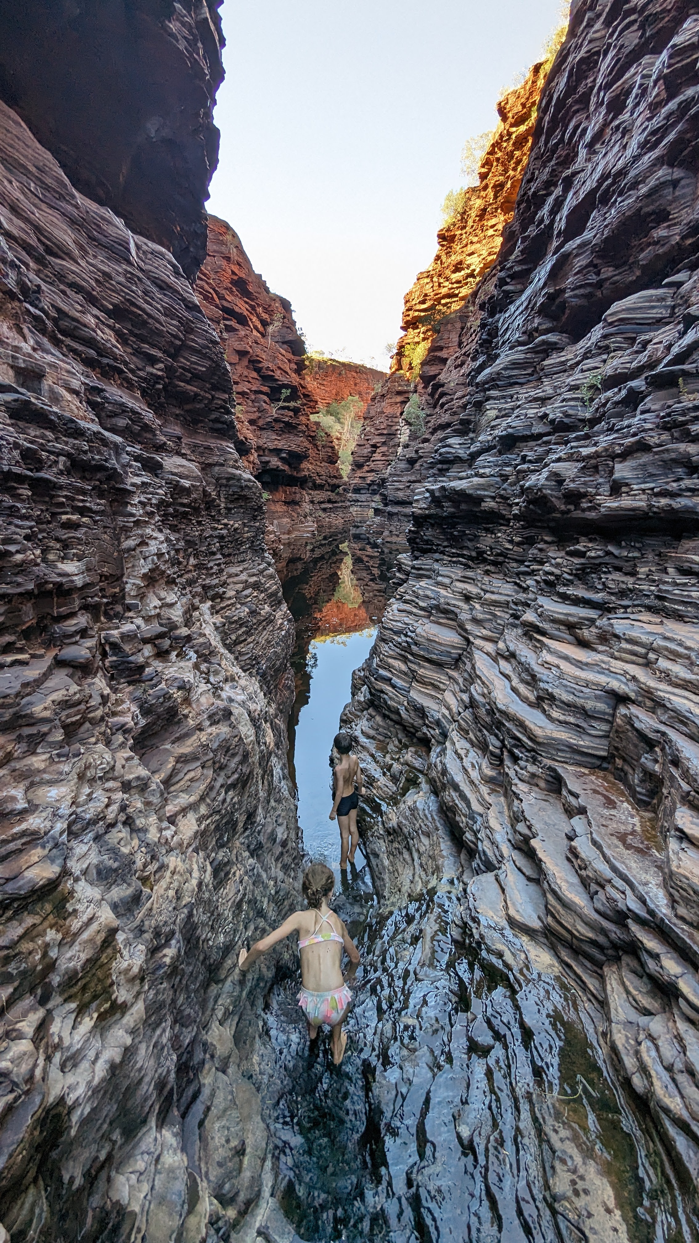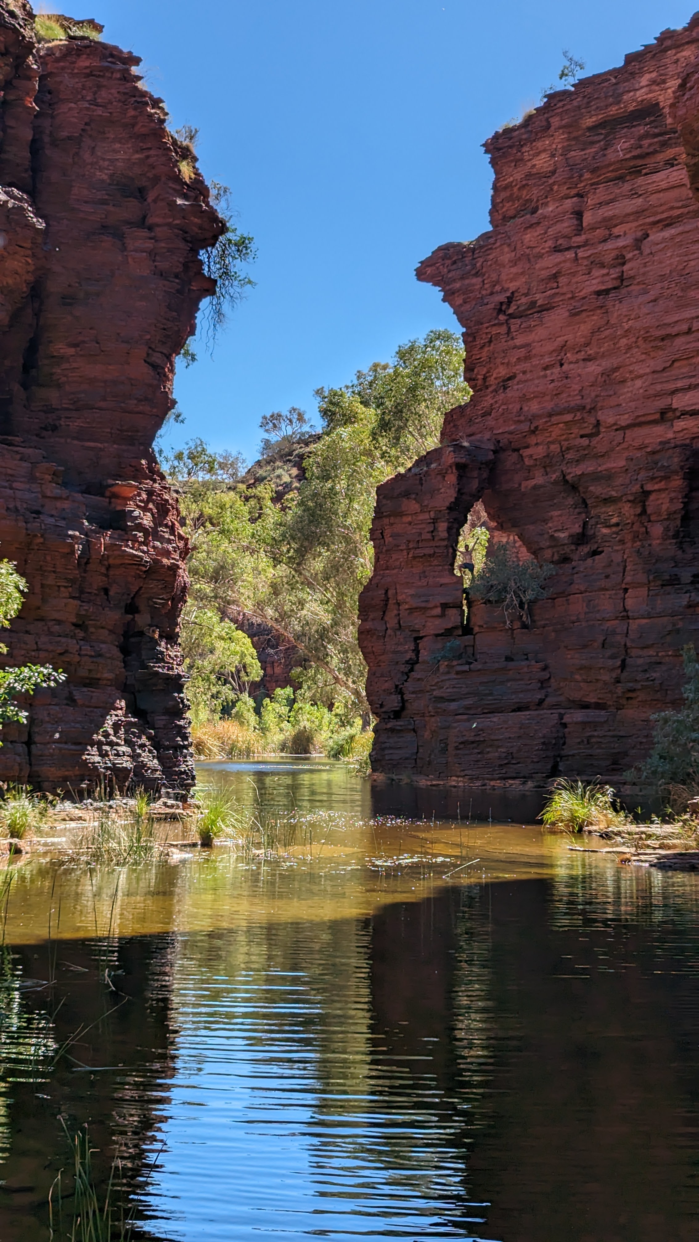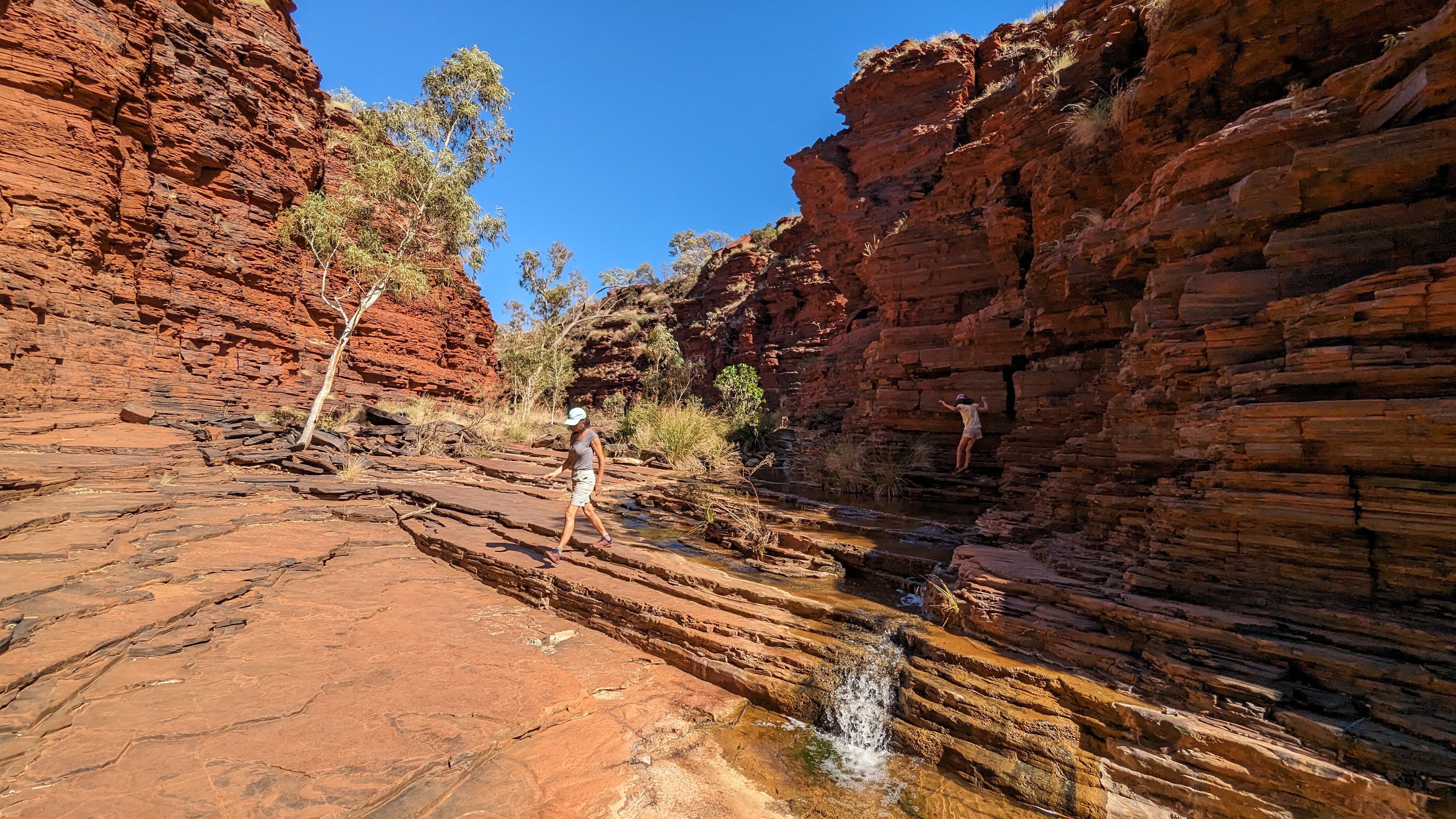 La première journée fut consacrée à atteindre la gorge la plus lointaine et la moins accessible de toutes (50 km de piste) : Hamersley Gorge. Au palmarès final, ce fut finalement notre préférée. Pas très profonde mais parfaite pour une baignade. Car oui, il faut le préciser : si dans le reste de l’Australie Occidentale (du moins la partie qu’on a déjà traversée), absolument tous les ruisseaux sont à sec, l’aridité ne semble pas avoir de prise ici. C’est un peu miraculeux mais même au plus fort de la saison chaude, les rivières coulent toujours dans ce petit paradis, offrant aux randonneurs le plaisir d’une trempette bien méritée.