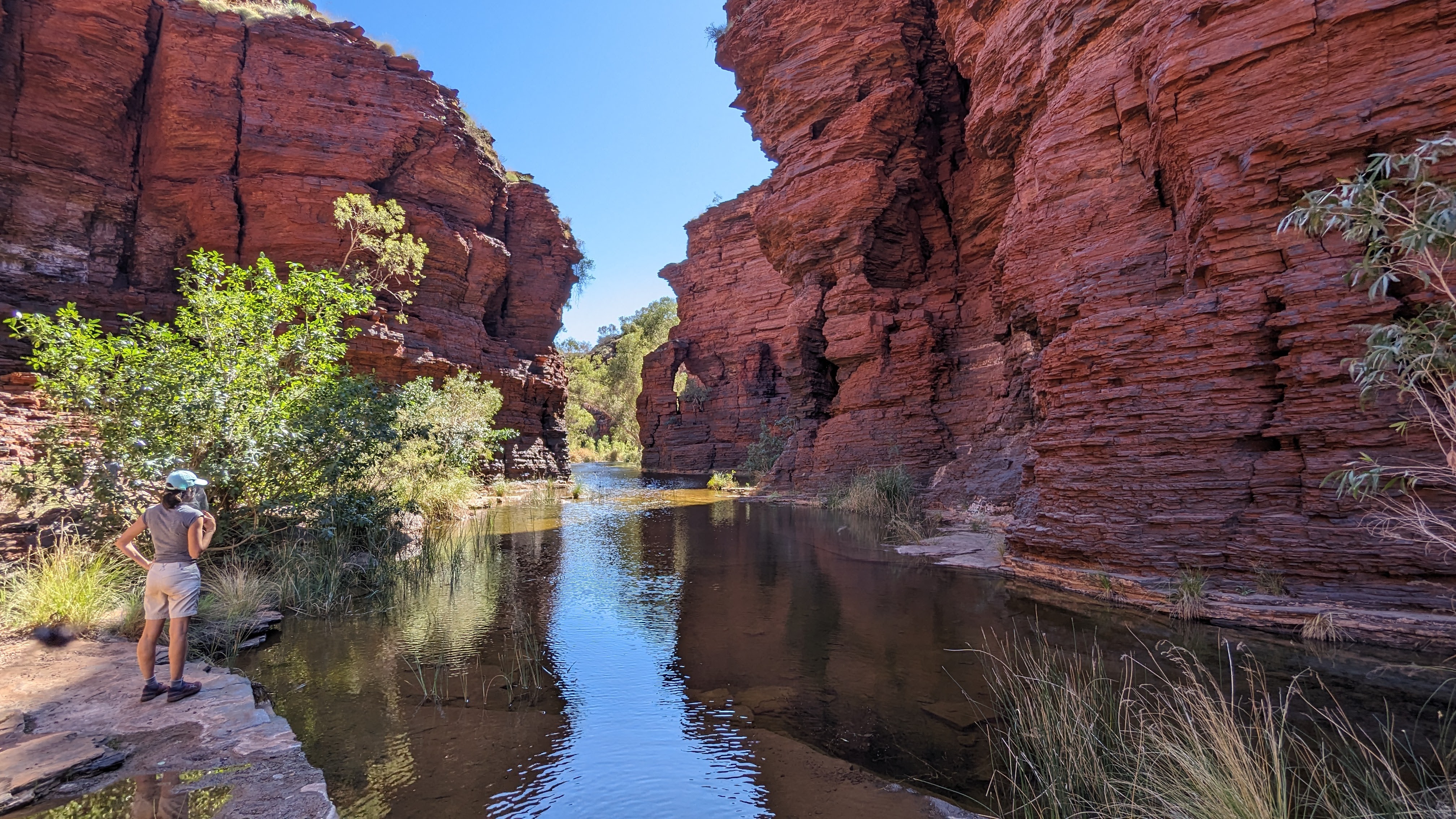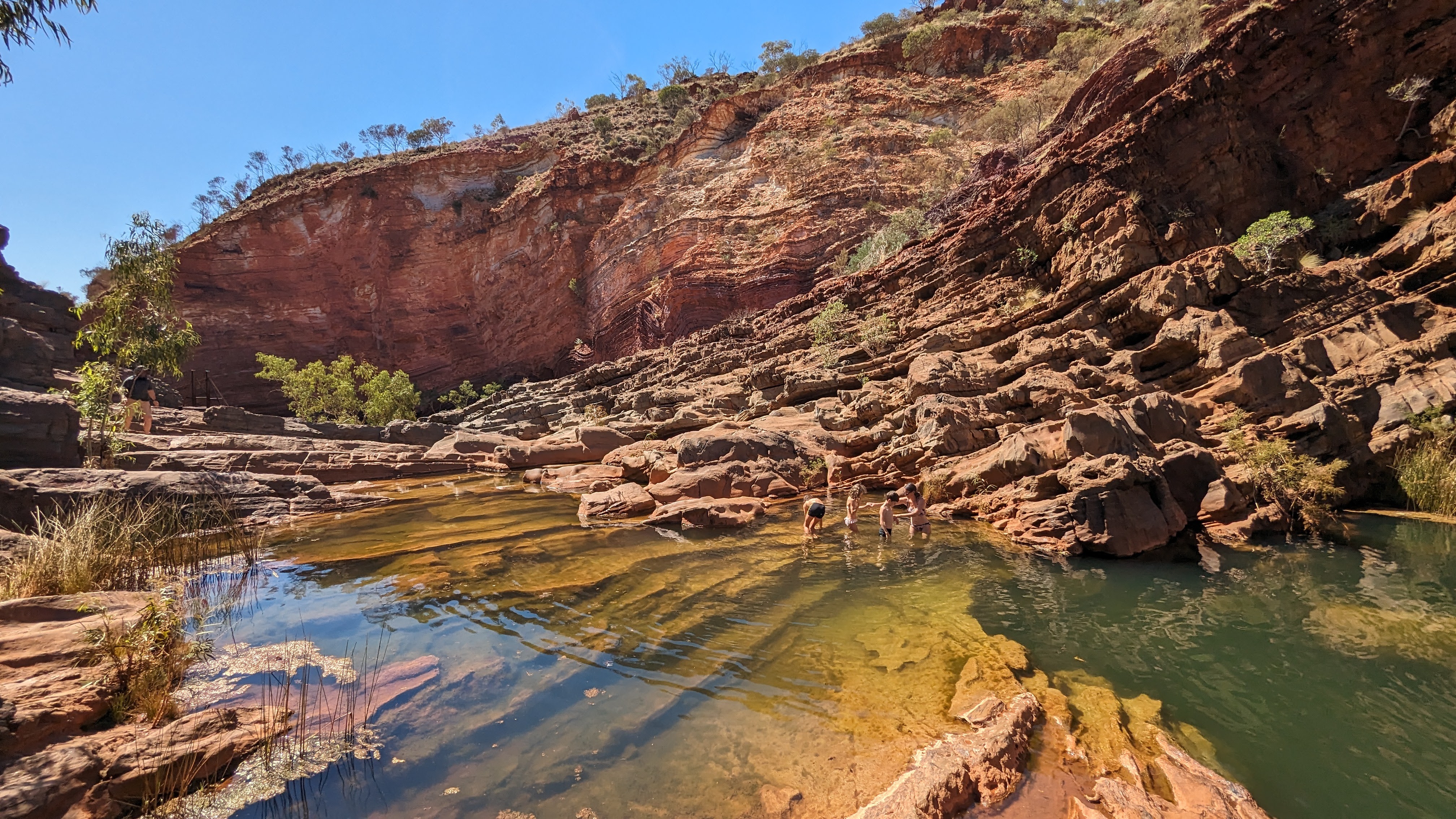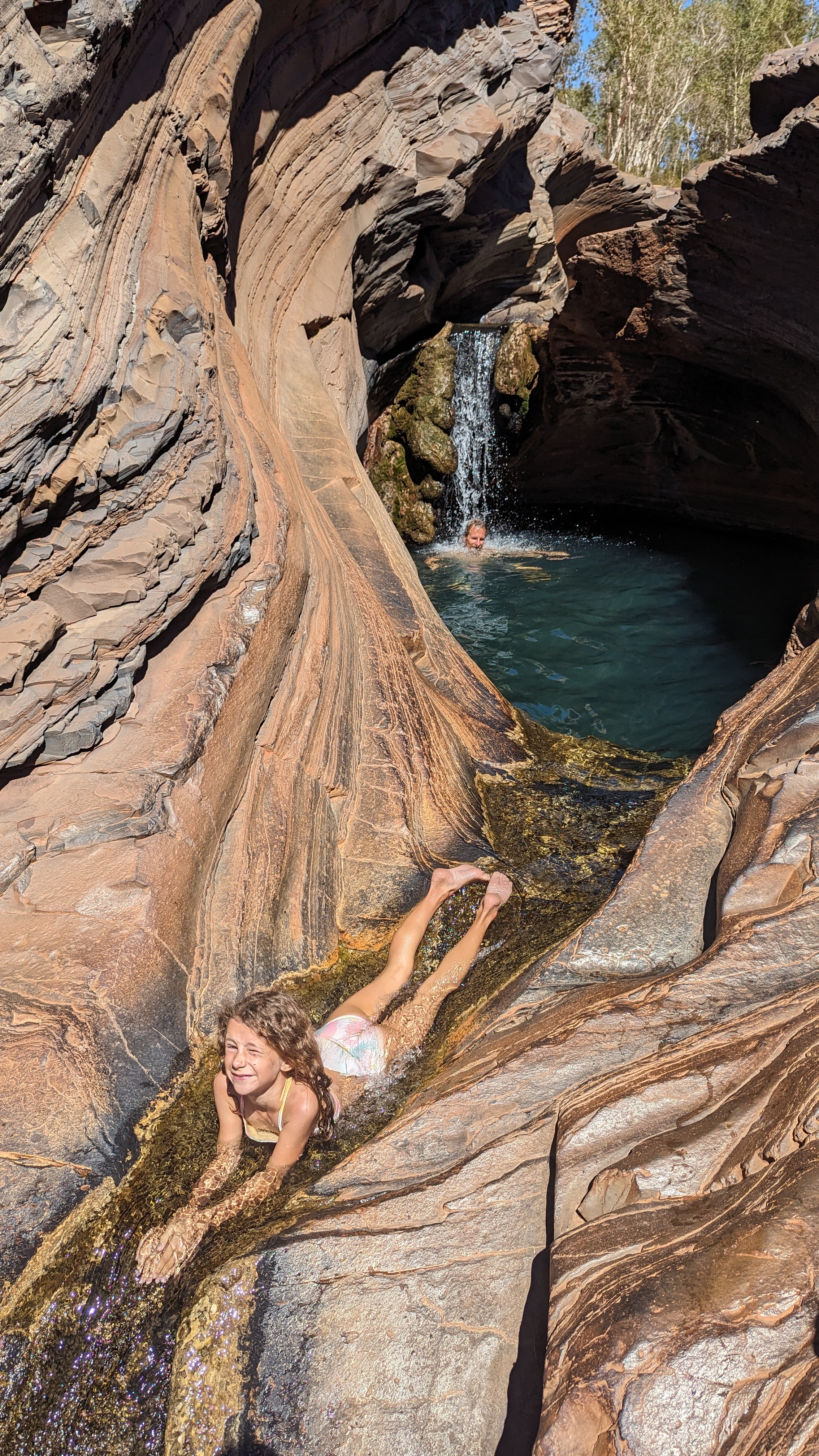 La première journée fut consacrée à atteindre la gorge la plus lointaine et la moins accessible de toutes (50 km de piste) : Hamersley Gorge. Au palmarès final, ce fut finalement notre préférée. Pas très profonde mais parfaite pour une baignade. Car oui, il faut le préciser : si dans le reste de l’Australie Occidentale (du moins la partie qu’on a déjà traversée), absolument tous les ruisseaux sont à sec, l’aridité ne semble pas avoir de prise ici. C’est un peu miraculeux mais même au plus fort de la saison chaude, les rivières coulent toujours dans ce petit paradis, offrant aux randonneurs le plaisir d’une trempette bien méritée.