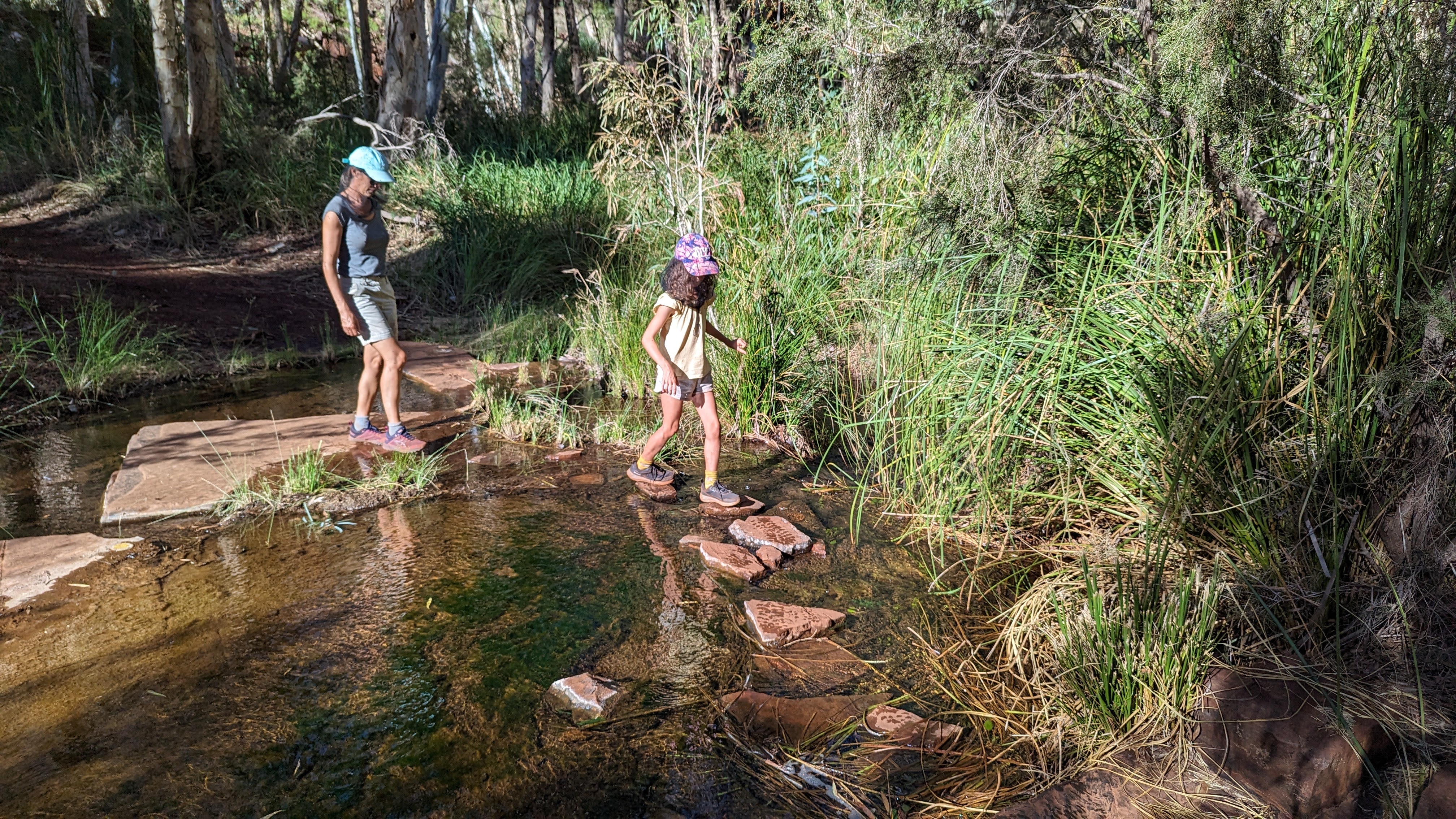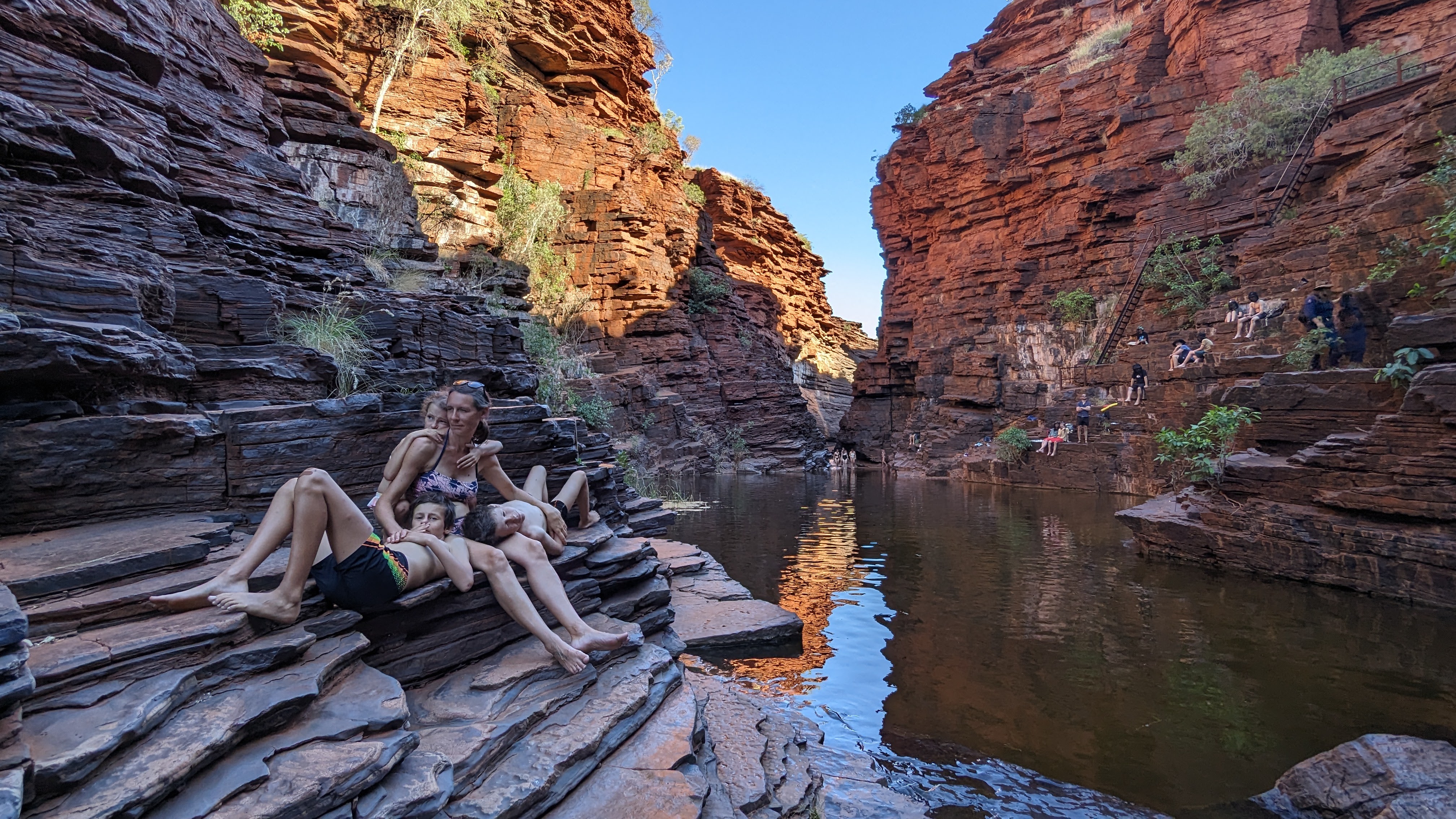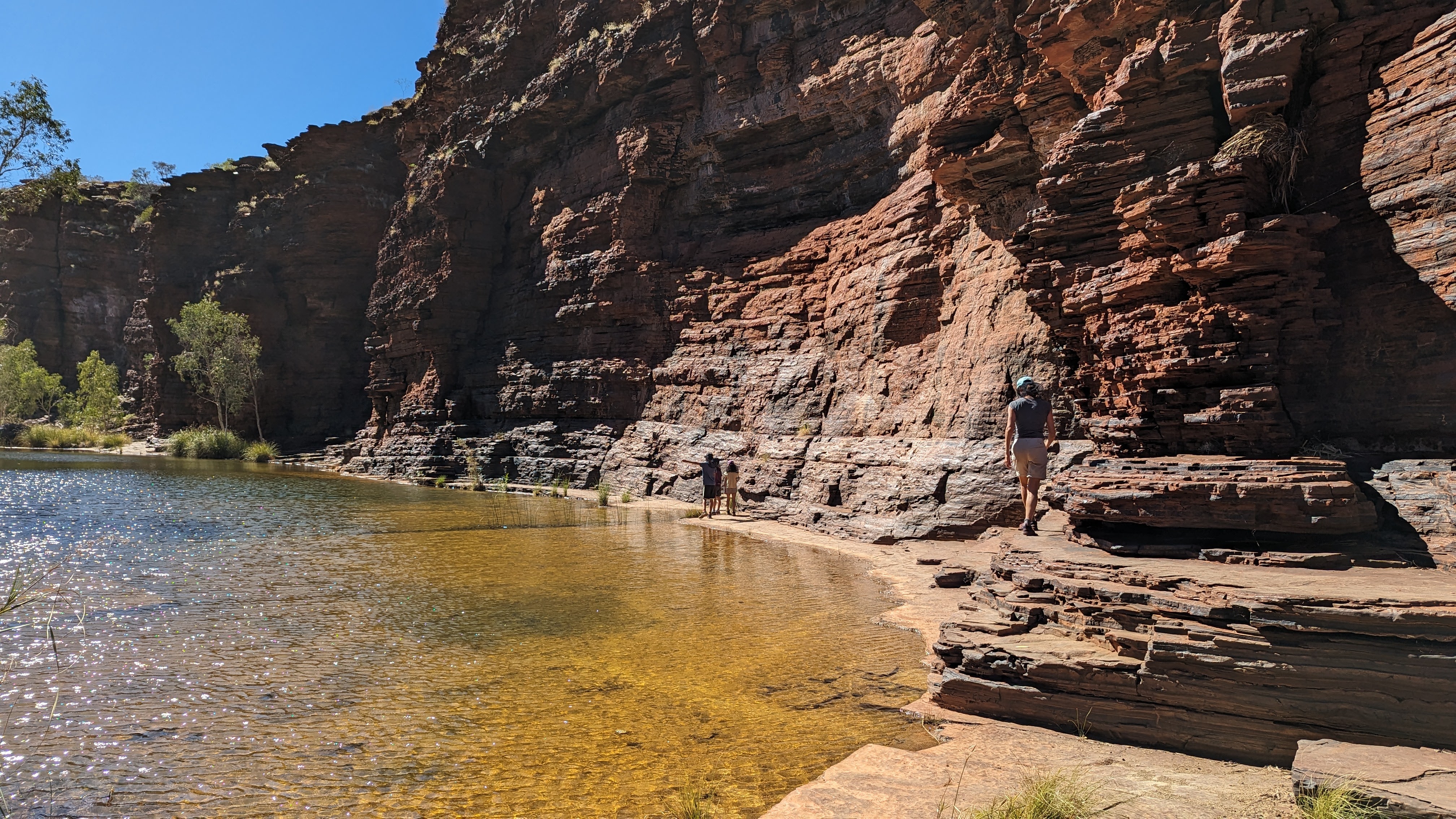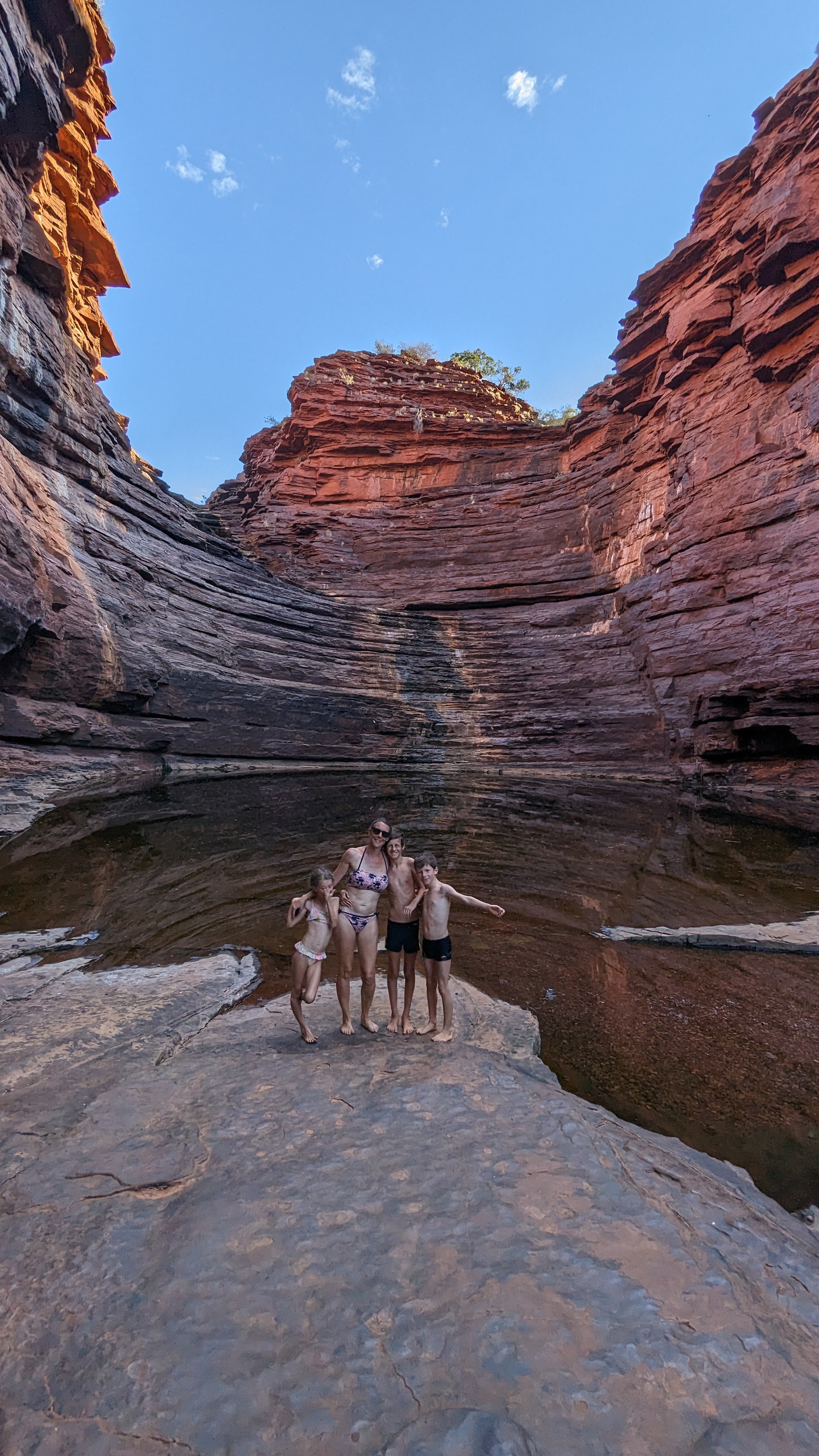 La première journée fut consacrée à atteindre la gorge la plus lointaine et la moins accessible de toutes (50 km de piste) : Hamersley Gorge. Au palmarès final, ce fut finalement notre préférée. Pas très profonde mais parfaite pour une baignade. Car oui, il faut le préciser : si dans le reste de l’Australie Occidentale (du moins la partie qu’on a déjà traversée), absolument tous les ruisseaux sont à sec, l’aridité ne semble pas avoir de prise ici. C’est un peu miraculeux mais même au plus fort de la saison chaude, les rivières coulent toujours dans ce petit paradis, offrant aux randonneurs le plaisir d’une trempette bien méritée.