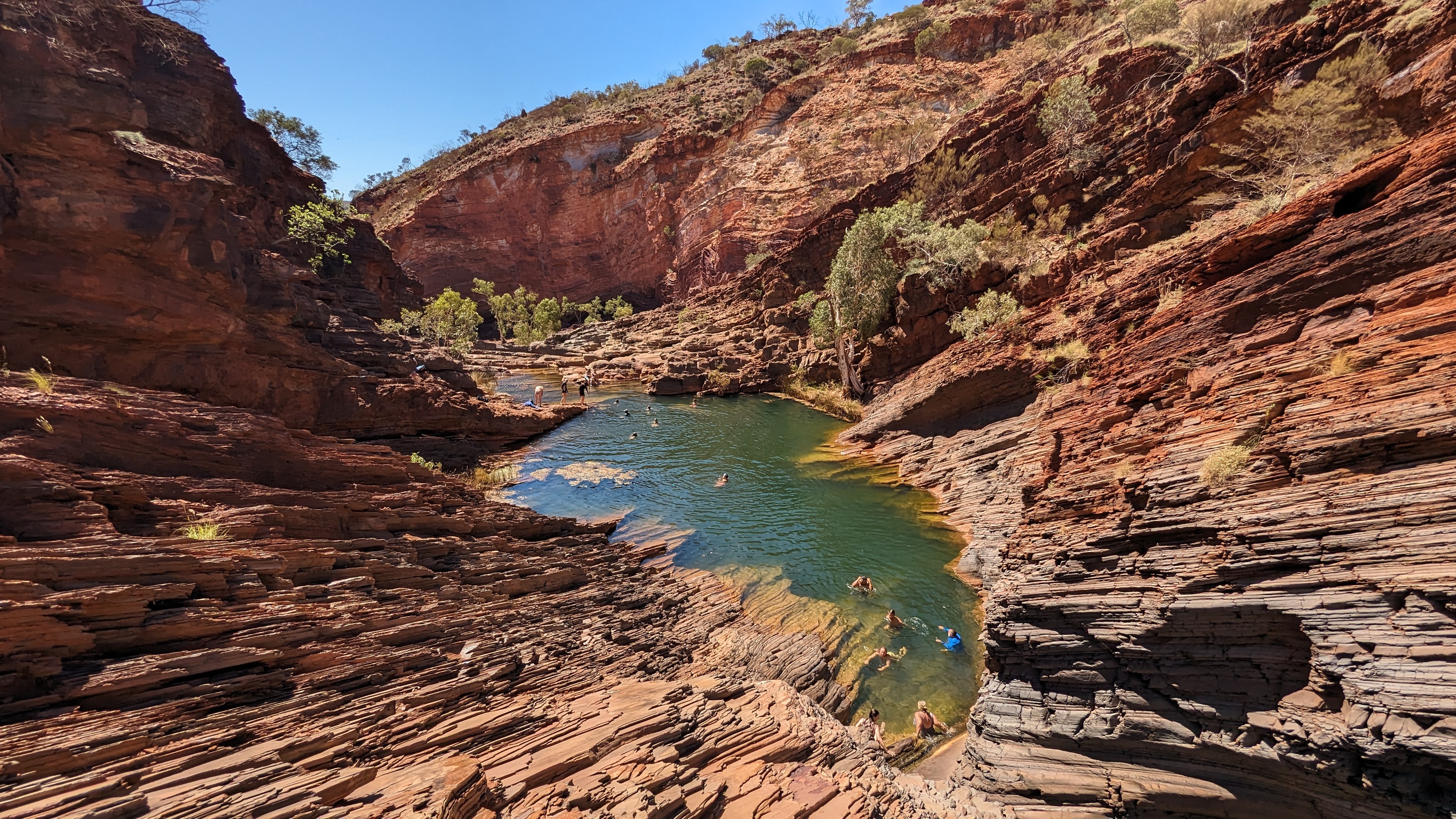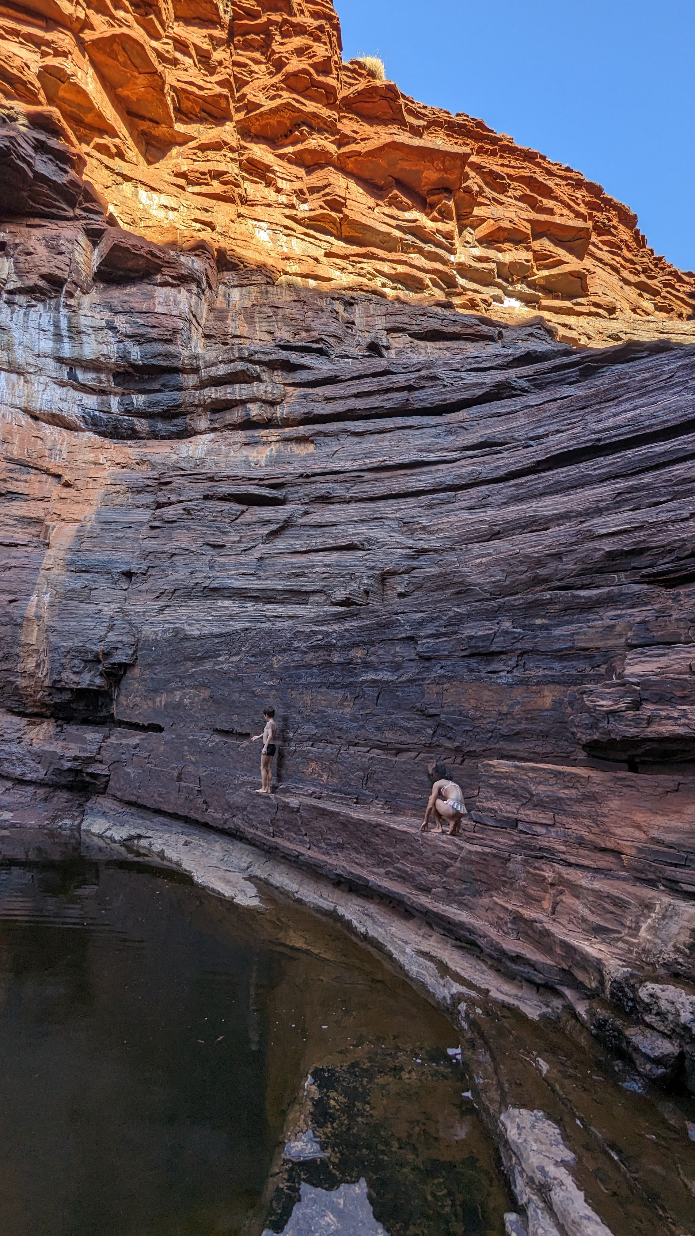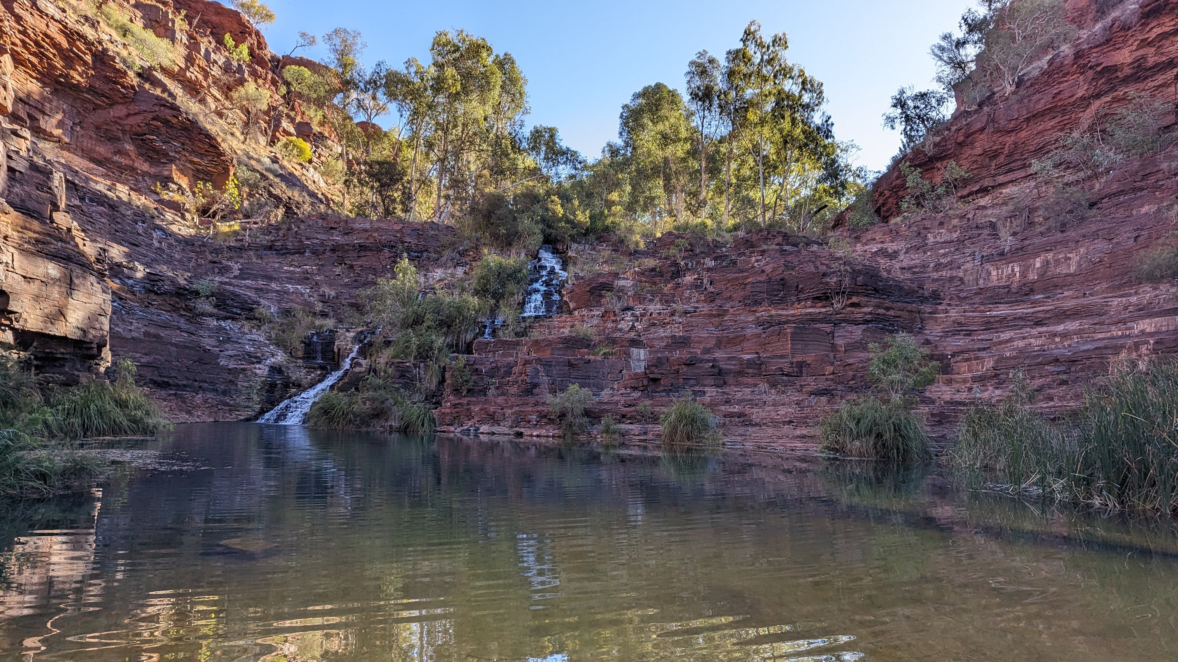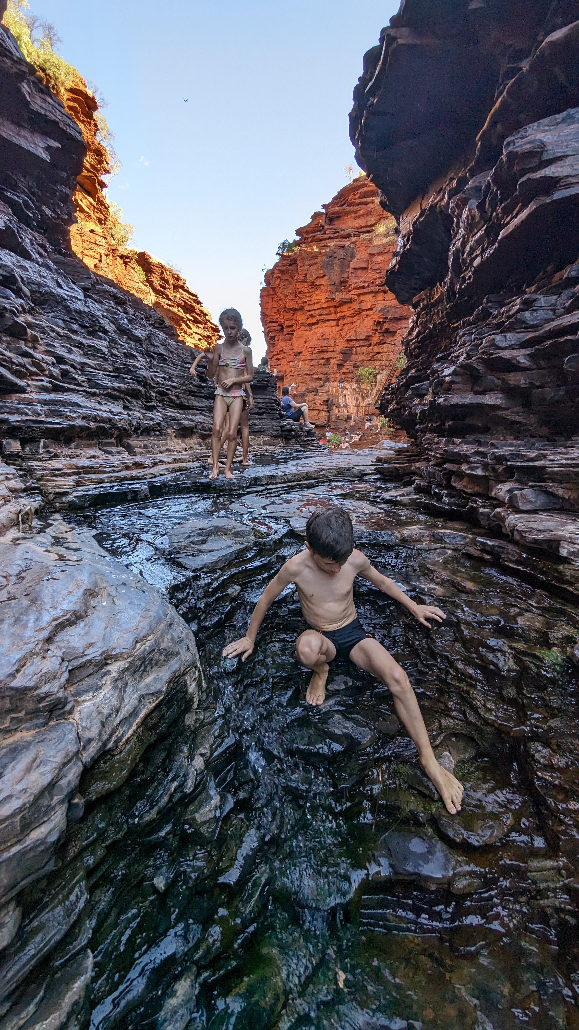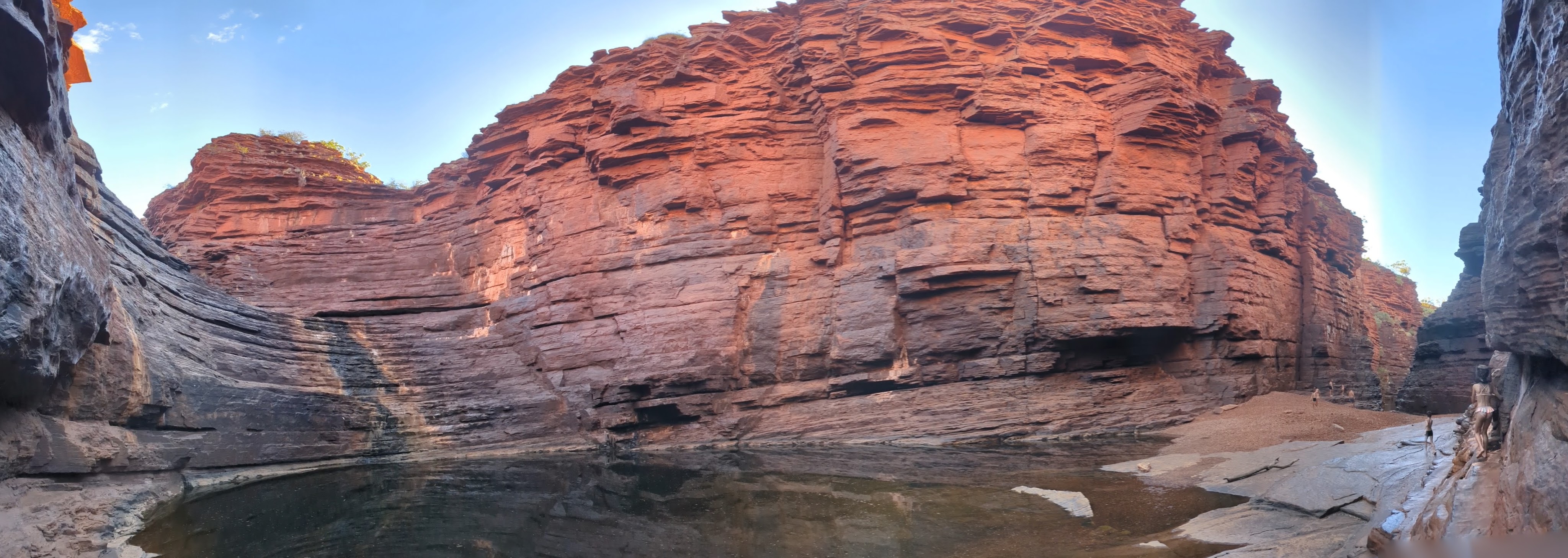 Autre ambiance pour la gorge suivante, celle de Joffre (nom bizarrement français, quel rapport avec le maréchal ?) : bien plus profonde, plus encaissée, plus sombre aussi (mais il faut dire qu’on y est entré en fin d’après-midi). Mais un spectacle grandiose : des falaises à pic, des roches striées de noir et de rouge, des passages étroits à explorer, des bassins où se baigner, des nuées de cacatoès volant au dessus de nous et pour finir la découverte presque par hasard d’un immense amphithéâtre occupé par une toute petite cascade (qu’on imagine bien plus violente à certains moments de l’année). Du grand spectacle !