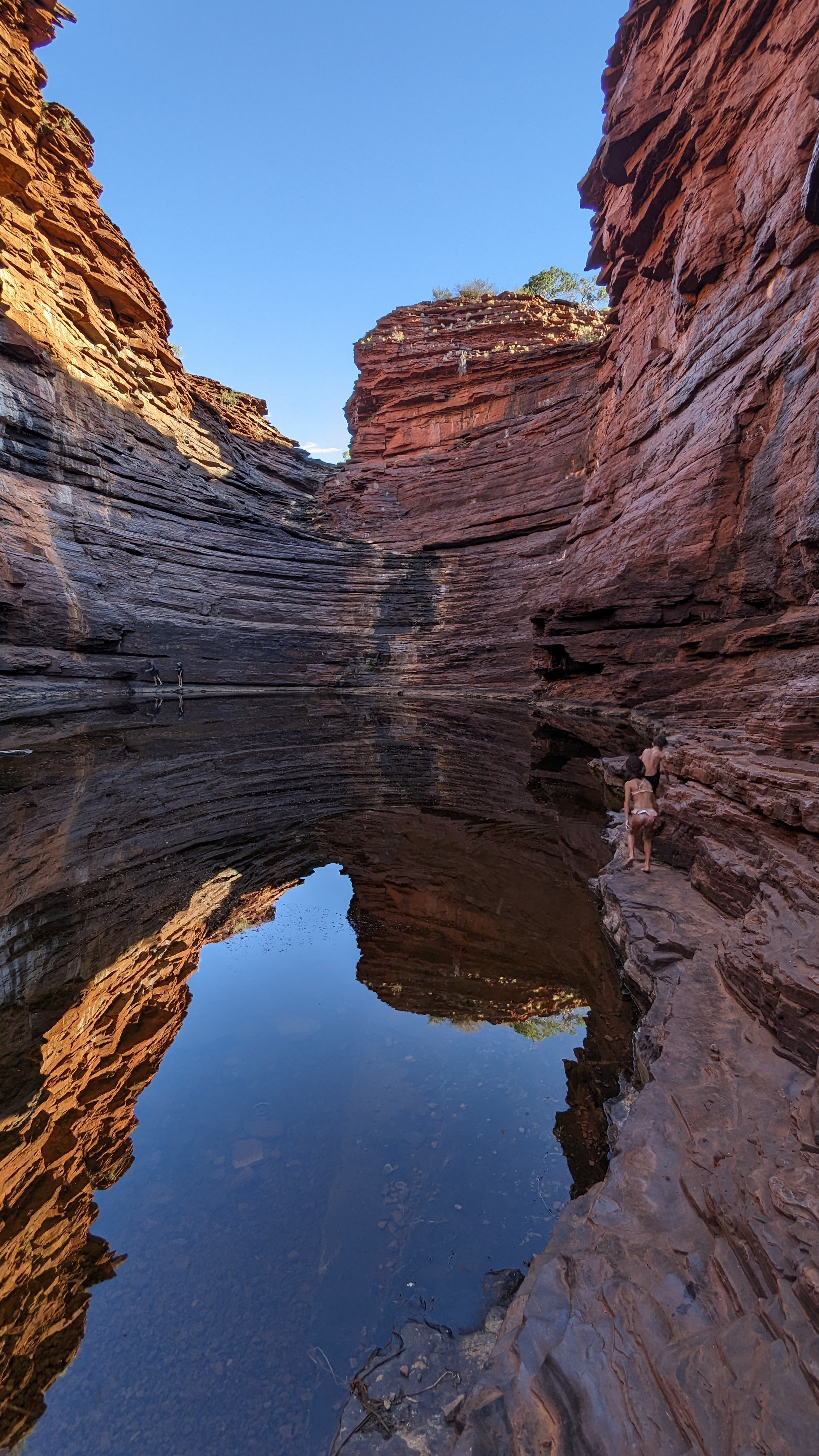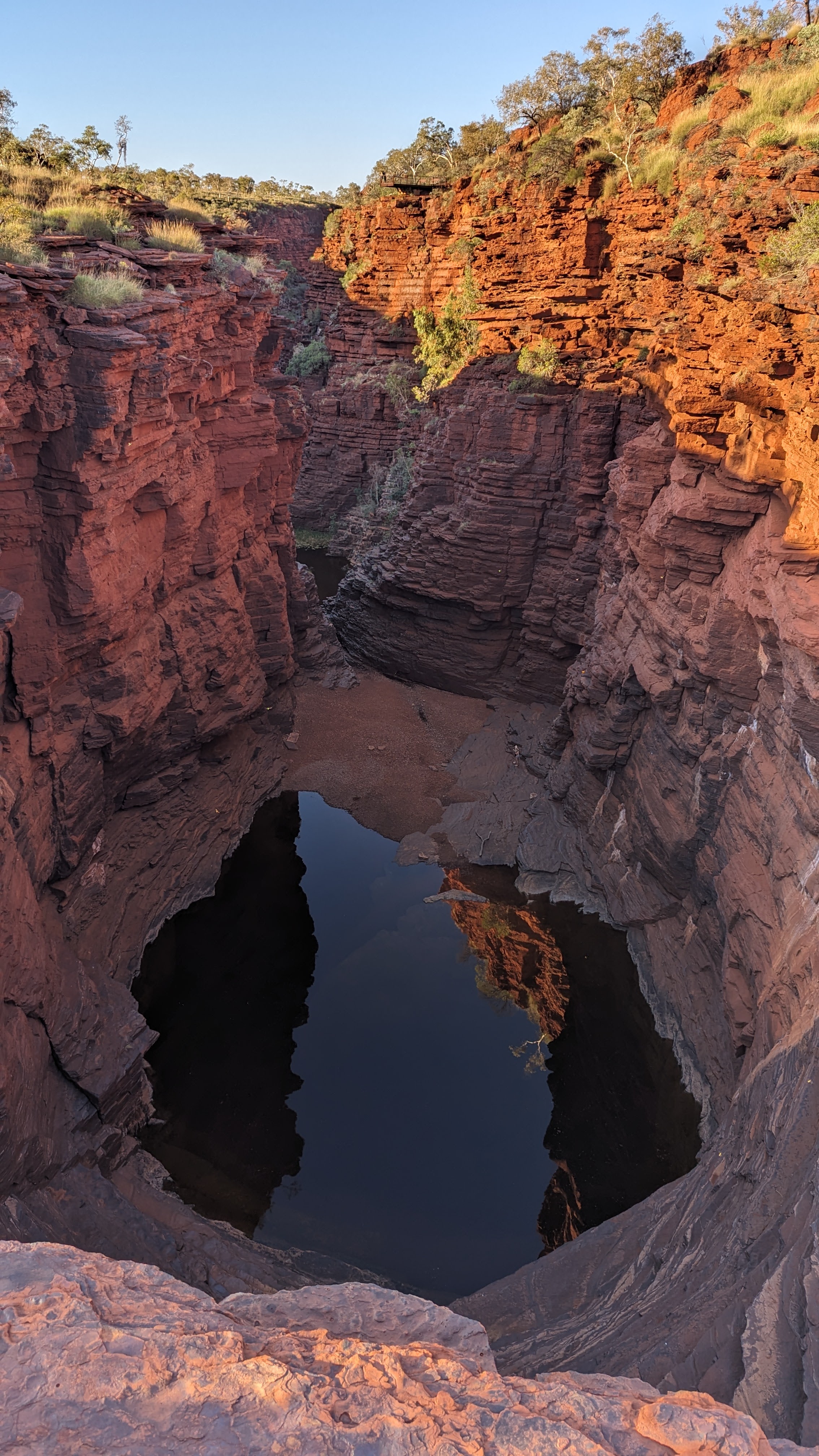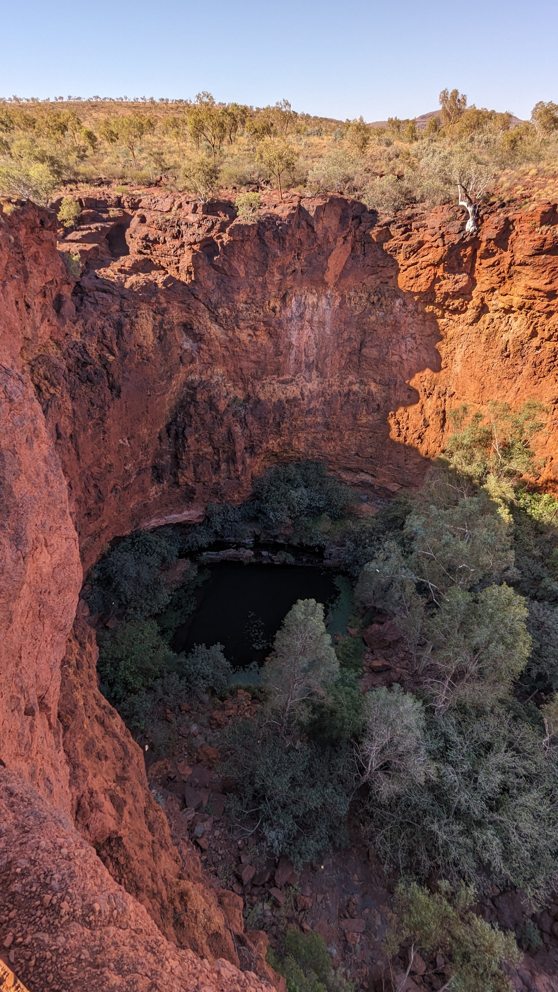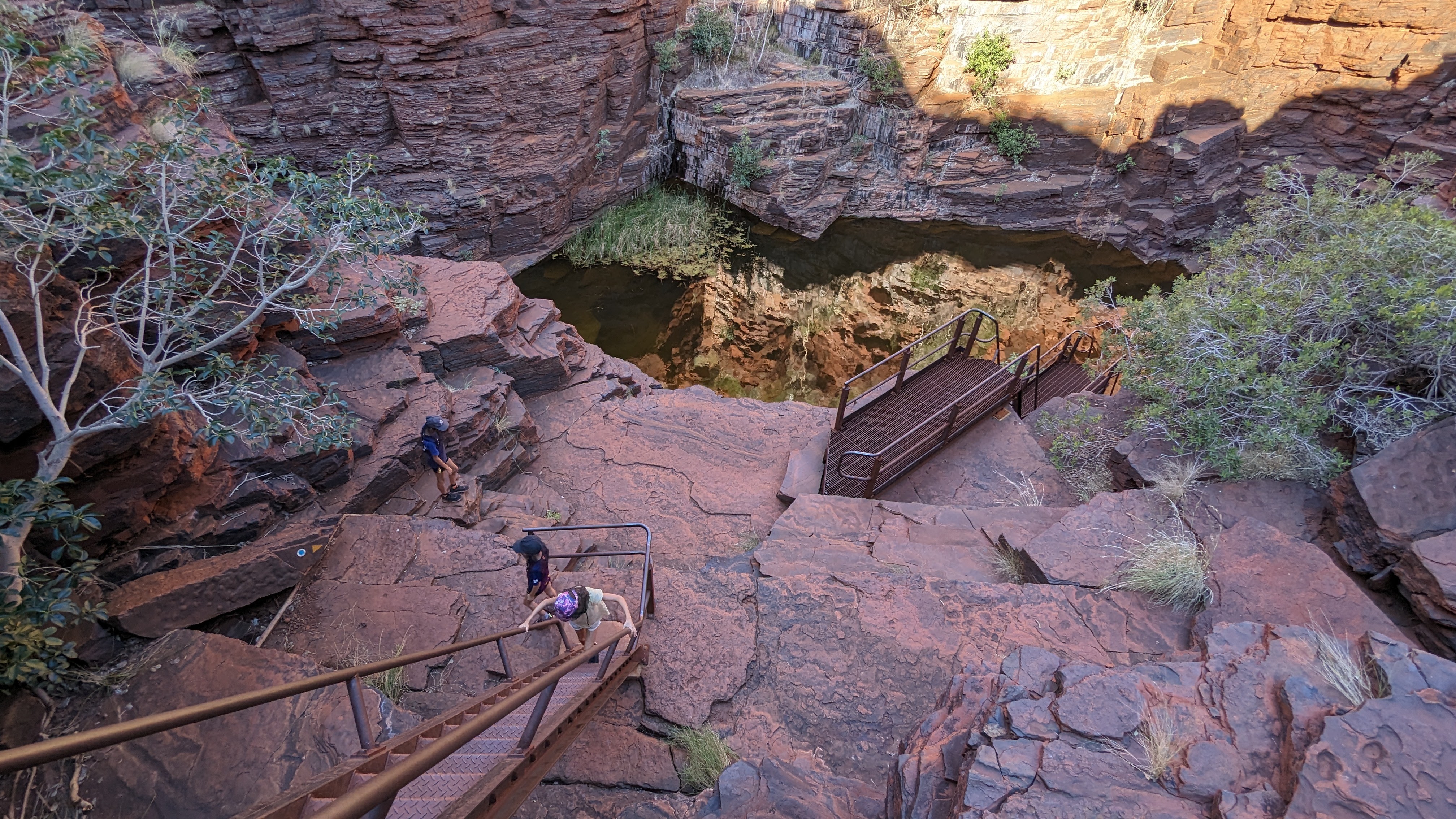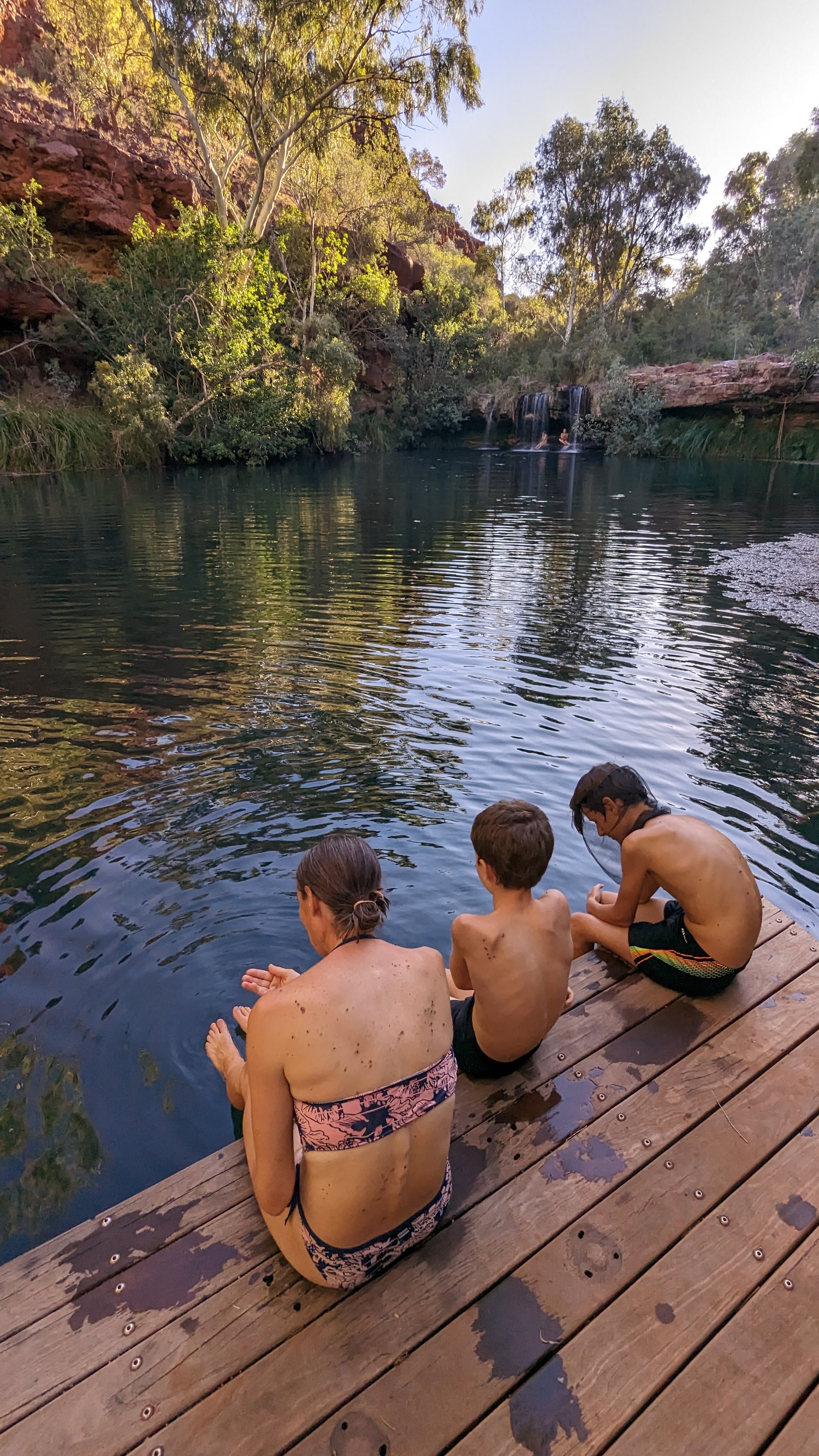 On gardait pour la fin les gorges de Dales : les plus grandes, les plus profondes, les plus impressionnantes par leur dimensions sans doute, peut-être l’équivalent australien du Grand Canyon. Là aussi, petite rando sur le promontoire rocheux en fin d’après-midi, quand le soleil rasant donne une couleur rouge sang aux rochers. Au fond de la vallée, l’eau est tellement présente que nous y avons traversé la première forêt depuis que nous avons quitté Perth. Le fond de la gorge est un véritable éden vert. Au bord de l’eau, les eucalyptus dressent leurs troncs formidables tandis que les racines des ficus forcent le passage entre les roches jusqu’à l’eau. Au bout du chemin, de splendides cascades (les plus grandes du parc) s’écoulent dans un bassin transparent (où nous nous sommes baignés, bien entendu), bassin lui-même dominé par un autre lac profond et peuplé de poissons mangeurs de peaux mortes (comme aux Philippines, à Siquijor, sauf que ces poissons-là au bout d’un moment, ils ouvrent la peau et font sacrément saigner ! Oh ça va les voraces !)