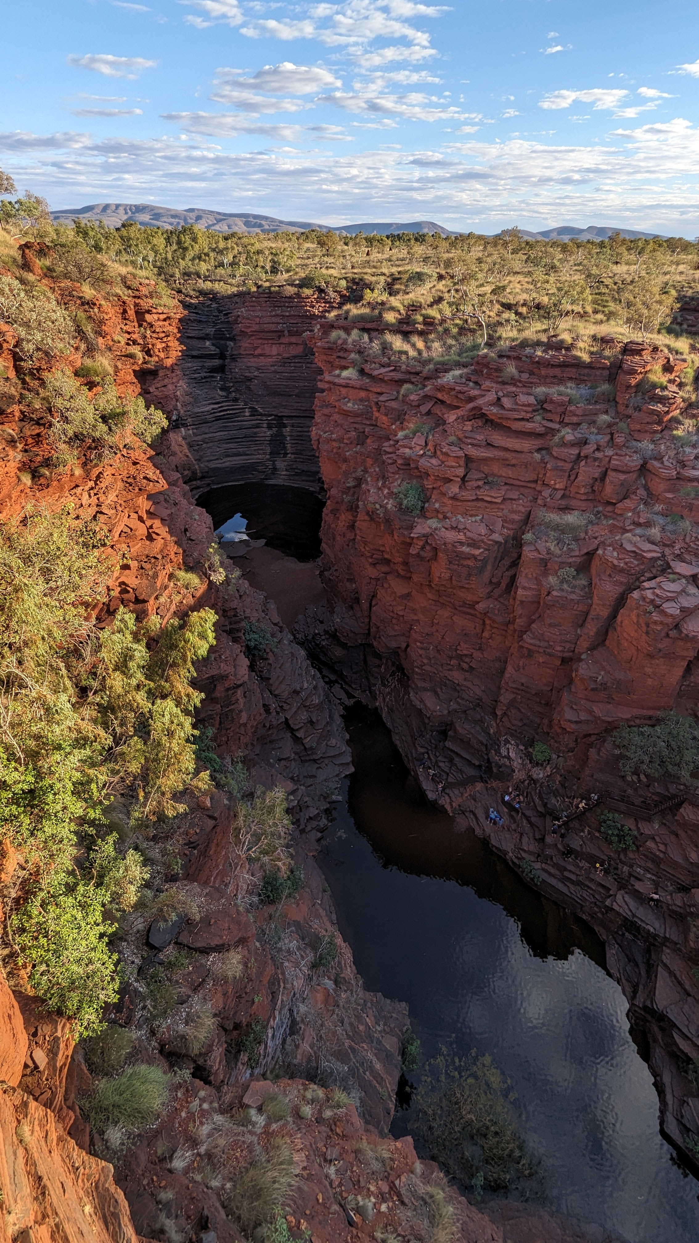 Mais revenons à Karijini. Un parc national installé sur des terres aborigènes avec l’accord de ces derniers (l’histoire ne nous dit pas avec quel degré de persuasion cet accord a été obtenu). Un parc installé sur les plus hauts reliefs de l’Australie Occidentale. Oh, ça ne va pas chercher bien haut, mais ça contraste fort avec la platitude des plaines environnantes. On navigue ici entre de jolies collines, des falaises et des “mesas” que ne renieraient pas les paysages d’Arizona ou du Nouveau-Mexique. Et les stars de ce parc, ce sont les gorges. Il en existe une douzaine officiellement. Huit sont ouvertes au public. Mais seulement 4 quand nous y étions. C’est un poil frustrant d’arriver au bout du monde pour trouver porte close, surtout quand les gorges en question sont fermées afin d’améliorer les routes d’accès alors qu’on dispose soi-même d’un 4×4 capable de passer tous les obstacles. Mais bon, c’est le jeu, et on le savait avant d’y arriver. Et soyons beaux joueurs, il y avait largement de quoi s’occuper avec ce qui restait ouvert.