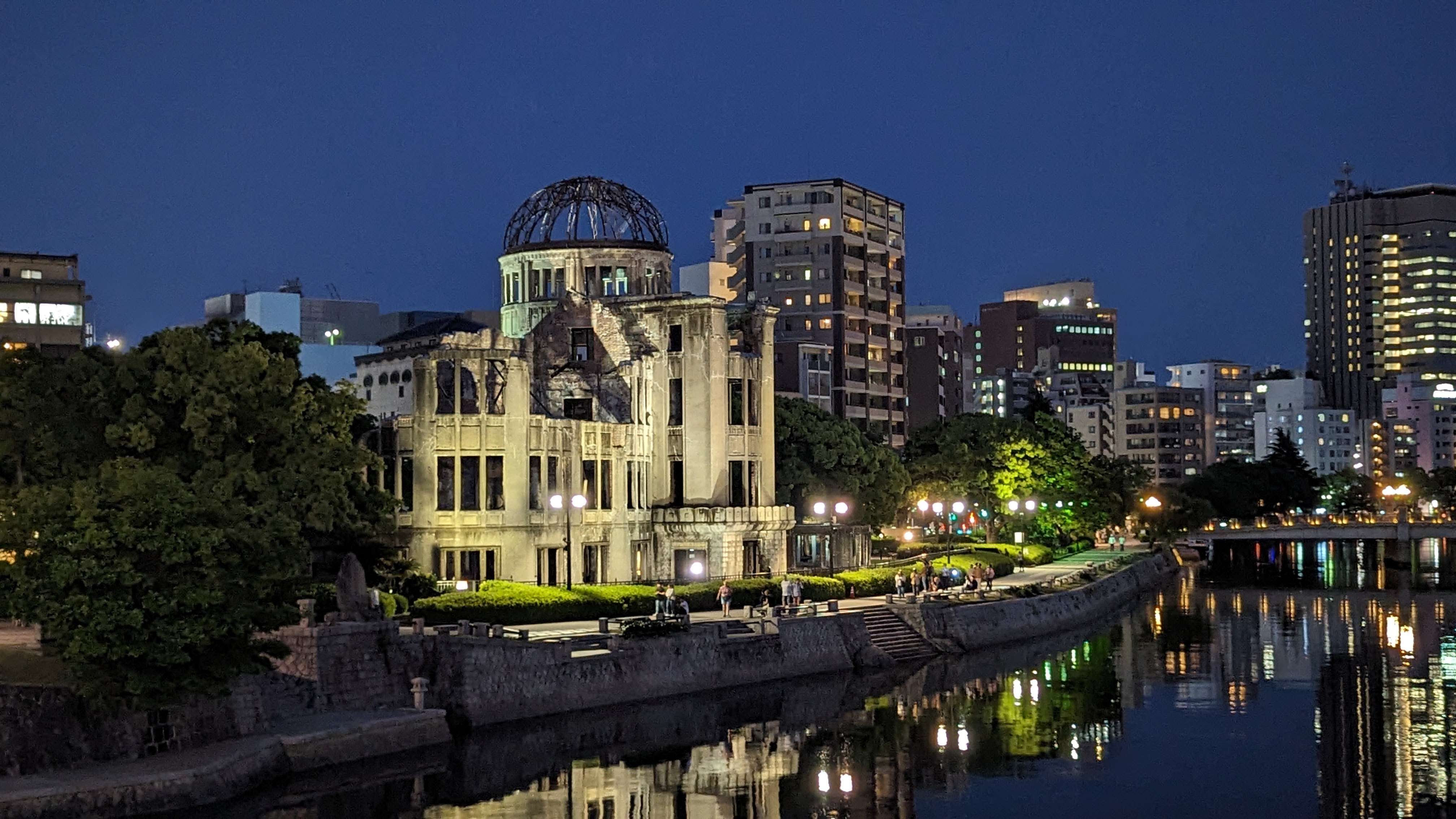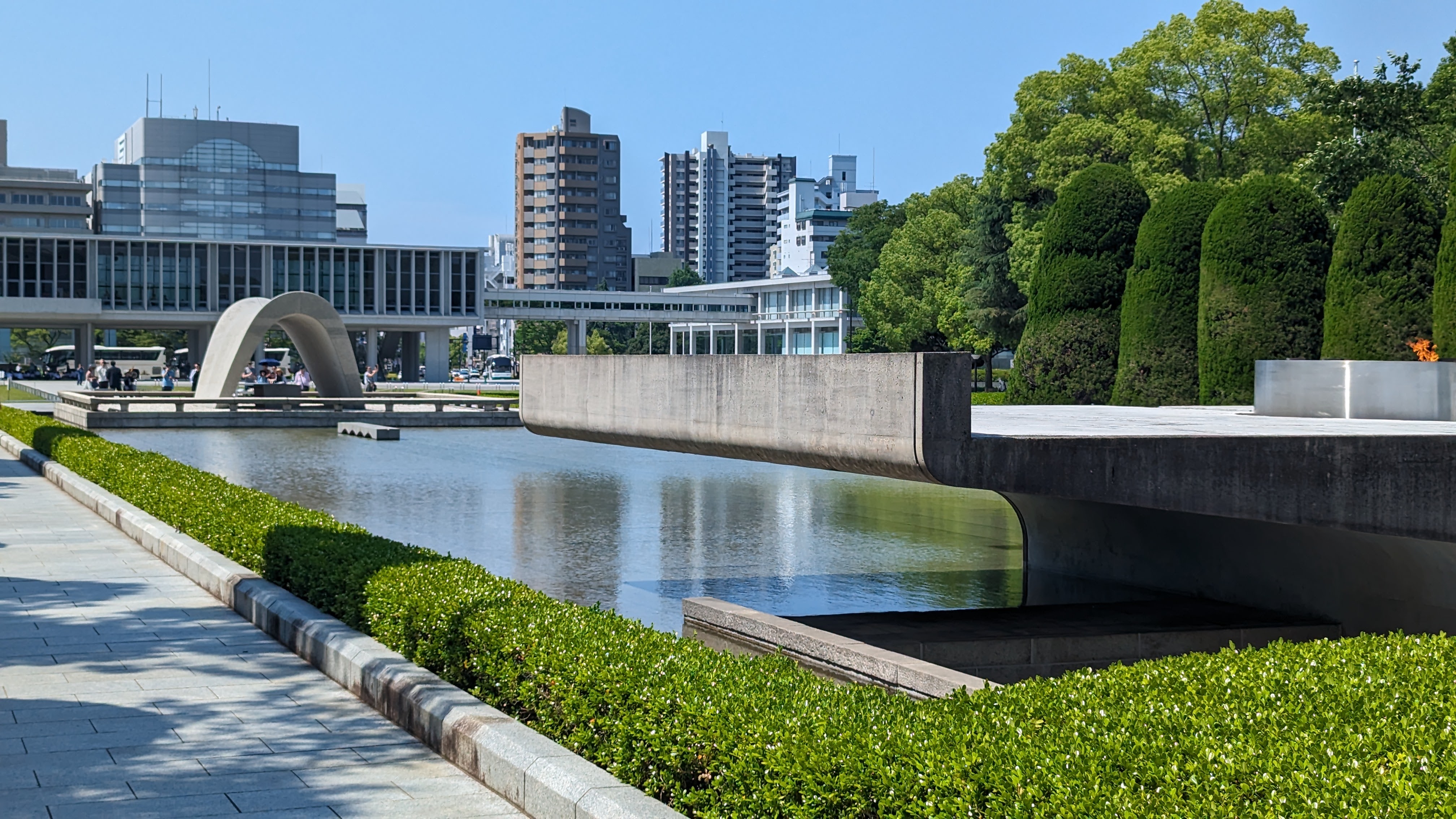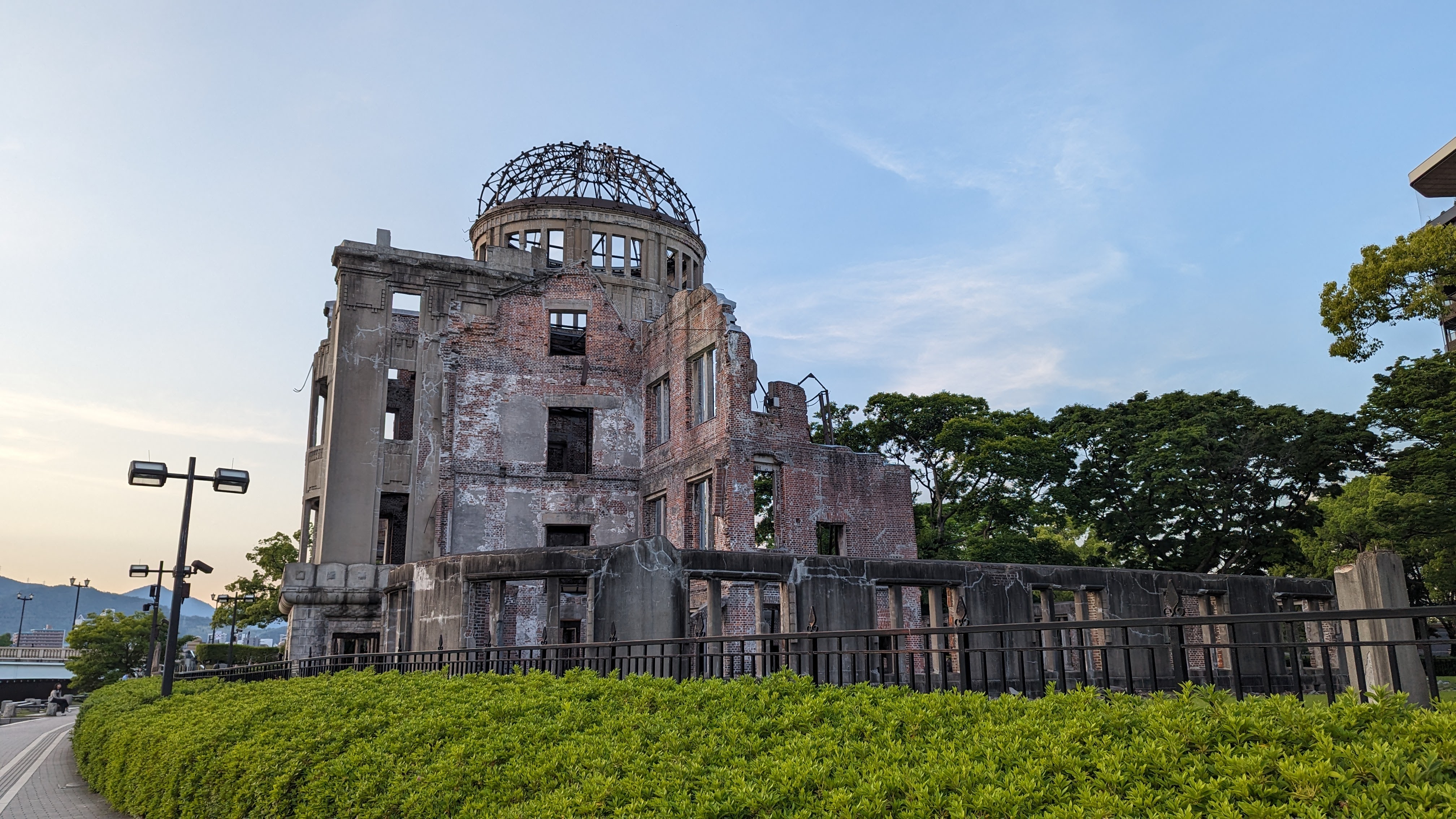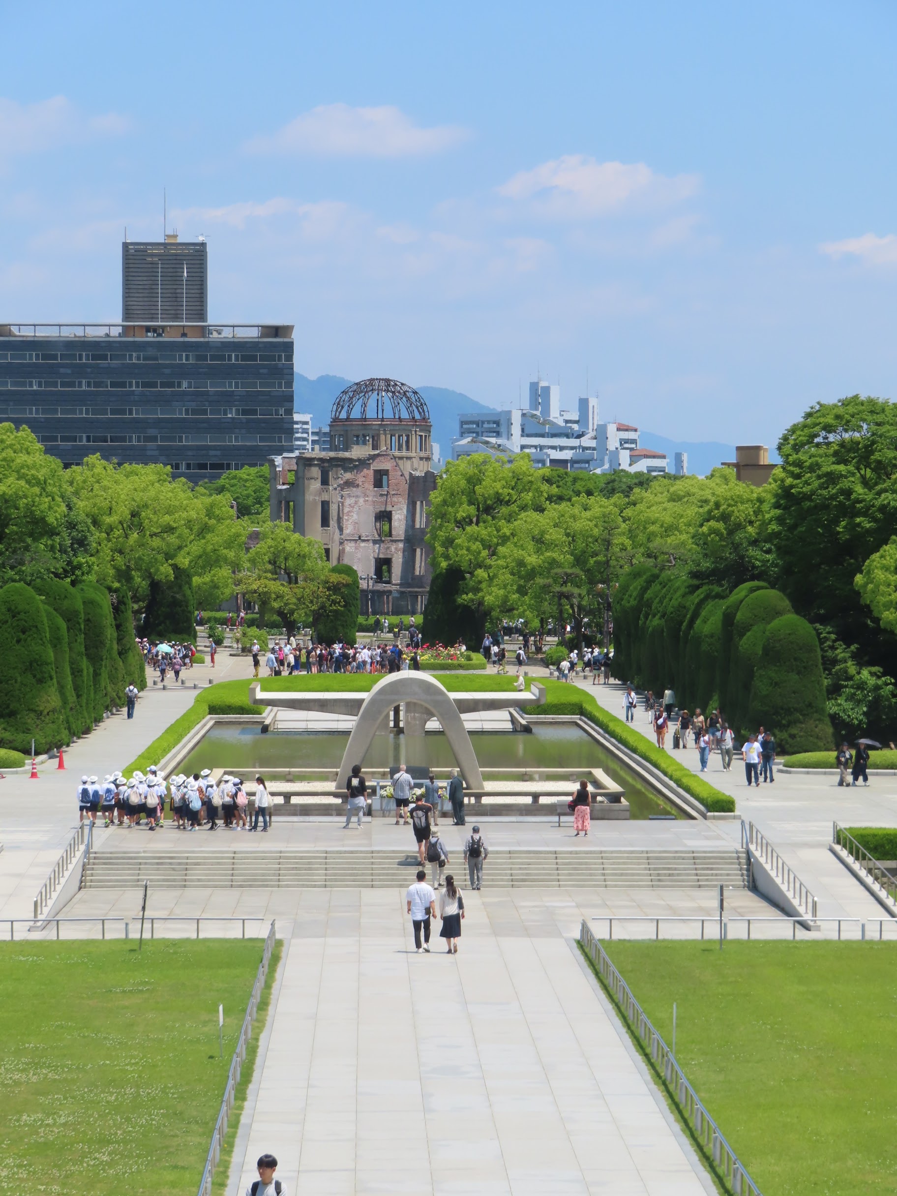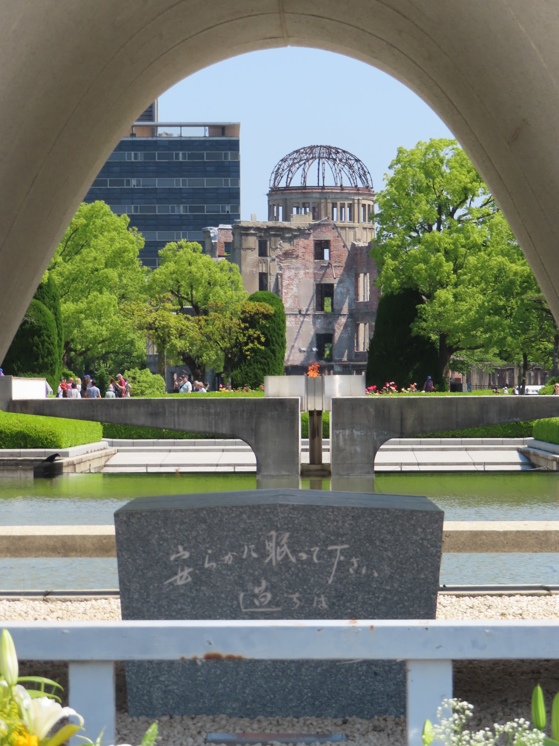 Dans ce qu’il conviendrait presque d’appeler le pèlerinage atomique, le premier stop est pour le dôme, ce bâtiment quasiment situé juste sous le centre de l’explosion et qui fut un des rares à rester debout, en partie grâce à sa structure en béton, pas si fréquente dans la ville à l’époque. Après beaucoup de discussions, il fut décidé de la garder tel quel, comme une sorte de mémorial. Le vrai mémorial lui-même est d’ailleurs placé non loin, pile dans son axe. Une flamme y a été allumée qui ne sera éteinte que lorsque le monde sera définitivement débarrassé de toute arme atomique (il va falloir prévoir pas mal de combustible alors…)