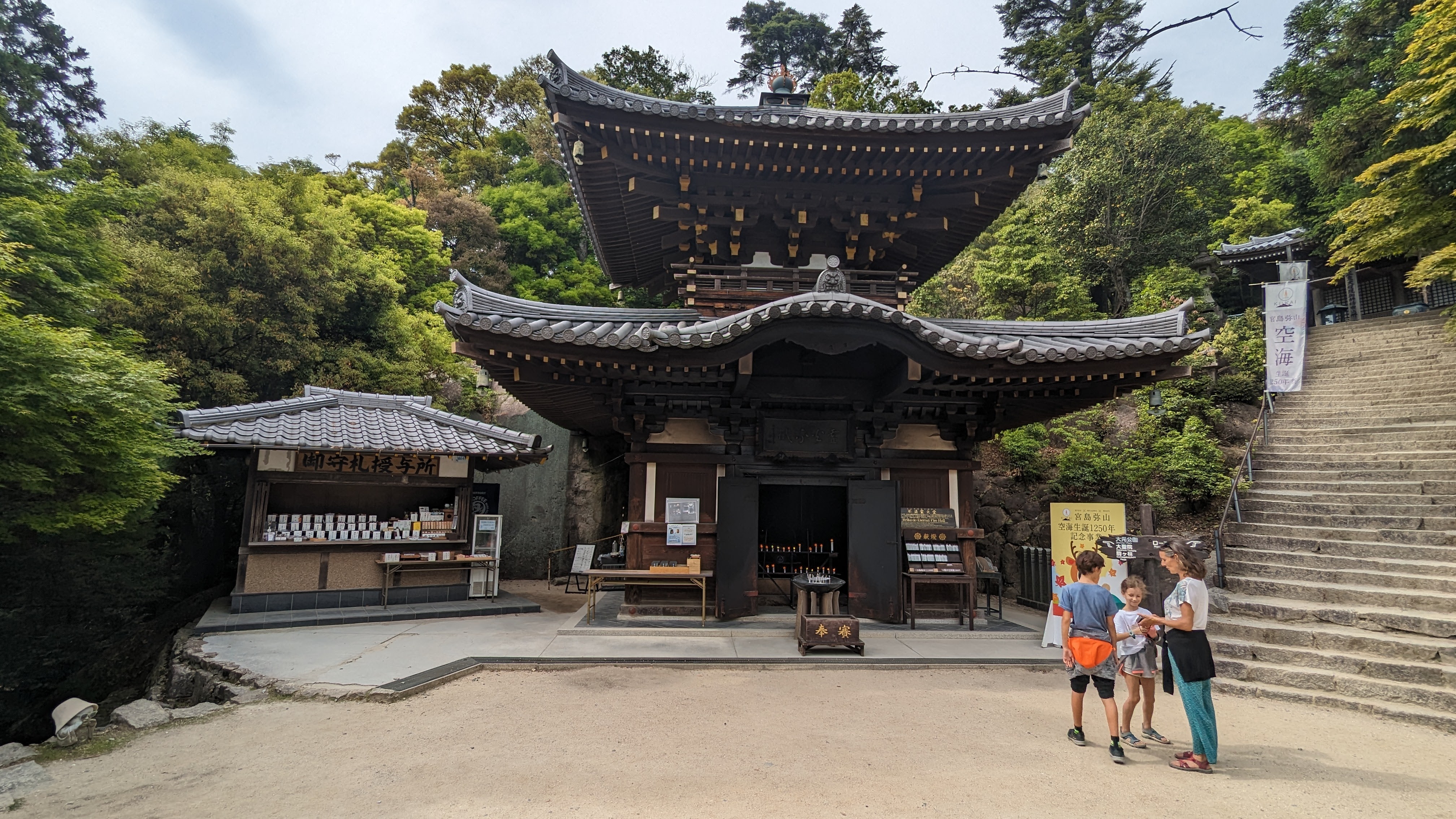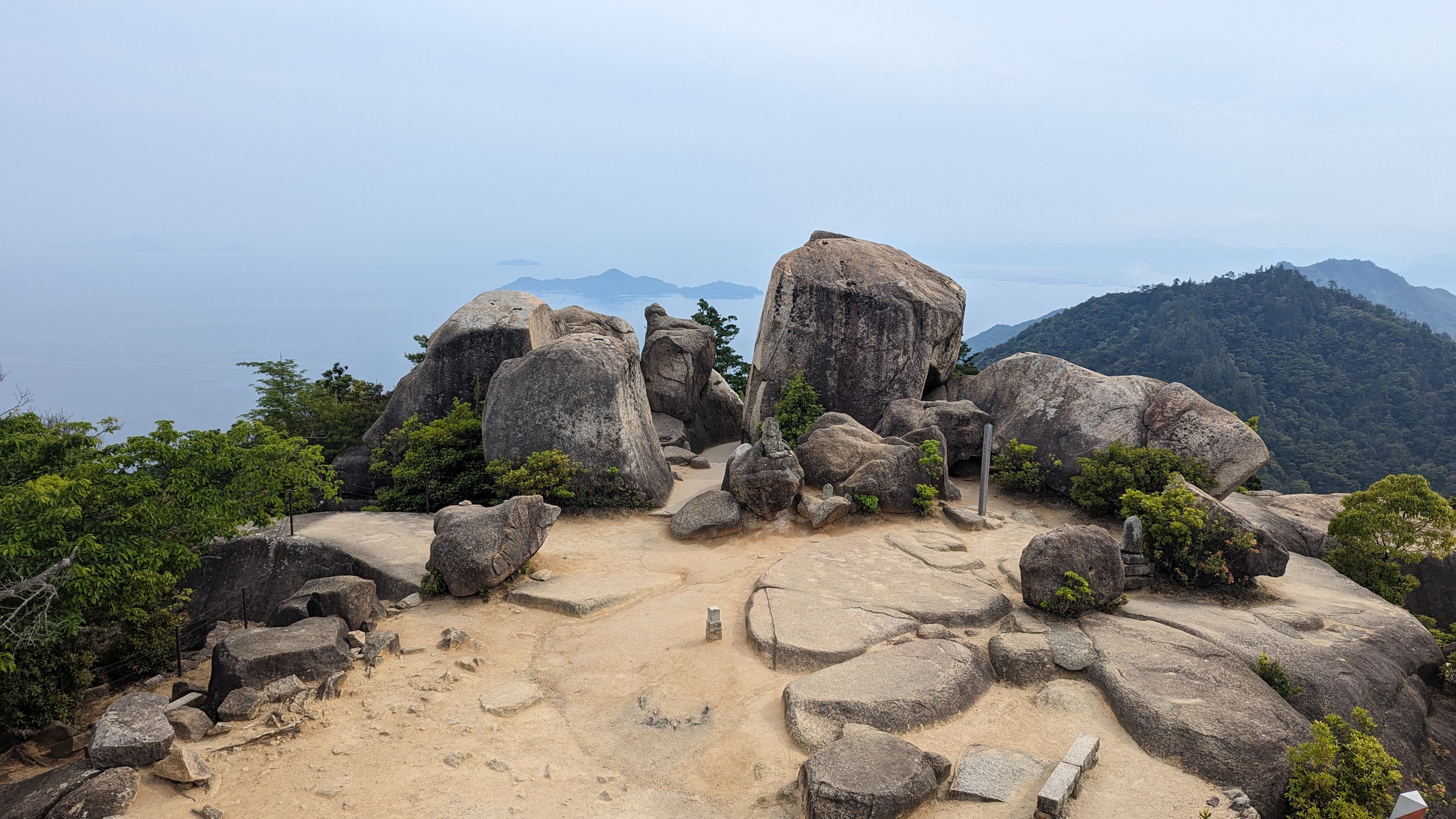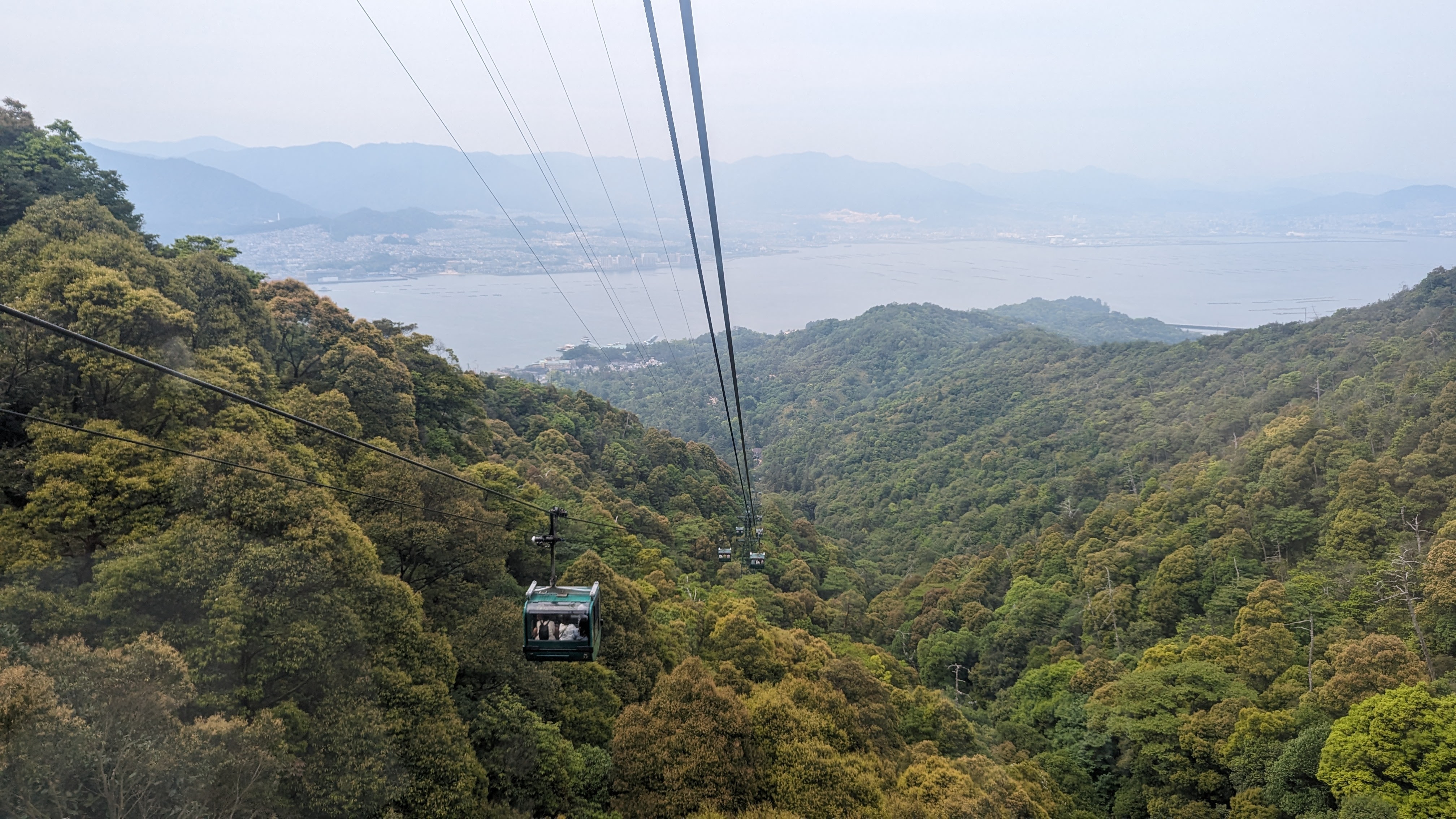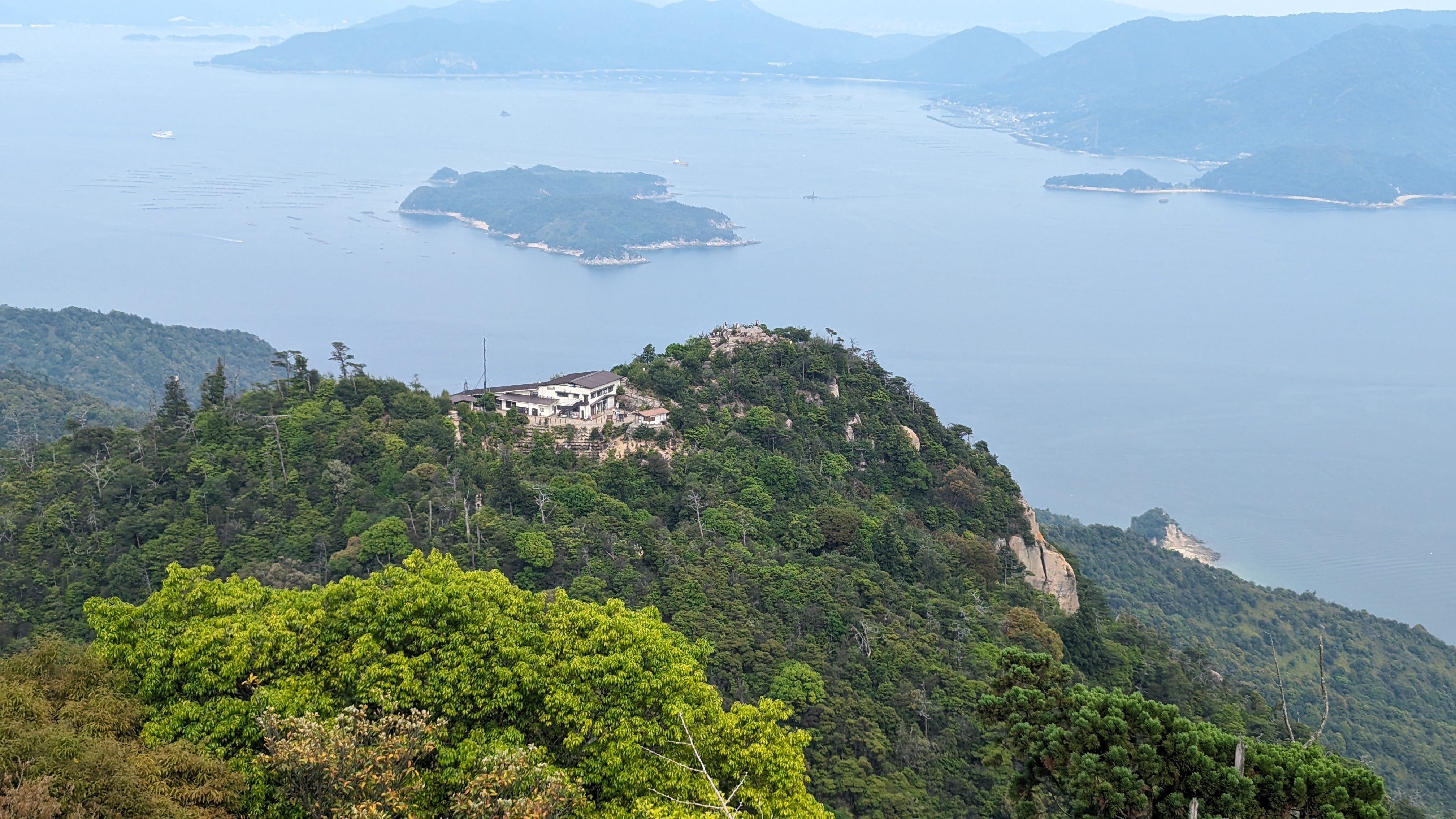 Par ailleurs, l’île est très montagneuse, culminant à plus de 500m sur une surface très faible. De plus, les flancs à pics des montagnes sont recouverts d’une forêt primaire quasi impénétrable, digne des plus beaux animés de Miyazaki. On n’a pas fait les malins, on est monté en téléphérique (mais redescendus à pied). Du sommet, malgré le temps brumeux, on avait une vue formidable sur la mer intérieur de Seto, celle qui relie entre elles toutes les îles japonaises, mer elle-même parsemée d’une myriade de petites îles. Sur le chemin, comme partout au Japon, une myriade de petits sanctuaires plus pittoresques les uns que les autres.