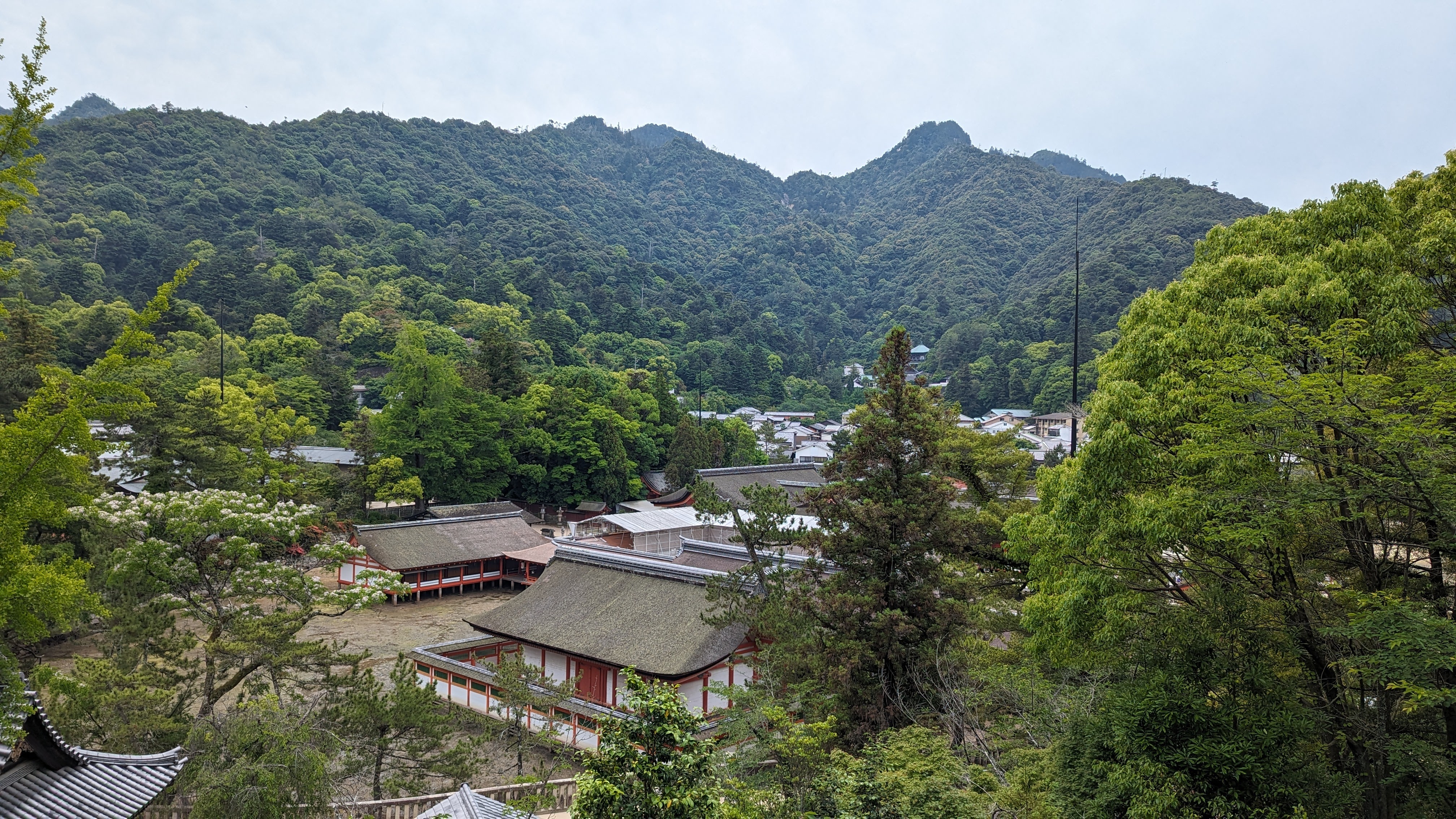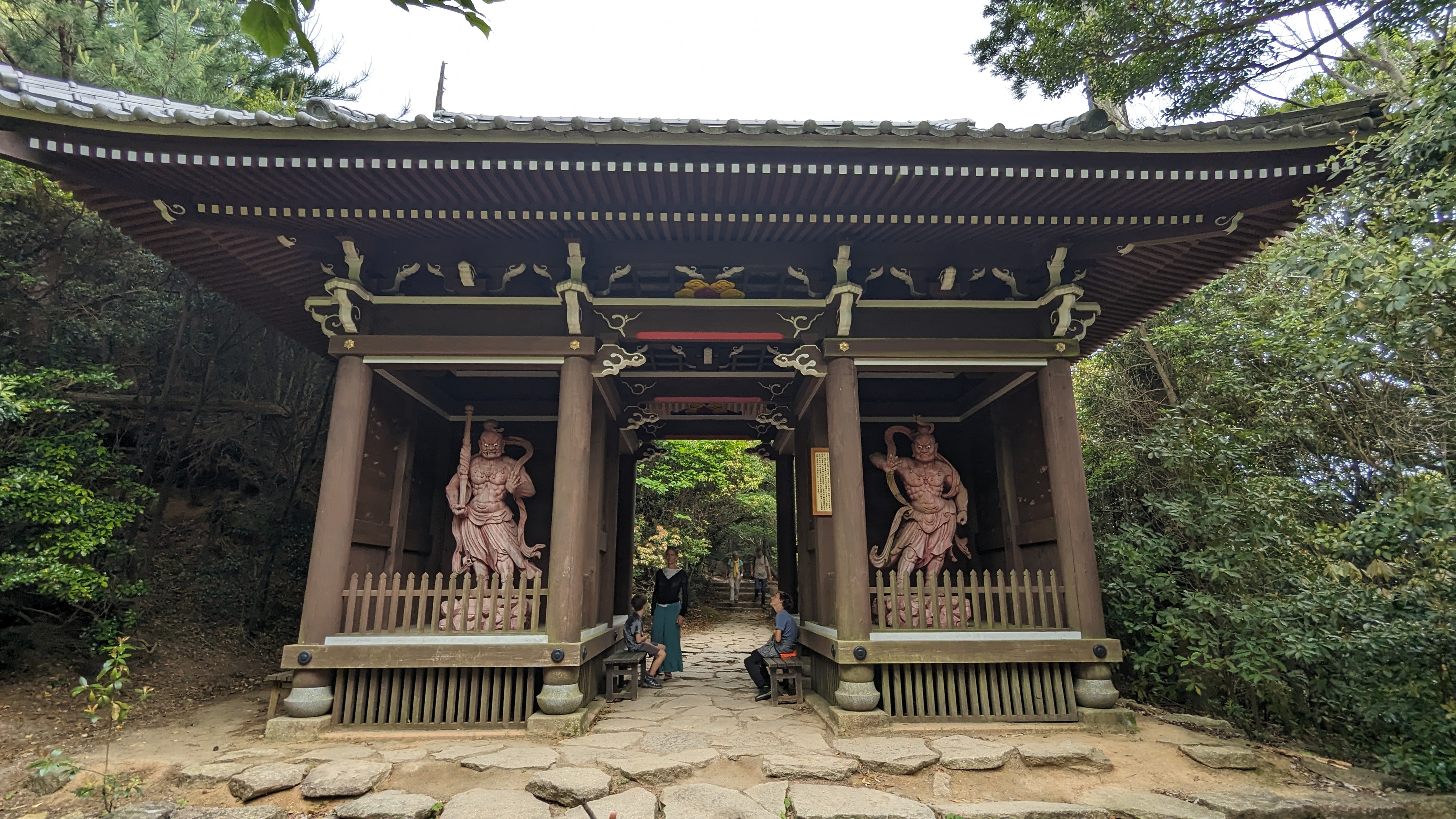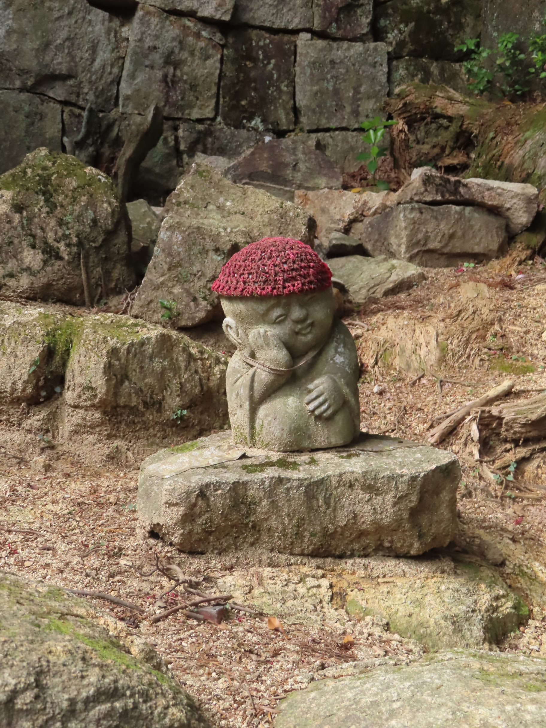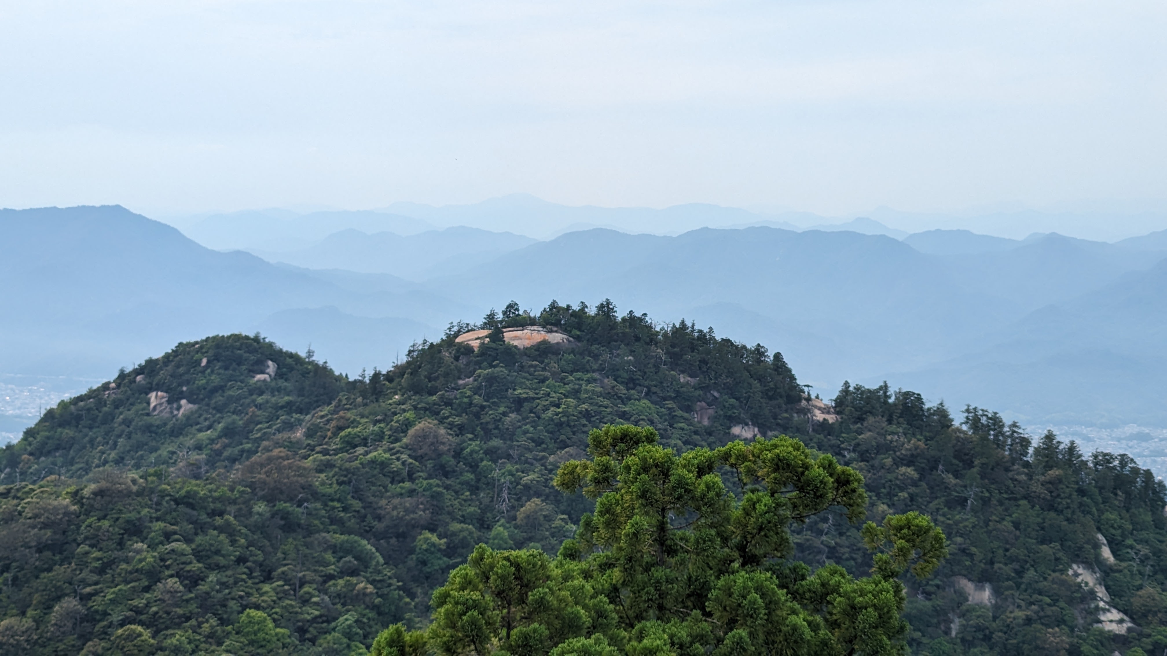 Par ailleurs, l’île est très montagneuse, culminant à plus de 500m sur une surface très faible. De plus, les flancs à pics des montagnes sont recouverts d’une forêt primaire quasi impénétrable, digne des plus beaux animés de Miyazaki. On n’a pas fait les malins, on est monté en téléphérique (mais redescendus à pied). Du sommet, malgré le temps brumeux, on avait une vue formidable sur la mer intérieur de Seto, celle qui relie entre elles toutes les îles japonaises, mer elle-même parsemée d’une myriade de petites îles. Sur le chemin, comme partout au Japon, une myriade de petits sanctuaires plus pittoresques les uns que les autres.