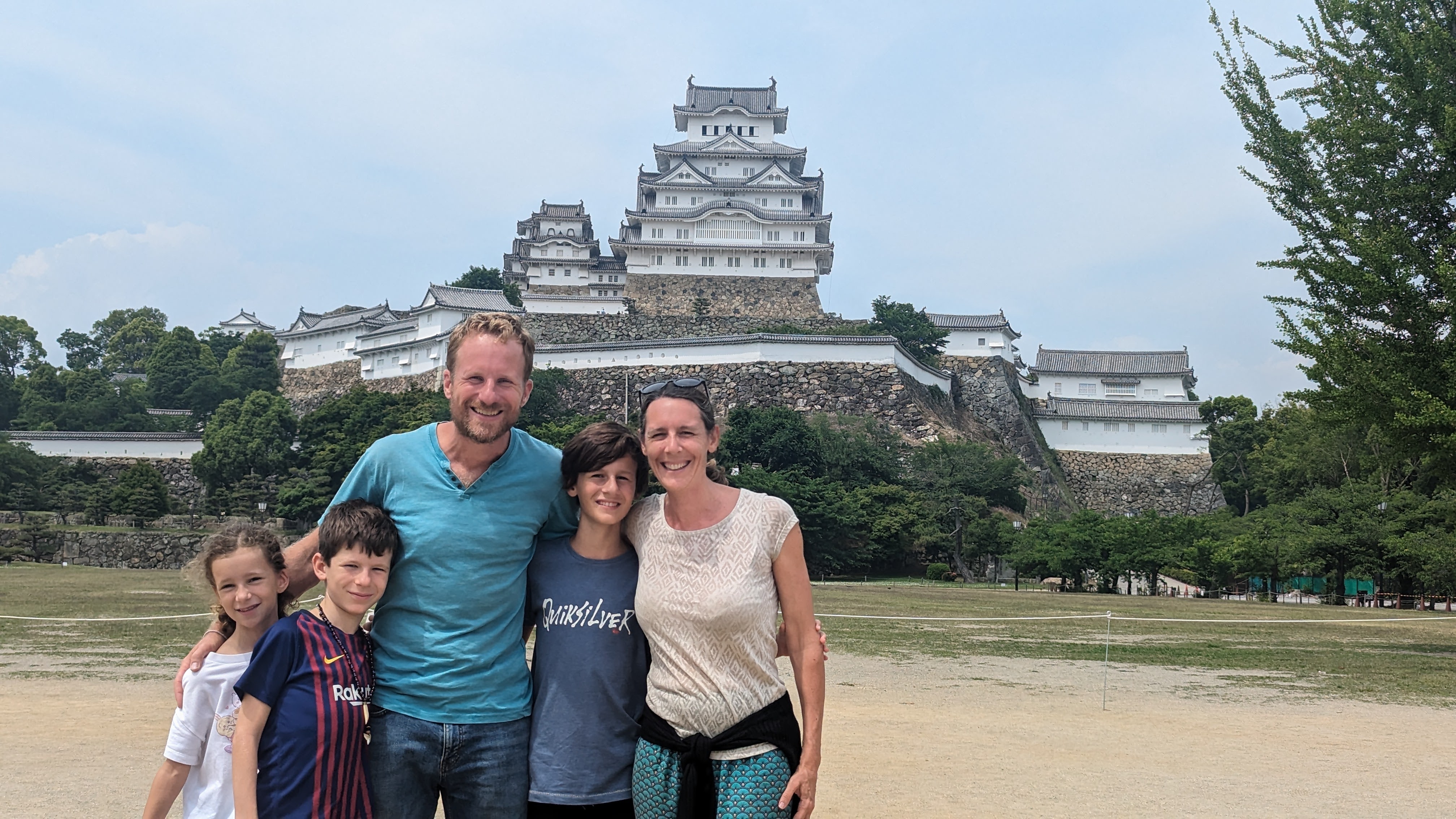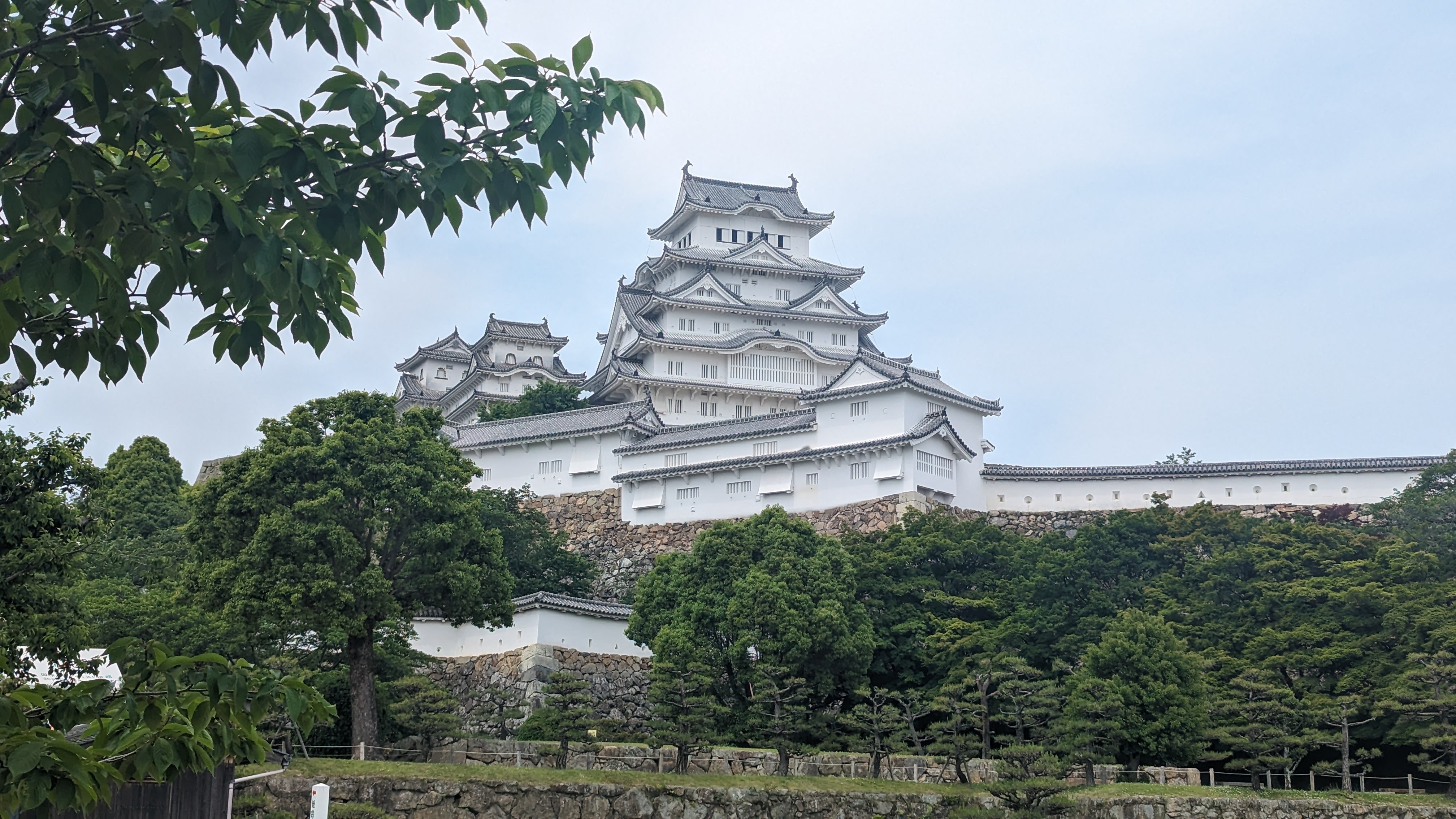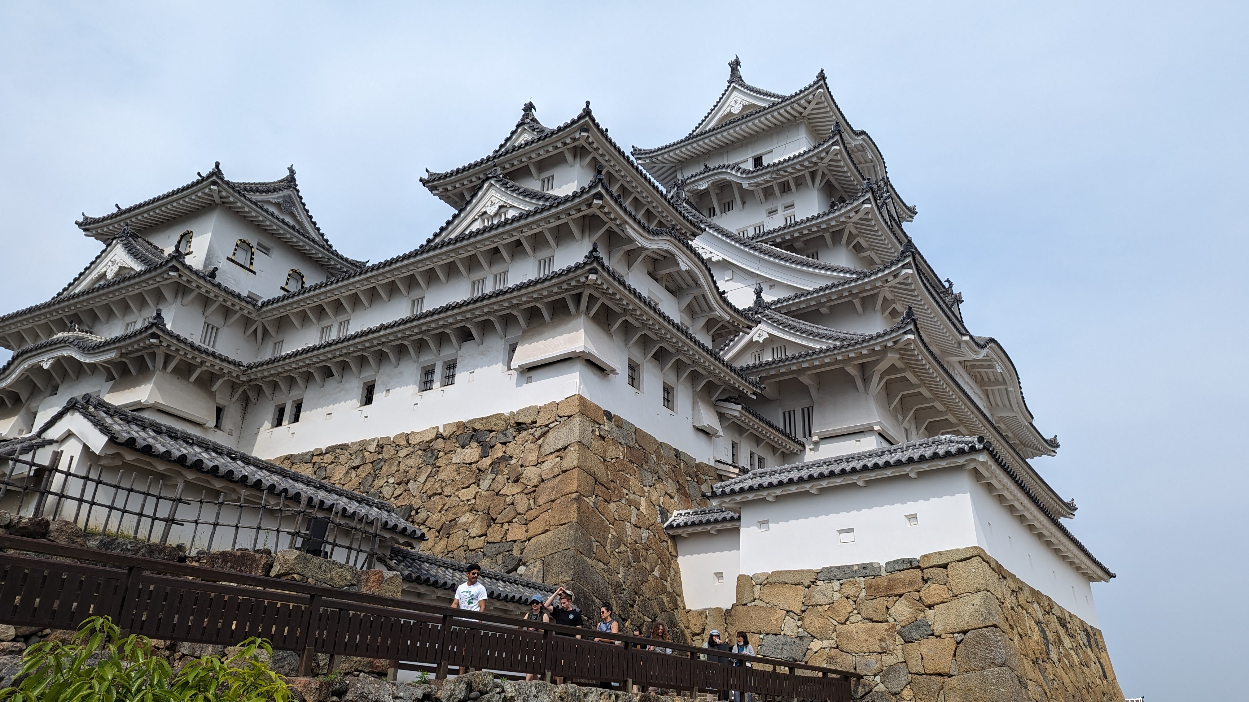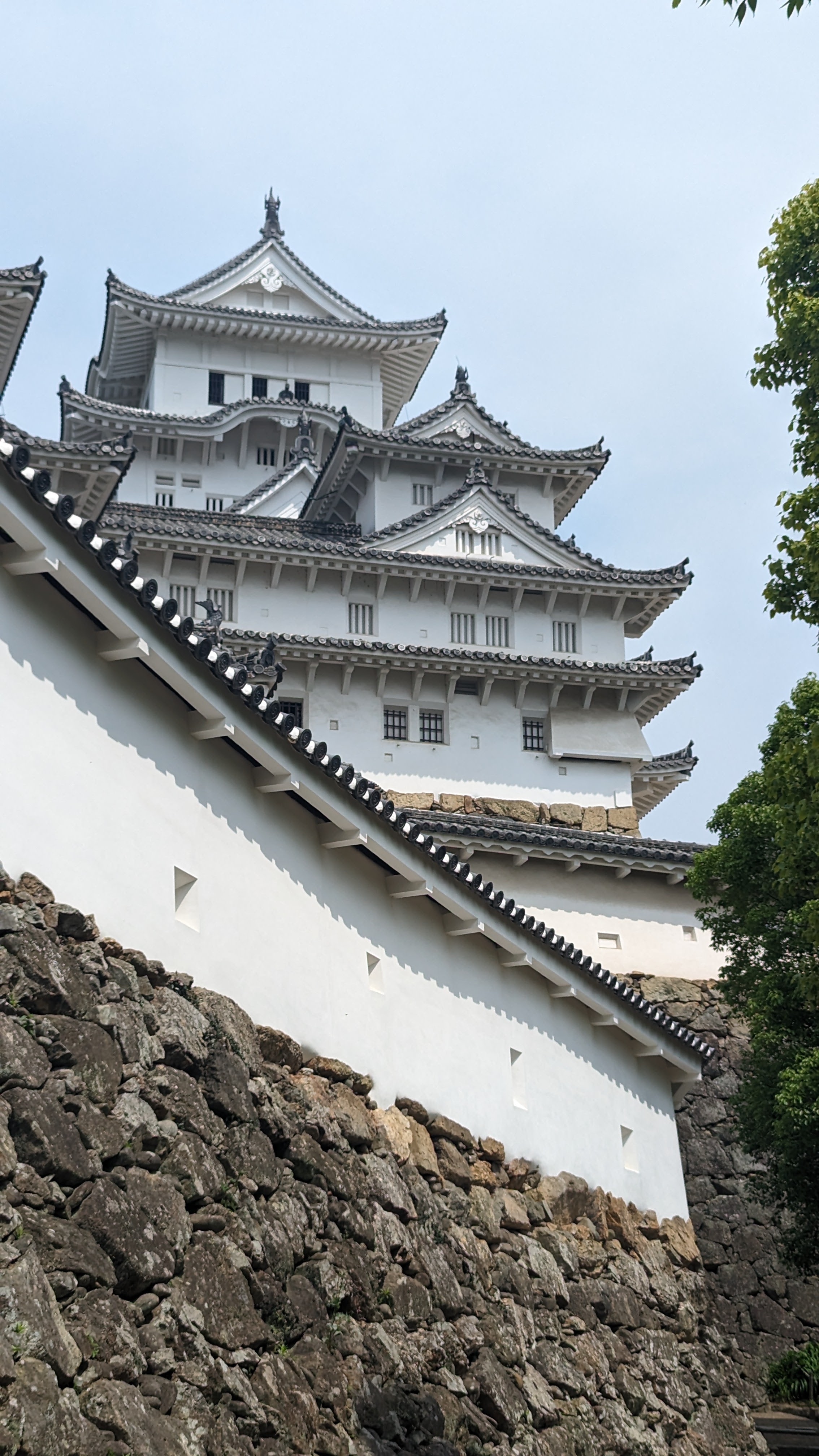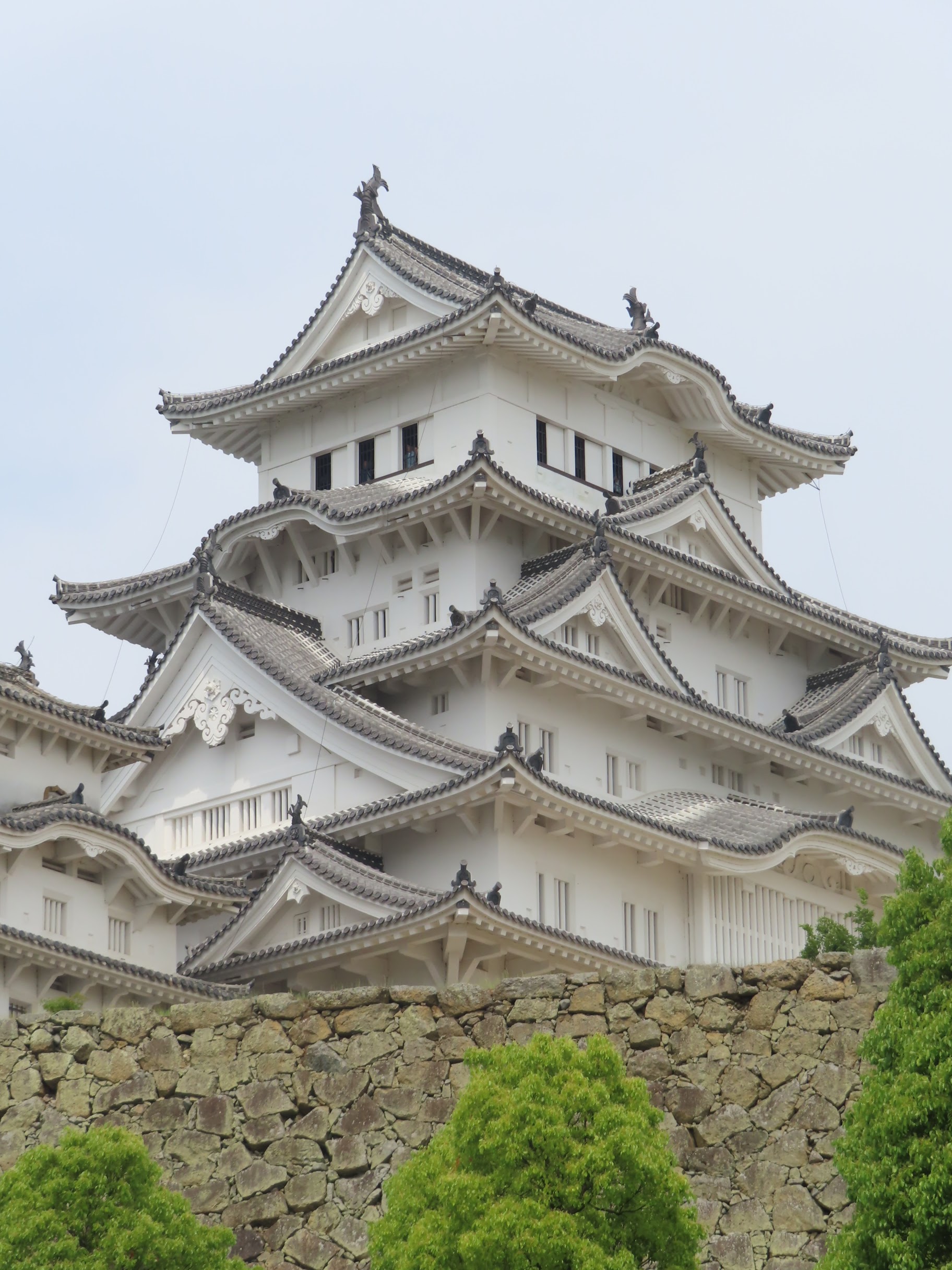Après Hiroshima, toujours plus loin vers le nord-est et sur la route de Tokyo, le château de Himeji, au surnom éminent poétique de « château du héron blanc » (on comprend facilement pourquoi au vu de sa couleur et de ses toitures élancées telles des ailes) est un peu la « star » des châteaux japonais. Autant celui de Kumamoto nous avait énormément plu, malgré (et même un peu grâce aux…) les travaux de reconstruction toujours en cours, autant celui de Himeji peut se targuer d’être un des rares qui soit « totalement d’époque ». La région a été autant épargnée par les tremblement de terre et les incendies que par les guerres du temps du shogun, et même les bombardements de la seconde guerre mondiale. C’est une chance et on en profite aujourd’hui. La structure entièrement en bois est d’époque et c’est sacrément impressionnant quand on se rend compte de la hauteur du donjon. Plus de 40m qui reposent sur deux piliers en bois bien épais (des arbres en fait, tout simplement).