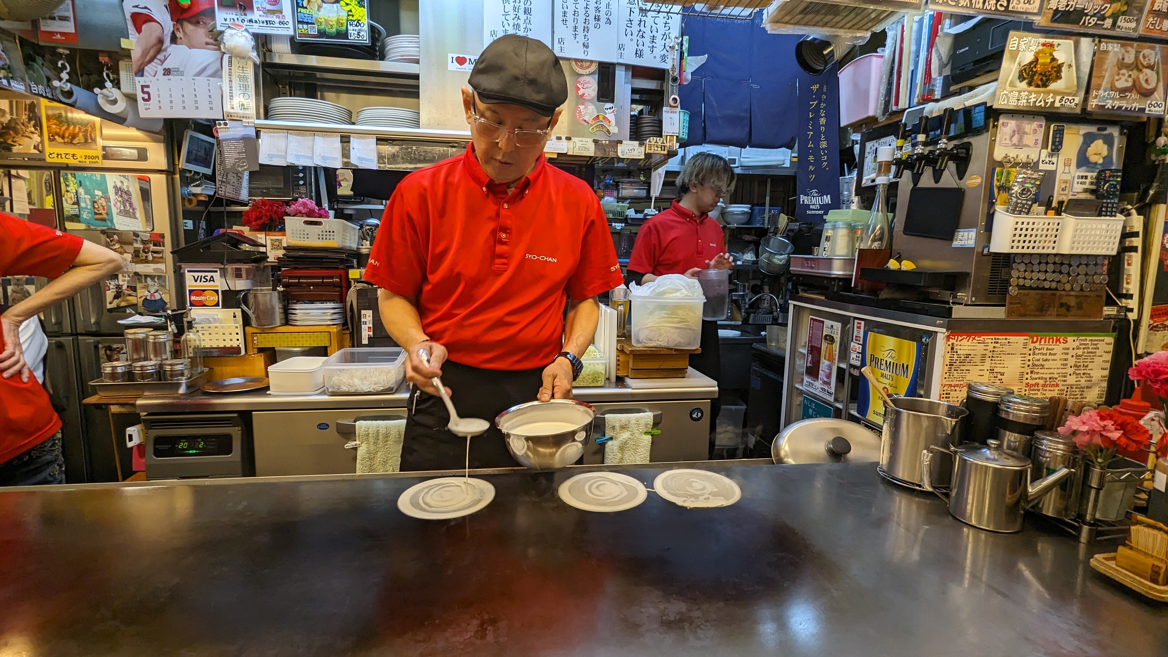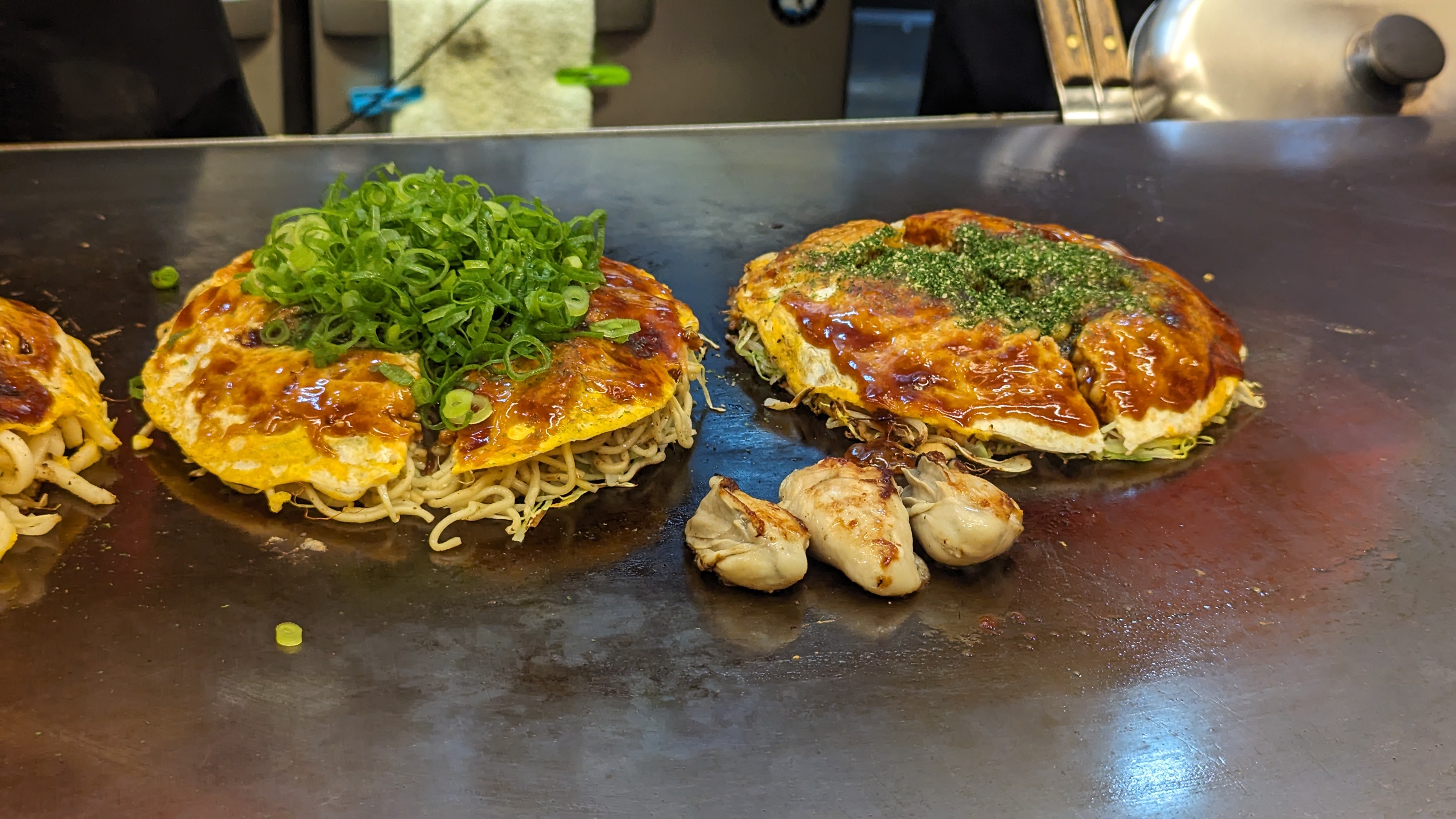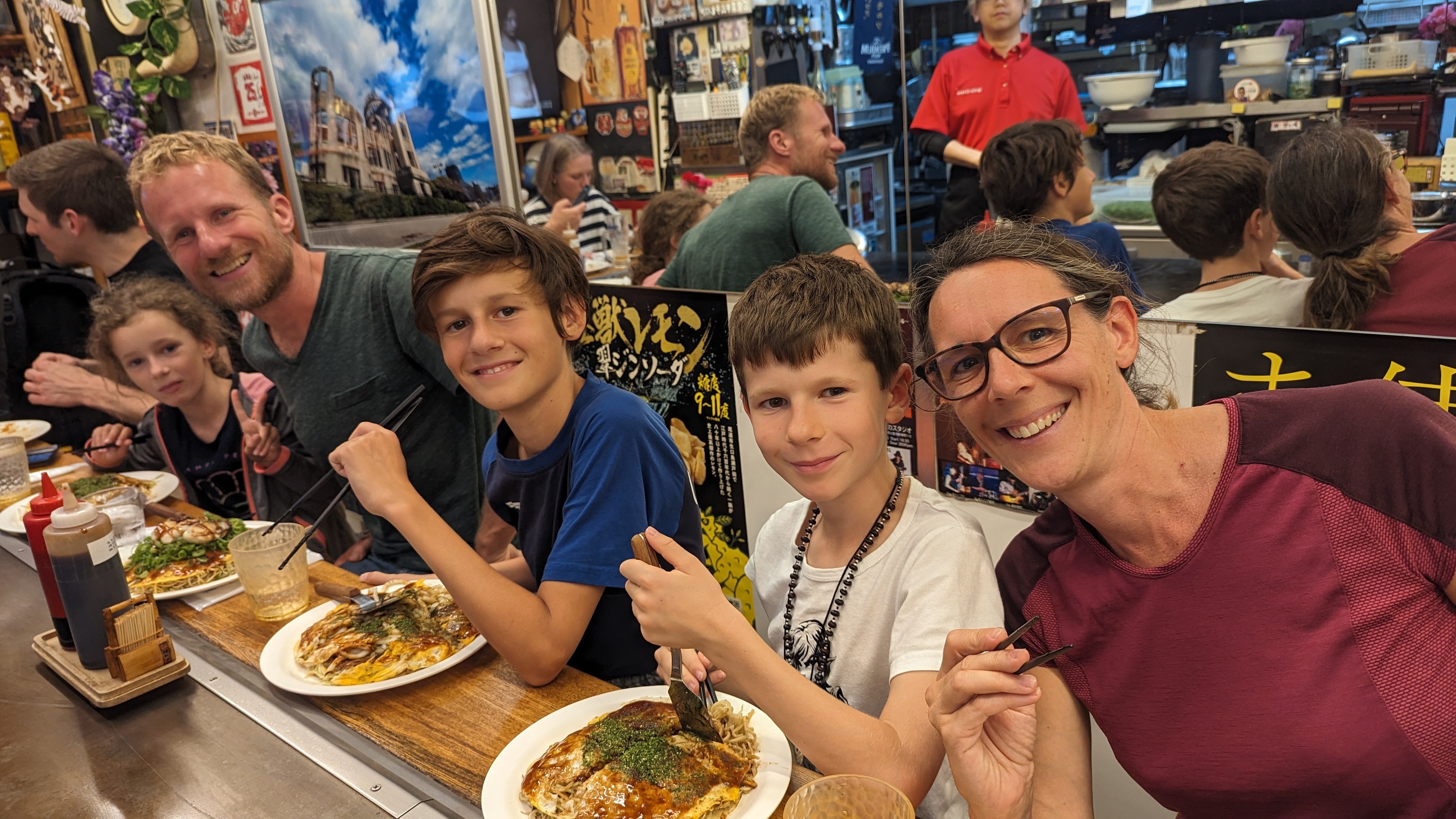 Mais Hiroshima est célèbre dans tout le Japon pour une spécialité culinaire : les okonomiyaki, un mélange improbable entre une omelette et une galette, fourré au chou, aux nouilles et à plein d’autres trucs. Alors bien sûr, on peut en trouver ailleurs dans le pays mais celles d’Hiroshima ont une recette unique, spécifique à la ville. Et aller au restaurant pour voir le cuisinier la préparer sous nos yeux, c’était un plaisir supplémentaire à celui de la dégustation (et on vous garantit qu’on n’a pas faim après).