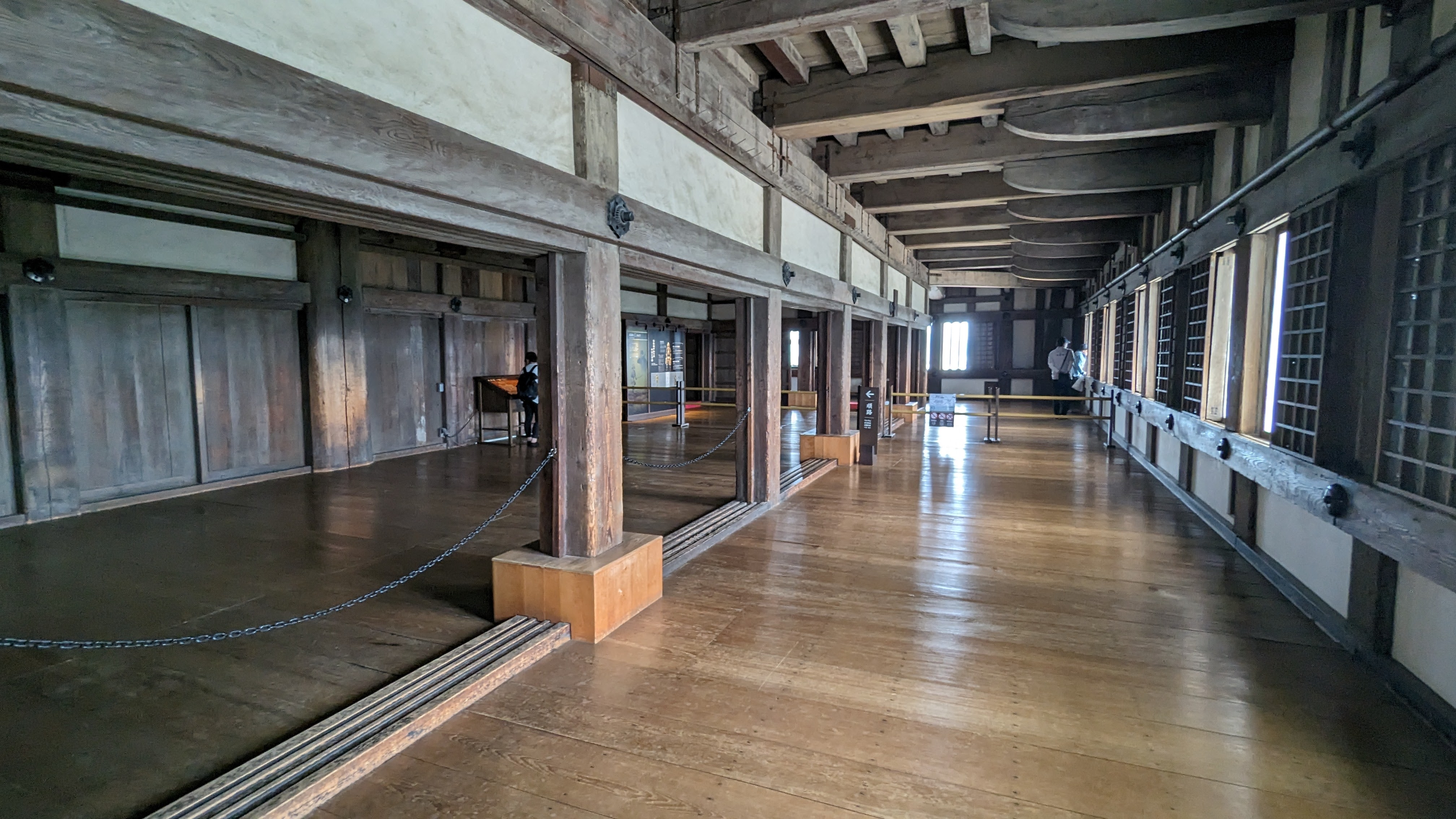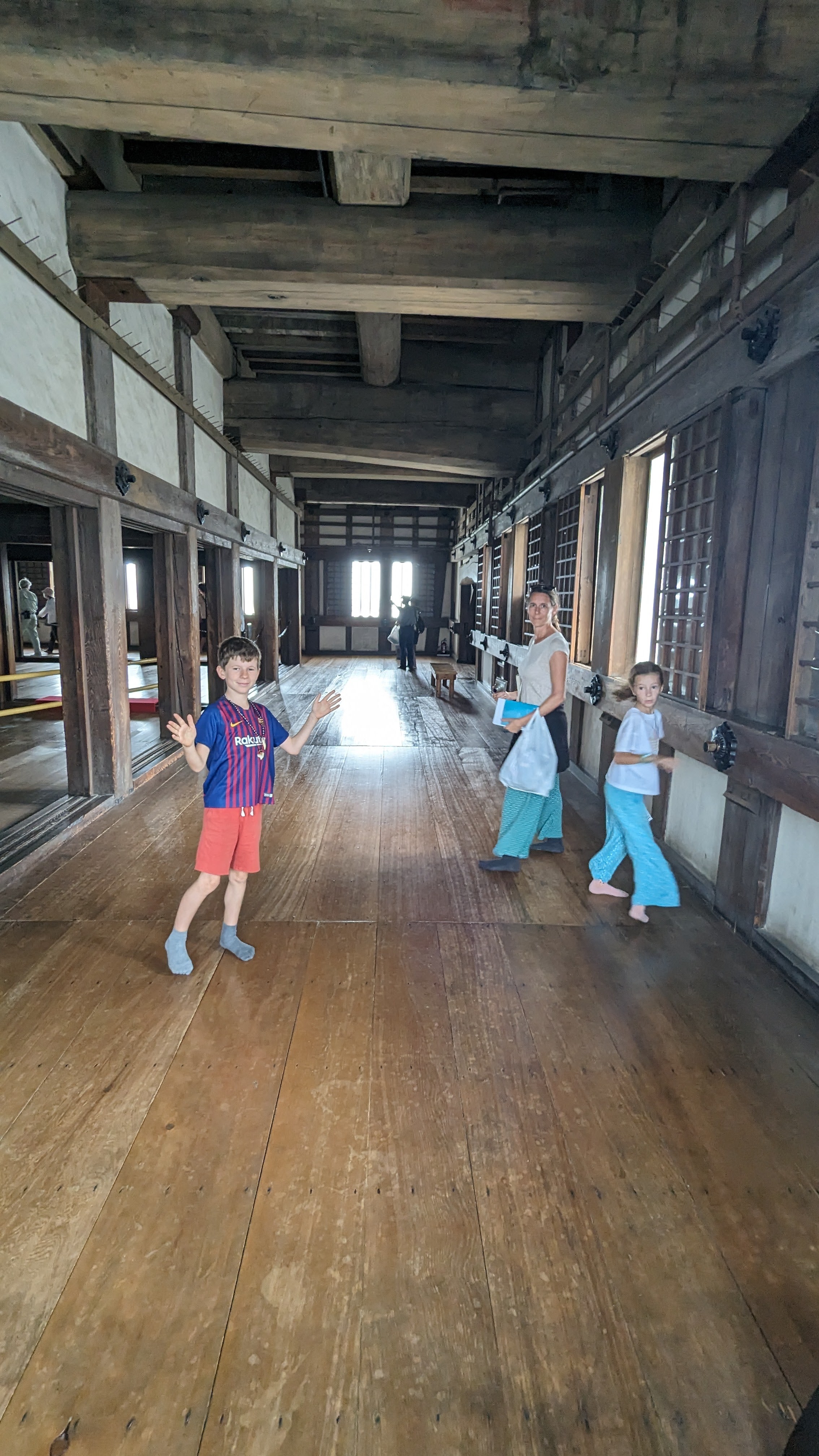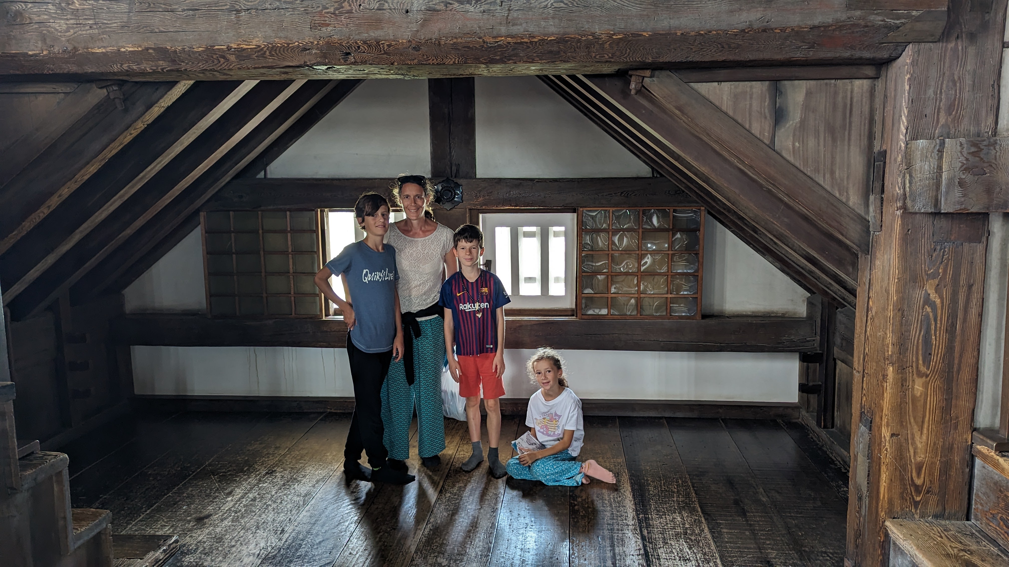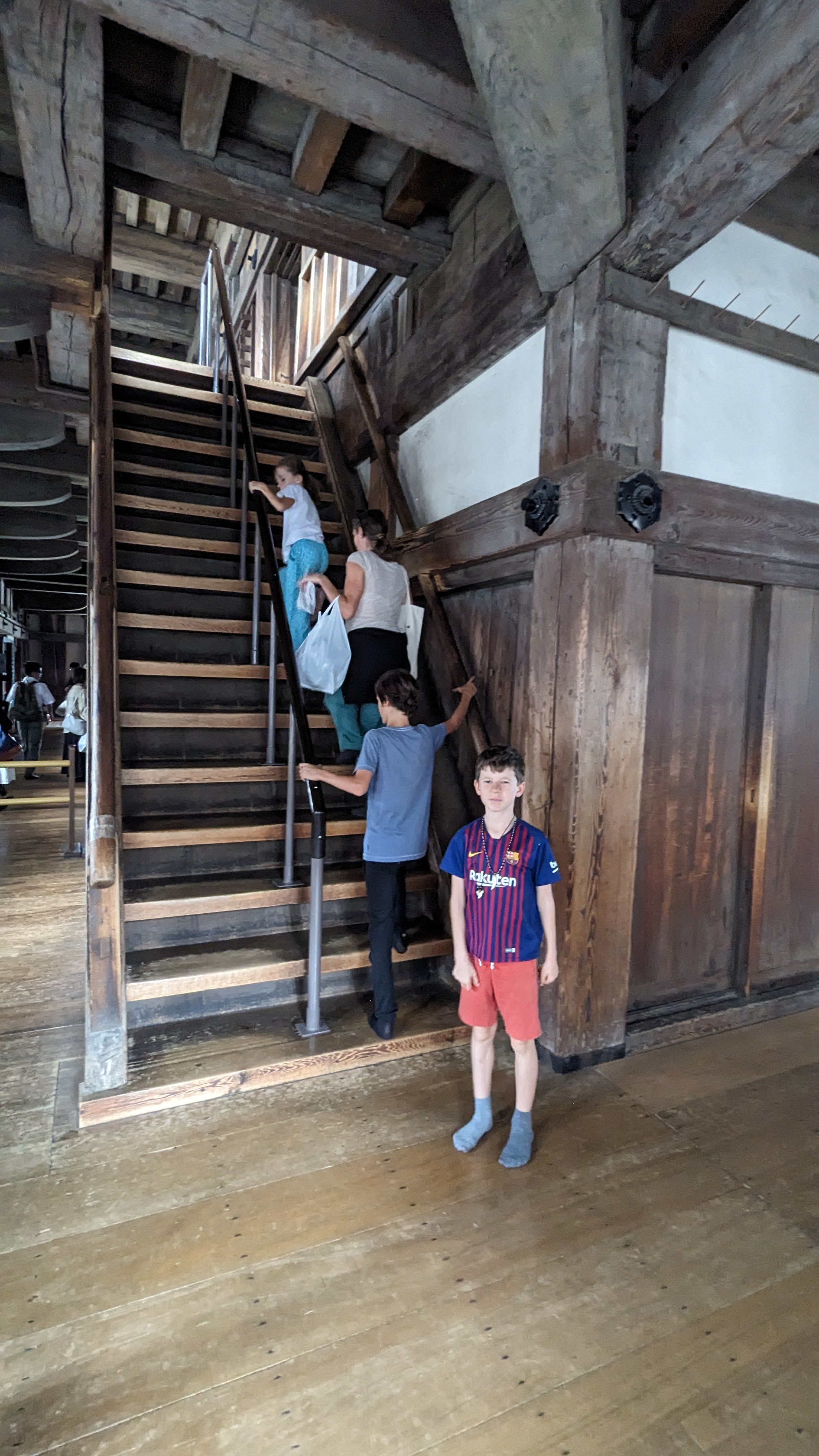 A l’intérieur, obligation d’enlever ses chaussures pour ne pas abîmer les parquets. On glisse sur les lattes parfaitement lustrées en admirant le travail de la charpente. A tous les étages, on a l’impression dune forêt dressée en un immense jeu de mécano. 6 étages à grimper par des escaliers bien raides, avec des meurtrières pour avoir une superbe vue sur la ville (on n’oublie pas qu’il s’agissait aussi d’un château destiné à se défendre en cas de siège, pas juste une belle demeure). Une visite qui nous a tous enchantés.