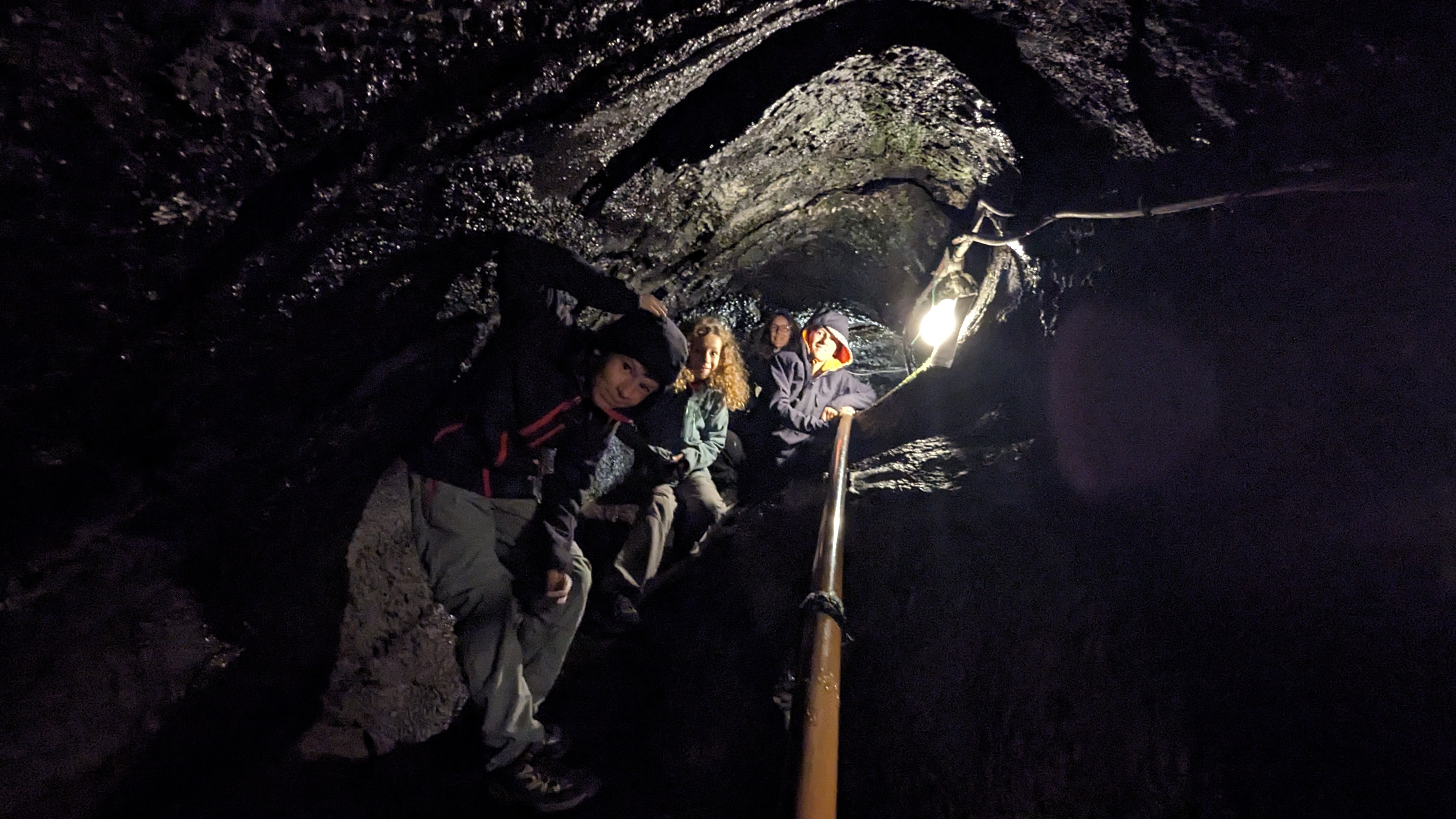Juste à côté, les différentes éruptions (la dernière a eu lieu il y a 300 ans) ont formé des tubes de lave. Le principe ? La lave coule, refroidit en surface au contact de l’air et durcit. Par contre la lave se trouvant sous la croûte extérieure reste chaude et fluide, contenue à couler, et quand l’éruption se termine il ne reste que la croûte originelle, croûte qui forme après coup les fameux tunnels de lave. Aujourd’hui, on peut parcourir ces tubes et faire un tout petit peu de spéléo (faut pas être claustro). Le fond des grottes ainsi formées est si frais qu’on y trouve des stalactites de glace !