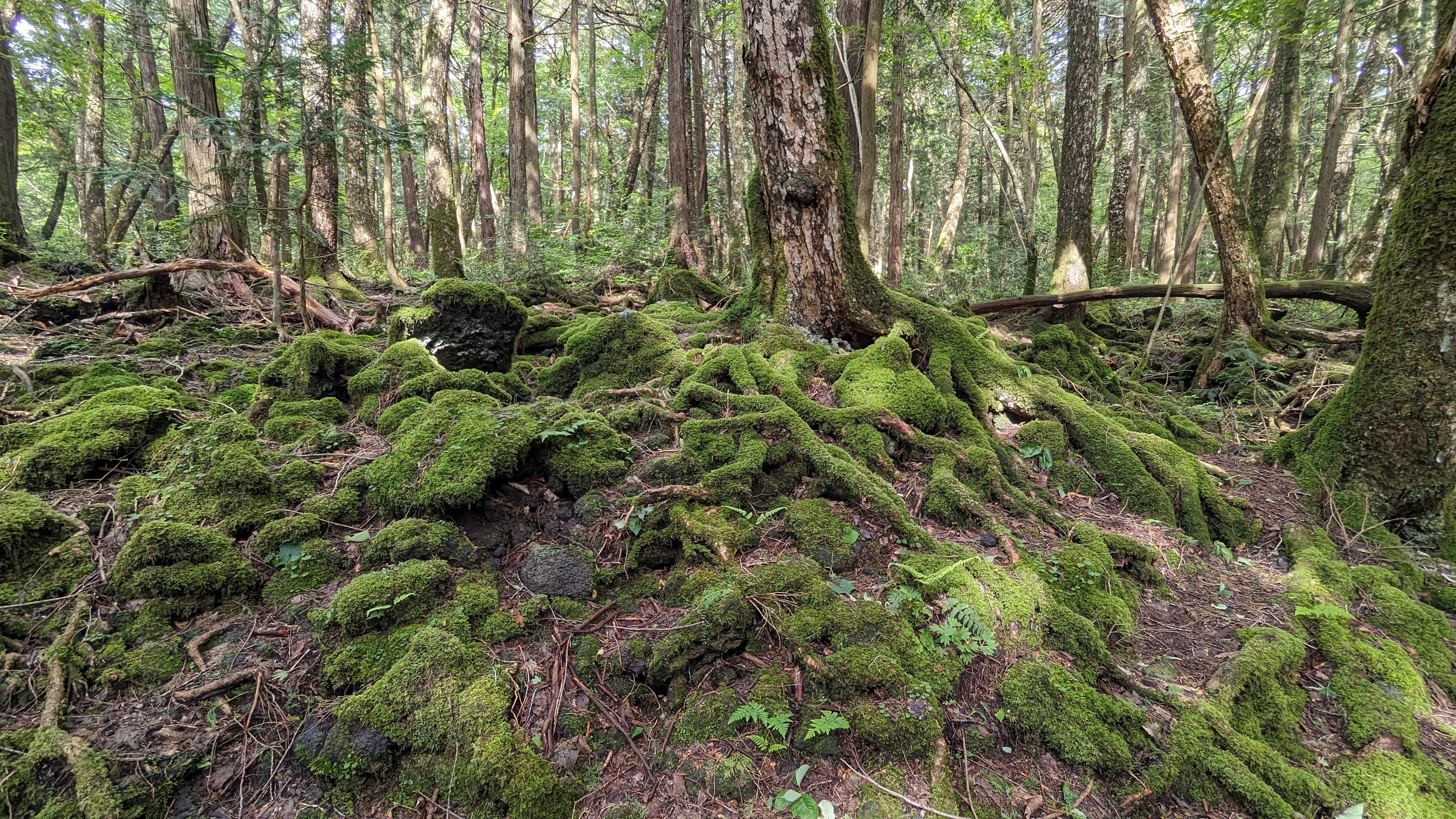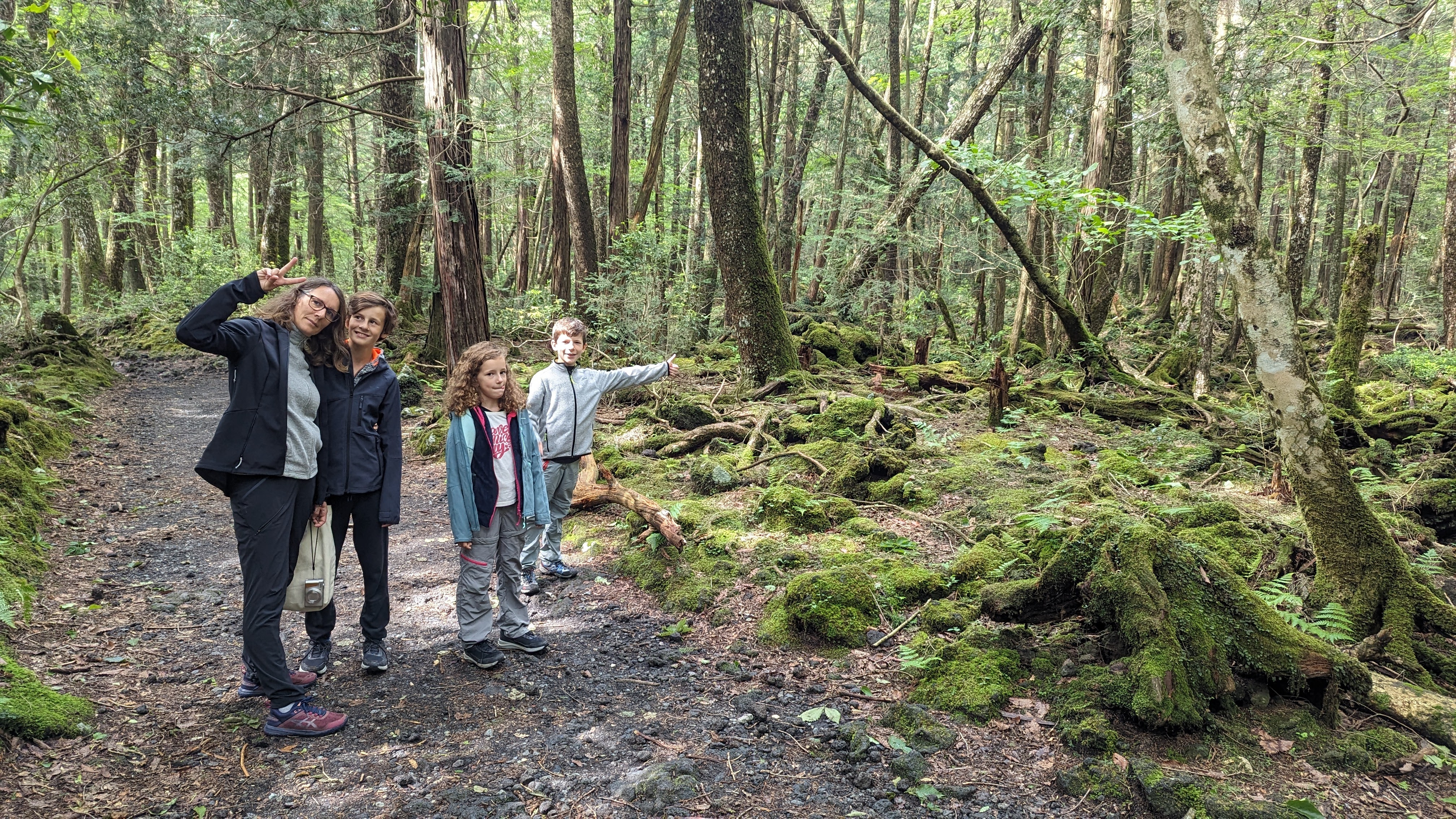 Le Fuji est aussi recouvert de forêts magnifiques, où les arbres poussent en rang serrés ne laissant que peu passer la lumière. Le sol y est un amas de pierres volcaniques supportant un incroyable enchevêtrement de racines, lui-même recouvert de mousse (mmmh de la mousse bien verte, serait-ce à dire que la région serait souvent arrosée ?)