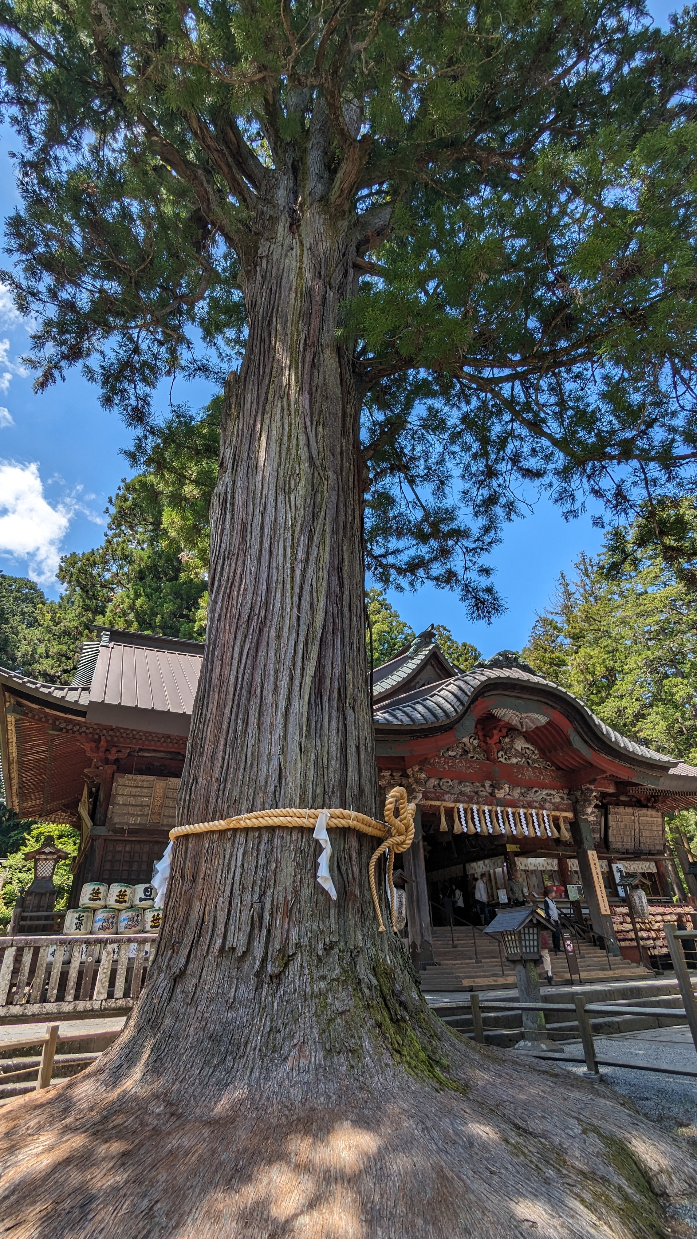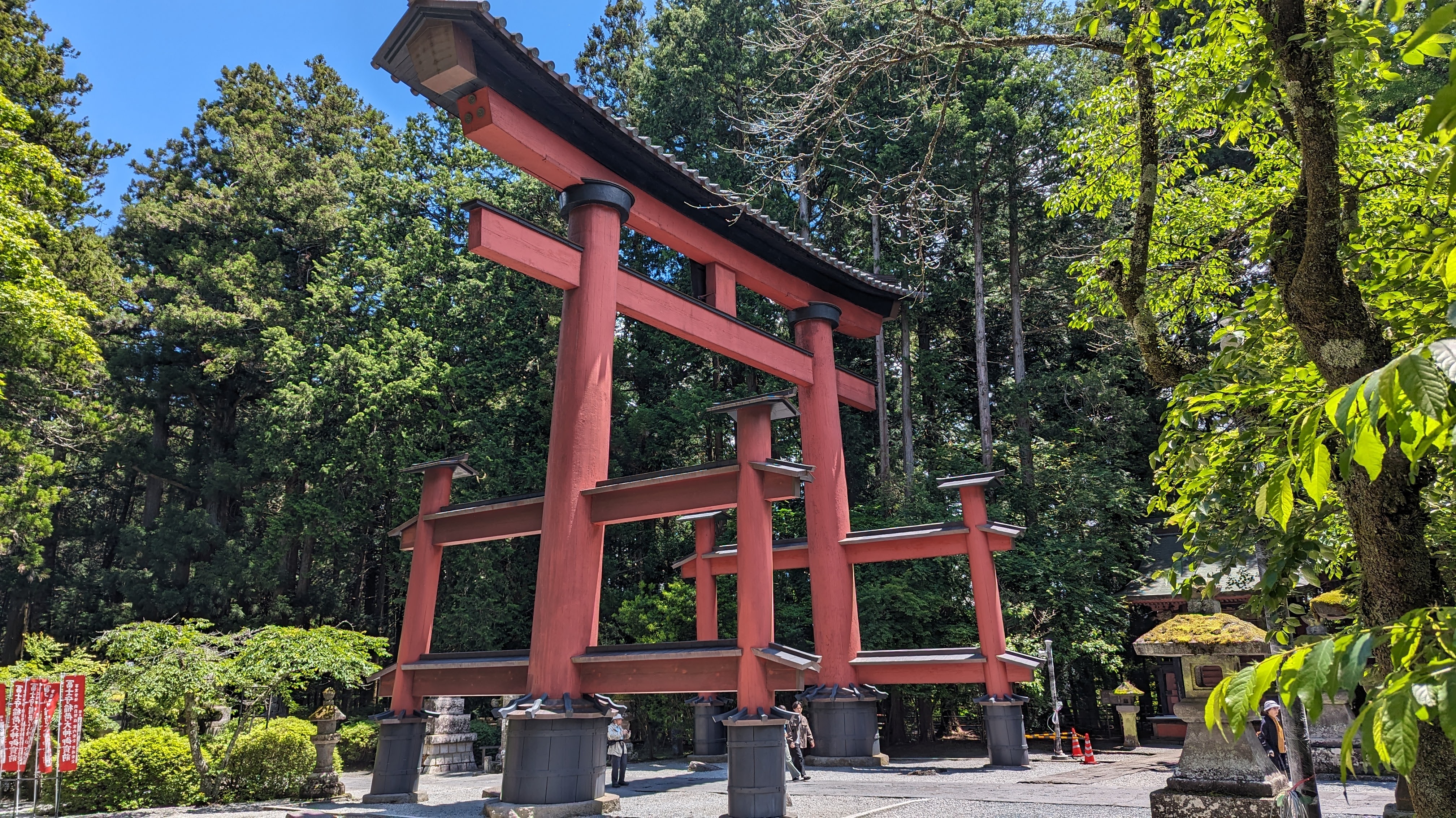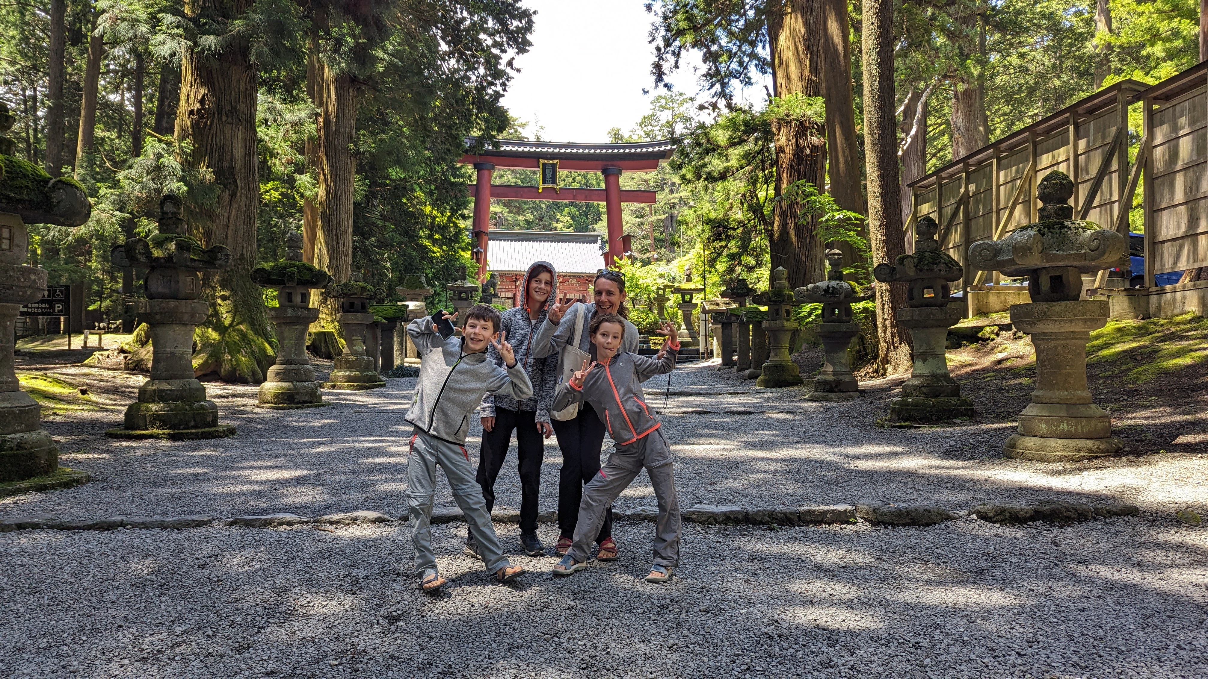 S’il y a bien un site que nous avons tous apprécié durant ces journées d’attente, c’est celui du sanctuaire Kitaguchi Hongu Fuji Sengen. Encore un sanctuaire direz-vous… Oui. Et pas spécialement plus richement décoré ni plus flamboyant que les autres. A peine possédait-il le record du plus grand torii en bois de tout le pays, mais il en faut d’autres pour nous impressionner désormais. Non ce qui a nous a tous charmés, c’est l’ambiance du lieu. Ce calme incroyable instauré par la présence d’arbres millénaires qui dominent le sanctuaire de la tête et des ramures.