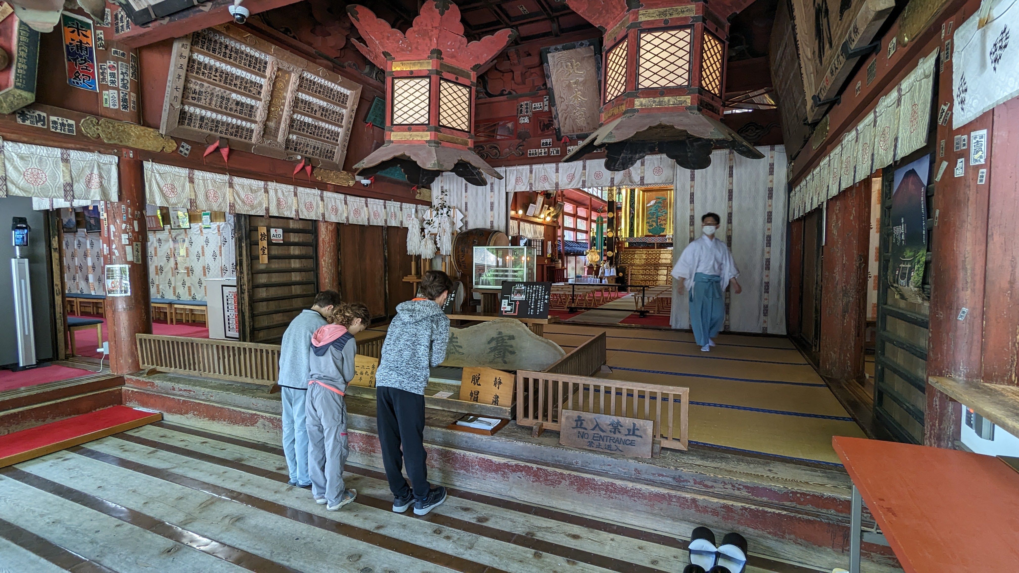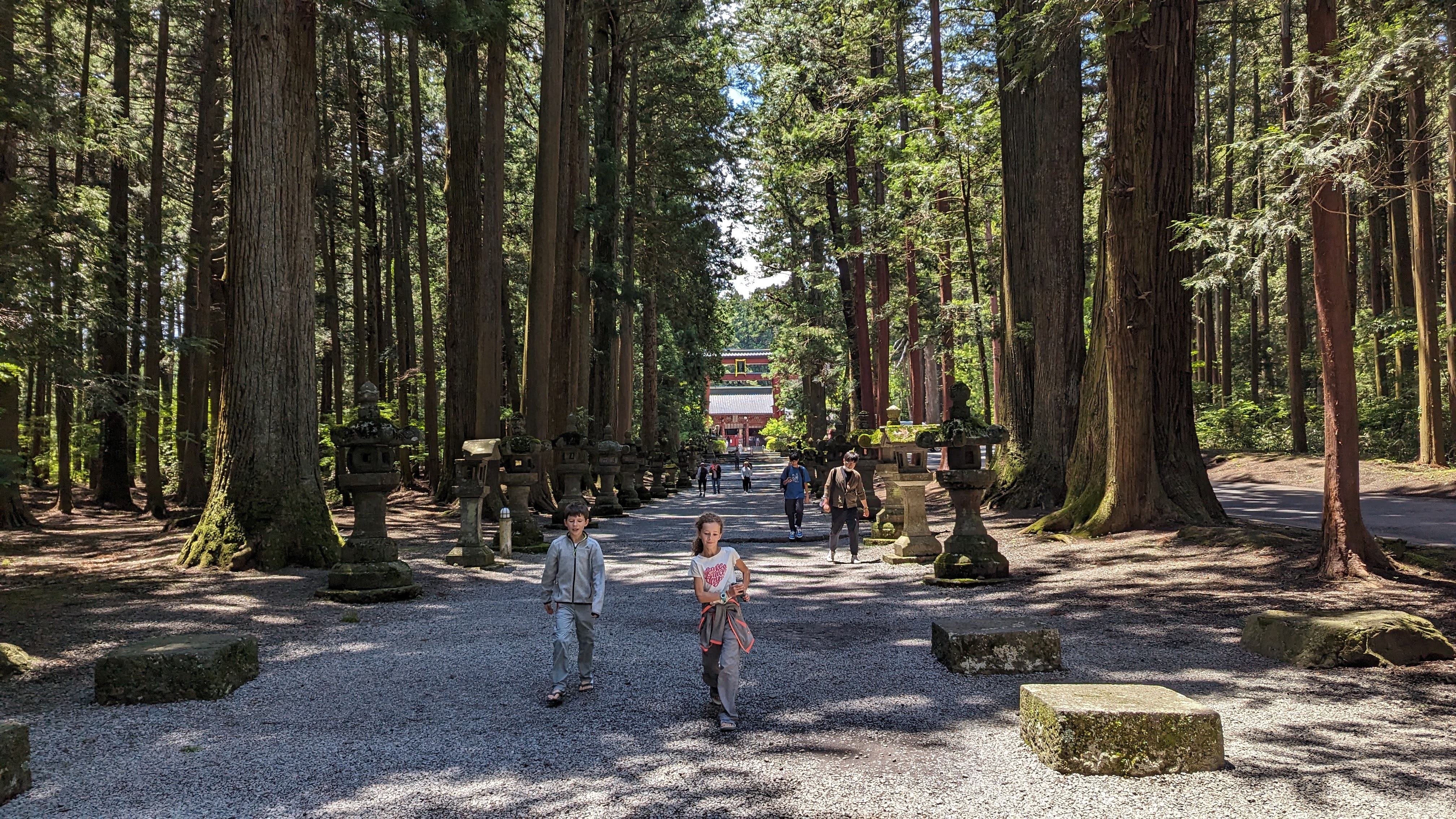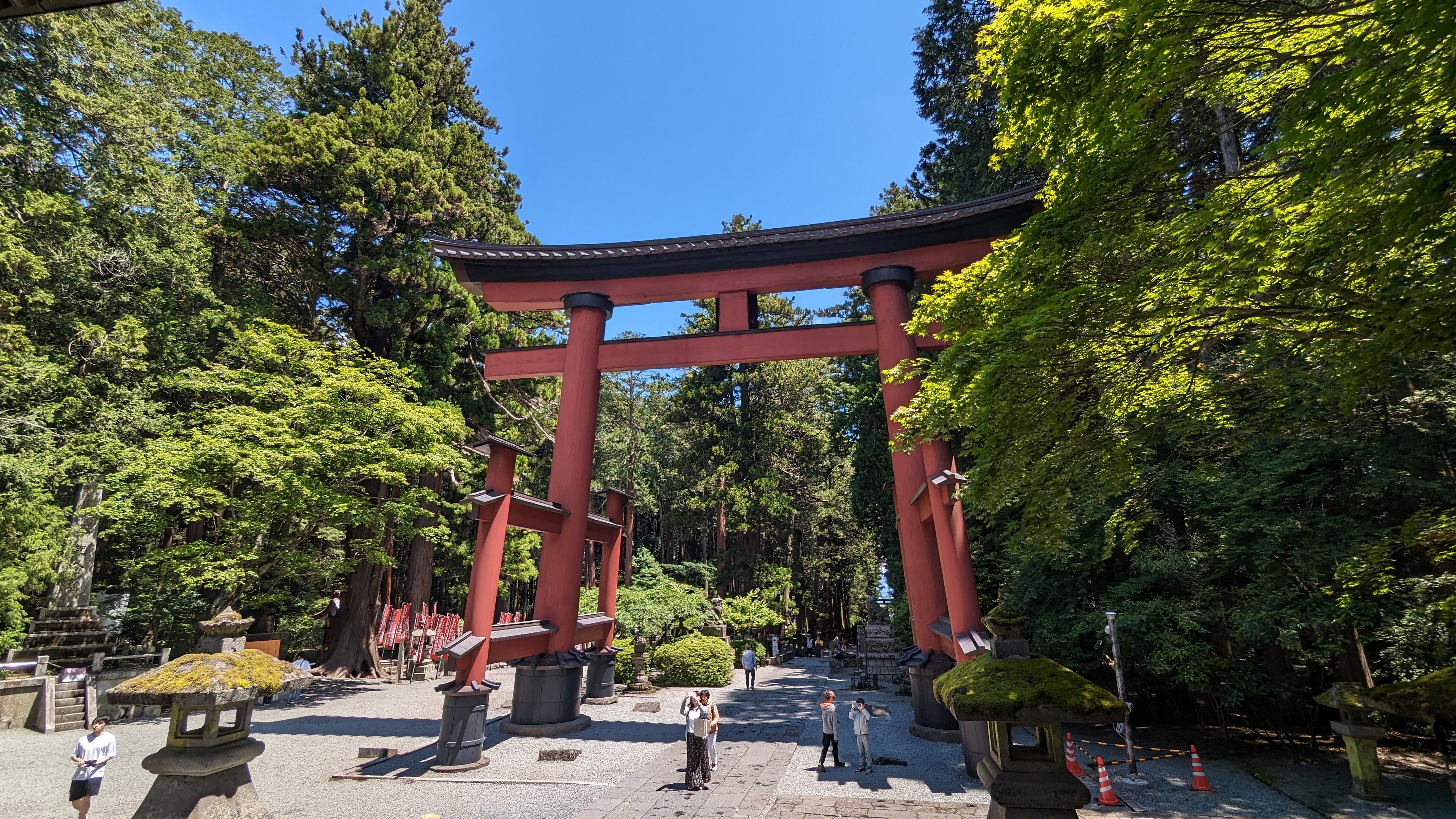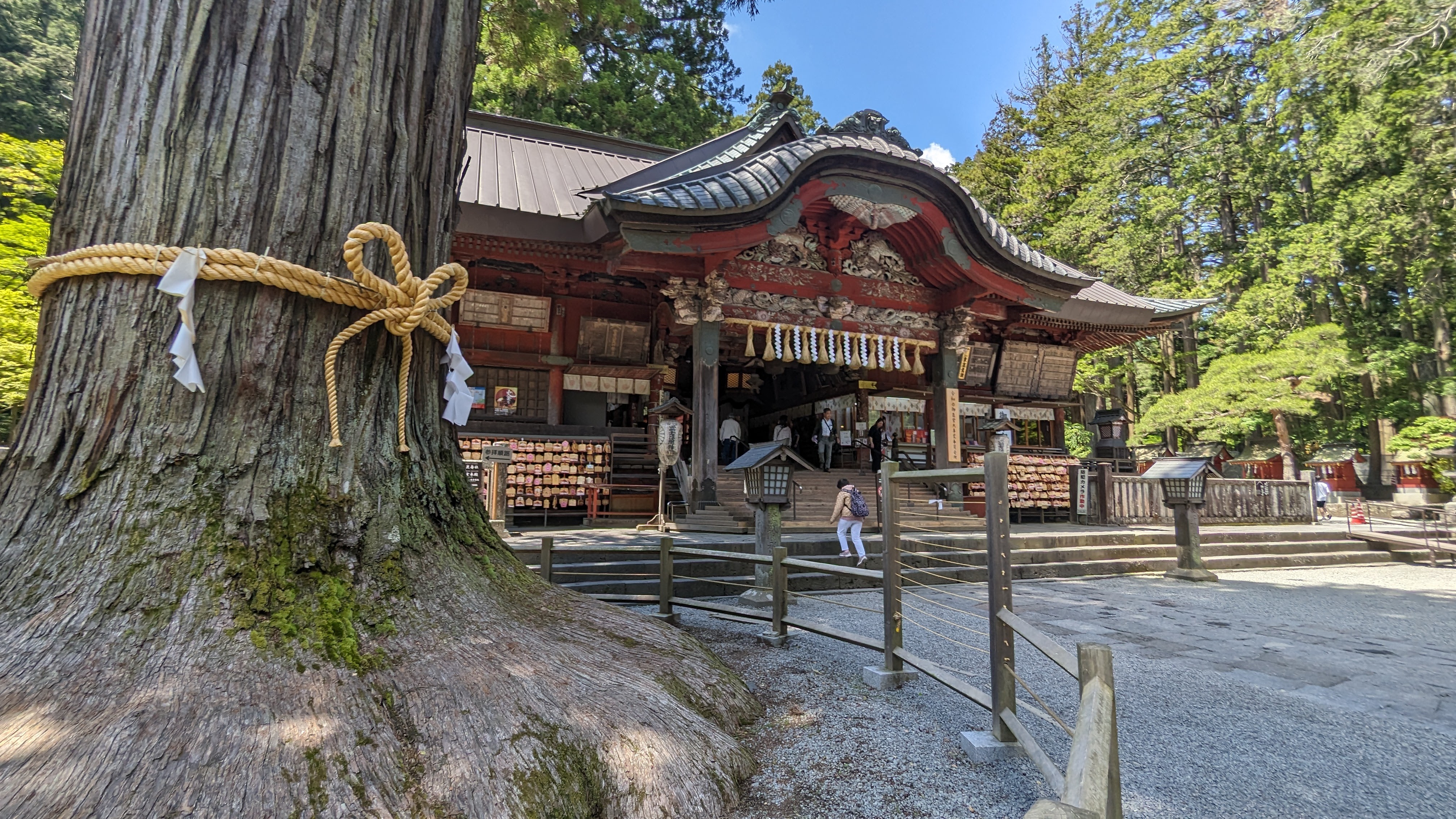 S’il y a bien un site que nous avons tous apprécié durant ces journées d’attente, c’est celui du sanctuaire Kitaguchi Hongu Fuji Sengen. Encore un sanctuaire direz-vous… Oui. Et pas spécialement plus richement décoré ni plus flamboyant que les autres. A peine possédait-il le record du plus grand torii en bois de tout le pays, mais il en faut d’autres pour nous impressionner désormais. Non ce qui a nous a tous charmés, c’est l’ambiance du lieu. Ce calme incroyable instauré par la présence d’arbres millénaires qui dominent le sanctuaire de la tête et des ramures.