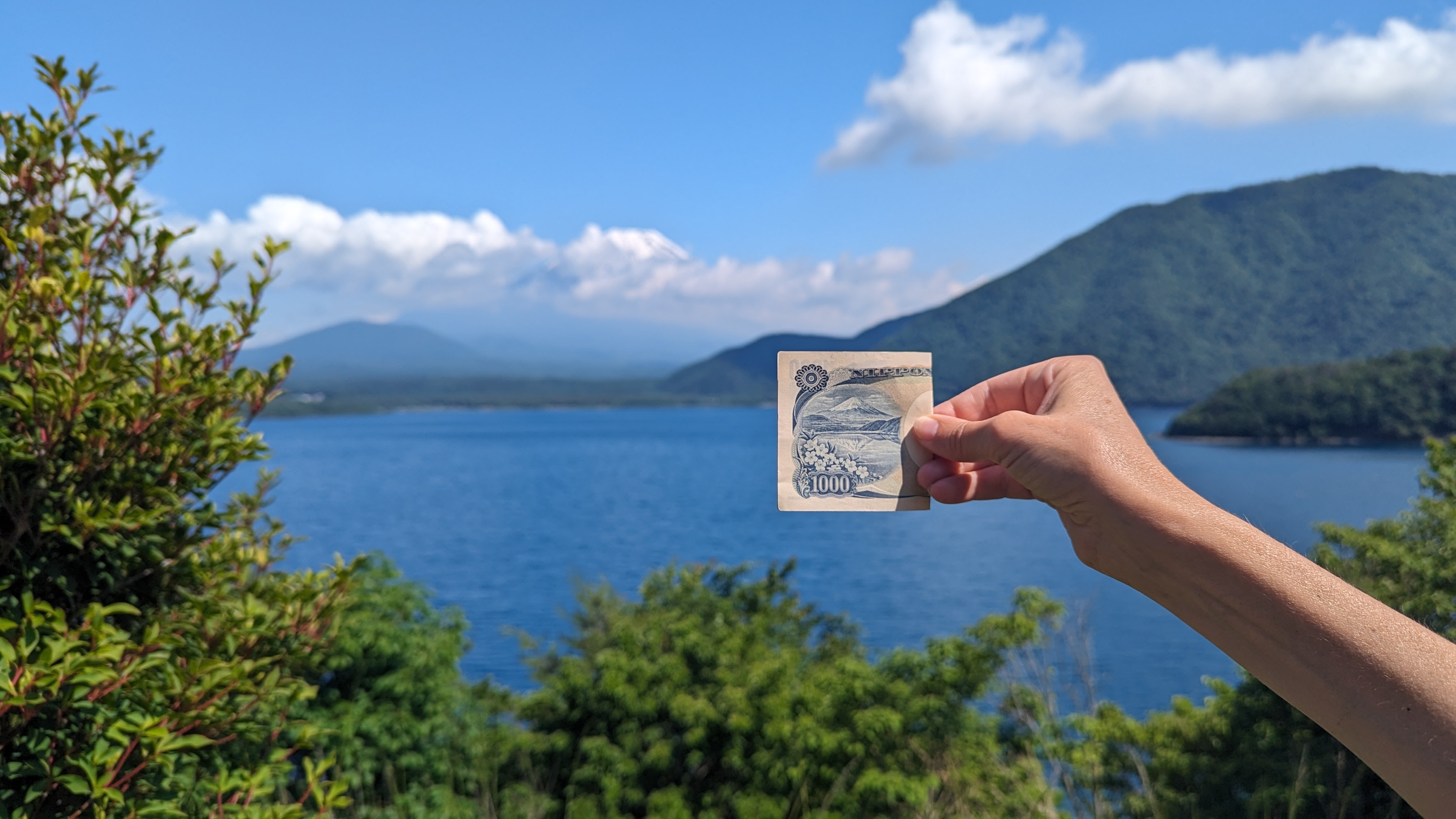 Bon en cours d’après-midi, les nuages sont un peu réapparus mais nous avons eu le temps d’aller jusqu’au lac Motosu pour y découvrir la fameuse vue du « billet de 1000 yens ». C’est le billet dont tu te sers tout le temps au Japon (ça fait à peu près 6 euros). Et au verso est imprimé un panorama célèbre du Fuji San, ce fameux panorama visible depuis le lac le plus isolé des 5.
