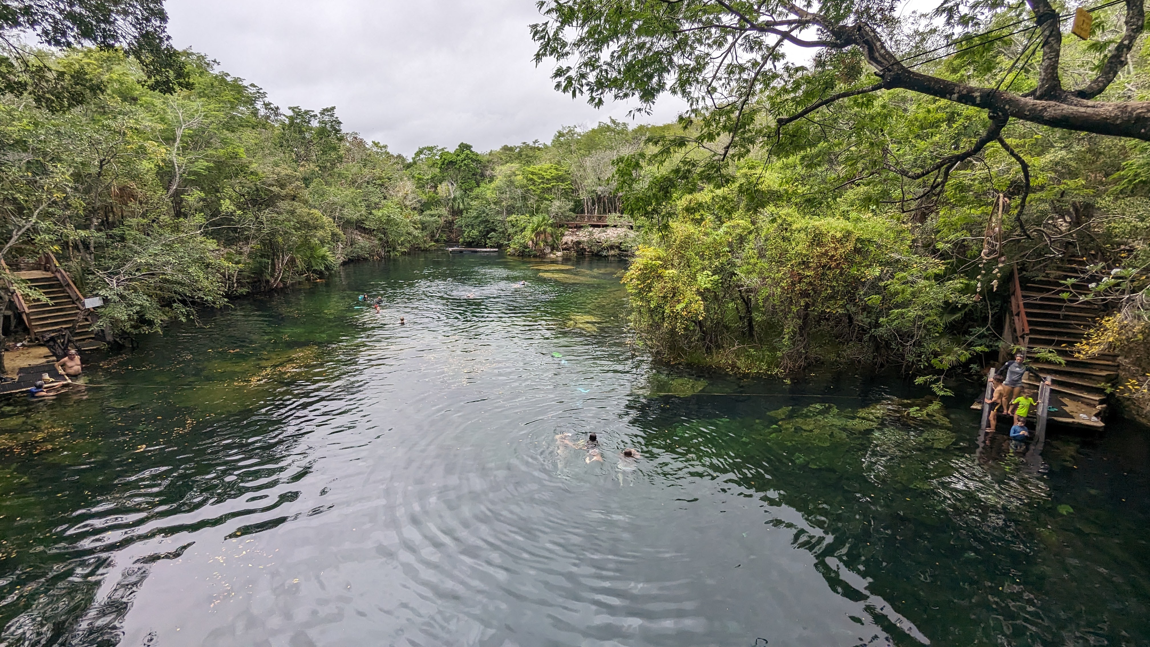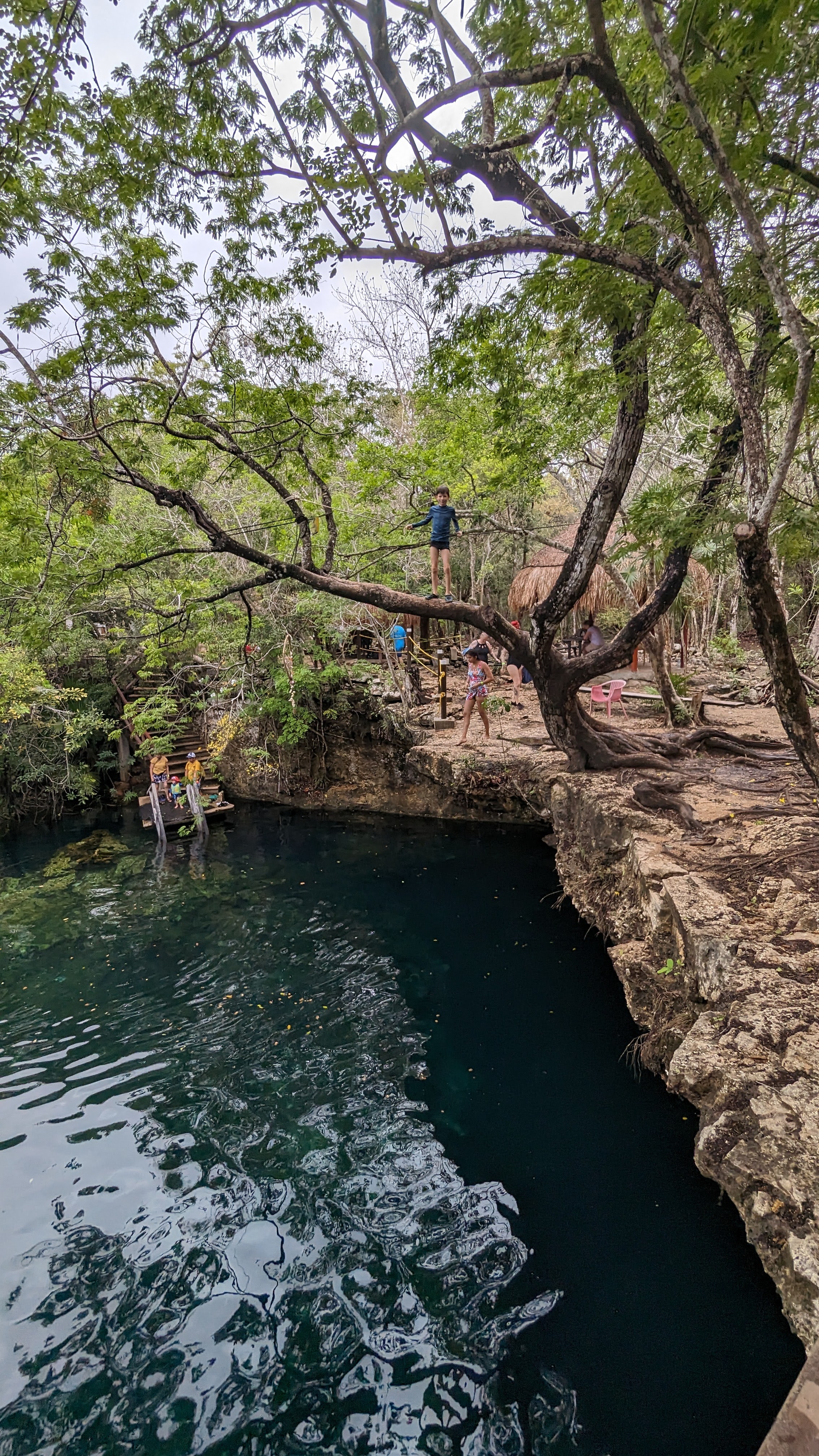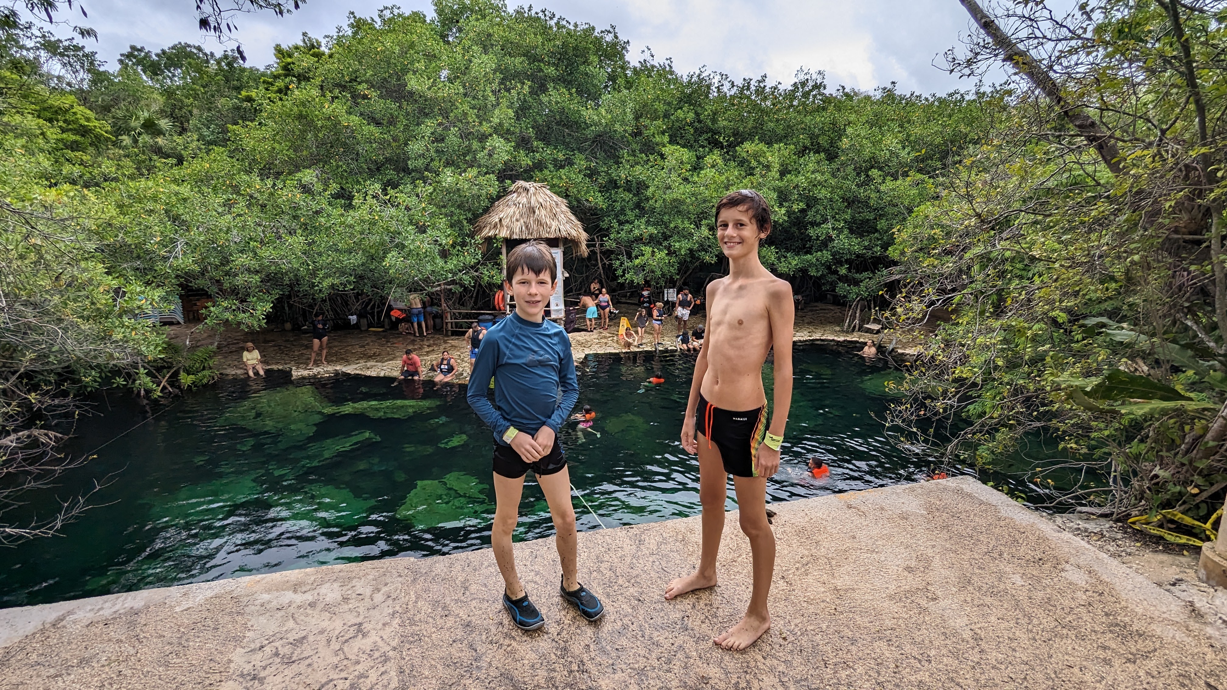 Après, on donne l’impression de se plaindre mais au quotidien on ne s’en sort pas si mal. On navigue au mieux entre les averses et la grosse différence avec la Bretagne en décembre, c’est qu’il fait chaud. Donc il est quand même possible de se mettre à l’eau, à condition de choisir les cenotes plutôt que la mer. Un cenote kezako ? Il s’agit d’un gouffre créé par un effondrement de roche calcaire et qui s’est rempli d’eau avec le temps. Certains sont ouverts à l’air libre et font de formidables lieux de baignade, en plein milieu de la jungle tropicale, parfois aménagés avec des plateformes pour sauter de très haut ou des tyroliennes.