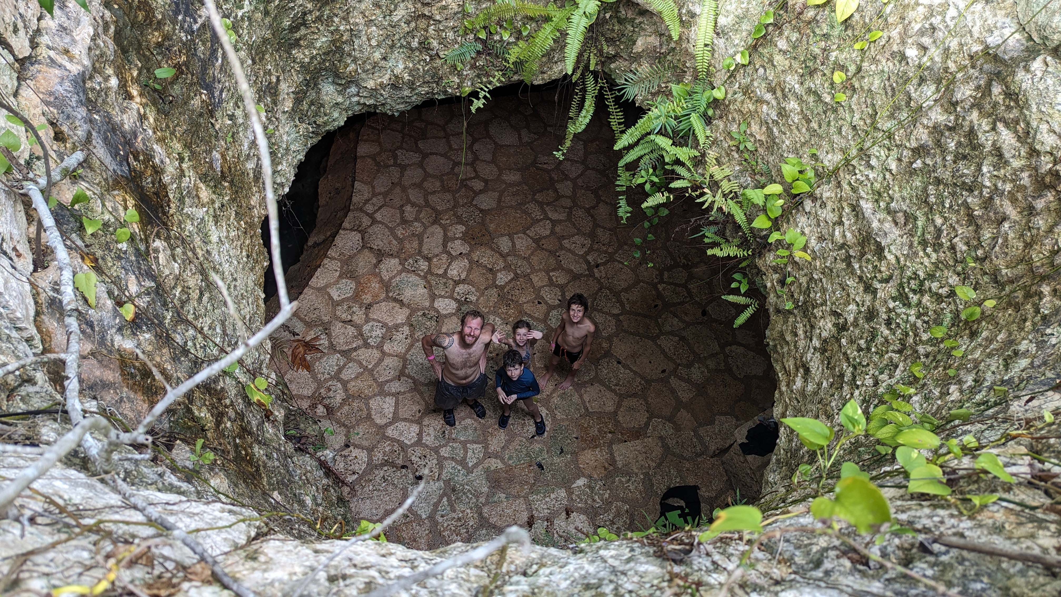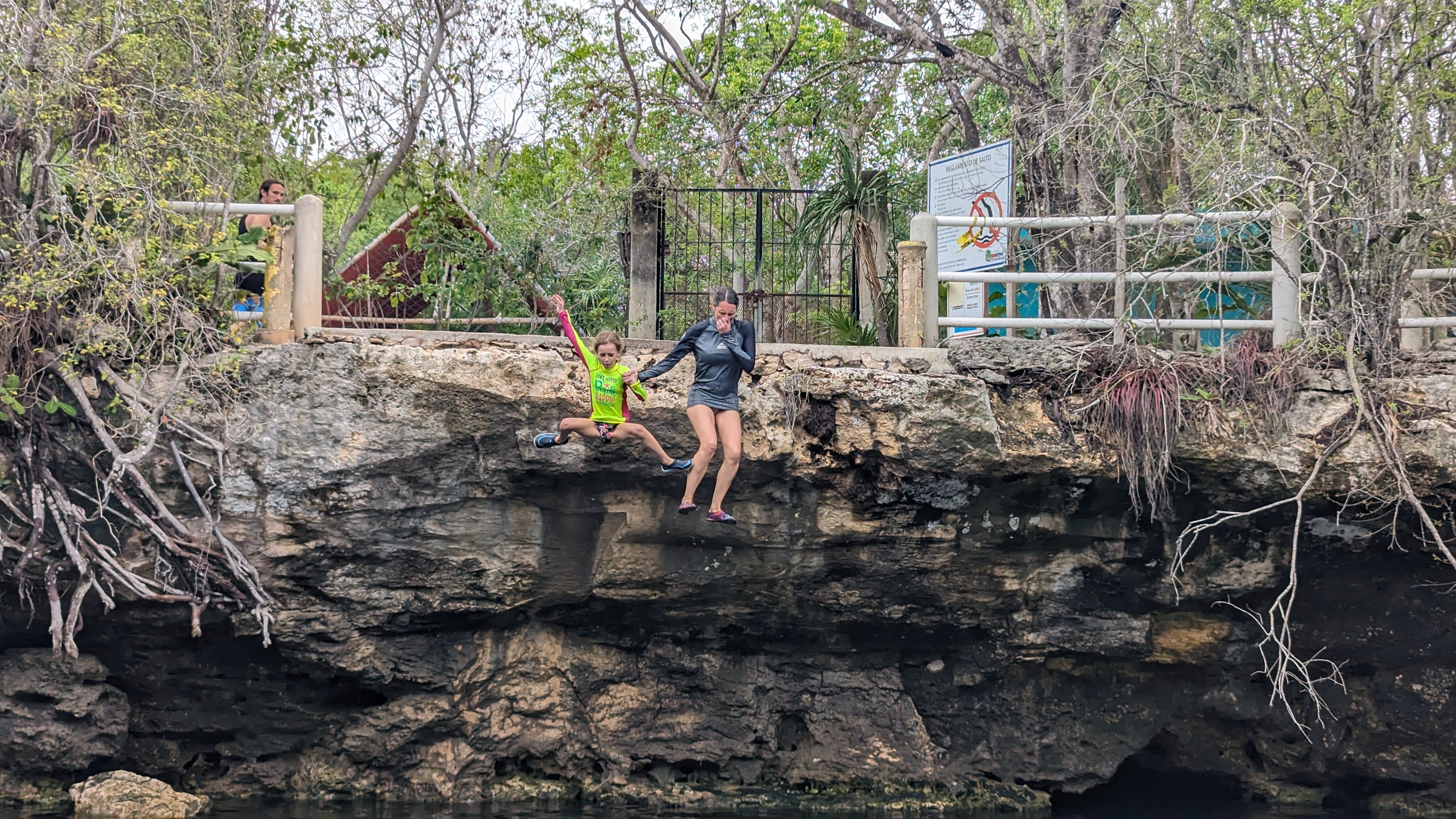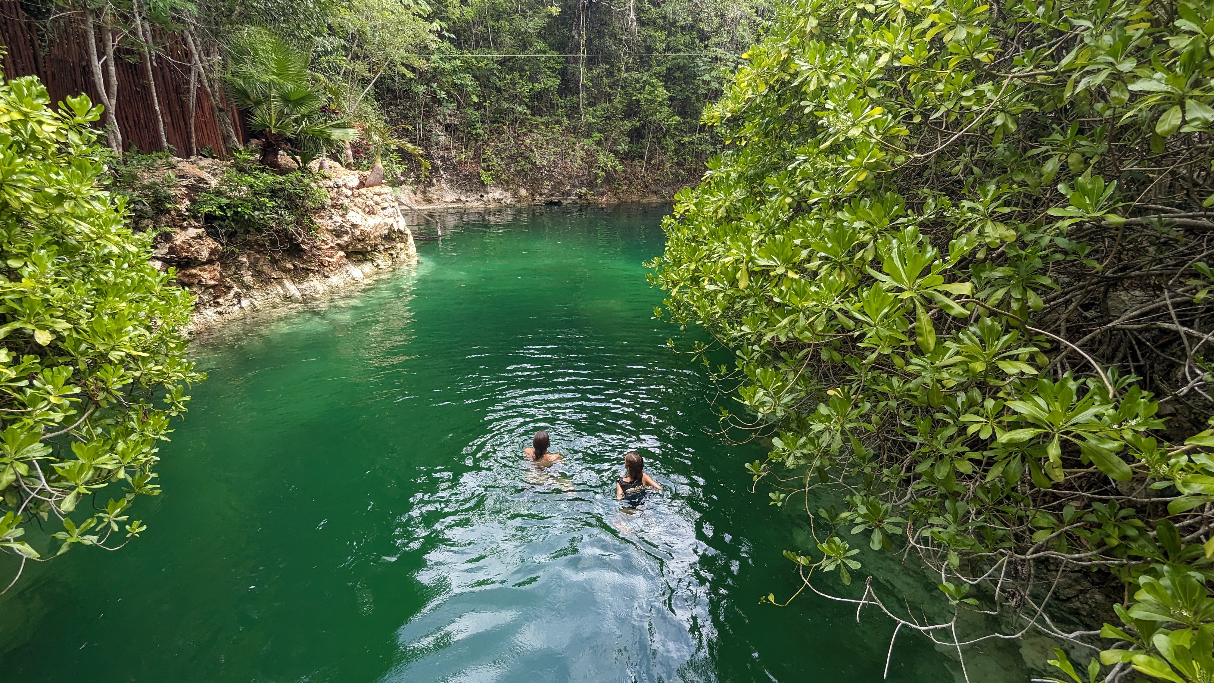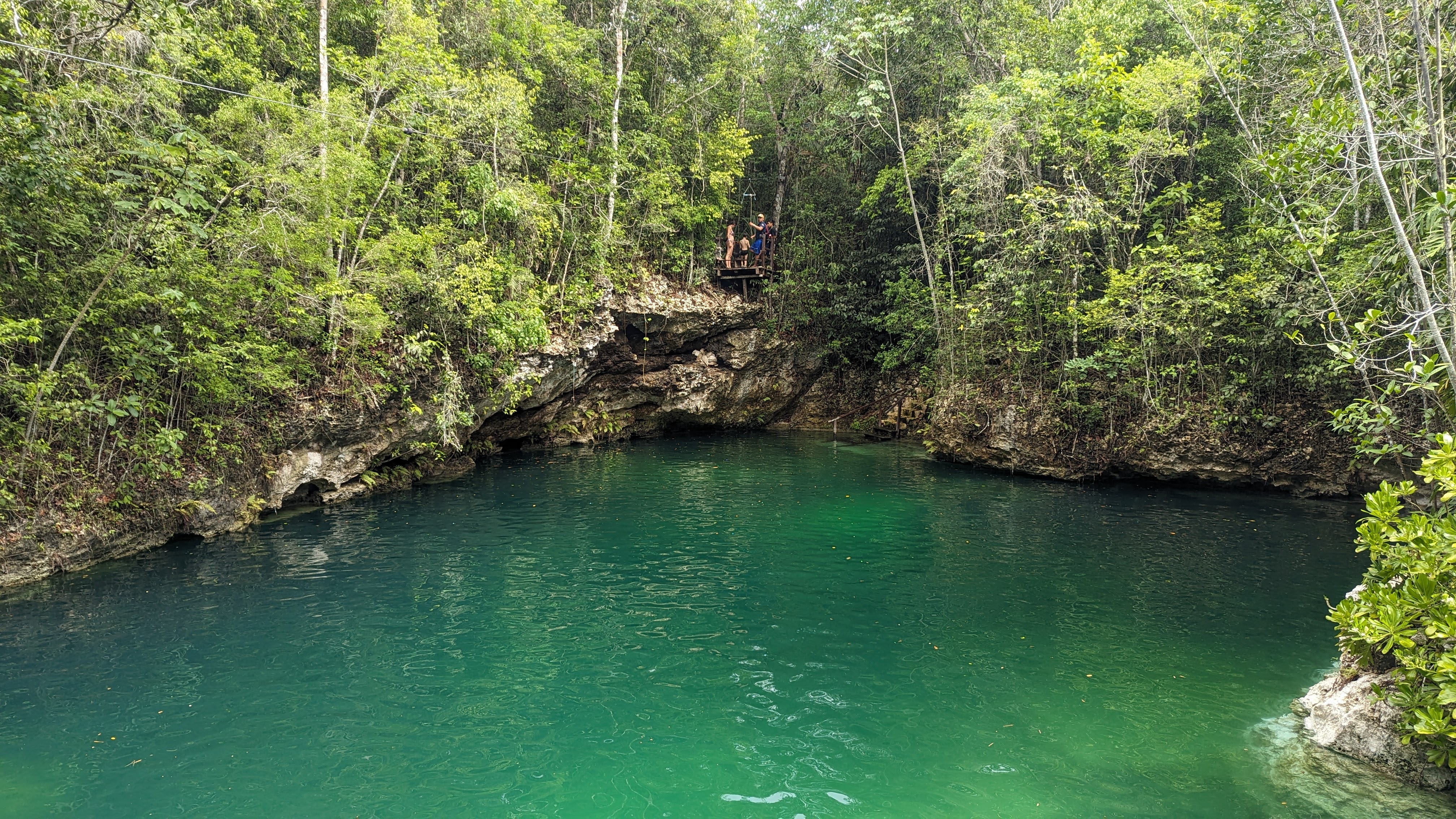 Après, on donne l’impression de se plaindre mais au quotidien on ne s’en sort pas si mal. On navigue au mieux entre les averses et la grosse différence avec la Bretagne en décembre, c’est qu’il fait chaud. Donc il est quand même possible de se mettre à l’eau, à condition de choisir les cenotes plutôt que la mer. Un cenote kezako ? Il s’agit d’un gouffre créé par un effondrement de roche calcaire et qui s’est rempli d’eau avec le temps. Certains sont ouverts à l’air libre et font de formidables lieux de baignade, en plein milieu de la jungle tropicale, parfois aménagés avec des plateformes pour sauter de très haut ou des tyroliennes.