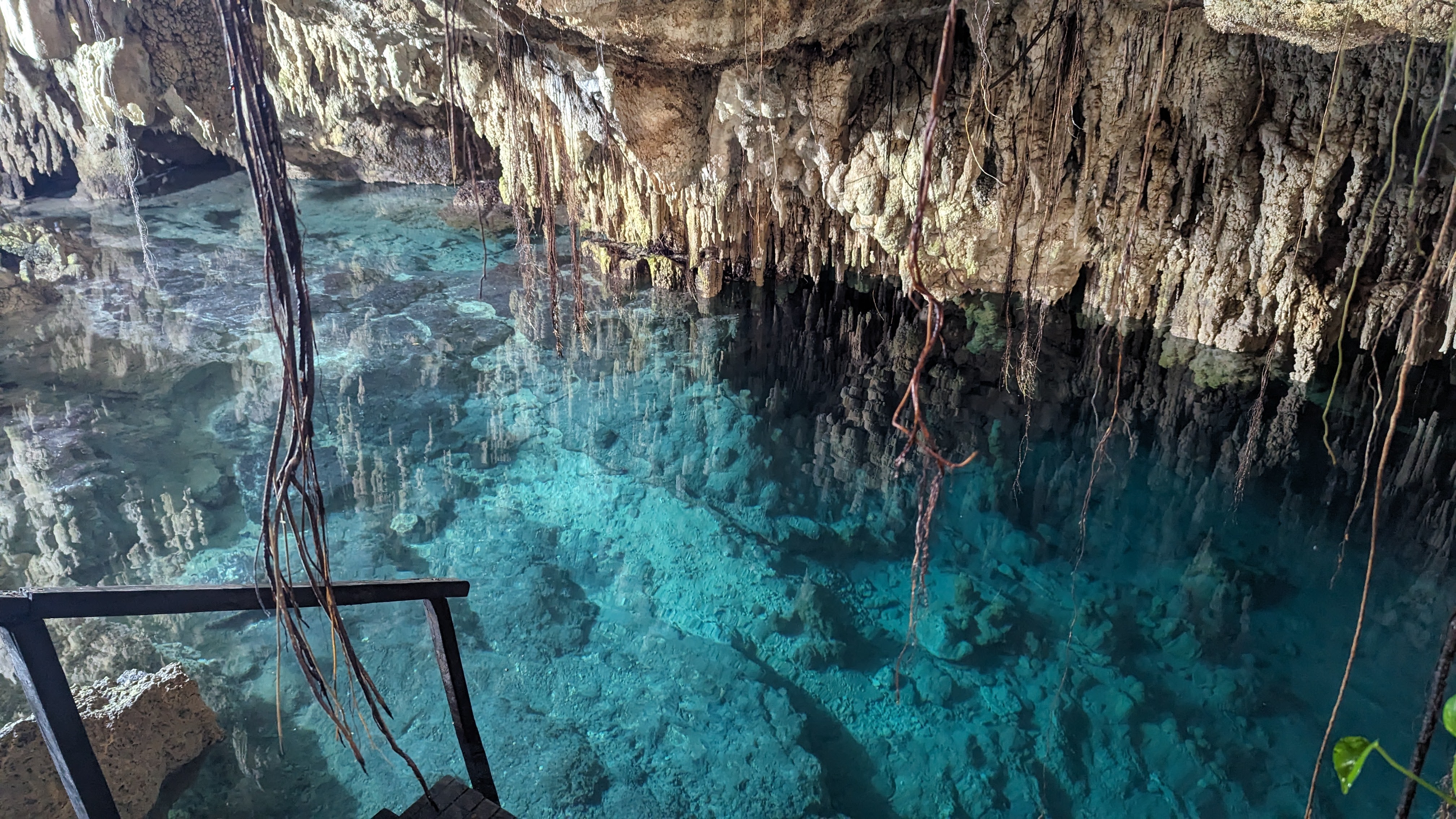 D’autres cenotes sont souterrains : le plafond ne s’est pas totalement effondré et ne laisse passer que quelques rayons de soleil. On peut alors admirer de magnifiques concrétions calcaires, parfois noyées dans l’eau. S’il n’était pas permis de prendre des photos dans le plus grand complexe que nous ayons visité (Rio Secreto) nous en avons vus de plus petits tout aussi charmants (et l’avantage des trucs souterrains, c’est qu’ils se visitent par tous les temps).
