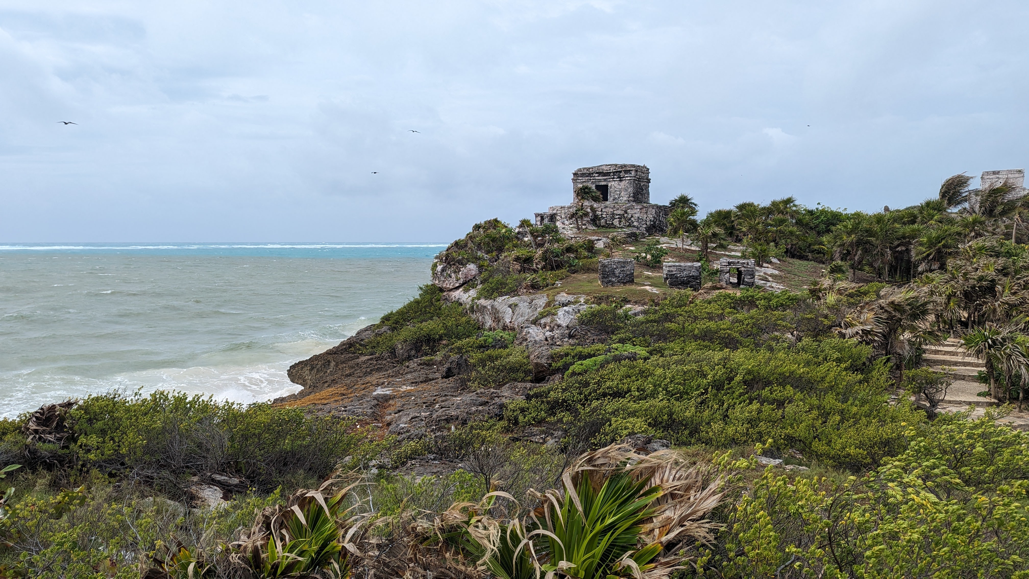 D’abord celui de Tulum. La ville est connue aujourd’hui en tant que station balnéaire mais à l’époque maya, c’était un port important. Ce fut d’ailleurs la première cité que les espagnols virent sur le continent américain, passant en bateau au large sans s’y arrêter. Aujourd’hui, il reste des bâtiments à la puissance évocatrice intacte, perchés sur les falaises et adossés à la Mer des Caraïbes. Plus que l’architecture, plus simple ici qu’ailleurs, c’est le décor qui fait tout. Même avec un vent à mettre les palmiers à l’horizontale !