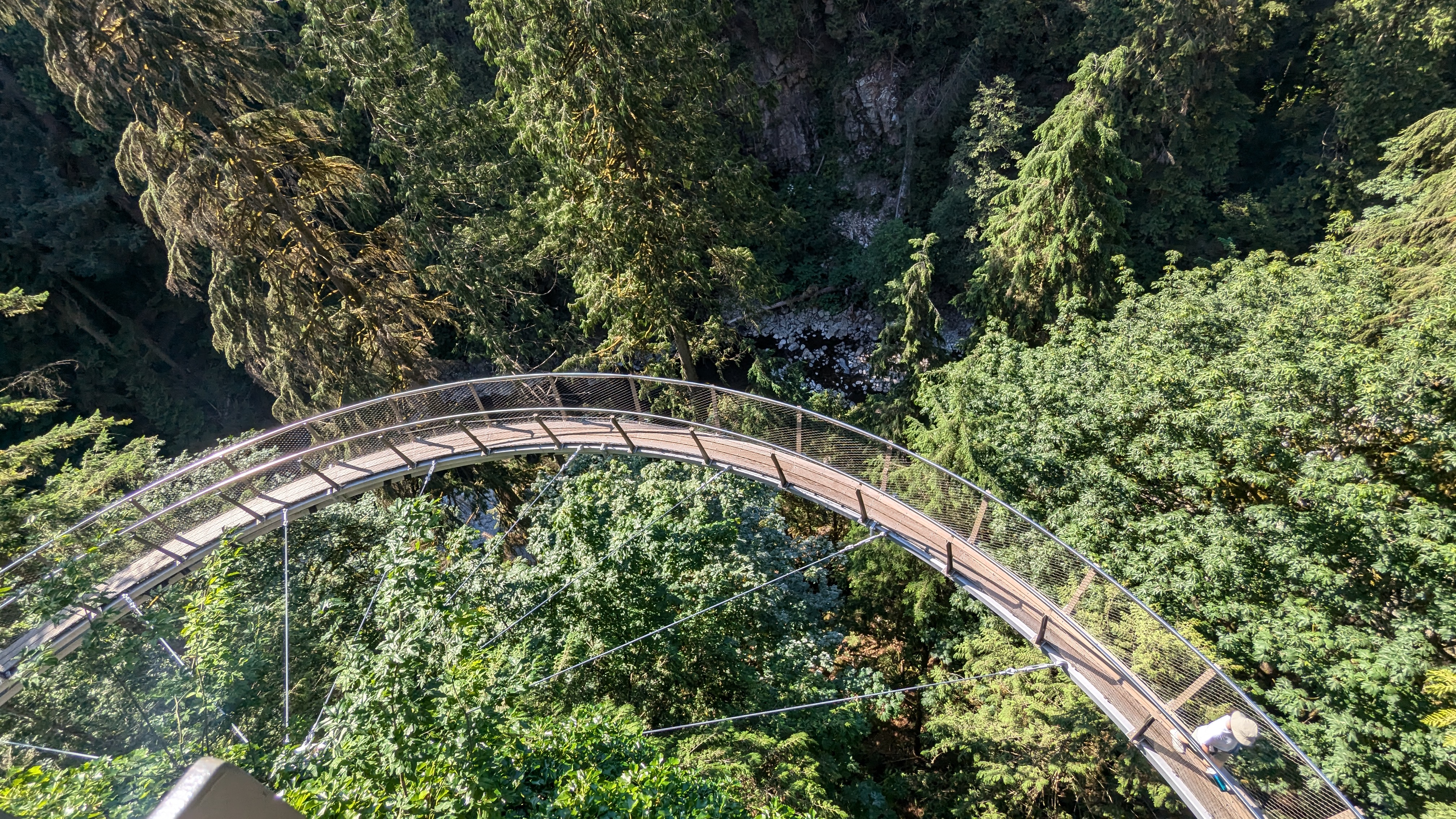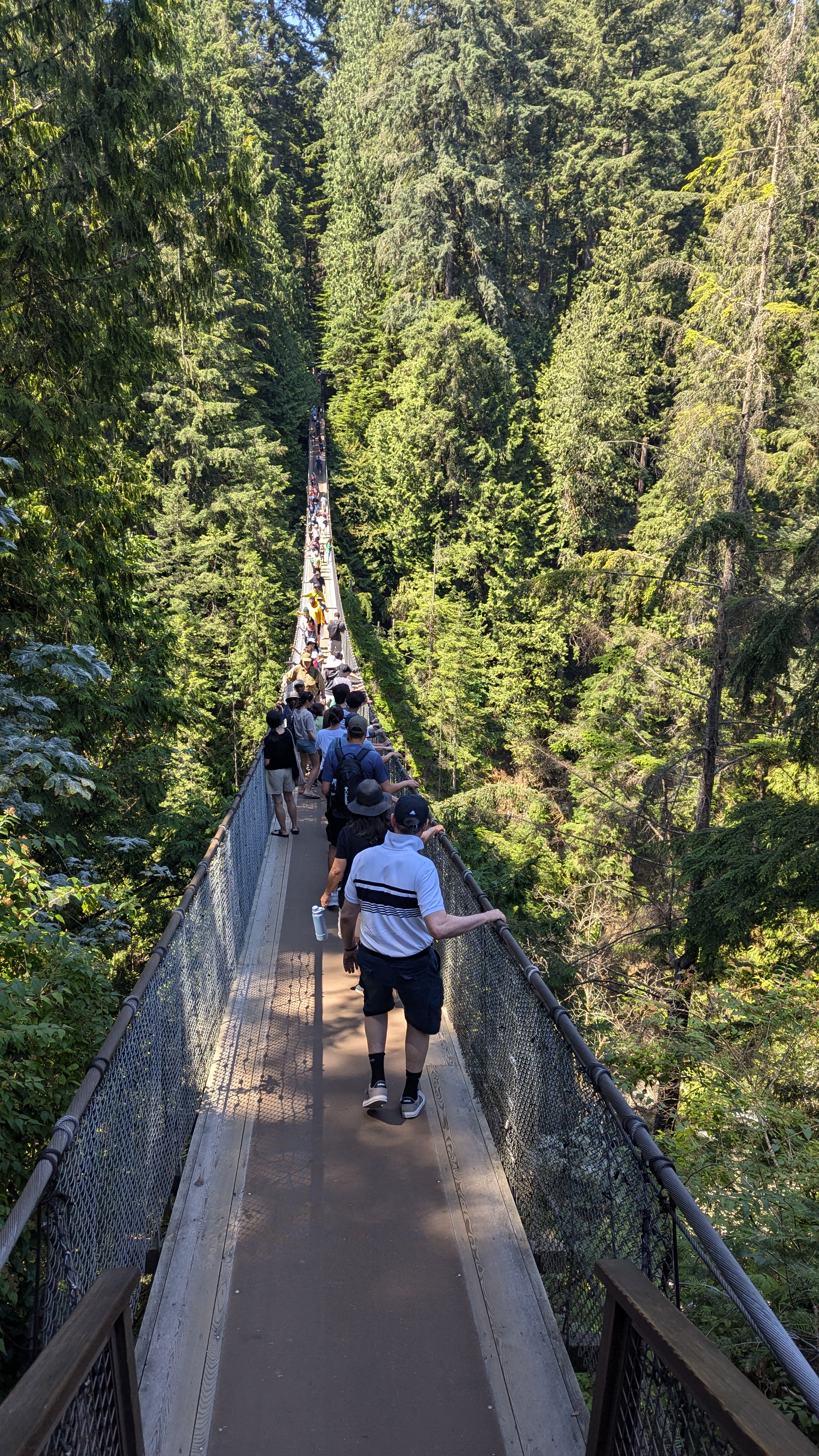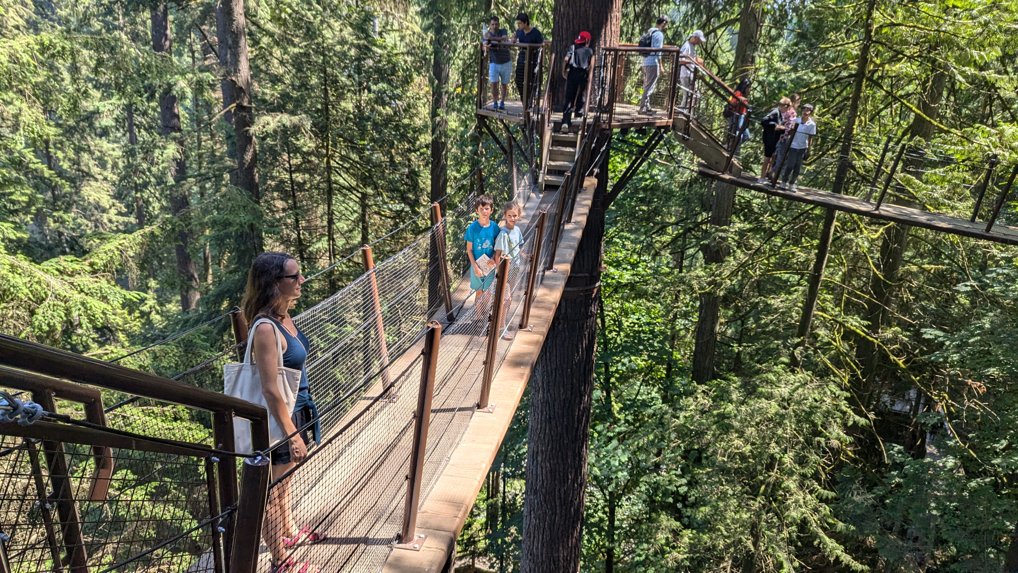 Dernière petite activité sympa autour de Vancouver : le canyon de Capilano qui se targue de posséder la plus longue passerelle suspendu pour piétons au monde ! Toujours le concours de celui qui a la plus longue… On ne sait pas si c’est vrai (et en plus on s’en f…) mais le lieu est sympa comme tout. Des balades dans les arbres géants ont été aménagées qui permettent de se prendre pour un écureuil le temps de parcourir quelques passerelles. Ou pour un oiseau en marchant au-dessus du vide le long de la falaise… Ça permet en tout cas de s’offrir une jolie virée au milieu des pins Douglas et autres cèdres rouges au port majestueux.