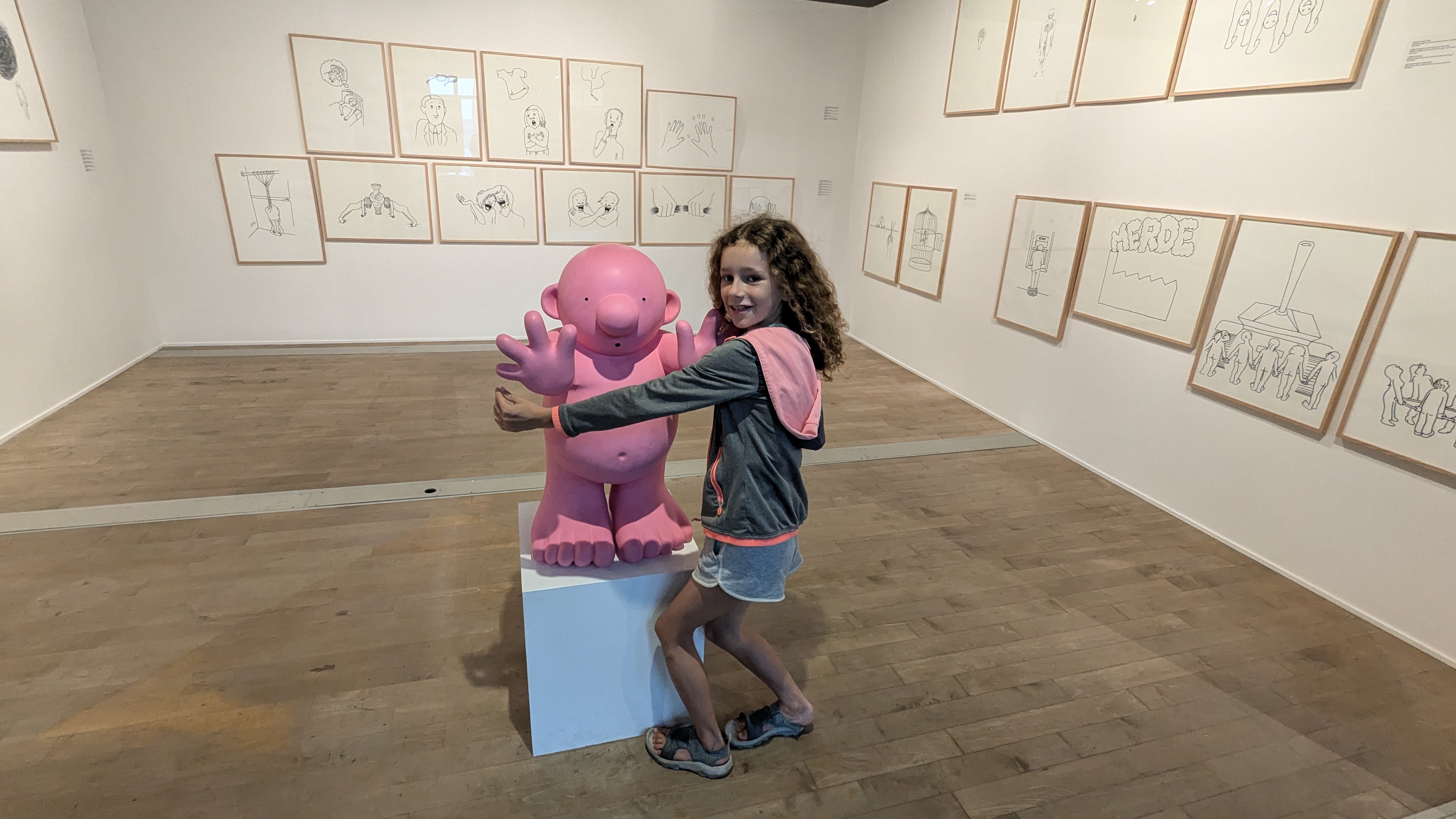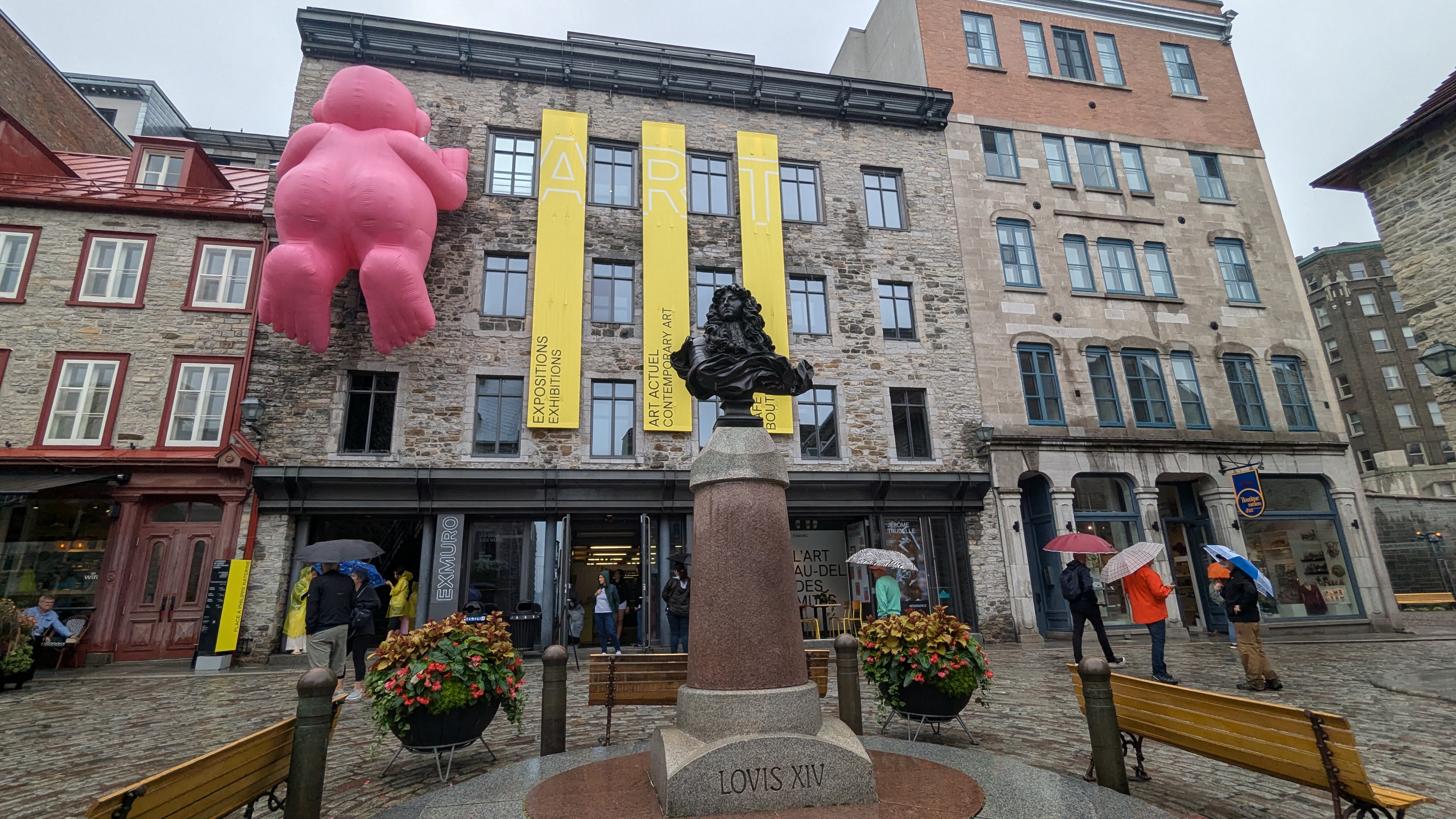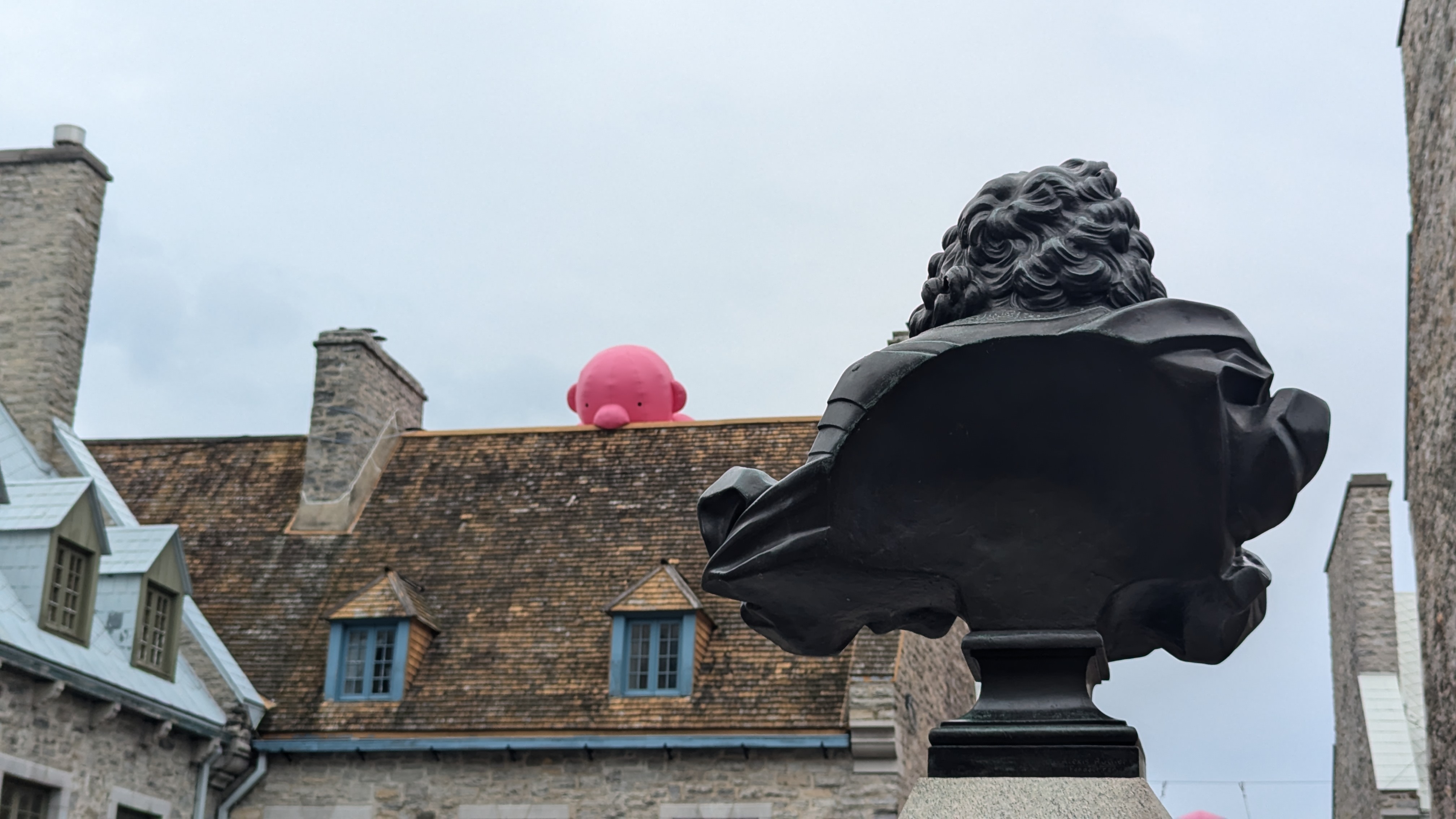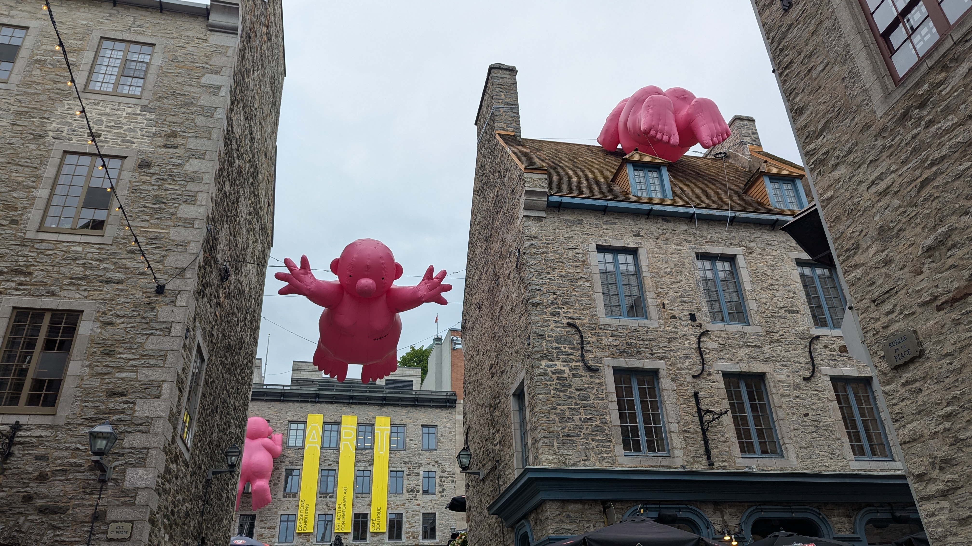 Dans cette même ville basse de Québec, on a aussi eu la surprise de découvrir de grands bonhommes gonflables roses installés un peu partout, regardant par dessus les toits et les fenêtres. En cherchant le nom de l’artiste, on a été surpris le lire celui de Philippe Katerine. Croyant à un homonyme, on a vérifié par deux fois mais non, c’est bien lui, le chanteur le plus gentiment azimuté de la chanson française et qui a récemment accédé à la renommée internationale en chantant à moitié nu pendant la cérémonie d’ouverture des JO. En plus d’être un chanteur victorisé et un acteur césarisé, le gars est aussi artiste plasticien (et il se trouve qu’on l’aime beaucoup dans la famille).
