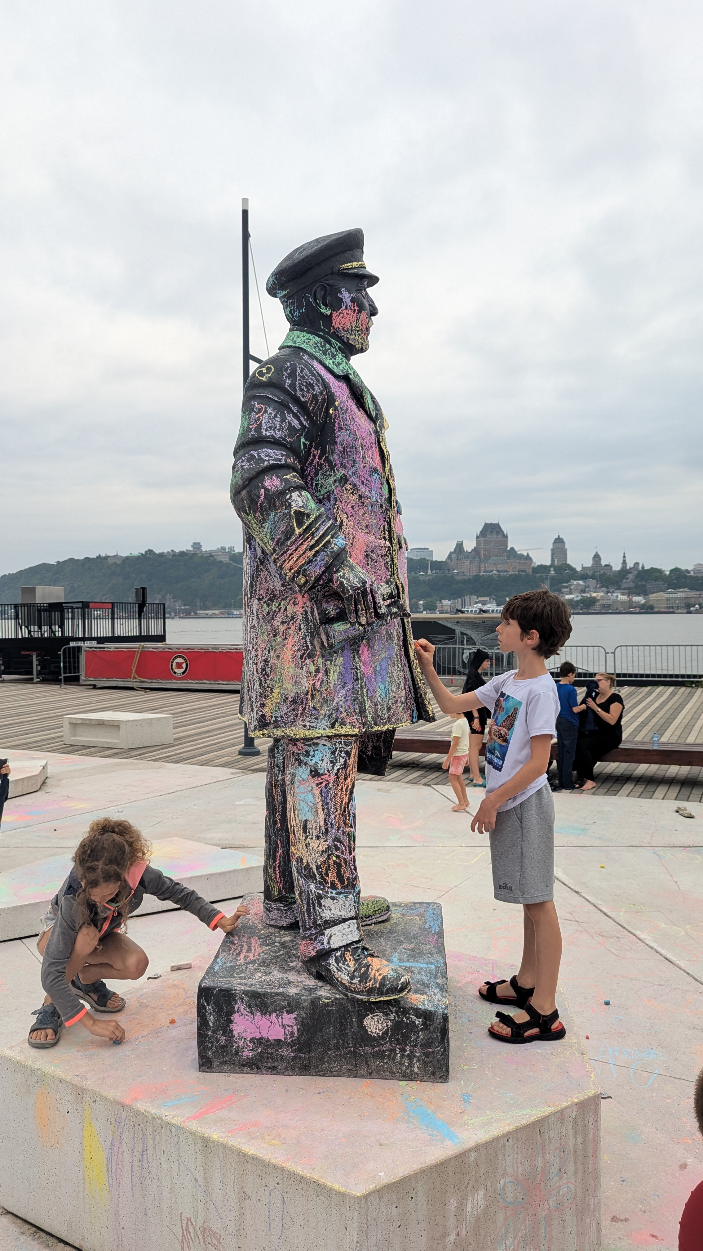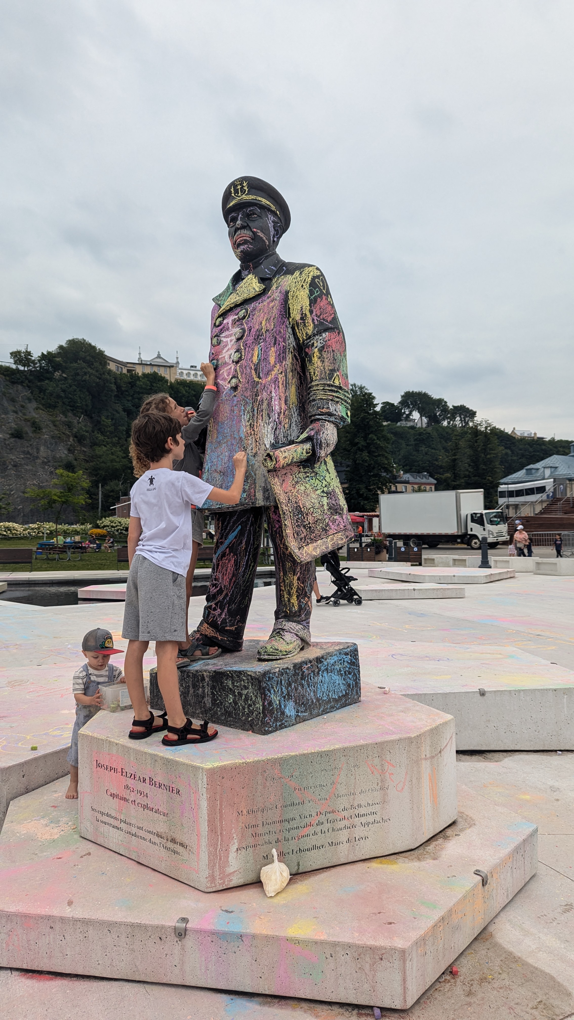 Le Canada, c’est quand même une autre façon de voir la vie que la France. Prenez cette place publique: non seulement il y avait une boite de craies à disposition pour dessiner sur le sol (que tout le monde respecte sans chercher à en voler le contenu) mais il est même permis de crayonner les statues 😀