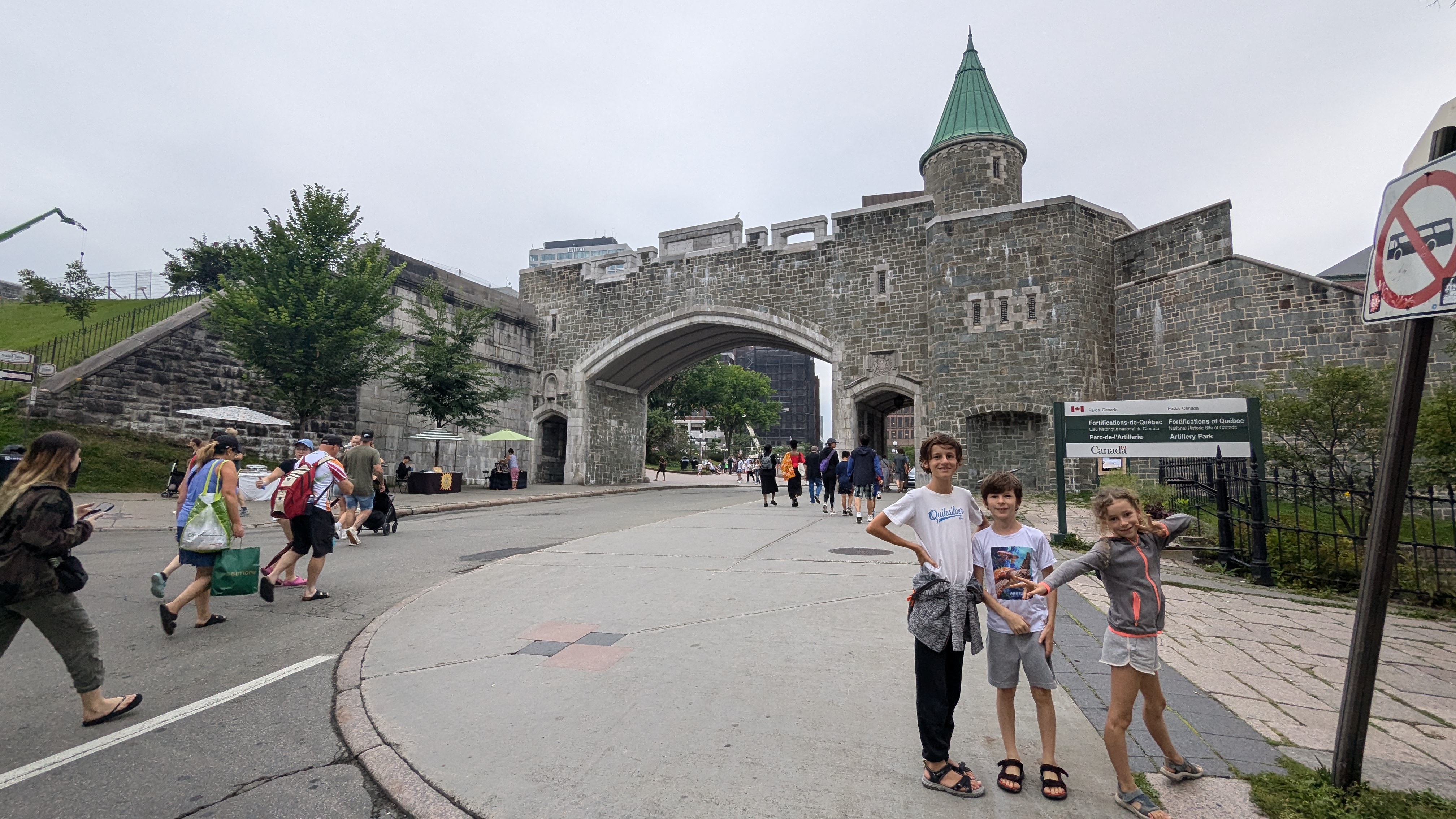 Enfin ! Enfin nous voilà au Québec ! Et à Québec même ! Les enfants attendaient ceci avec impatience : ils rêvaient d’entendre du français (bon de toute façon, ils entendront du français tous les jours dans moins d’une semaine 😀 ). Même à nous, ça nous a fait bizarre après tous ces mois d’anglais (malgré les 6 semaines d’espagnol au Mexique, et encore les mexicains nous parlaient souvent en anglais). Au début on abordait encore les gens dans la langue de Shakespeare. Mais c’est bon, on s’habitue très bien à retrouver sa langue maternelle. Et non, vraiment non, on n’a pas encore pris l’accent…