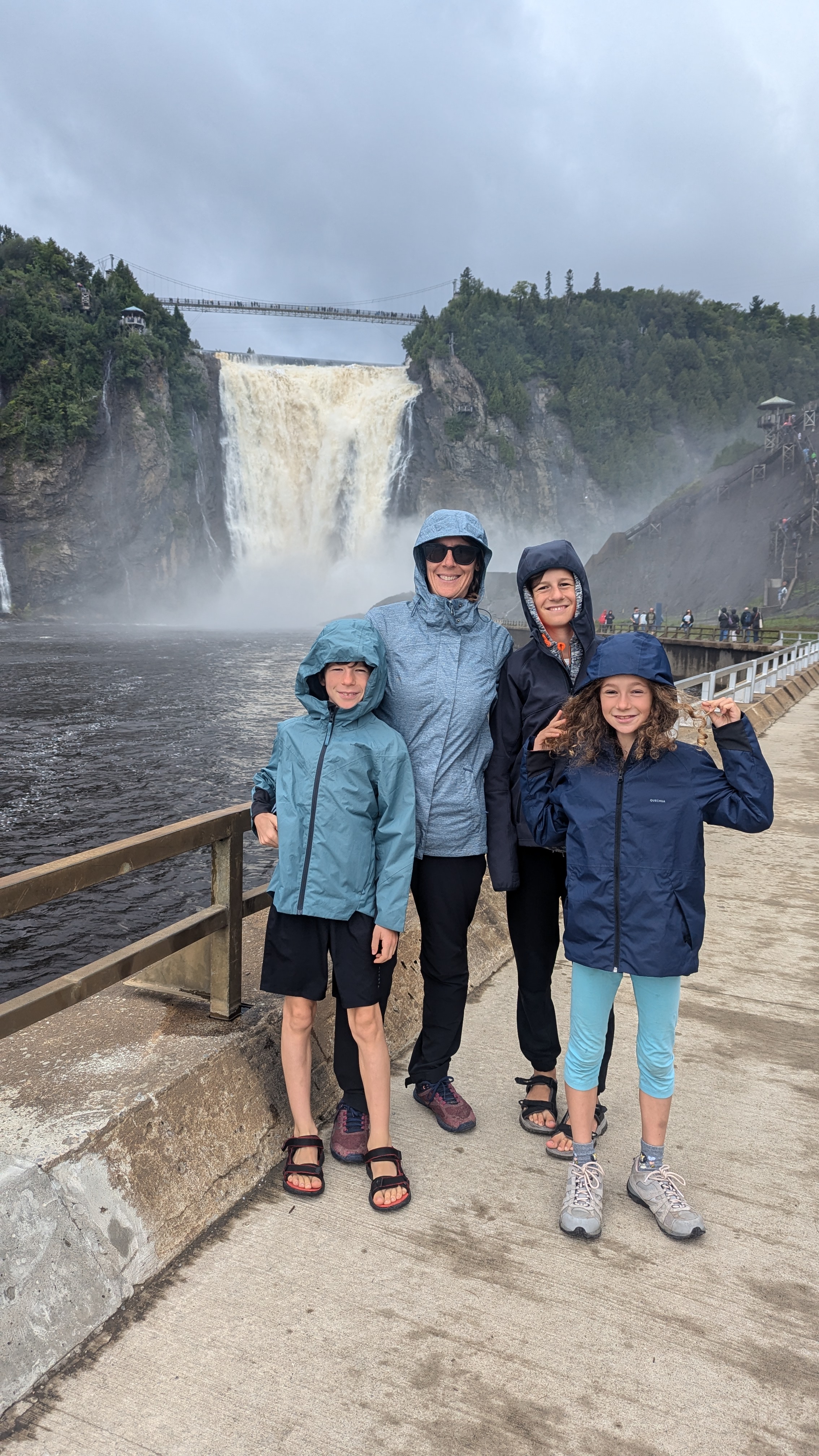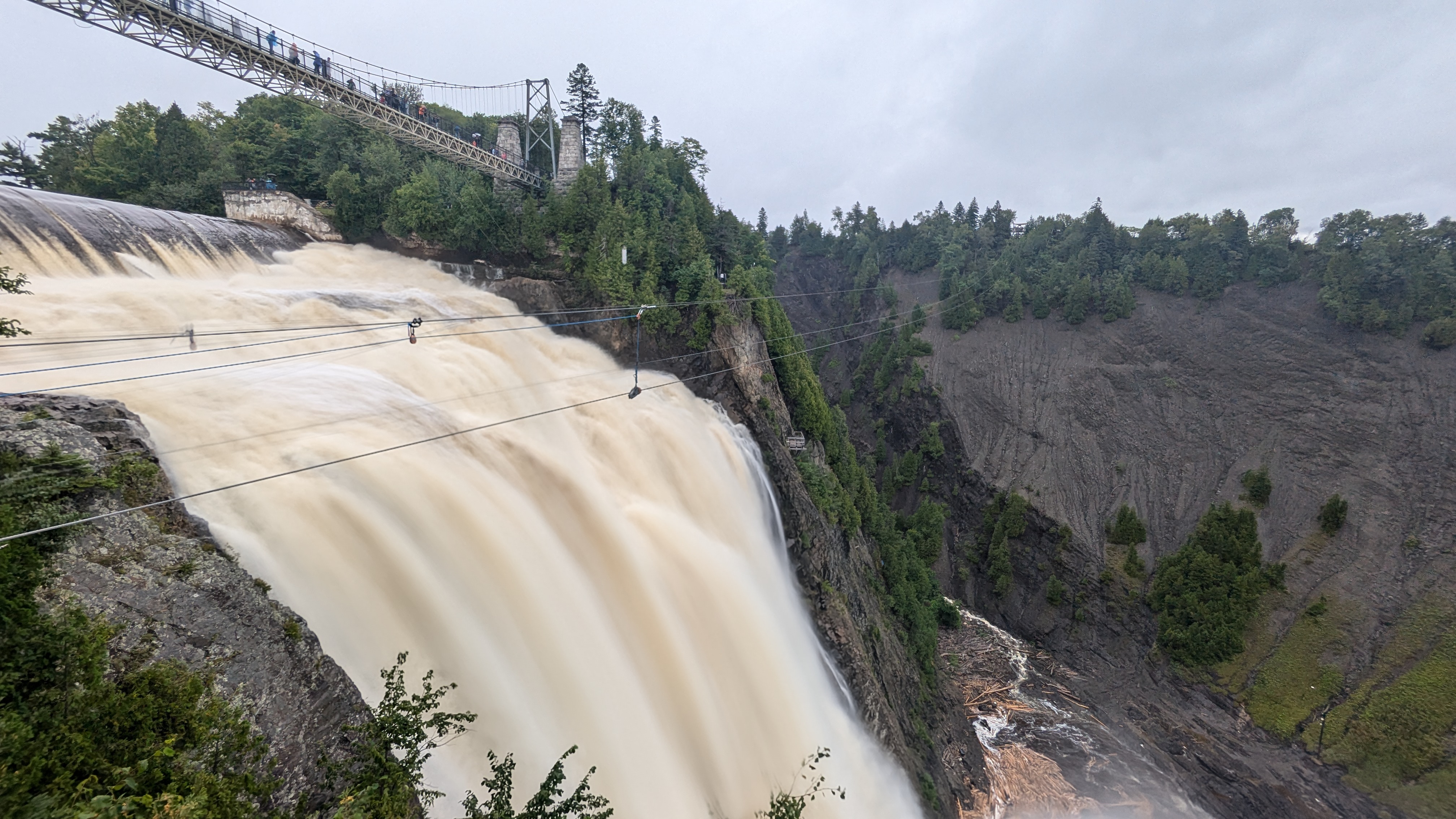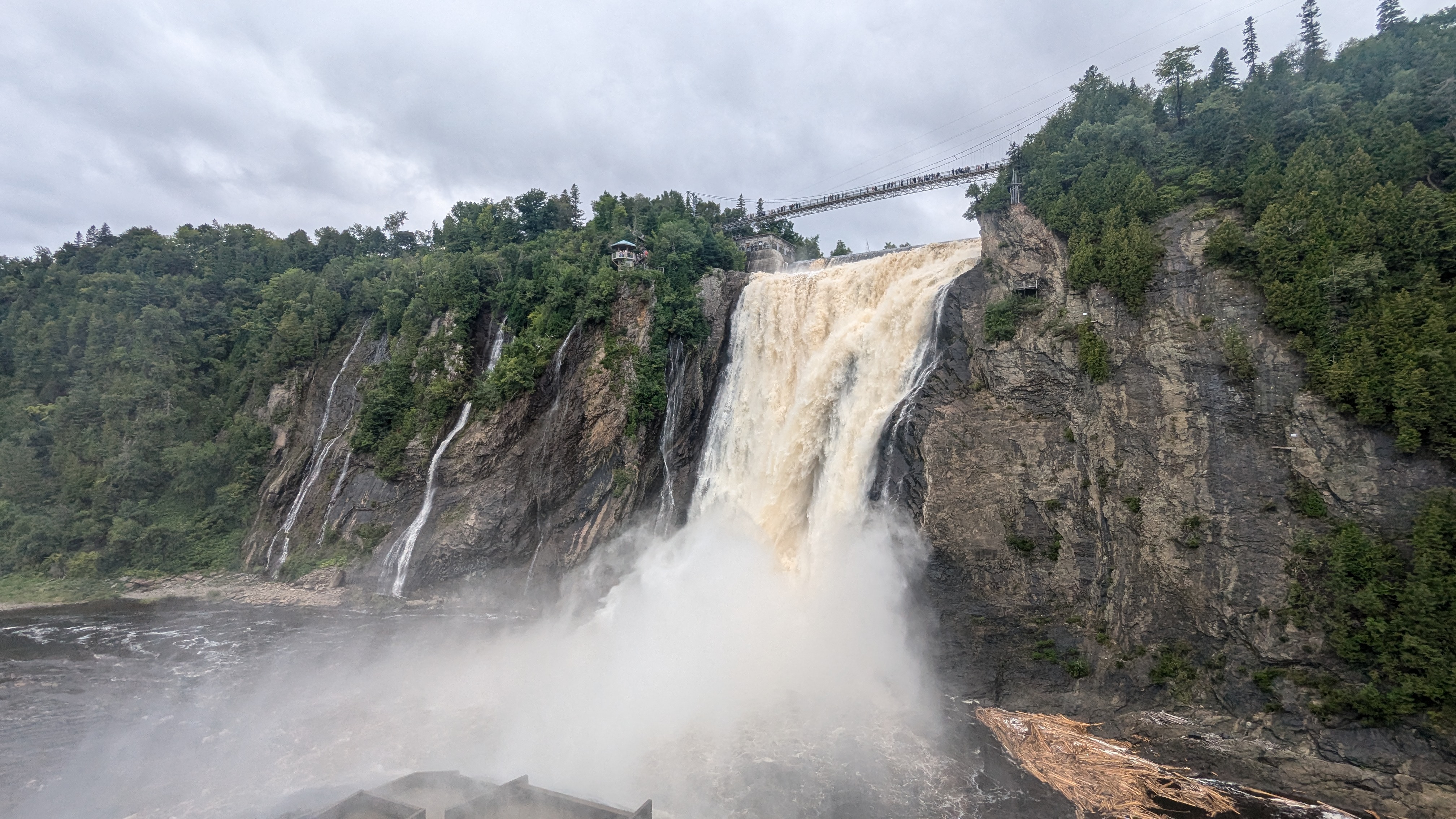 En dehors de Quebec ville, il y aussi quantités de choses à voir. Et il n’y a pas besoin d’aller bien loin pour se dépayser: les chutes Montmorency, par exemple, grondent à 20 minutes à peine du centre-ville. 83m de haut, c’est plus que les chutes du Niagara, même si elles sont évidemment bien moins larges. L’avantage avec toute cette eau pulvérisée dans l’atmosphère, c’est qu’on ne savait plus si on était mouillé par la pluie ou la cascade 😀