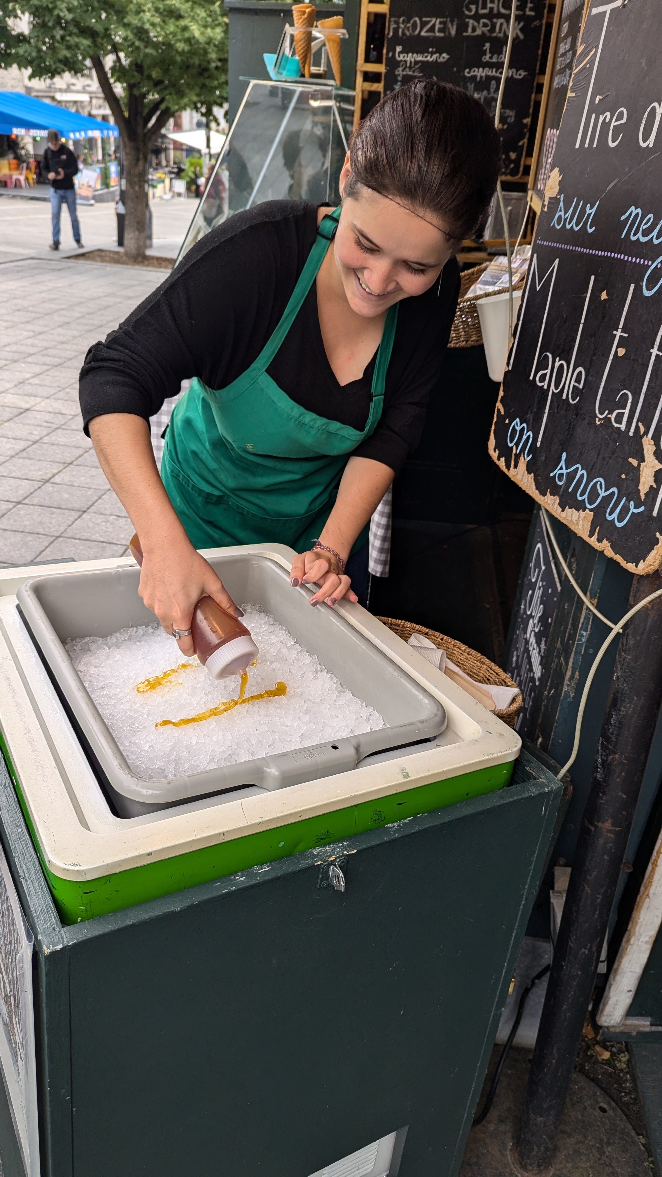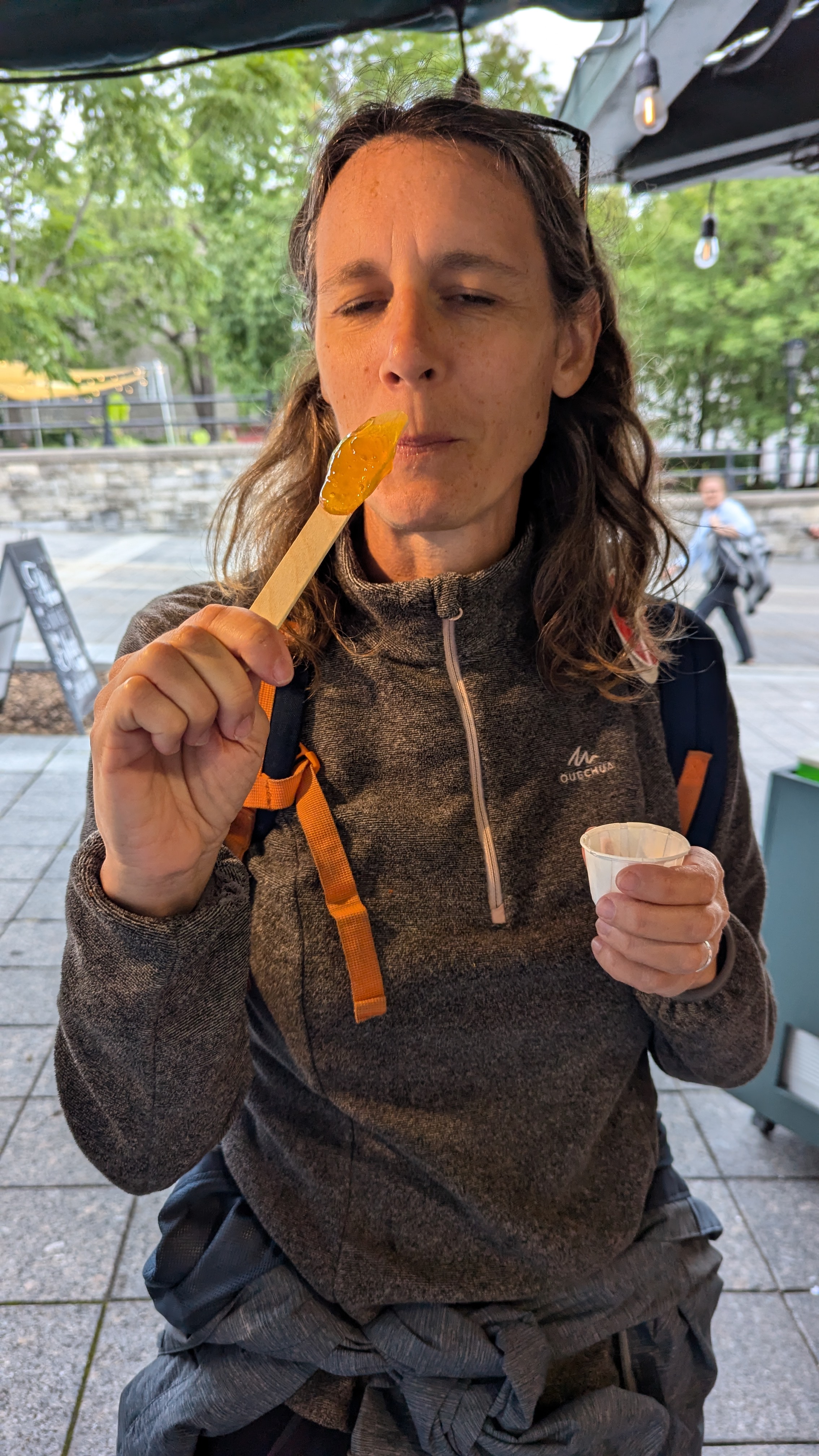 Peut-être parce que c’est la fin du voyage (et que mine de rien nous sommes un peu fatigués du rythme soutenu pendant 8 mois) nous avons switché sur un mode très cool pour ces dernières visites. On a pris le temps de s’arrêter, de se poser dans les parcs ou sur les bords du fleuve (on a même fait du raft sur les rapides du St Laurent, à 15 minutes du centre-ville mais pas de photos de nos exploits sur les grosses vagues)… C’était l’occasion de tester par exemple la vraie de vraie tradition de la « tirée » de sirop d’érable sur neige.